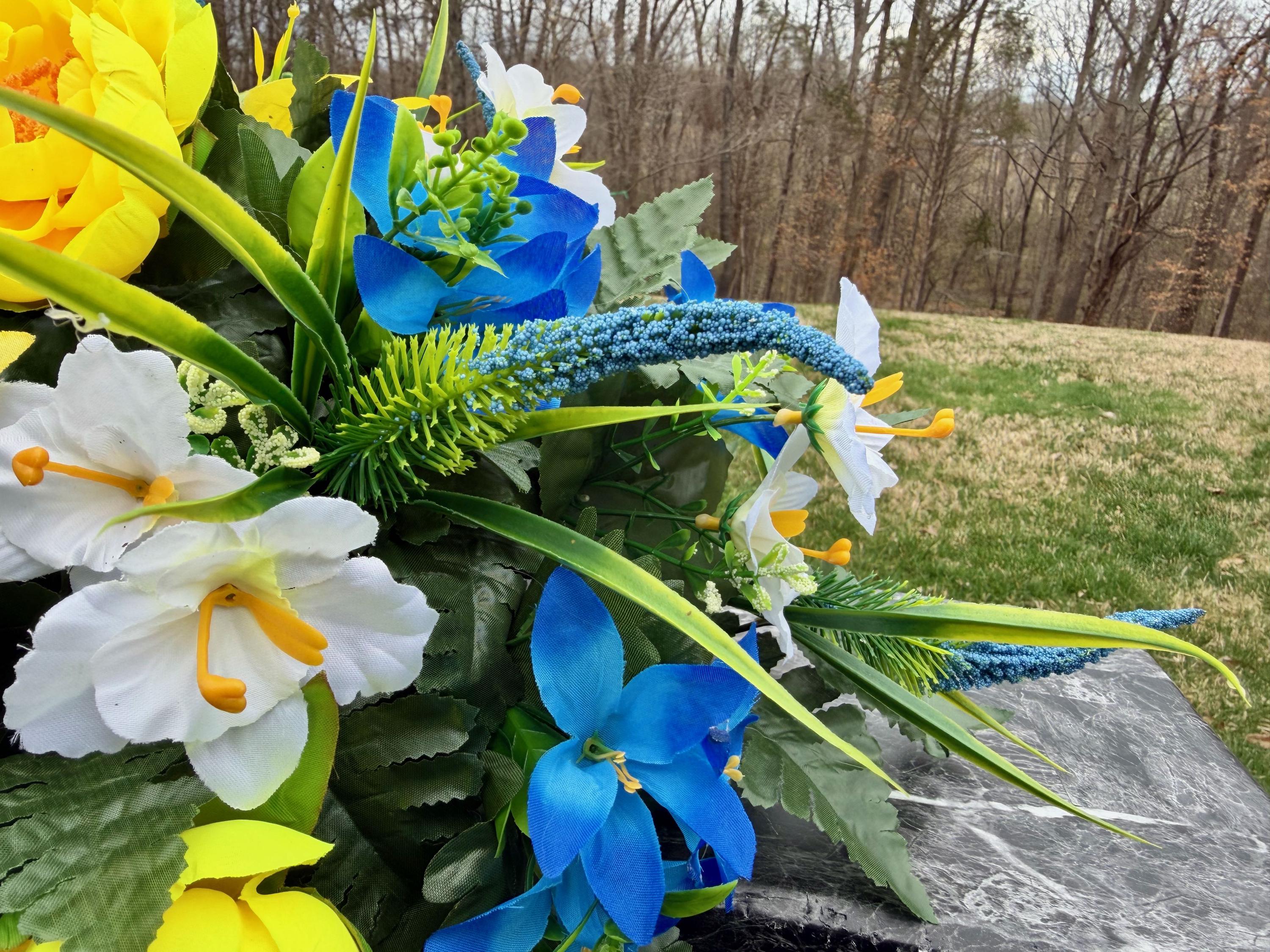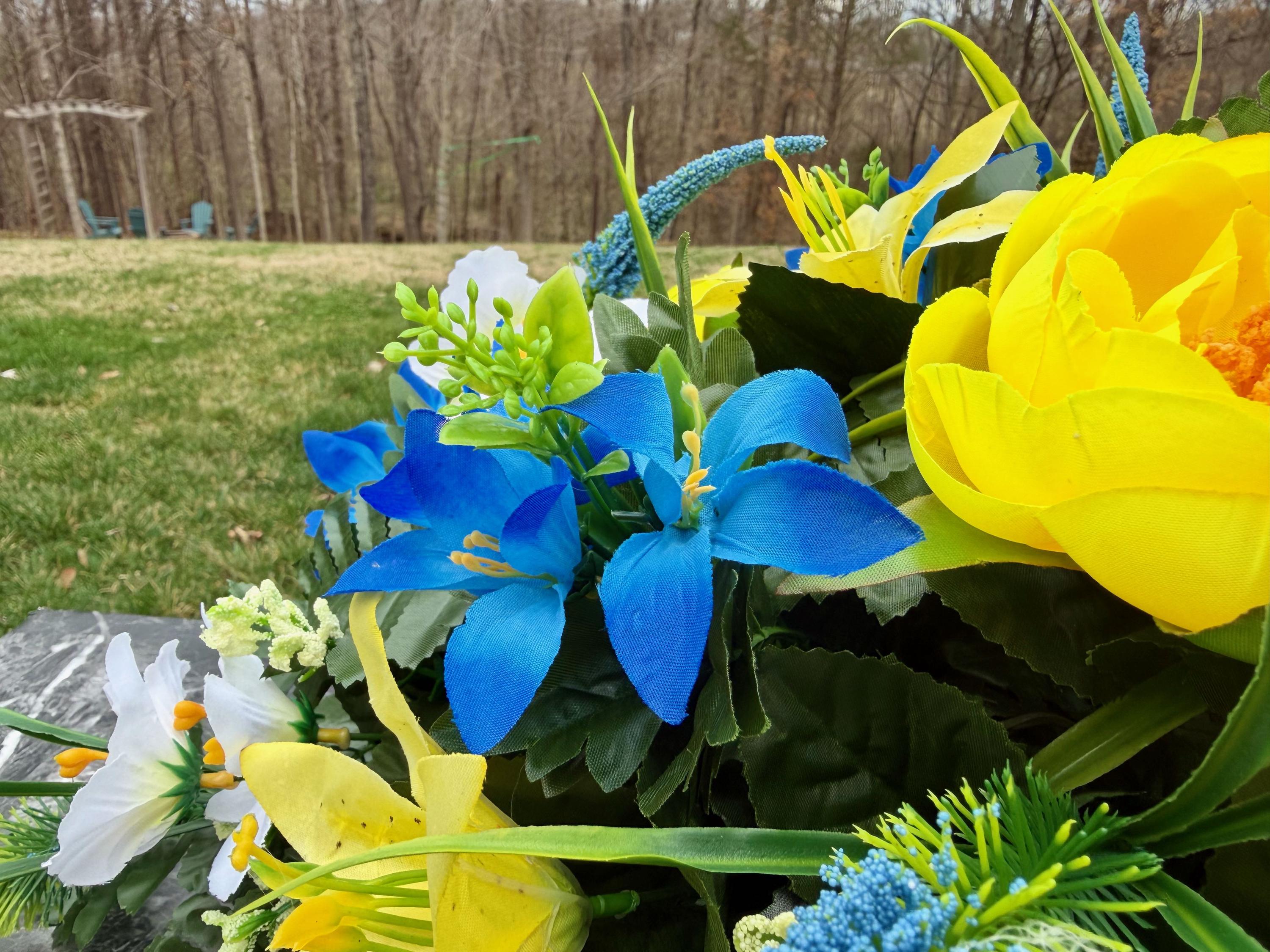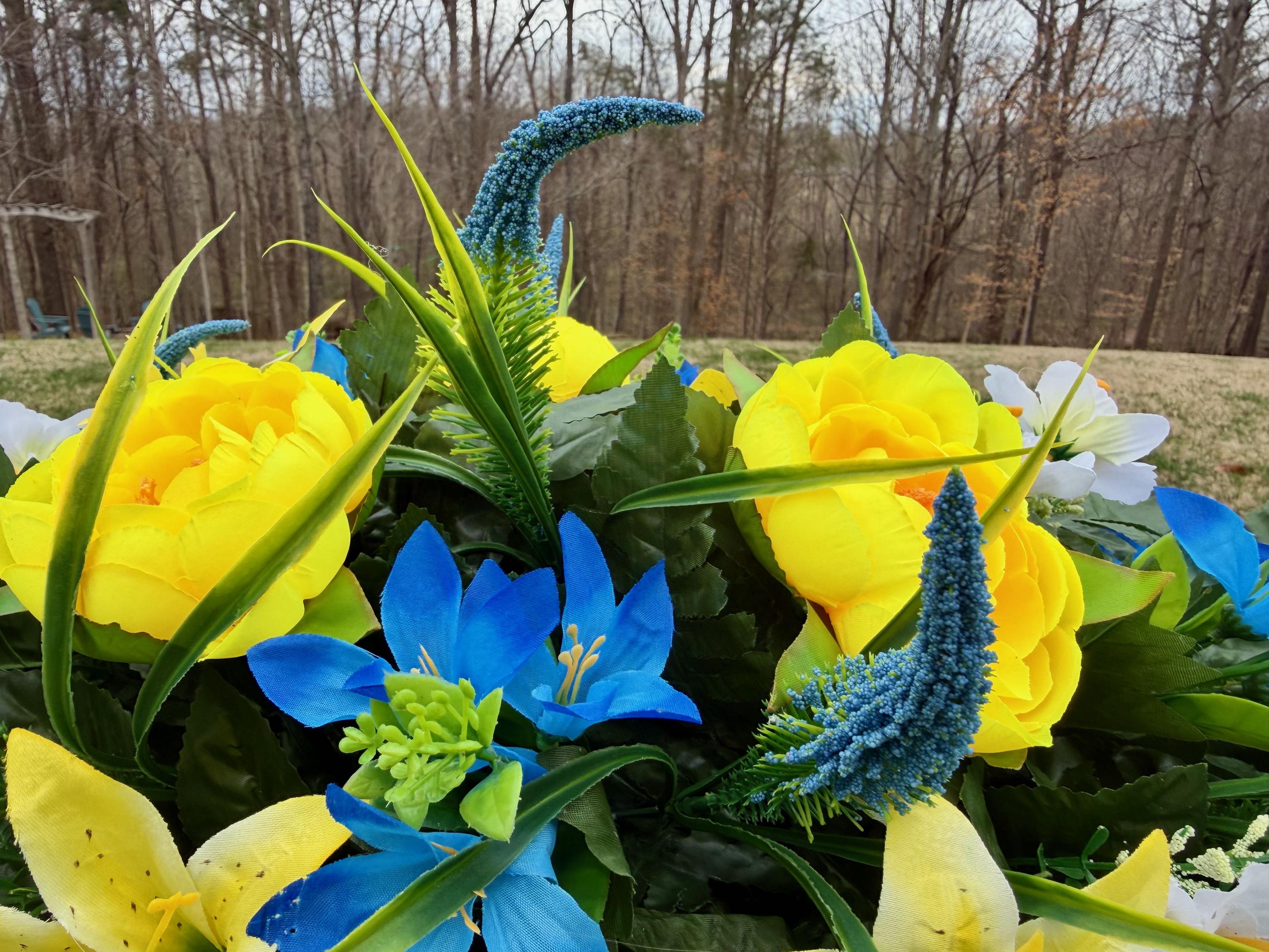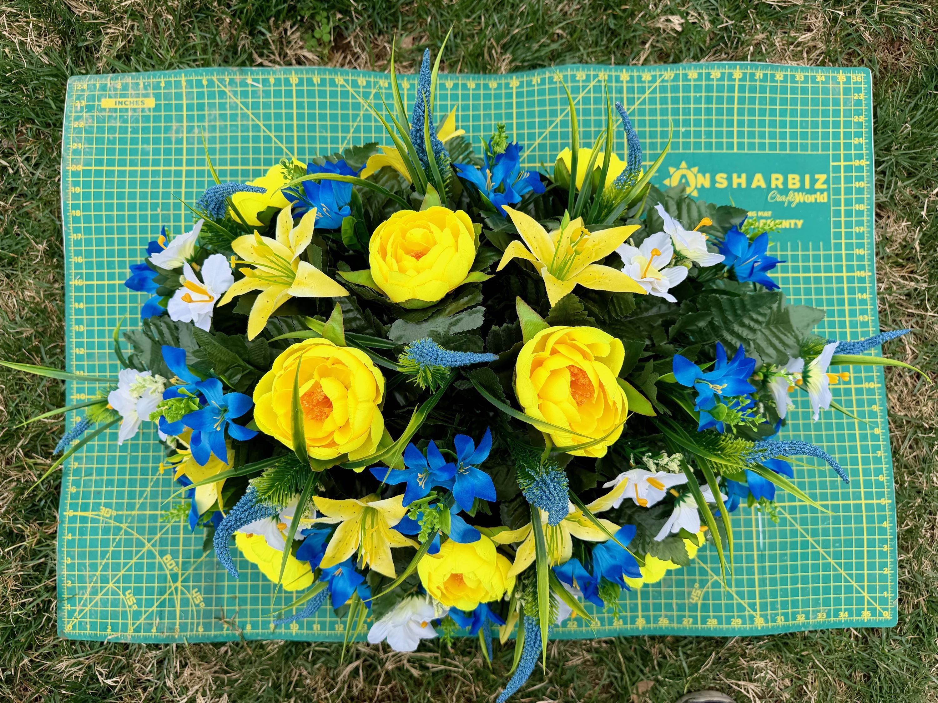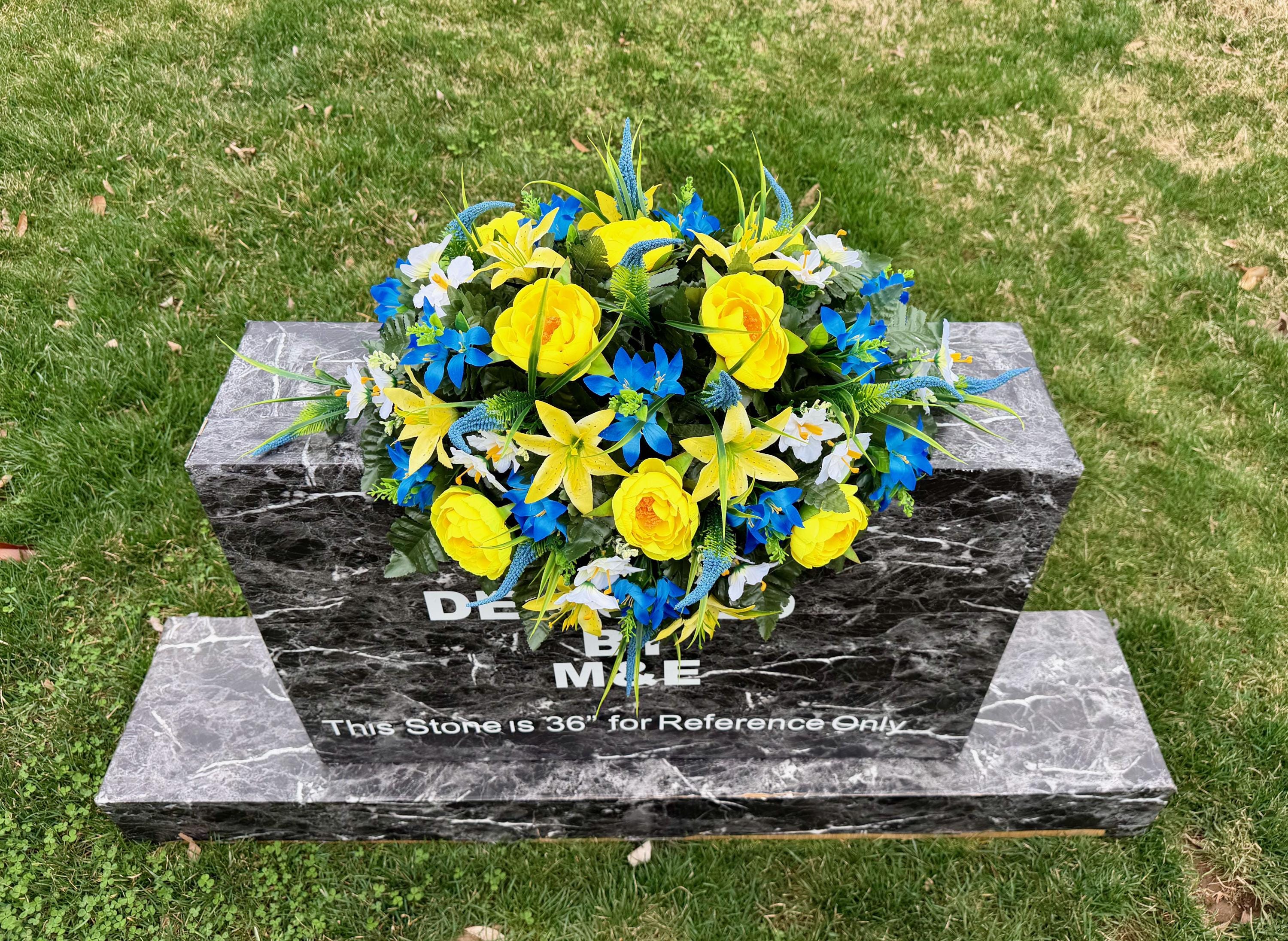 Bright Blue and Yellow Cemetery Saddle, Grave Decoration, Memorial Flowers