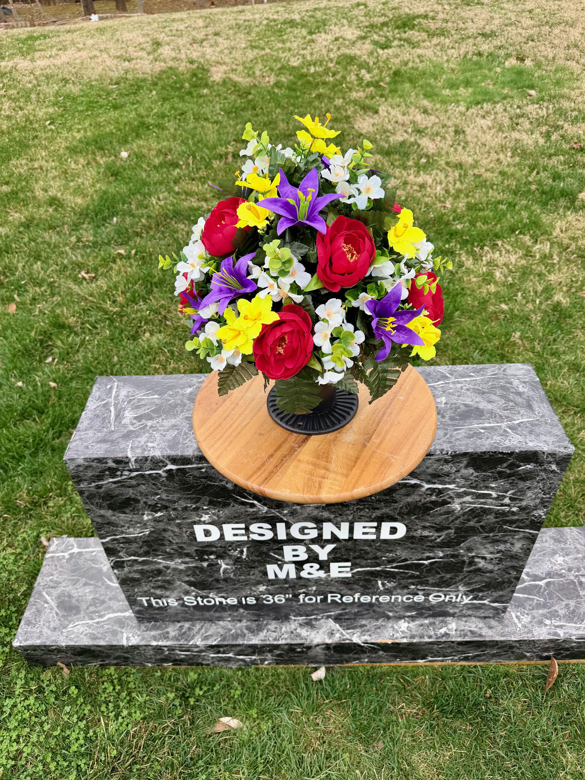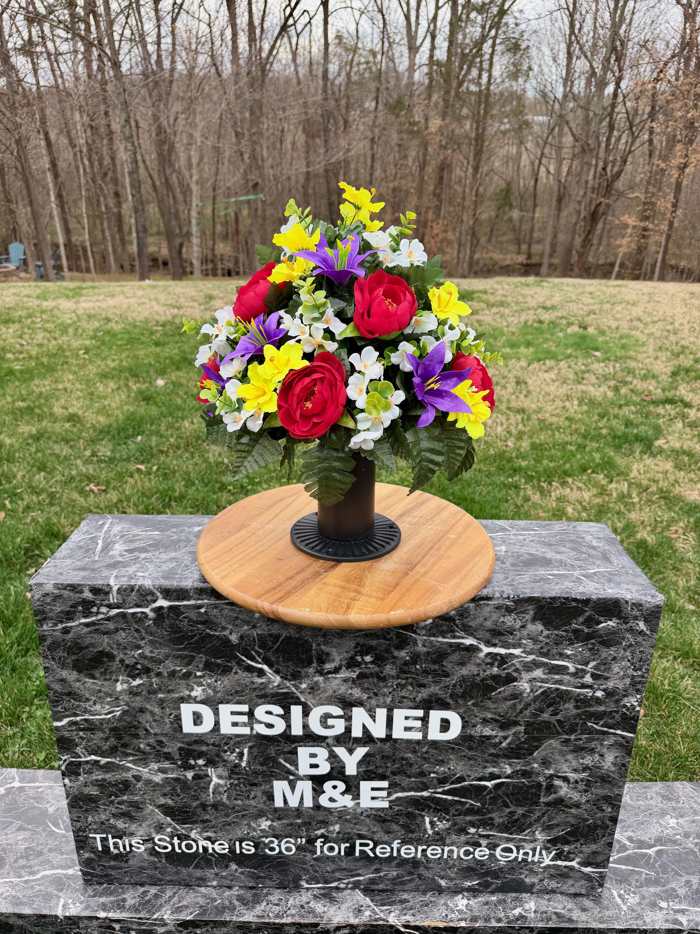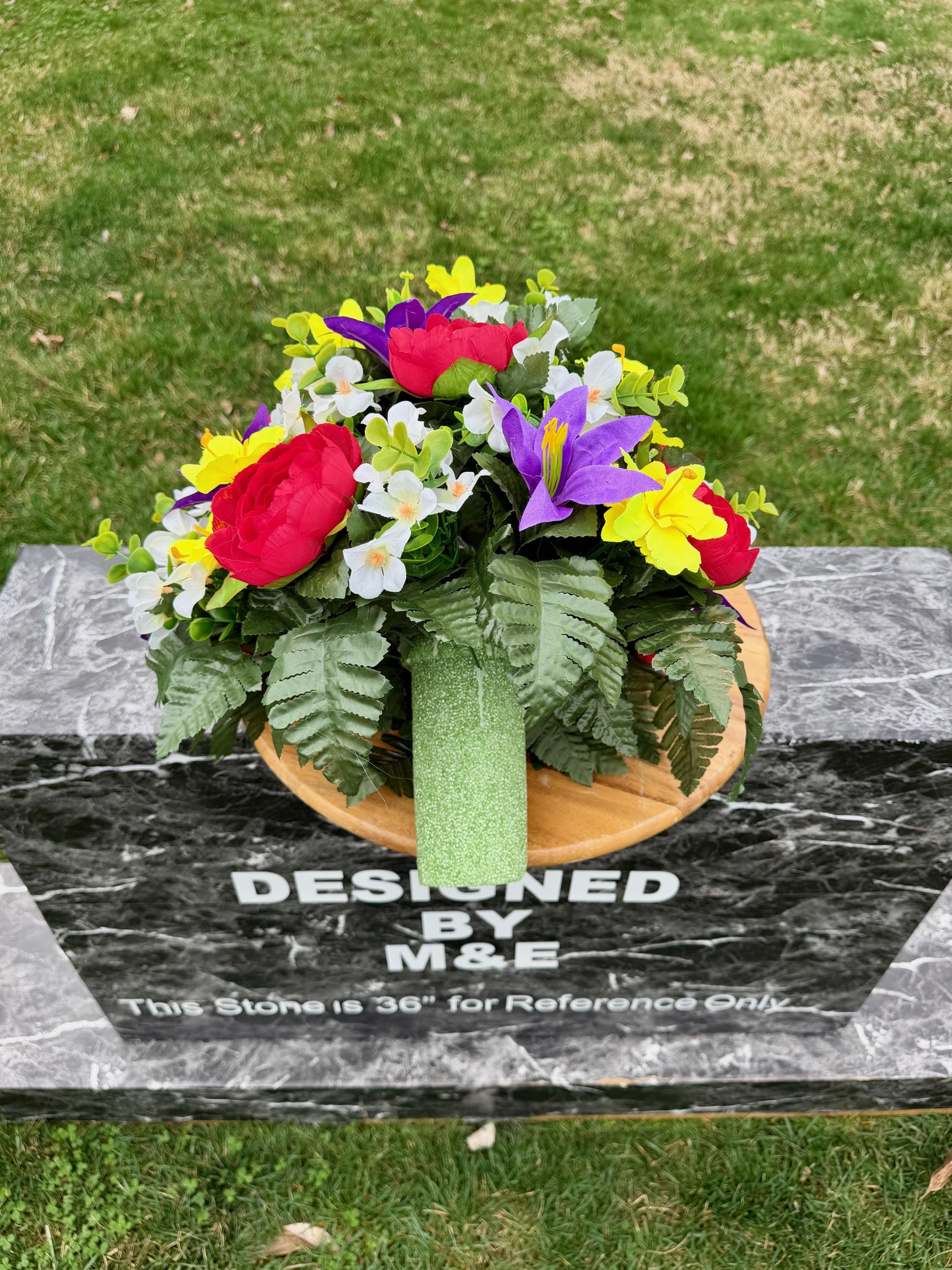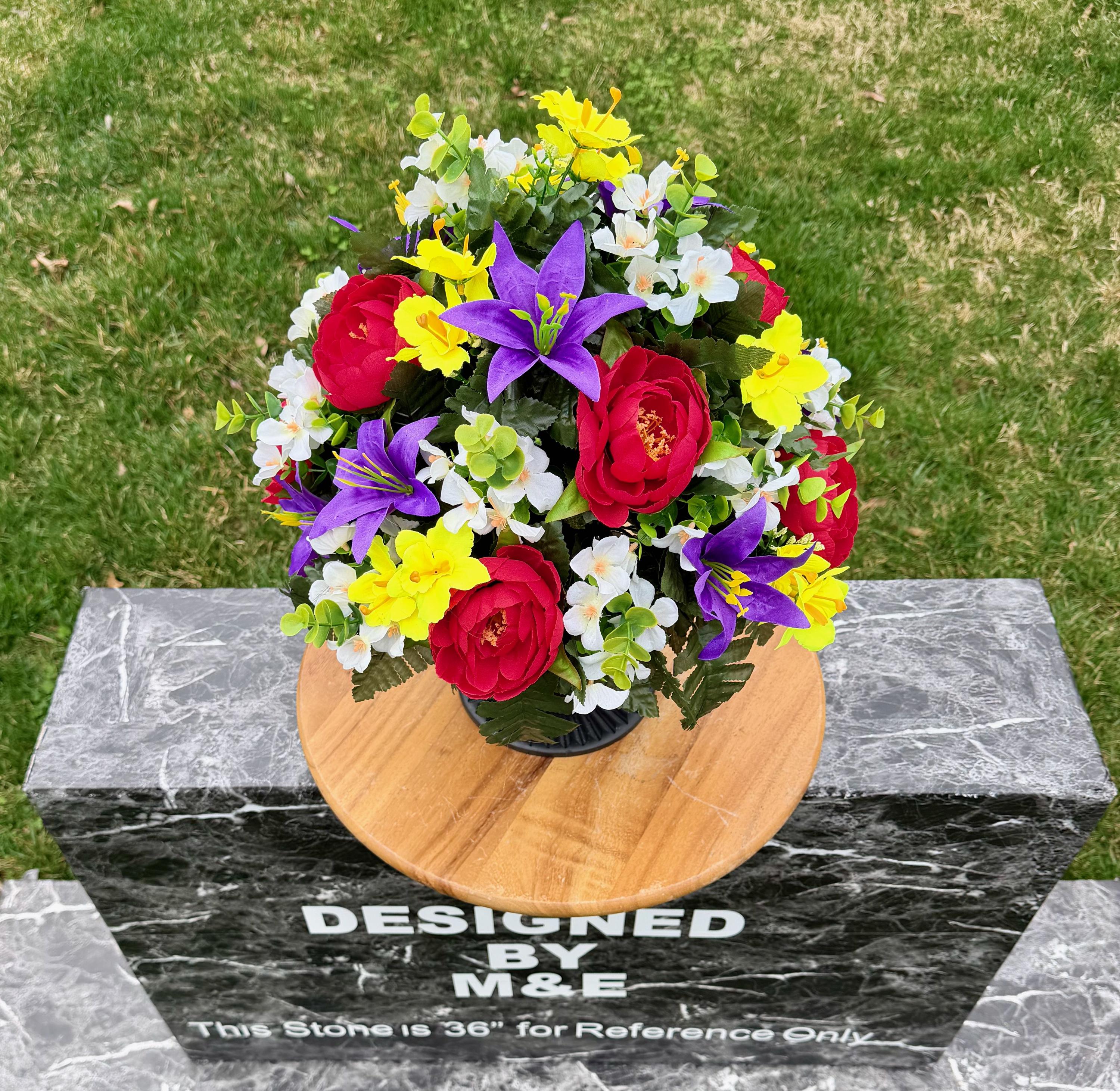 We’re a small, family-operated business consisting of myself, my husband, and my daughter. We personally manage every order and strive for excellent customer service. All our arrangements use high-quality silk flowers, though all silk blooms may fade over time. Each stem is glued into foam to withstand the elements. Designed by M&E uses only premium silks, and we put genuine care into every piece we create. Rest assured, the arrangement shown in our photos is exactly the one you’ll receive, as I design and assemble each one myself. If you’re searching for something unique or have a particular flower, color, or matching vases in mind, please contact me to discuss a custom order.