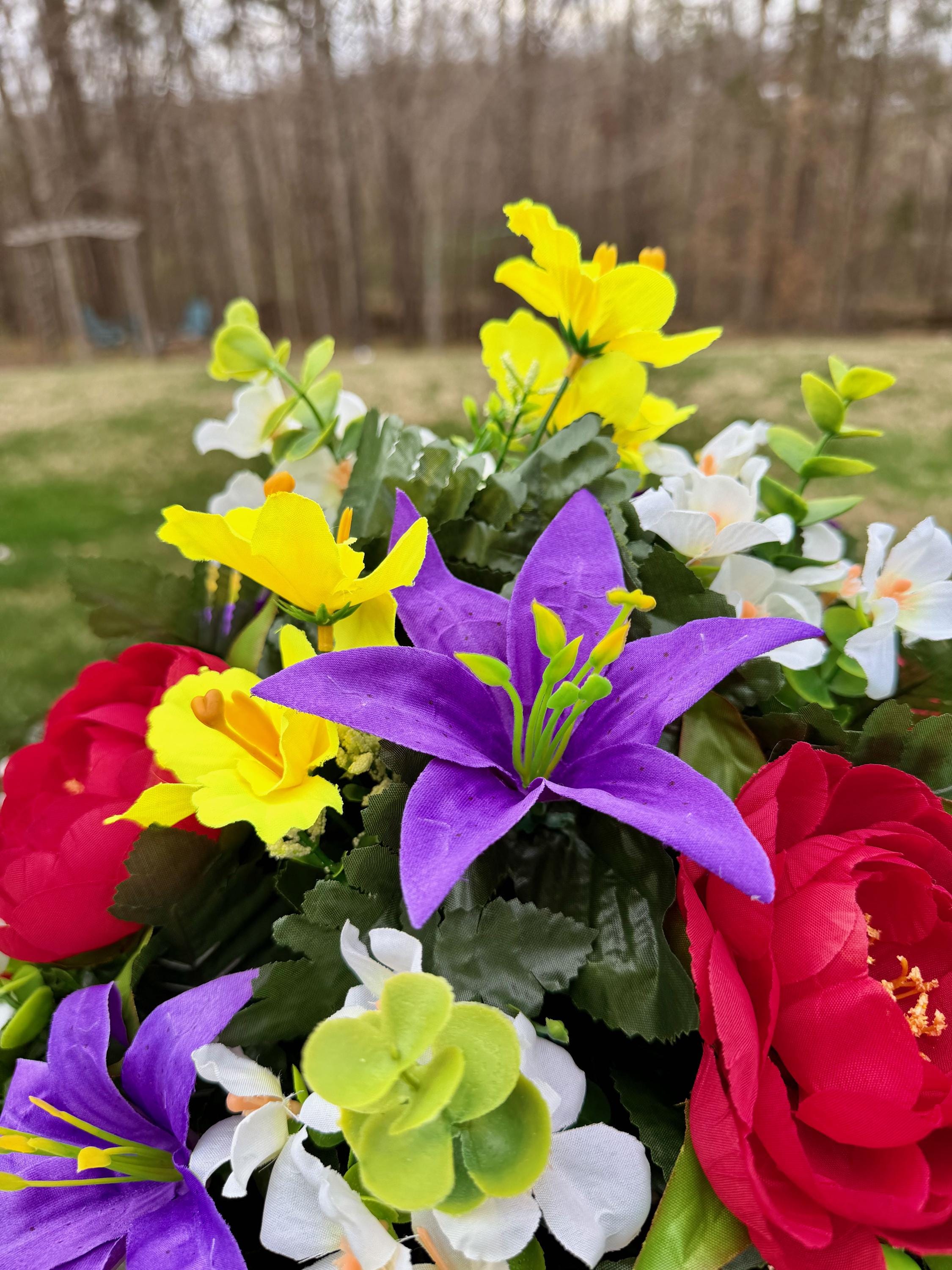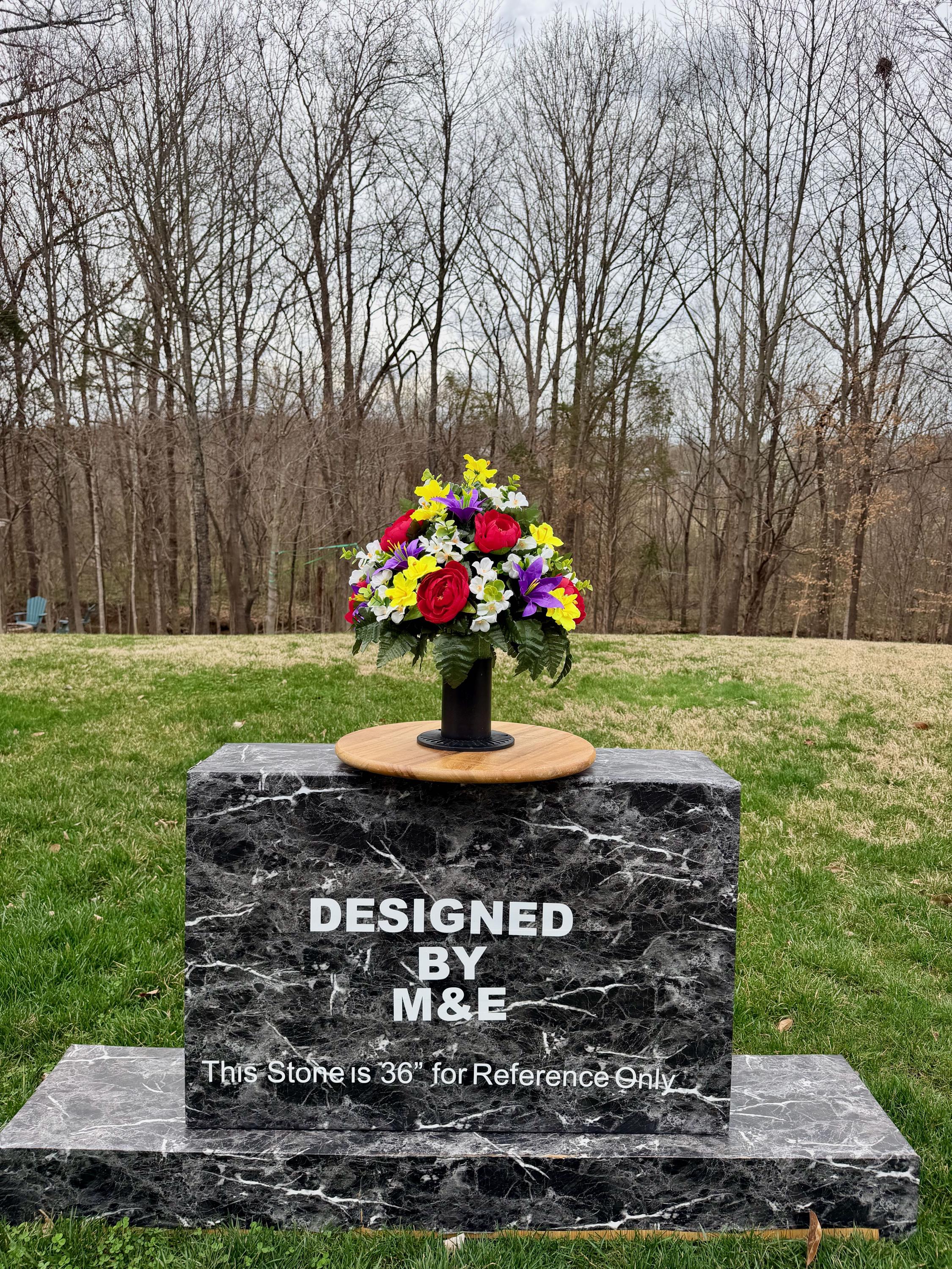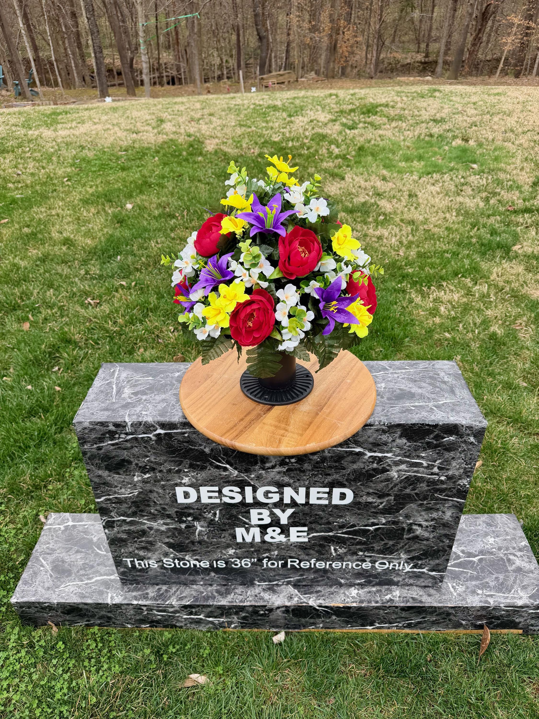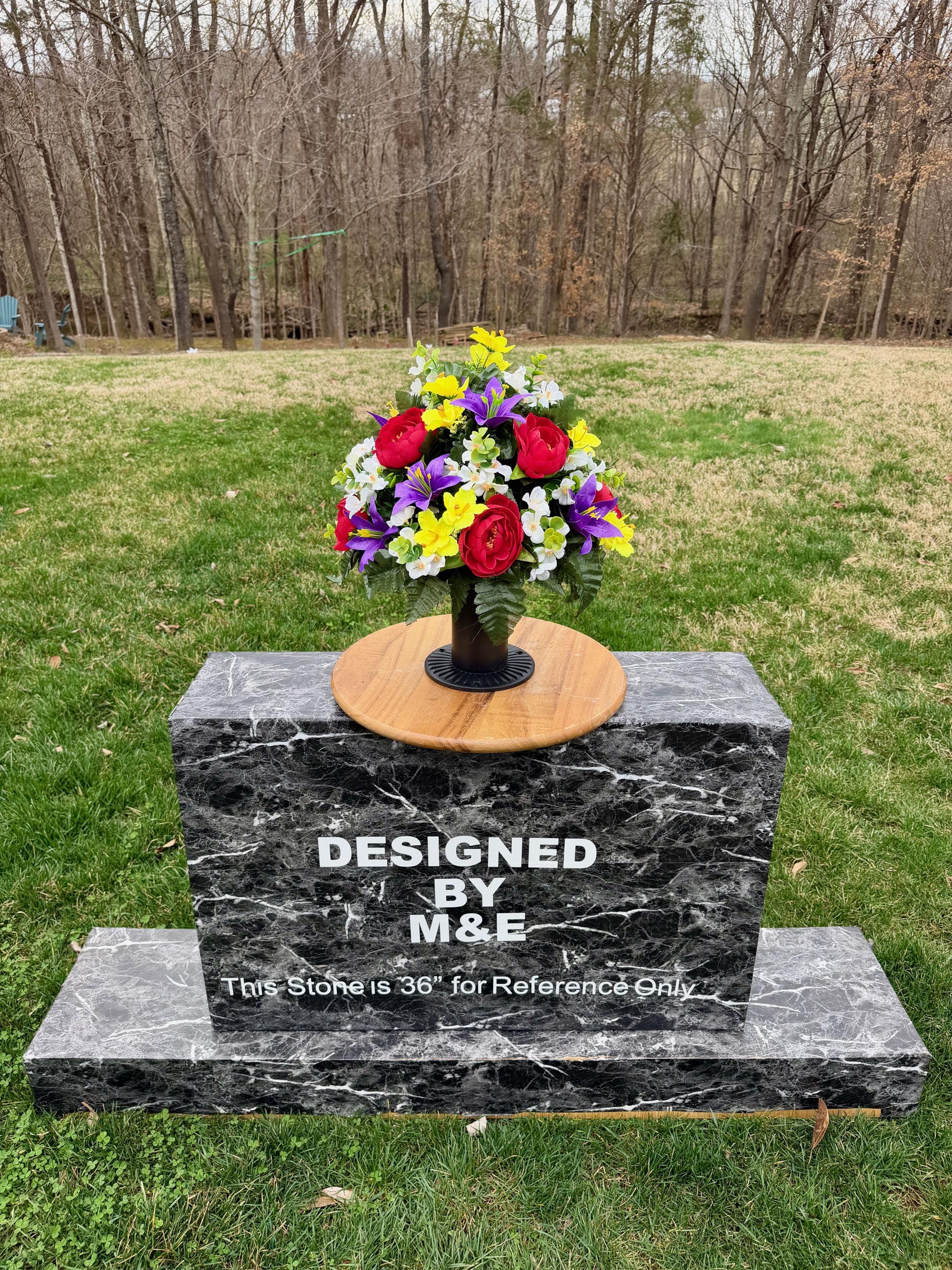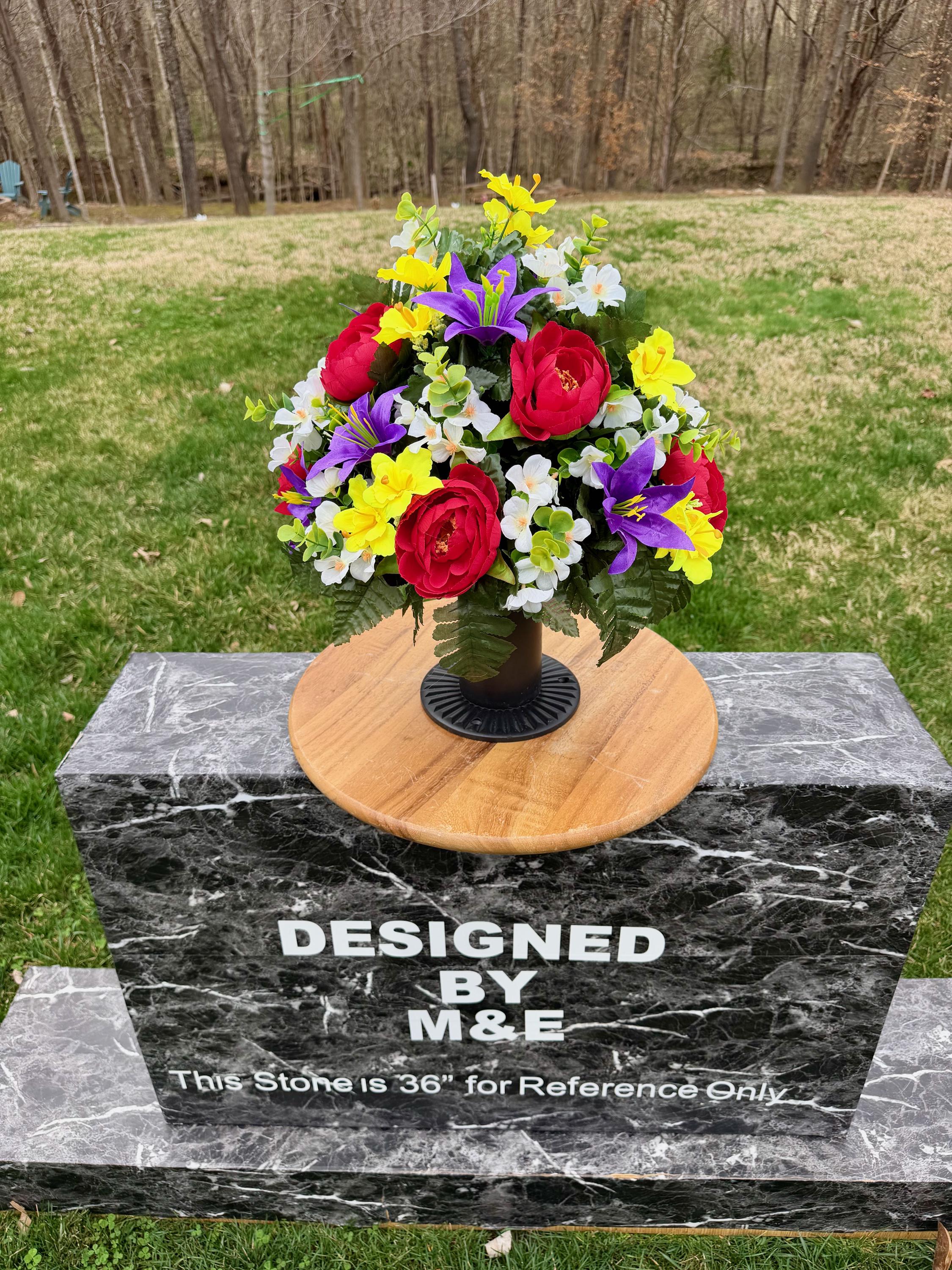 We’re a small, family-operated business consisting of myself, my husband, and my daughter. We personally manage every order and strive for excellent customer service. All our arrangements use high-quality silk flowers, though all silk blooms may fade over time. Each stem is glued into foam to withstand the elements. Designed by M&E uses only premium silks, and we put genuine care into every piece we create. Rest assured, the arrangement shown in our photos is exactly the one you’ll receive, as I design and assemble each one myself. If you’re searching for something unique or have a particular flower, color, or matching vases in mind, please contact me to discuss a custom order.