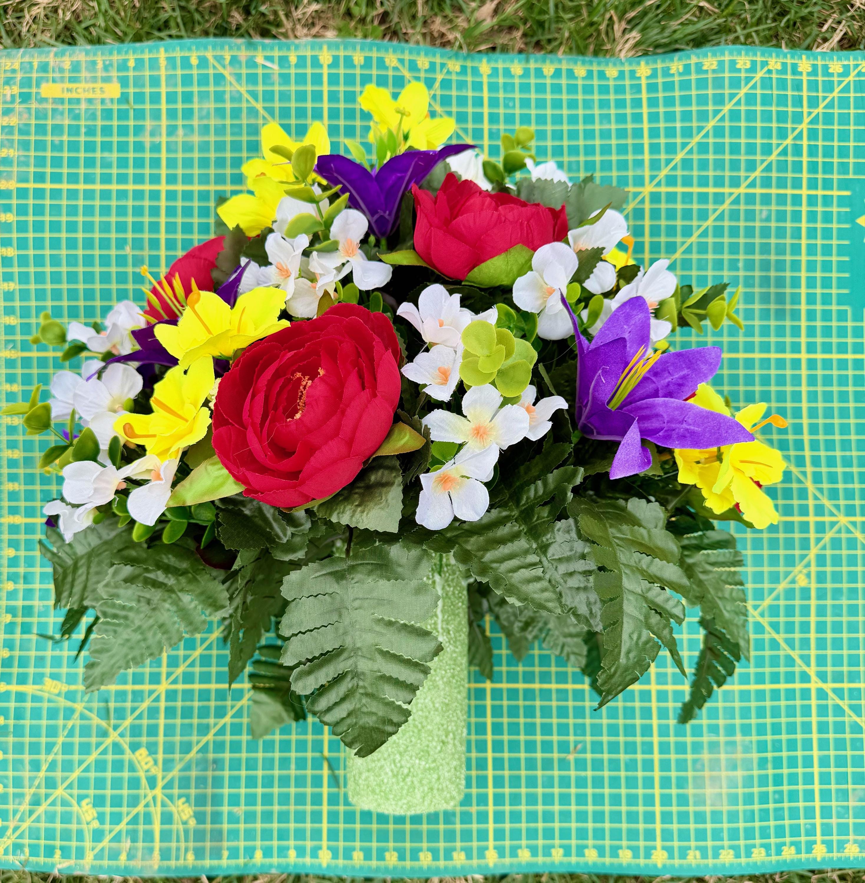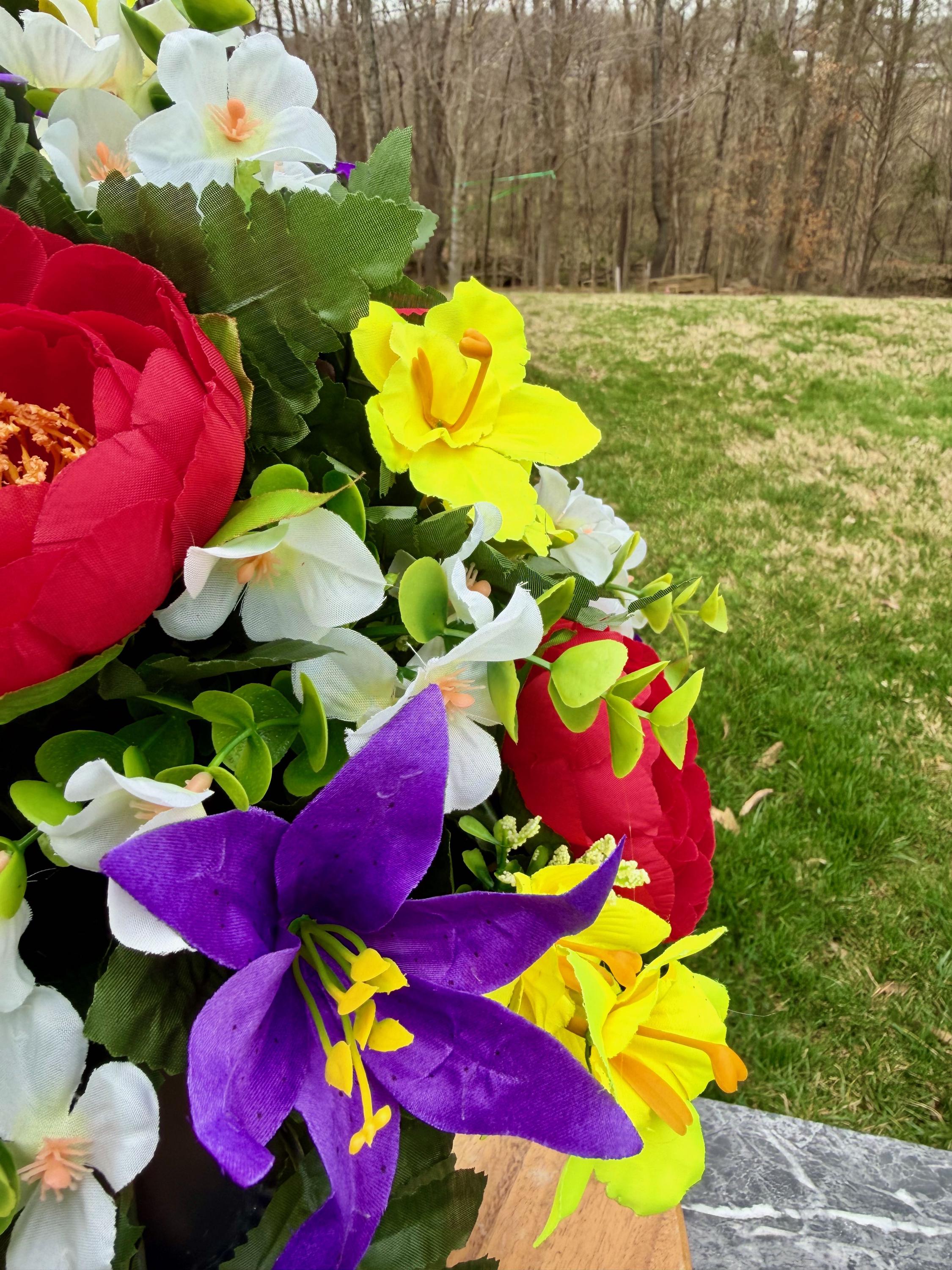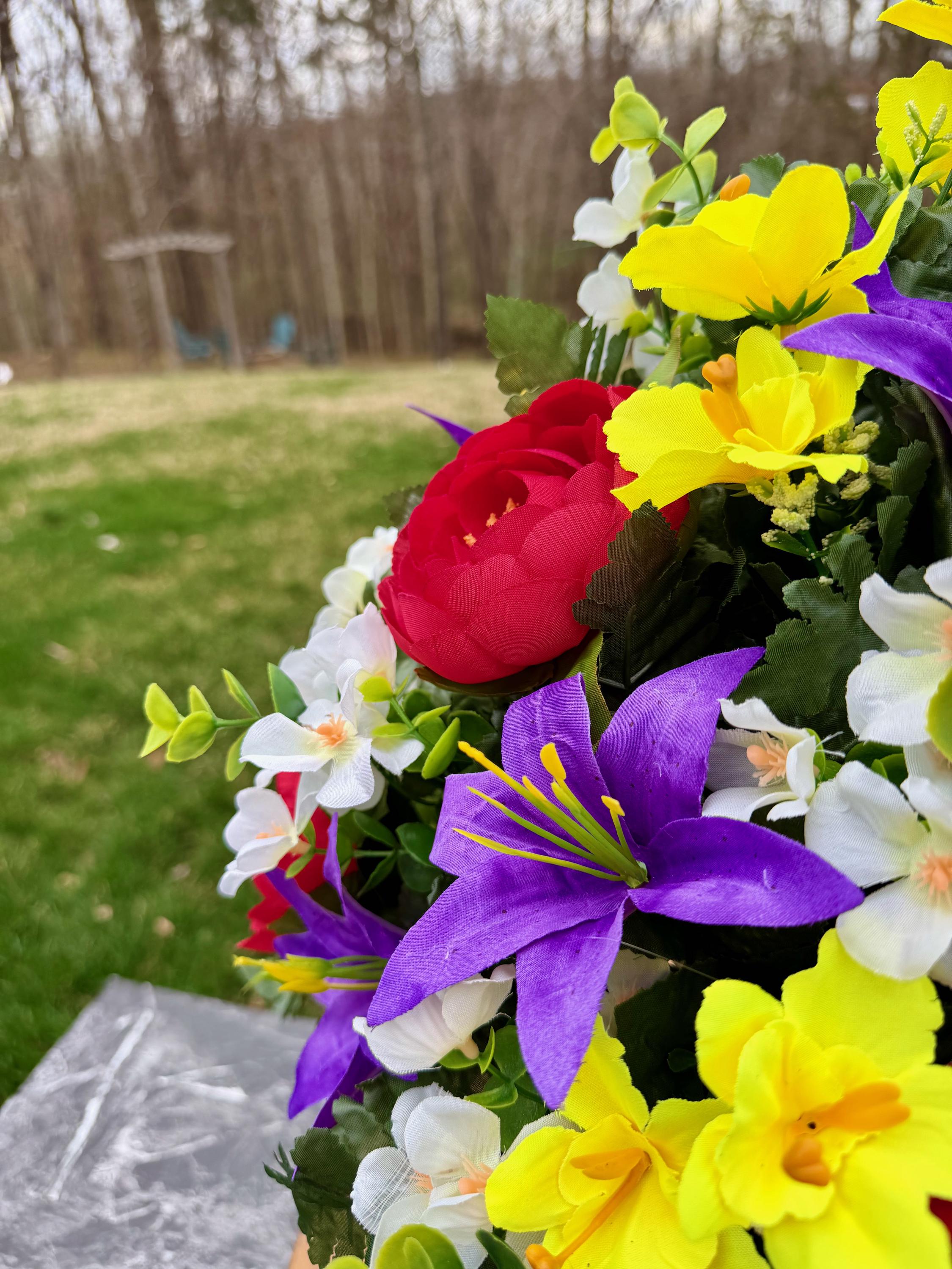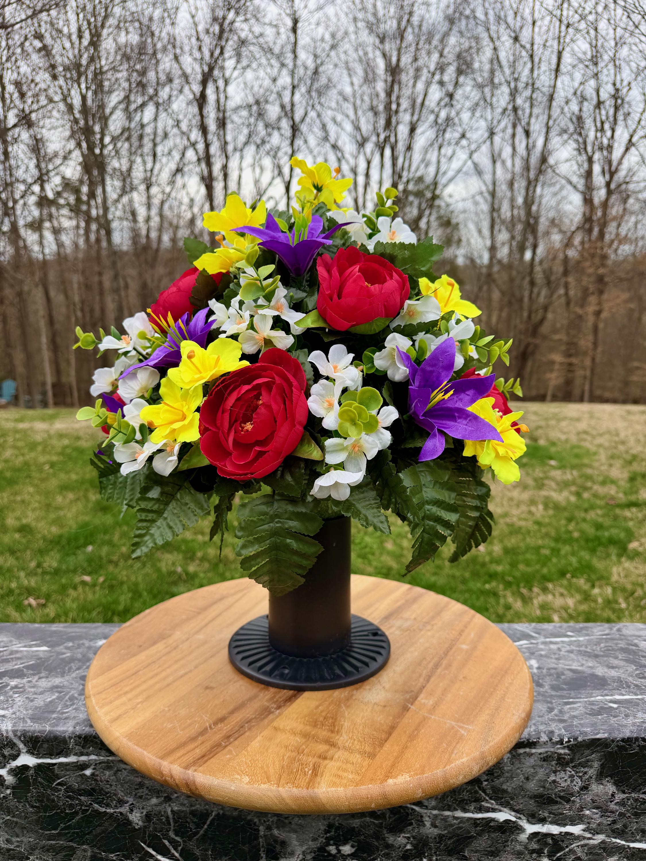 We’re a small, family-operated business consisting of myself, my husband, and my daughter. We personally manage every order and strive for excellent customer service. All our arrangements use high-quality silk flowers, though all silk blooms may fade over time. Each stem is glued into foam to withstand the elements. Designed by M&E uses only premium silks, and we put genuine care into every piece we create. Rest assured, the arrangement shown in our photos is exactly the one you’ll receive, as I design and assemble each one myself. If you’re searching for something unique or have a particular flower, color, or matching vases in mind, please contact me to discuss a custom order.