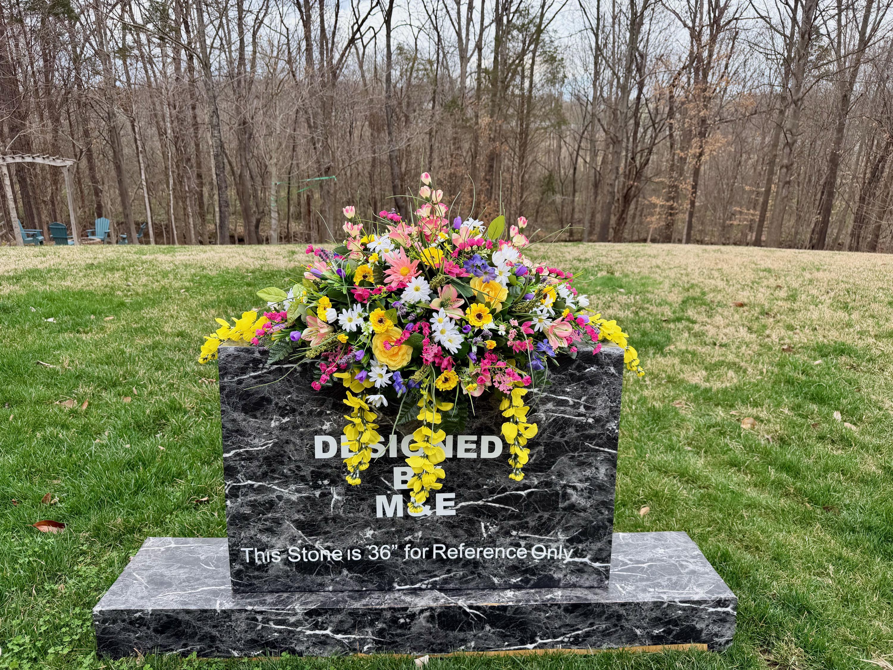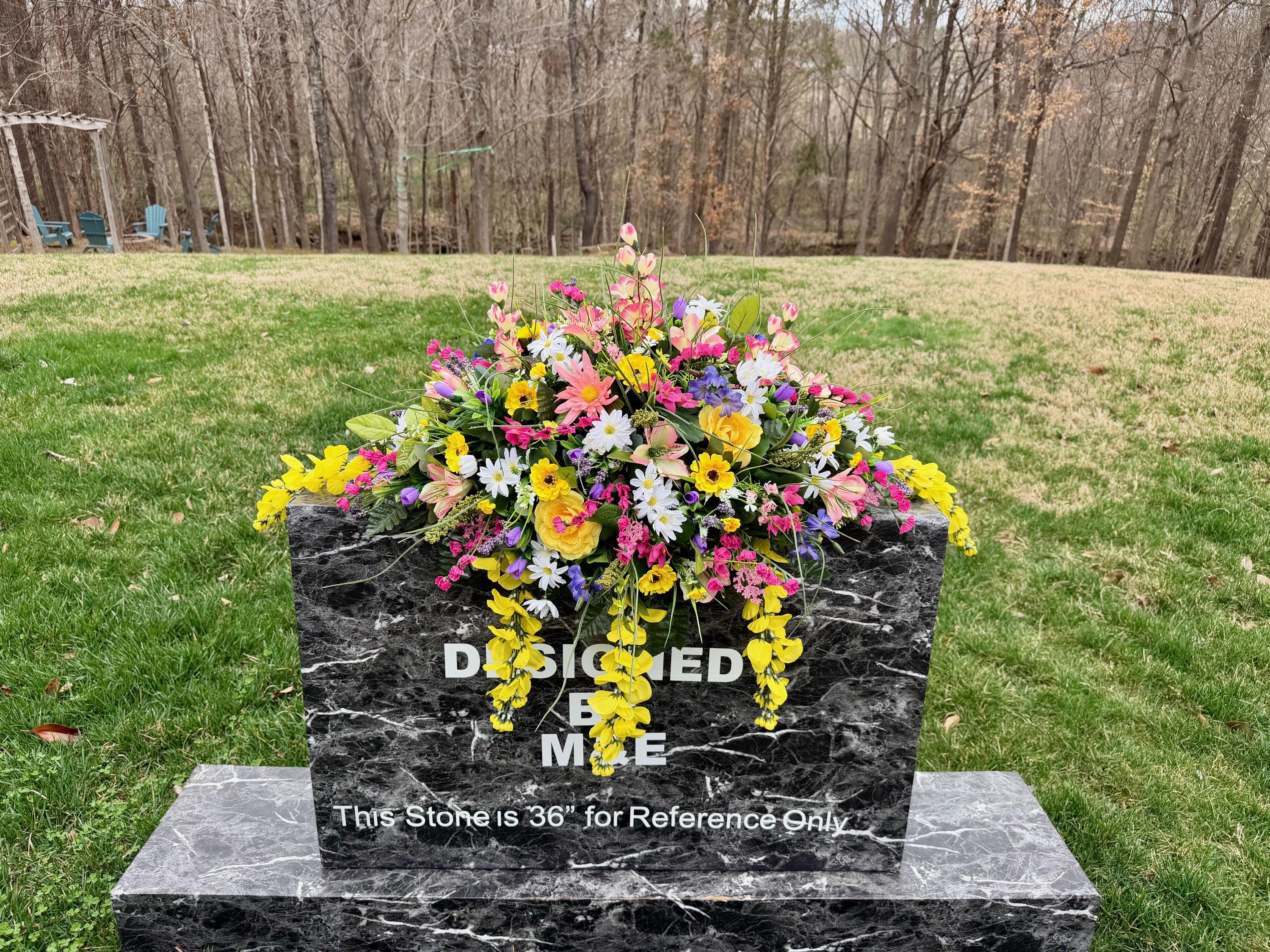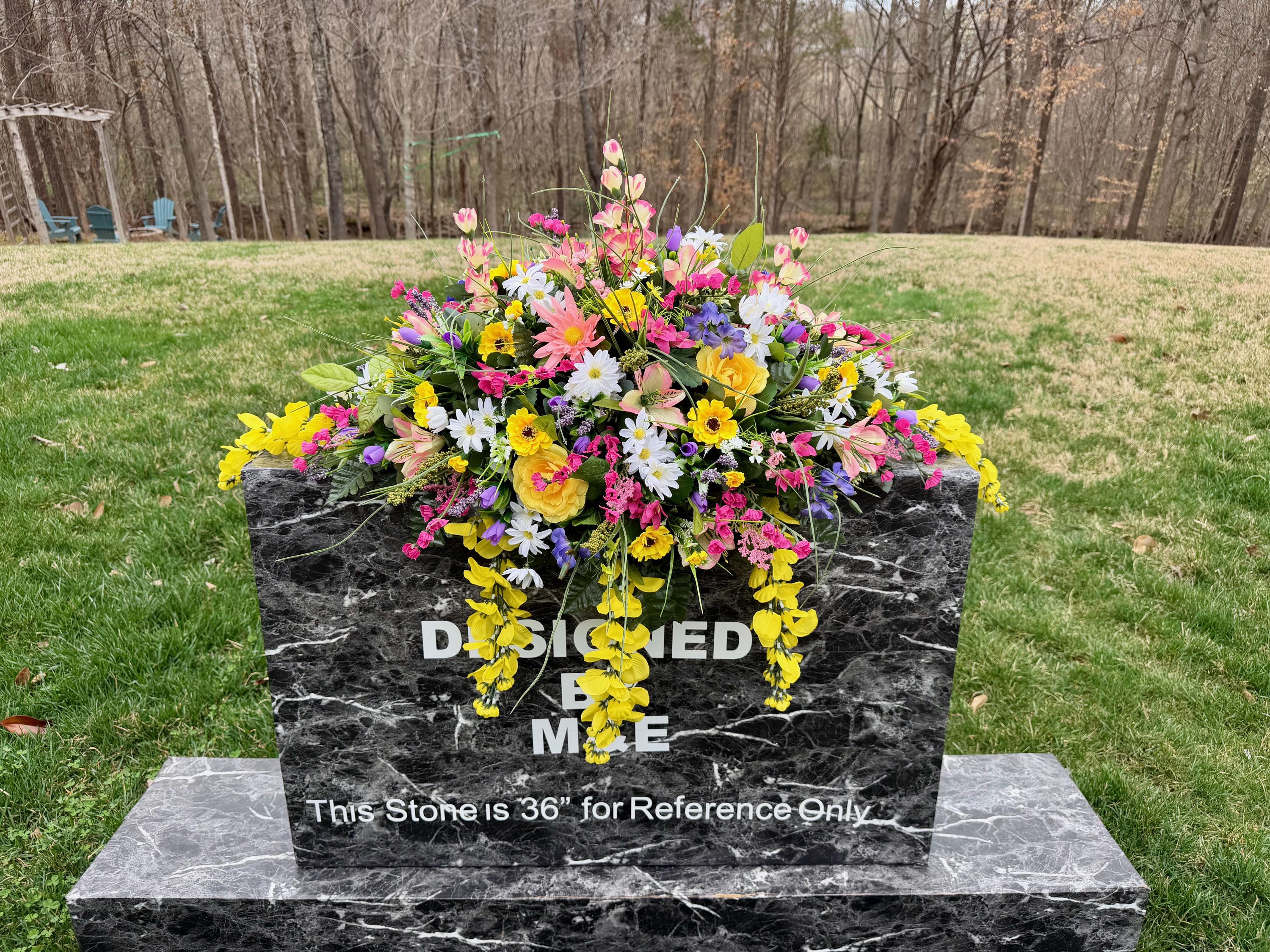 We’re a small, family-operated business consisting of myself, my husband, and my daughter. We personally manage every order and strive for excellent customer service. All our arrangements use high-quality silk flowers, though all silk blooms may fade over time. Each stem is glued into foam to withstand the elements. Designed by M&E uses only premium silks, and we put genuine care into every piece we create. Rest assured, the arrangement shown in our photos is exactly the one you’ll receive, as I design and assemble each one myself. If you’re searching for something unique or have a particular flower, color, or matching vases in mind, please contact me to discuss a custom order.