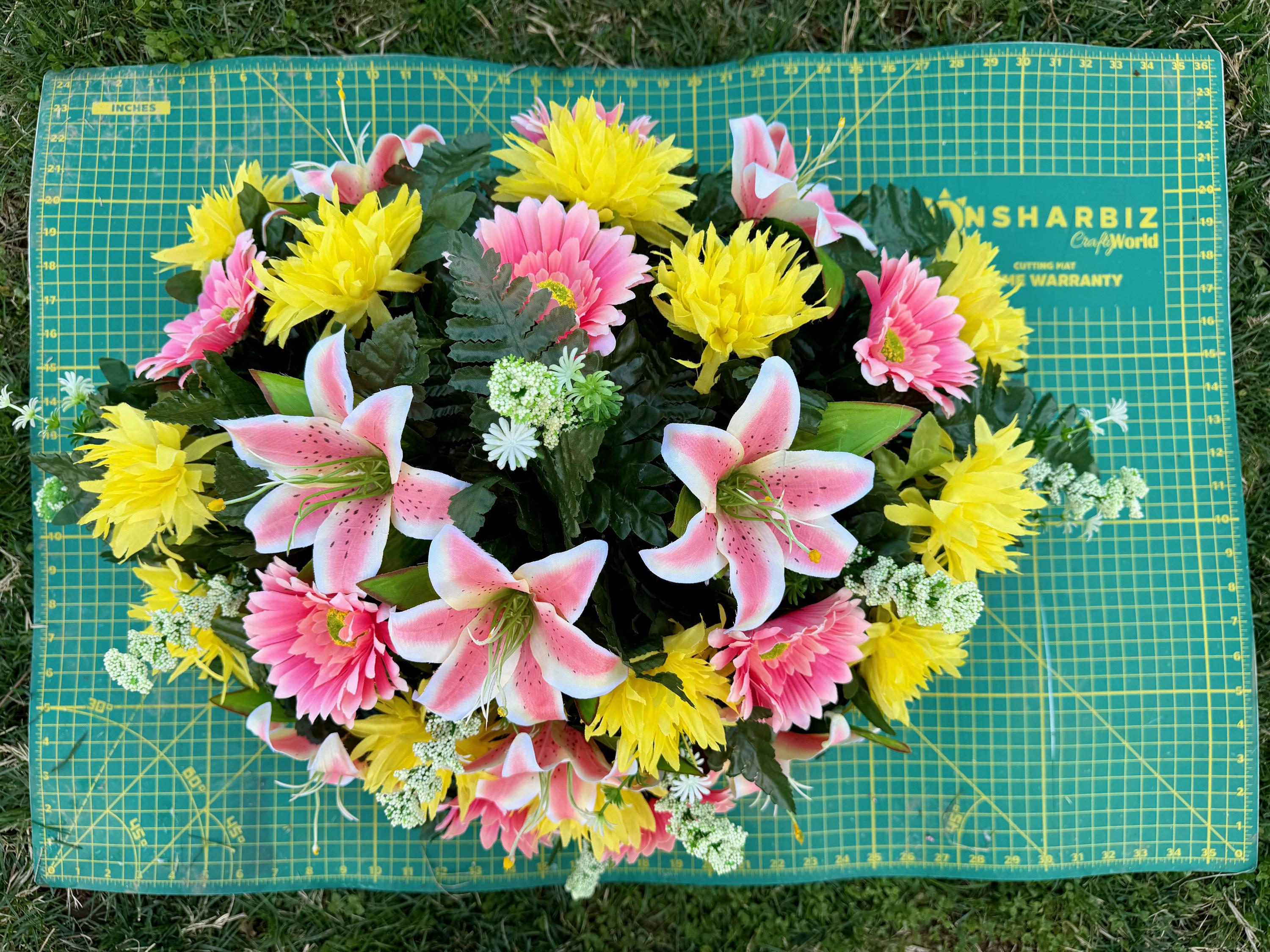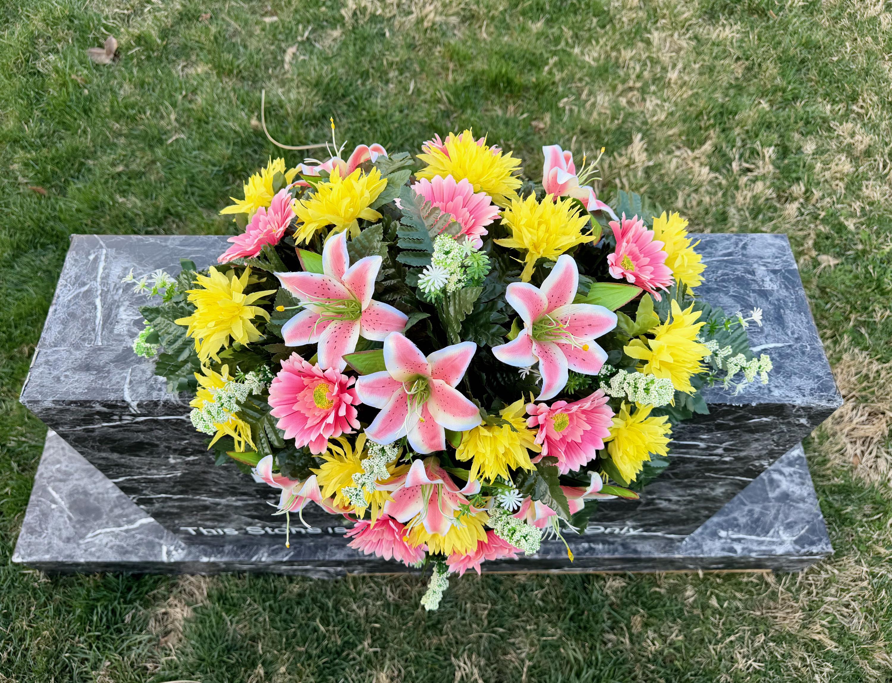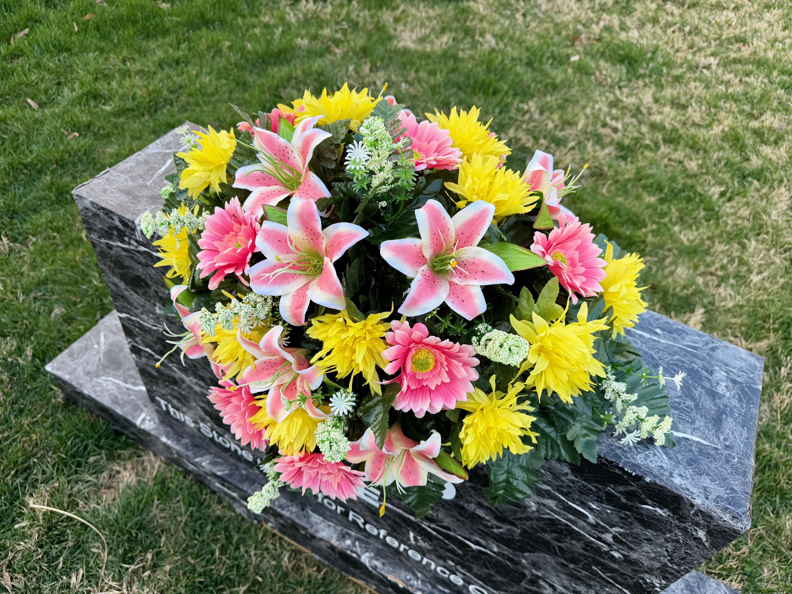 Pink Lilies and Yellow Flowers Cemetery Saddle, Cemetery Flowers, Headstone Saddle, Cemetery Arrangement, Memorial Day Flowers