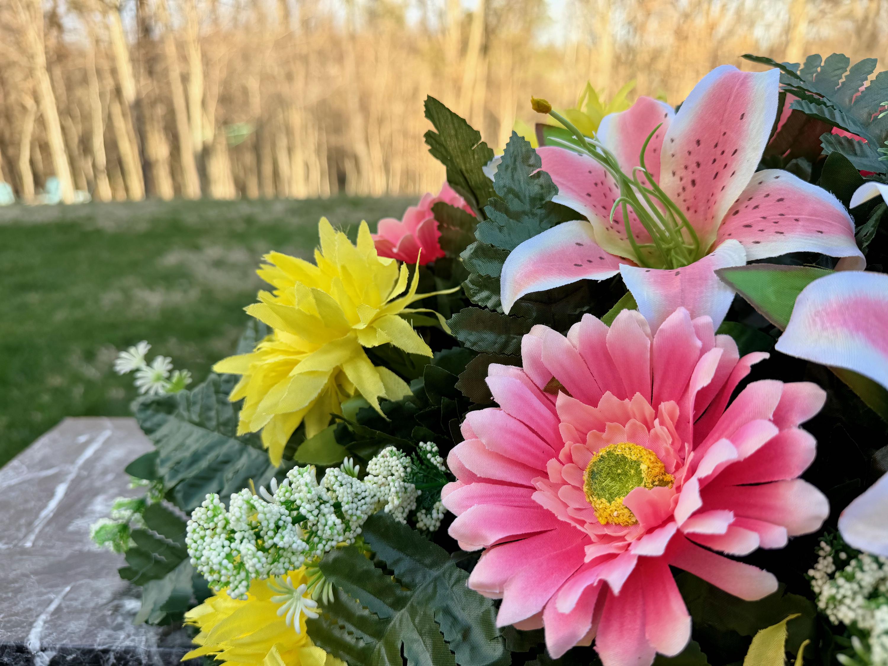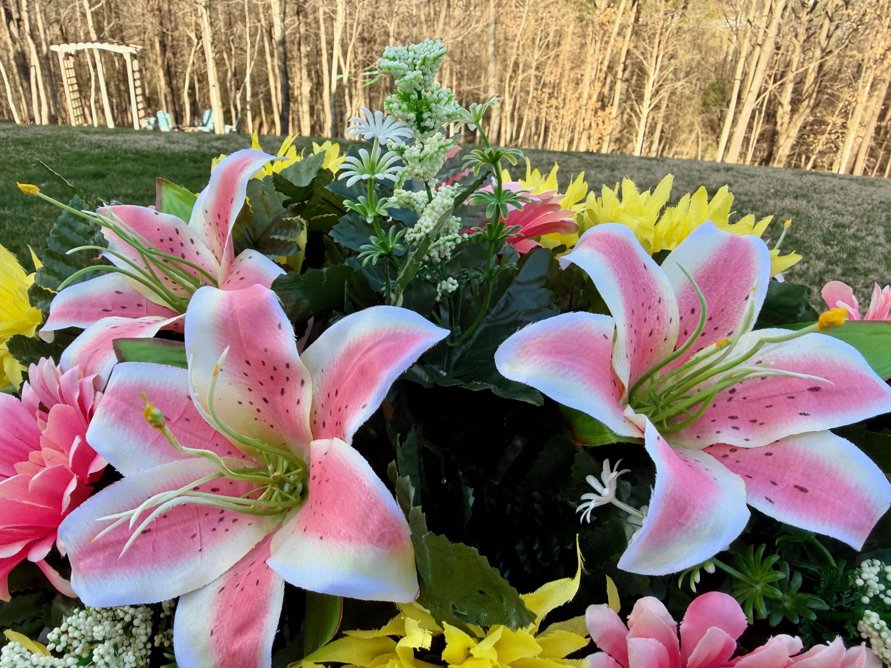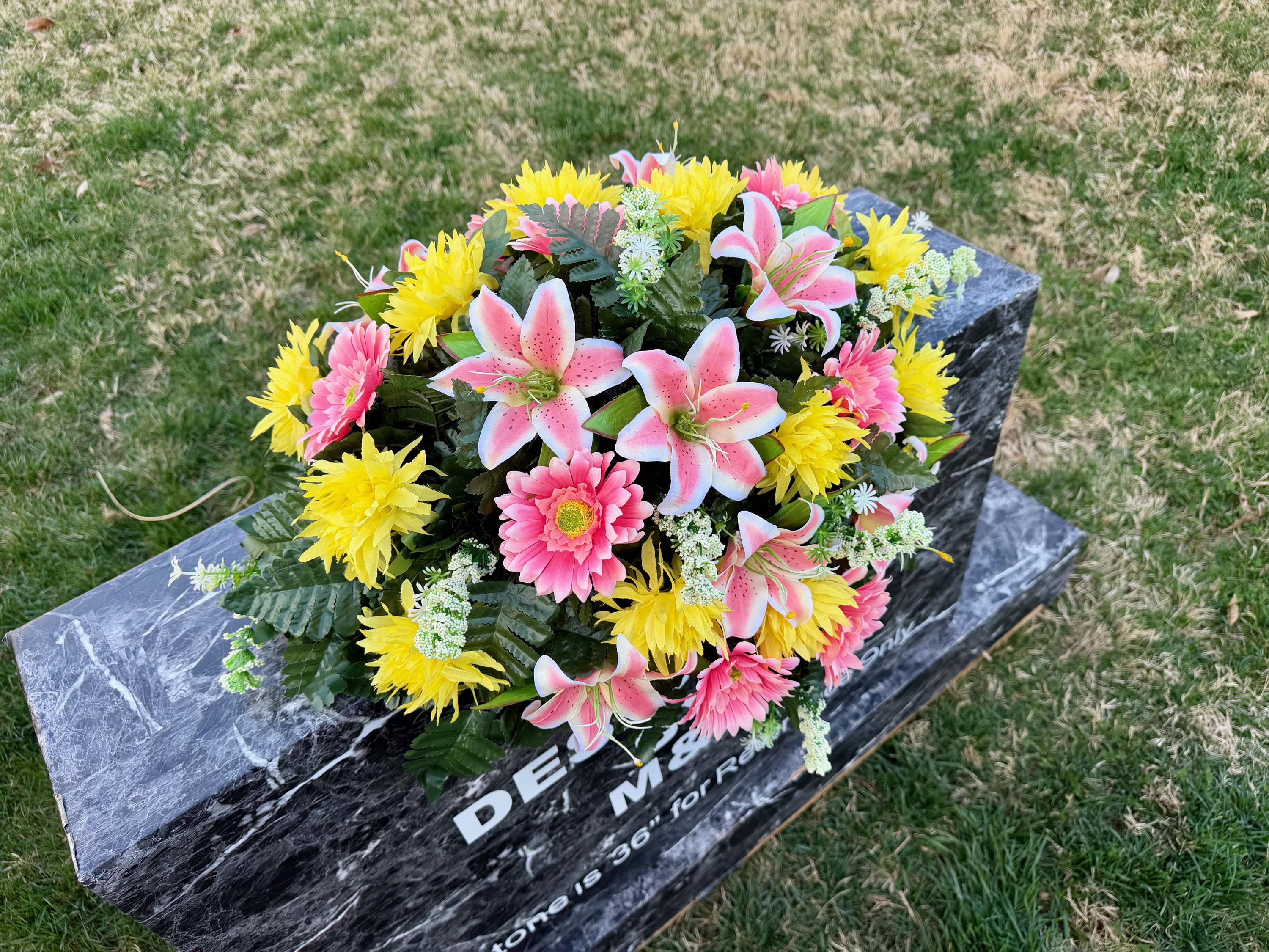 Pink Lilies and Yellow Flowers Cemetery Saddle, Cemetery Flowers, Headstone Saddle, Cemetery Arrangement, Memorial Day Flowers