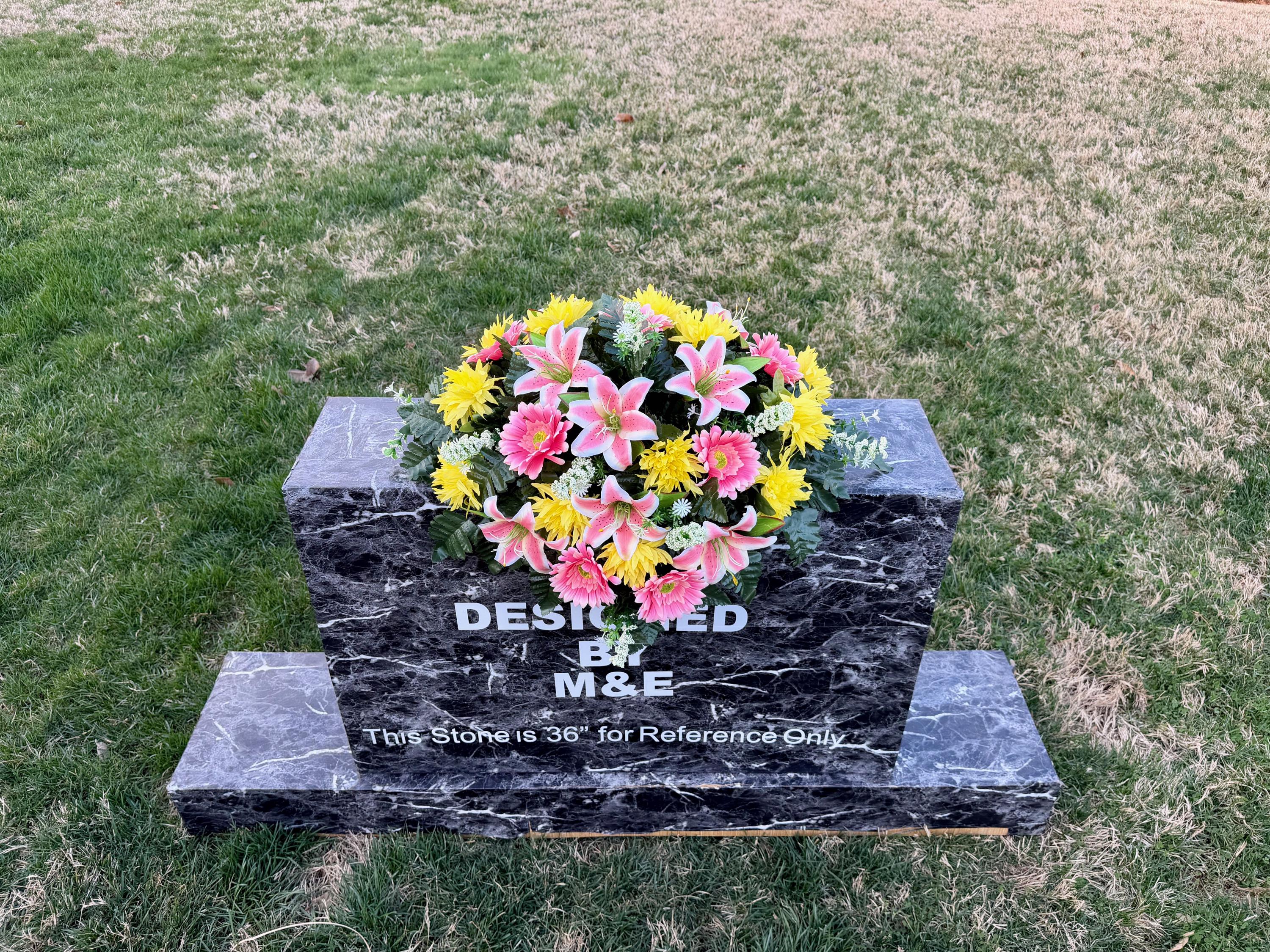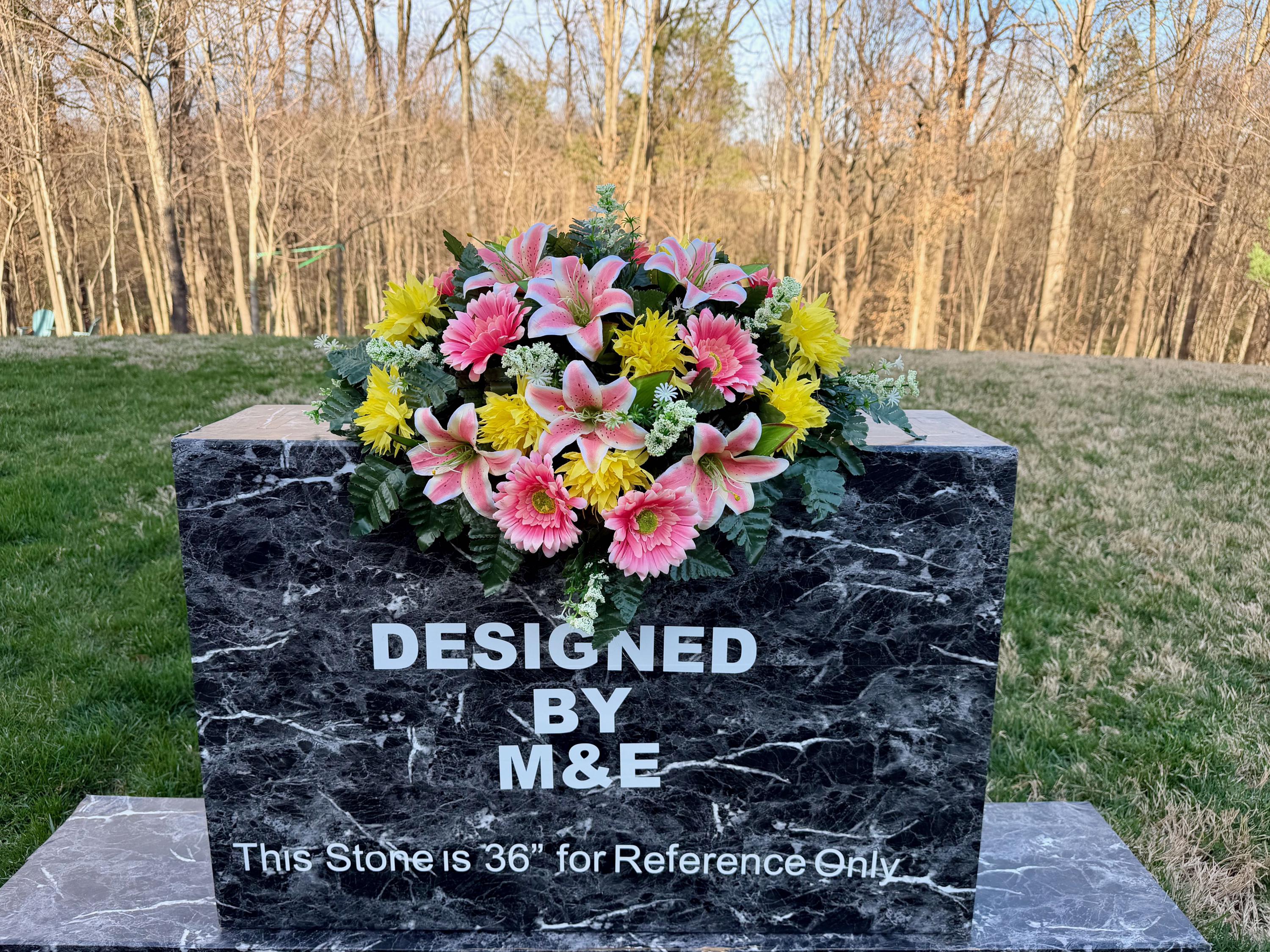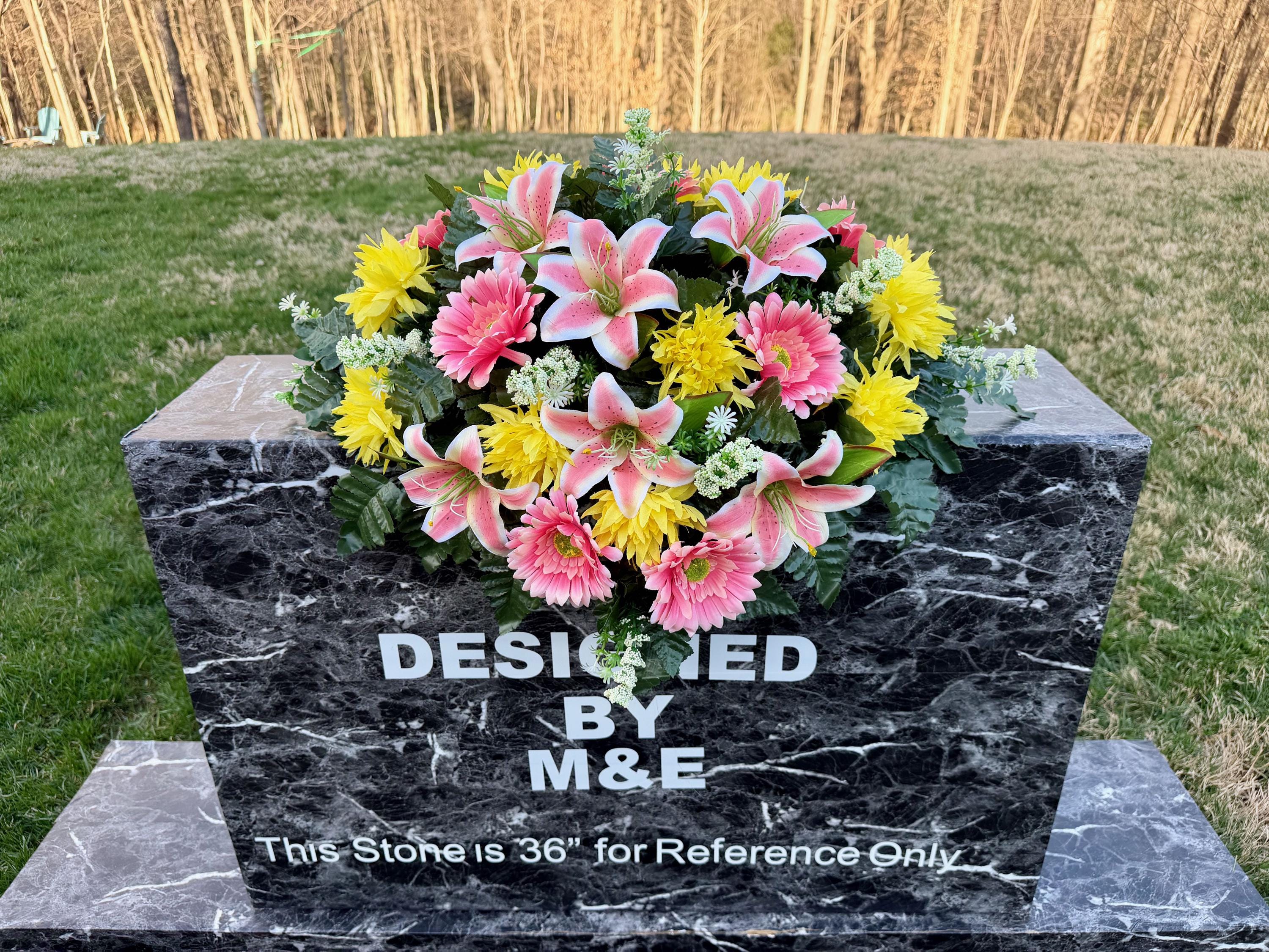 We’re a small, family-operated business consisting of myself, my husband, and my daughter. We personally manage every order and strive for excellent customer service. All our arrangements use high-quality silk flowers, though all silk blooms may fade over time. Each stem is glued into foam to withstand the elements. Designed by M&E uses only premium silks, and we put genuine care into every piece we create. Rest assured, the arrangement shown in our photos is exactly the one you’ll receive, as I design and assemble each one myself. If you’re searching for something unique or have a particular flower, color, or matching vases in mind, please contact me to discuss a custom order.