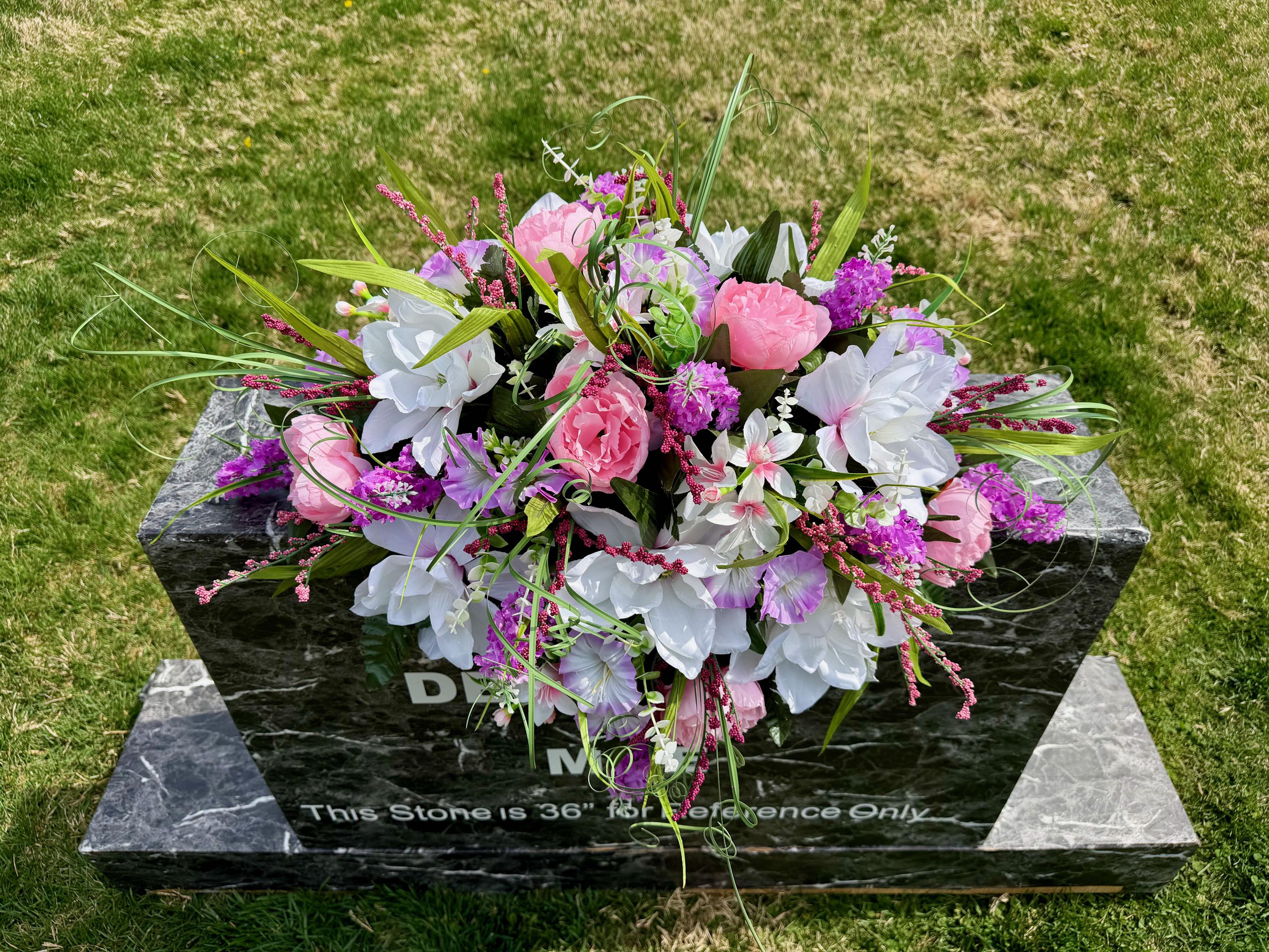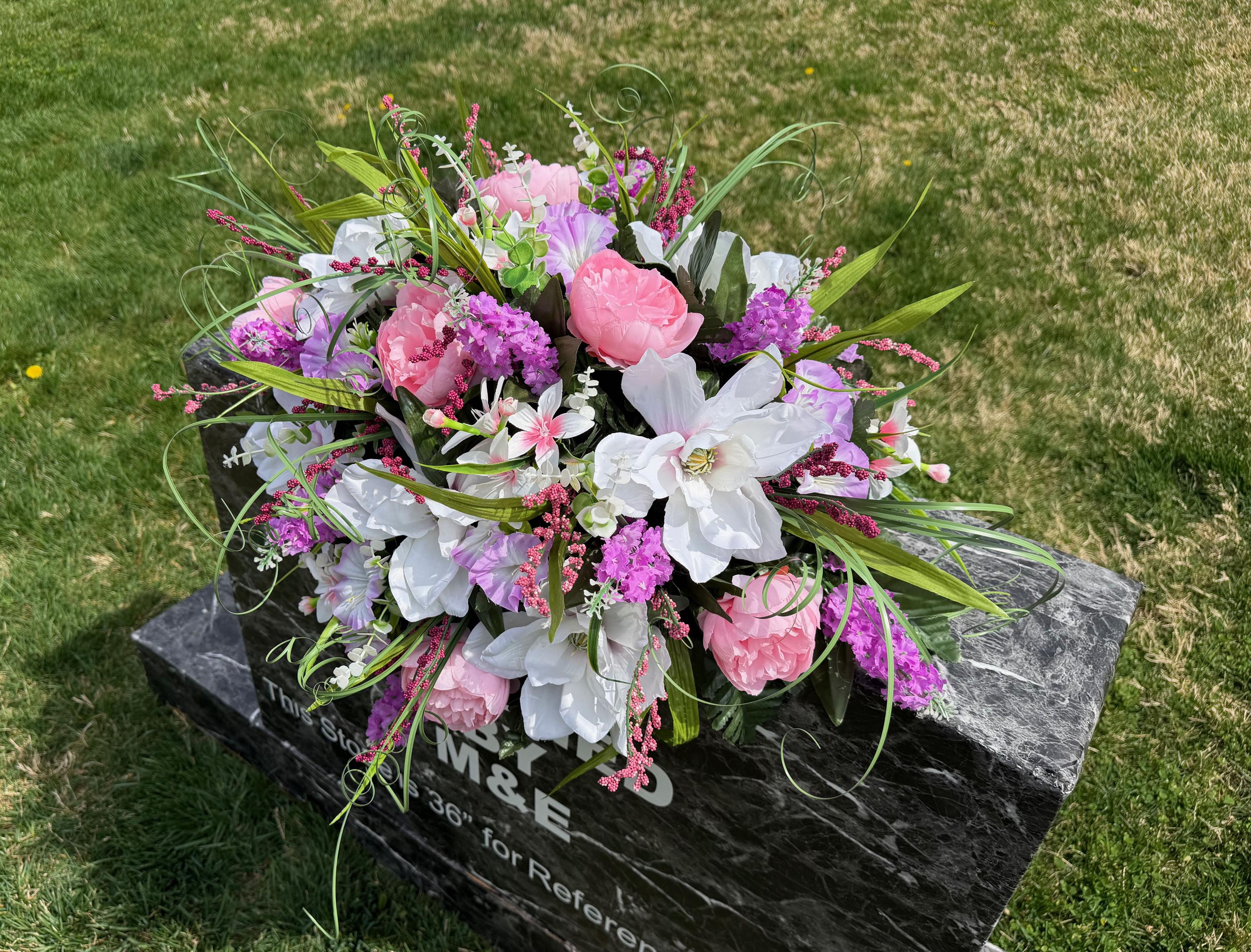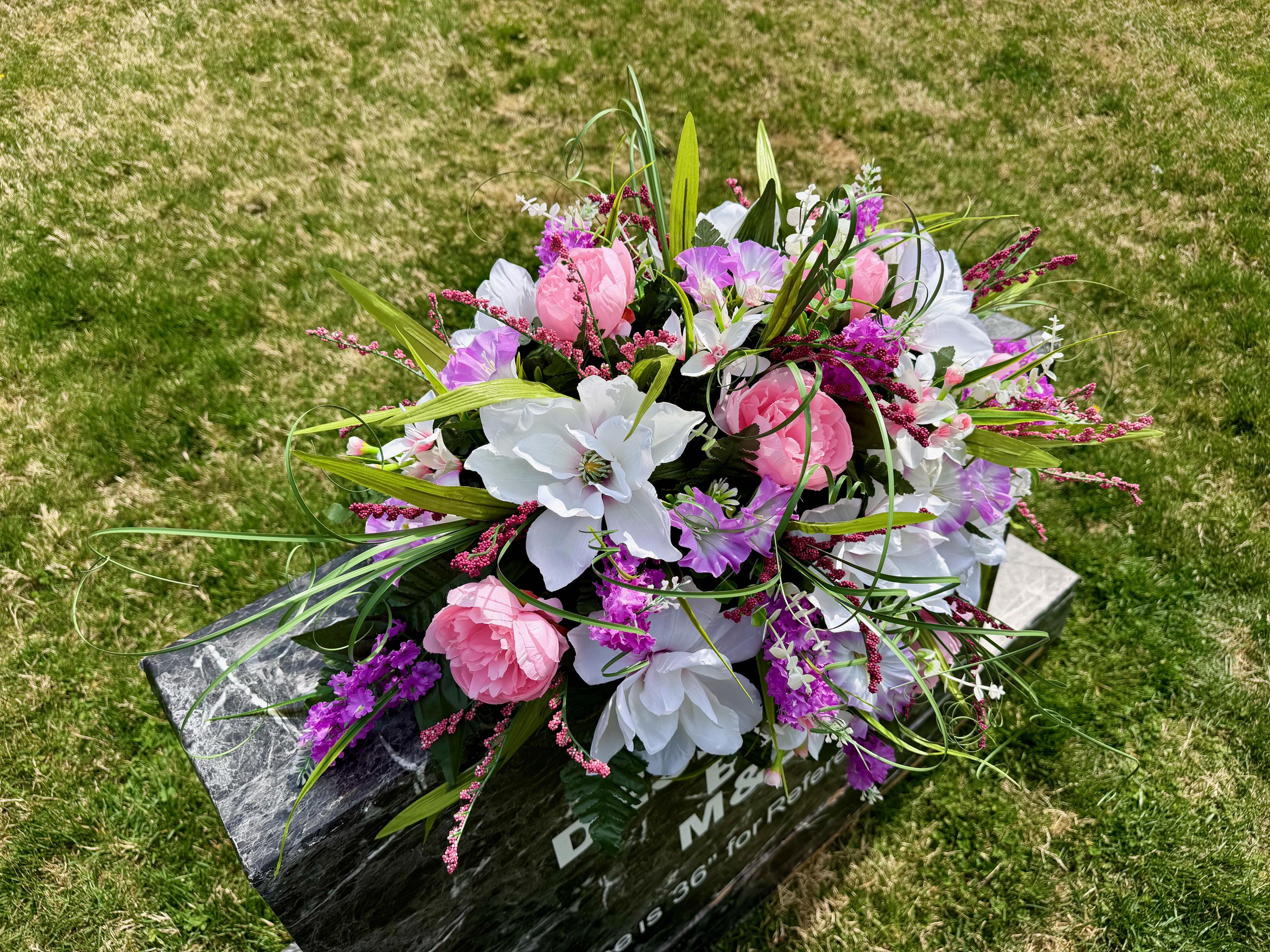 Pinks Purples Whites Cemetery Saddle Arrangement, Headstone Flowers, Memorial Day Tribute