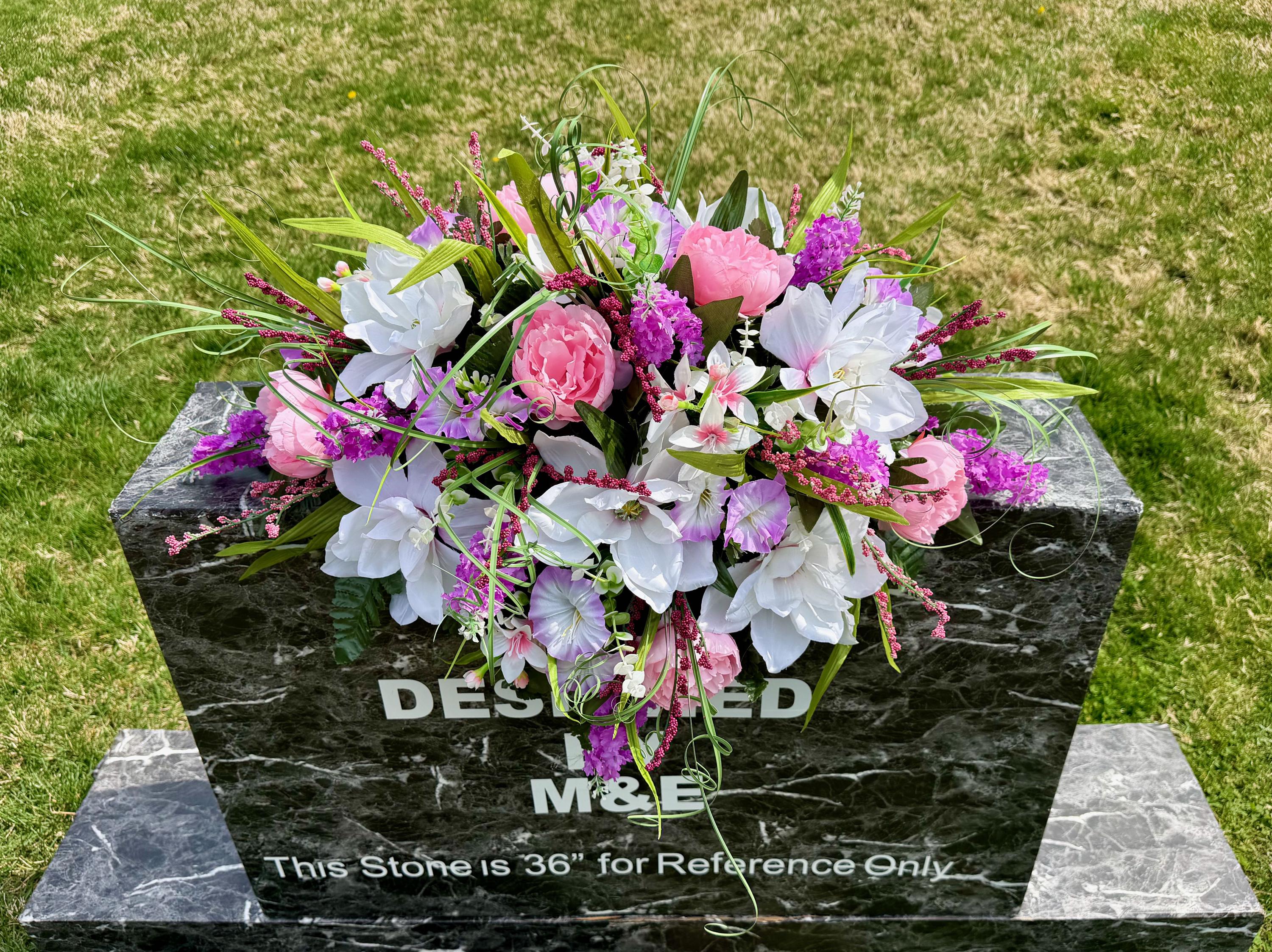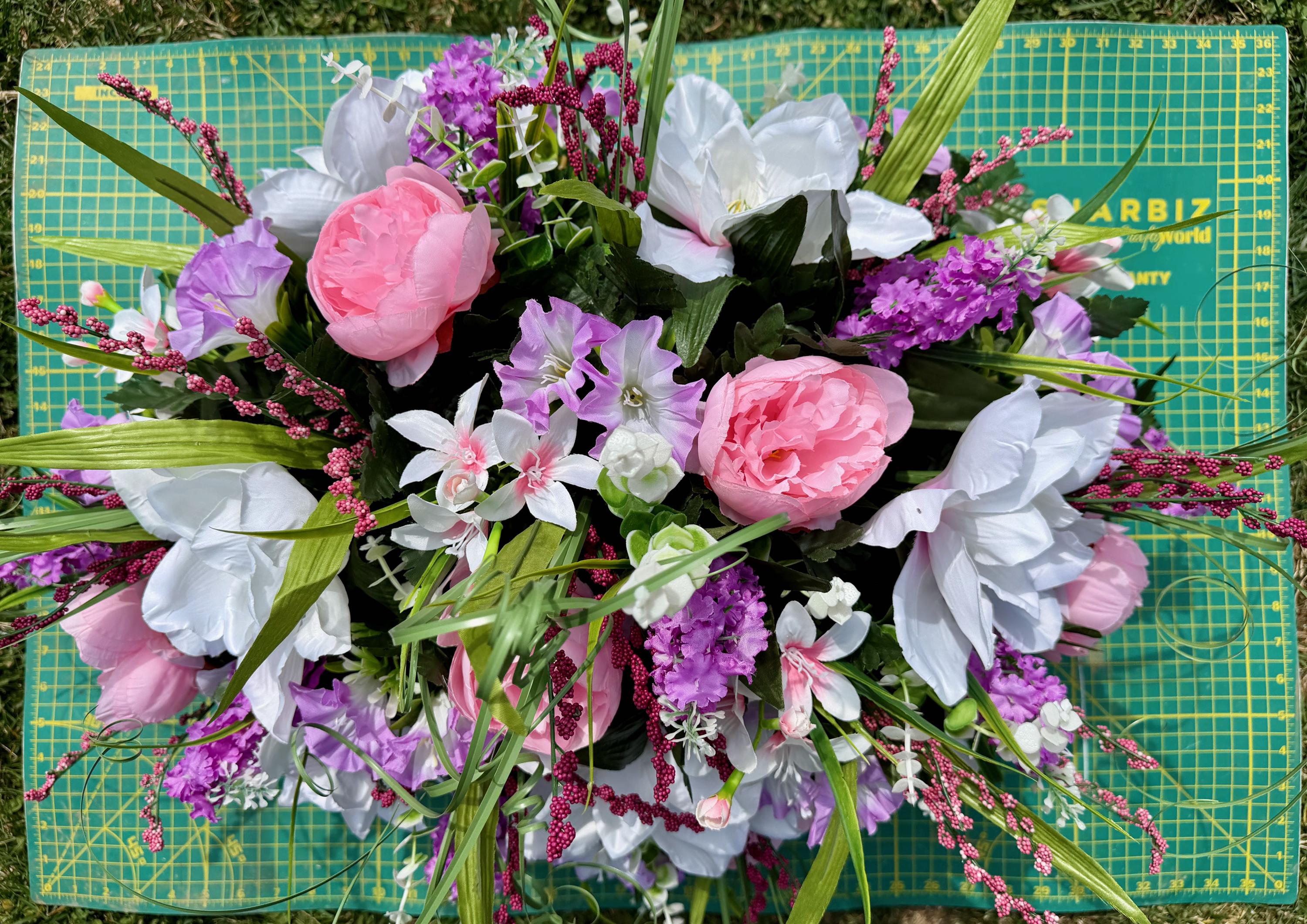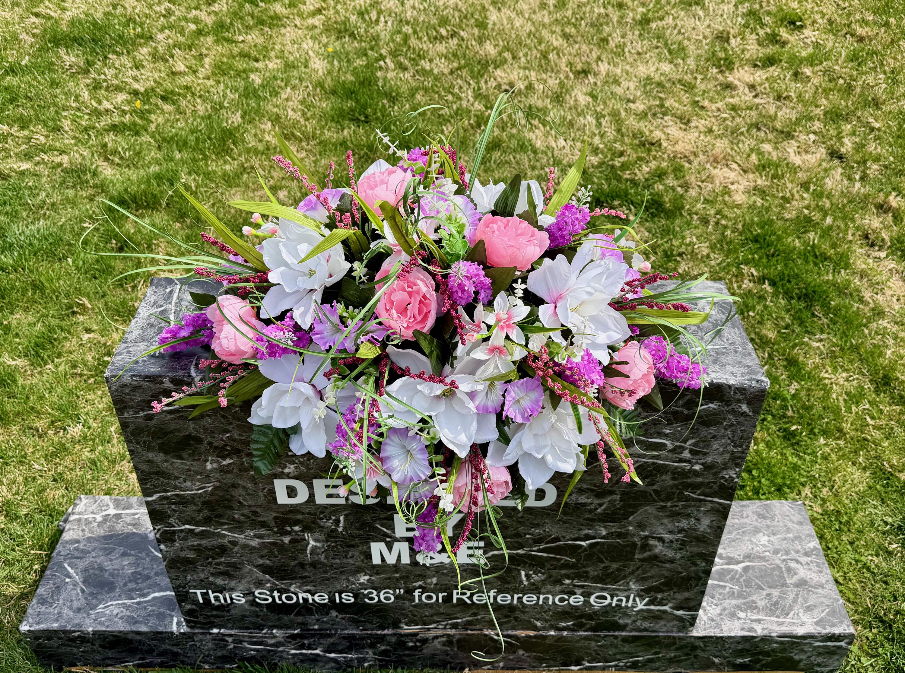 Pinks Purples Whites Cemetery Saddle Arrangement, Headstone Flowers, Memorial Day Tribute