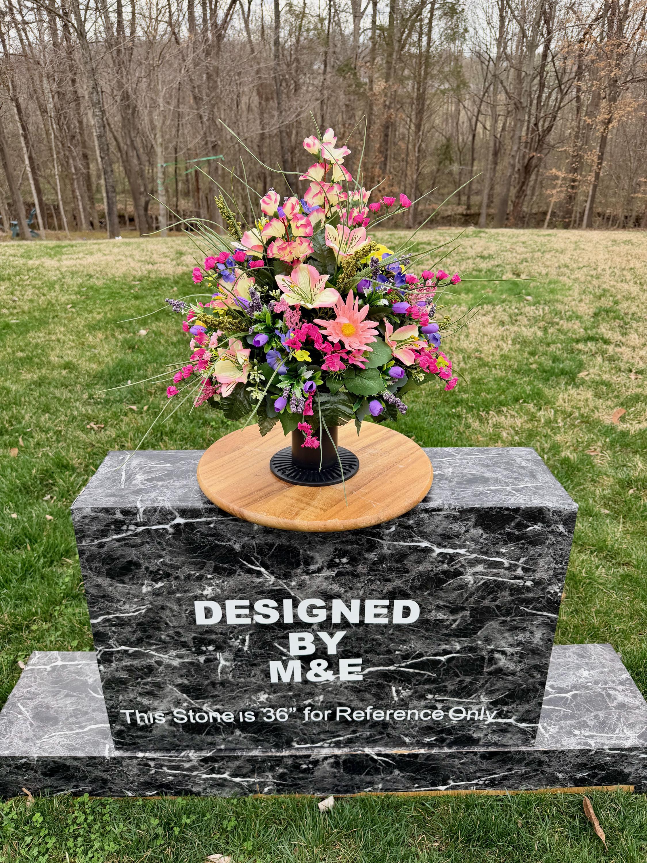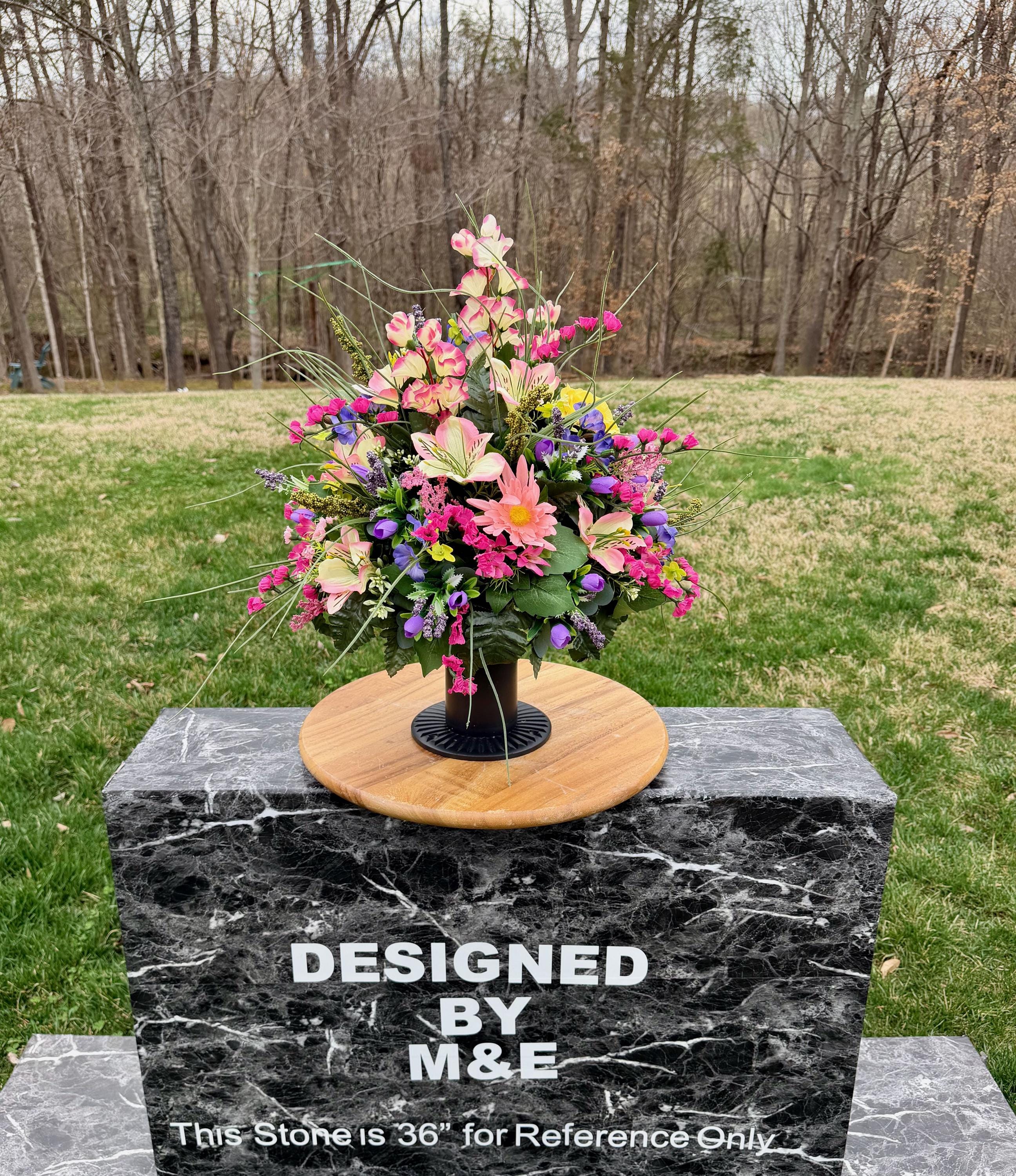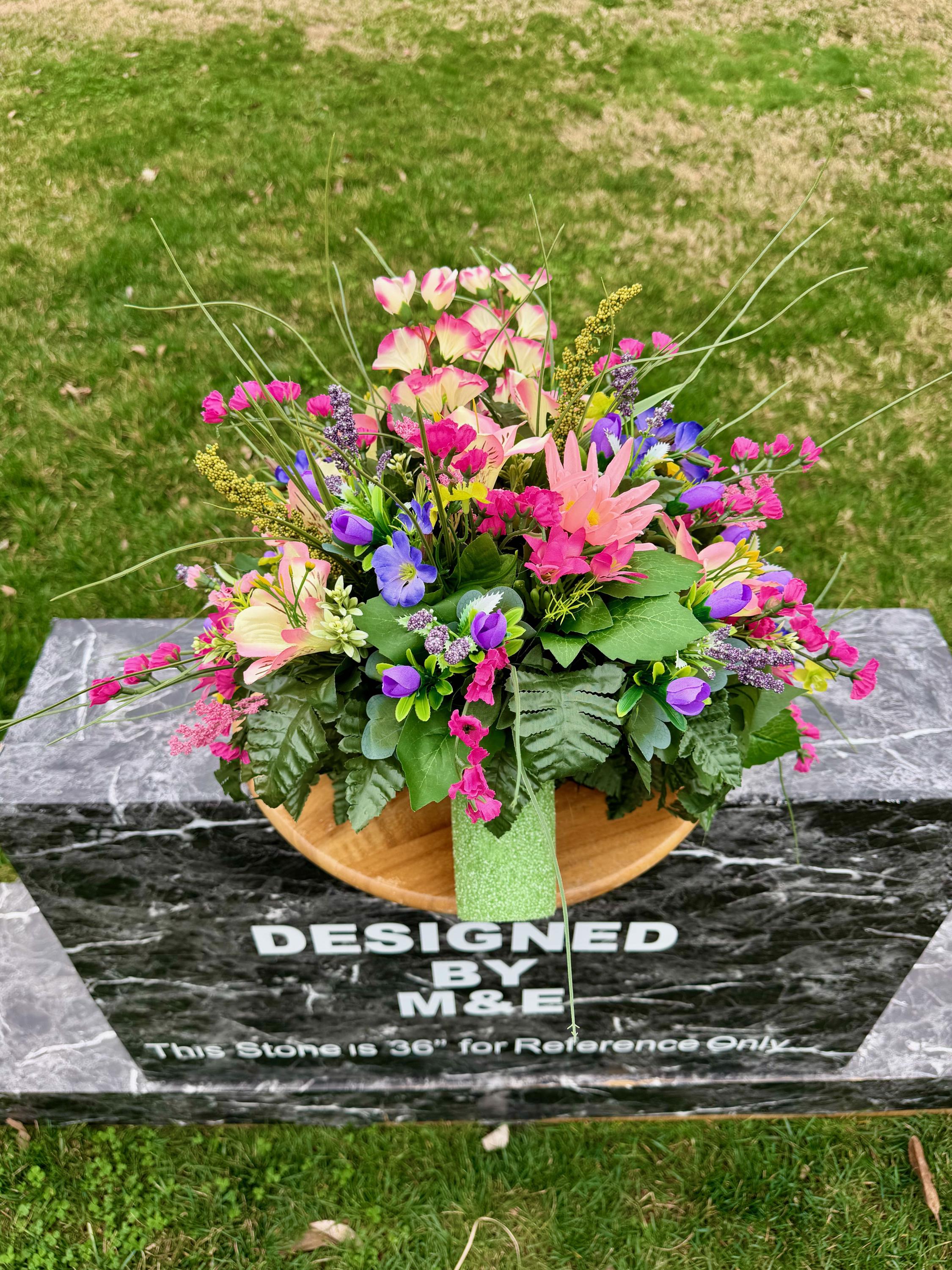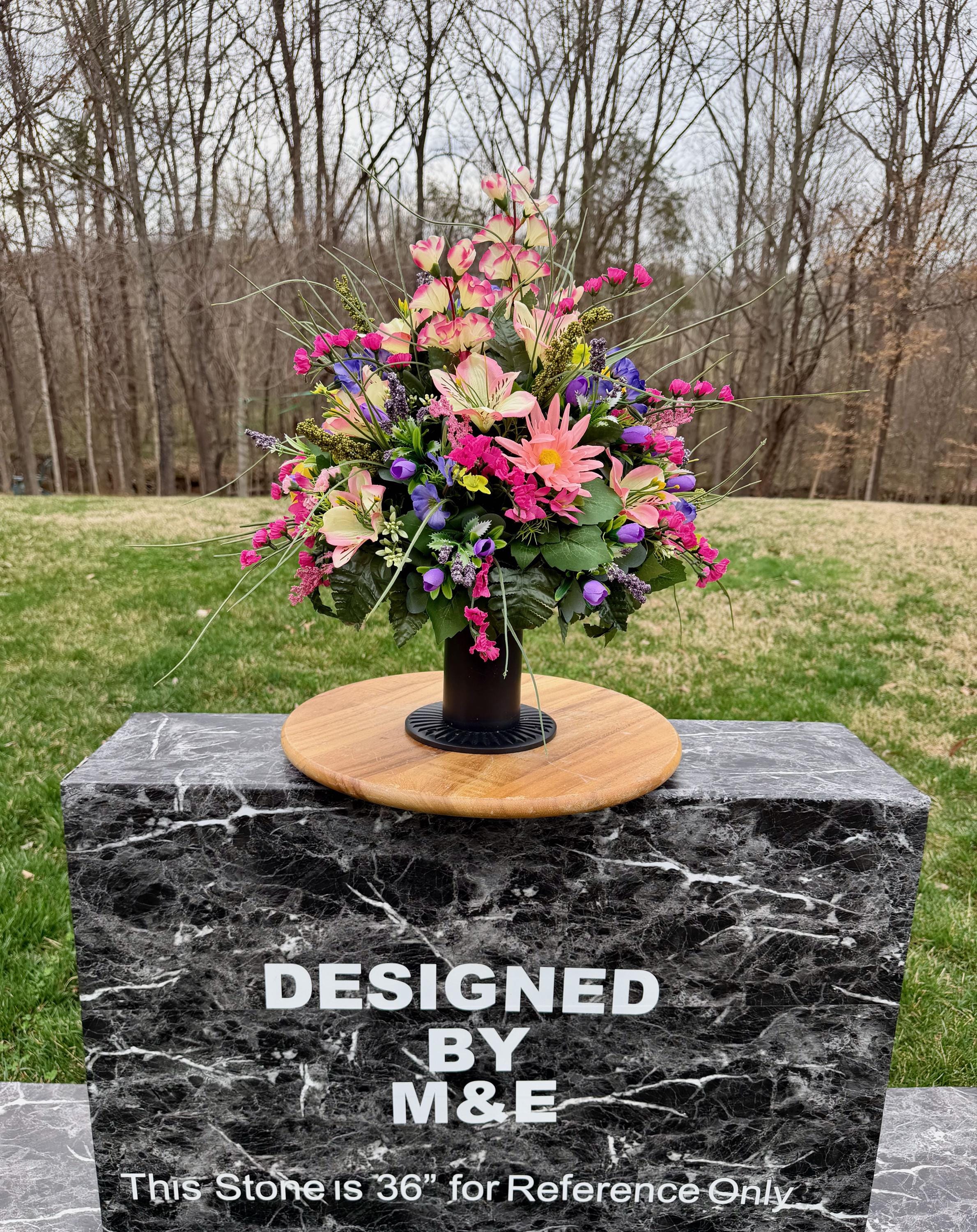 We’re a small, family-operated business consisting of myself, my husband, and my daughter. We personally manage every order and strive for excellent customer service. All our arrangements use high-quality silk flowers, though all silk blooms may fade over time. Each stem is glued into foam to withstand the elements. Designed by M&E uses only premium silks, and we put genuine care into every piece we create. Rest assured, the arrangement shown in our photos is exactly the one you’ll receive, as I design and assemble each one myself. If you’re searching for something unique or have a particular flower, color, or matching vases in mind, please contact me to discuss a custom order.