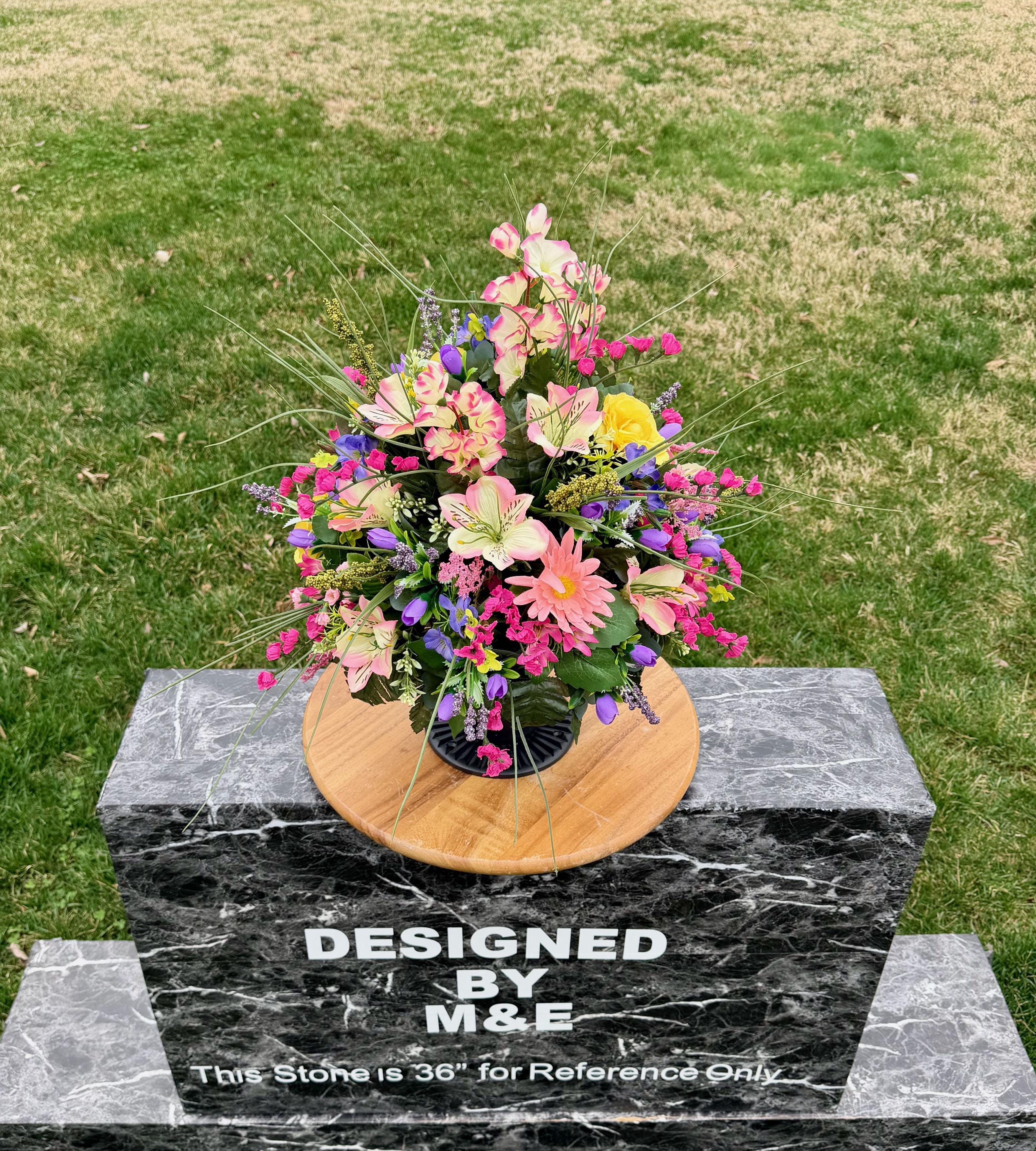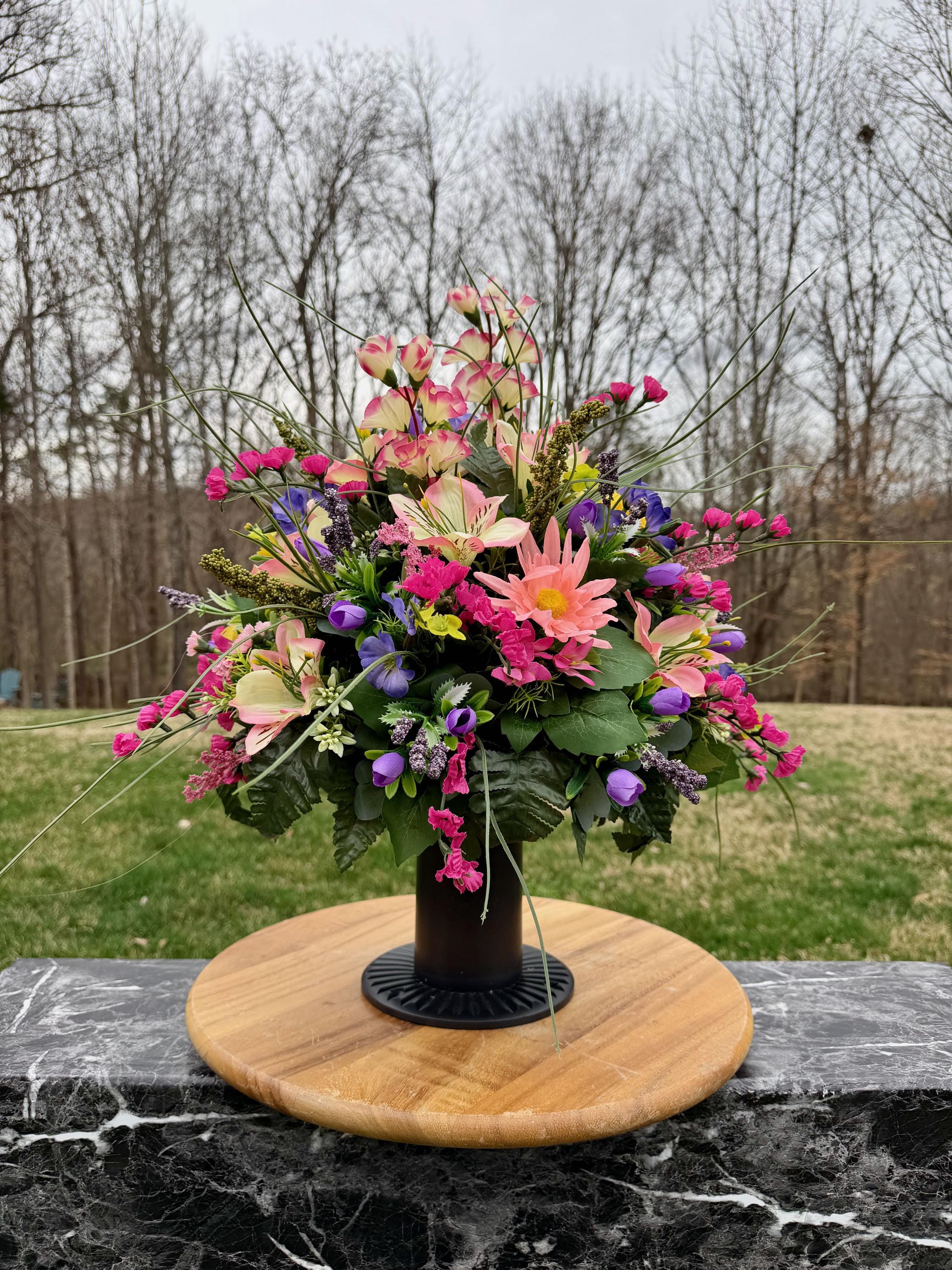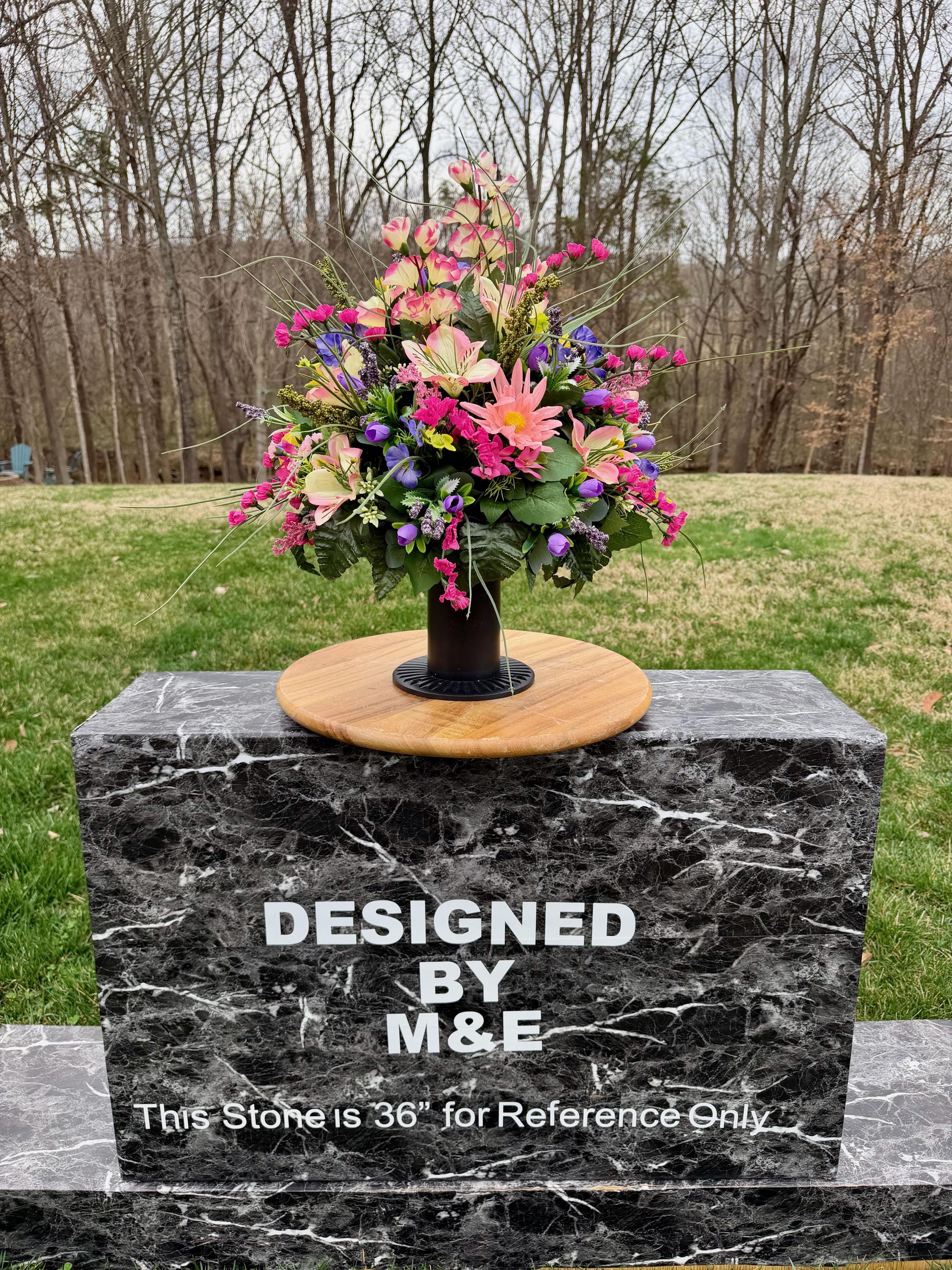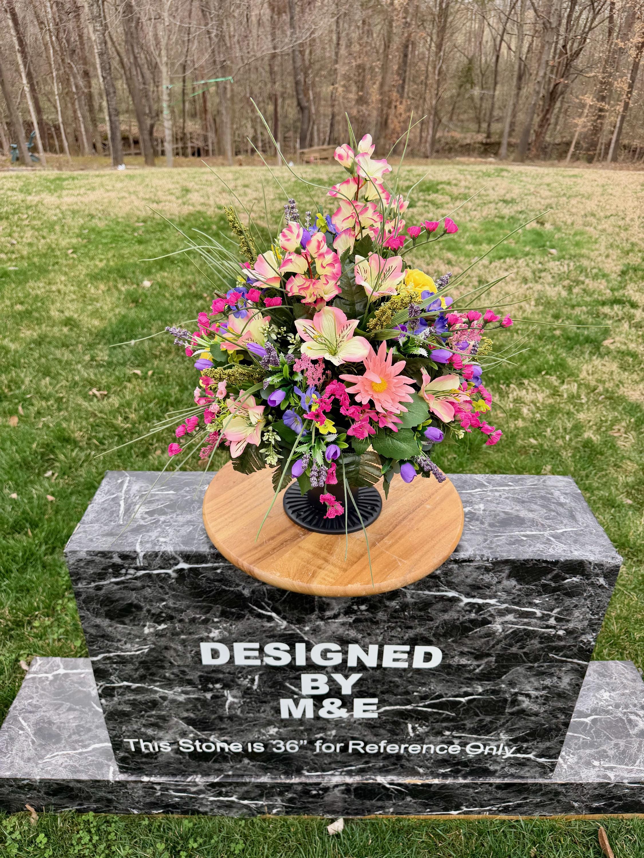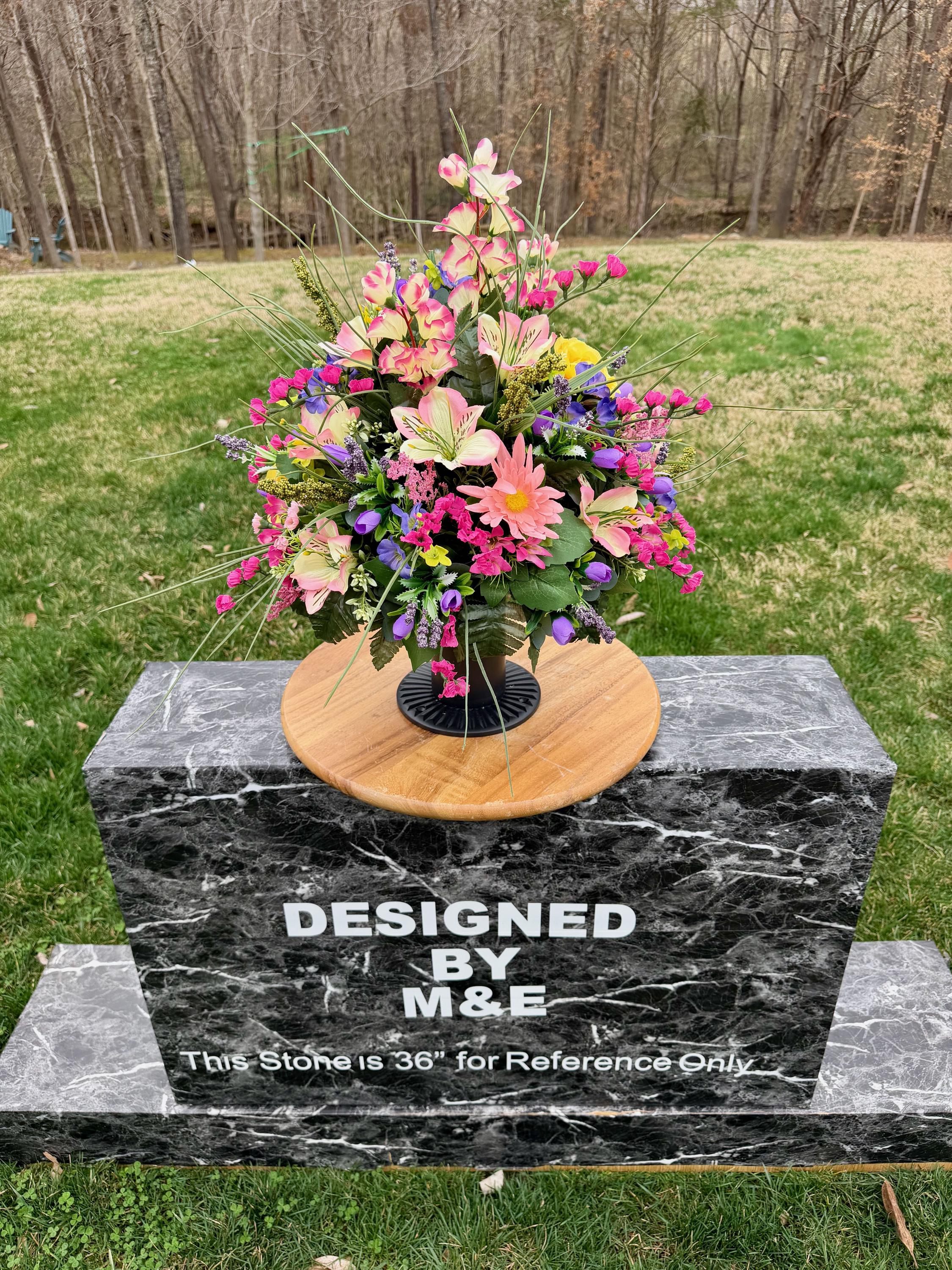 We’re a small, family-operated business consisting of myself, my husband, and my daughter. We personally manage every order and strive for excellent customer service. All our arrangements use high-quality silk flowers, though all silk blooms may fade over time. Each stem is glued into foam to withstand the elements. Designed by M&E uses only premium silks, and we put genuine care into every piece we create. Rest assured, the arrangement shown in our photos is exactly the one you’ll receive, as I design and assemble each one myself. If you’re searching for something unique or have a particular flower, color, or matching vases in mind, please contact me to discuss a custom order.