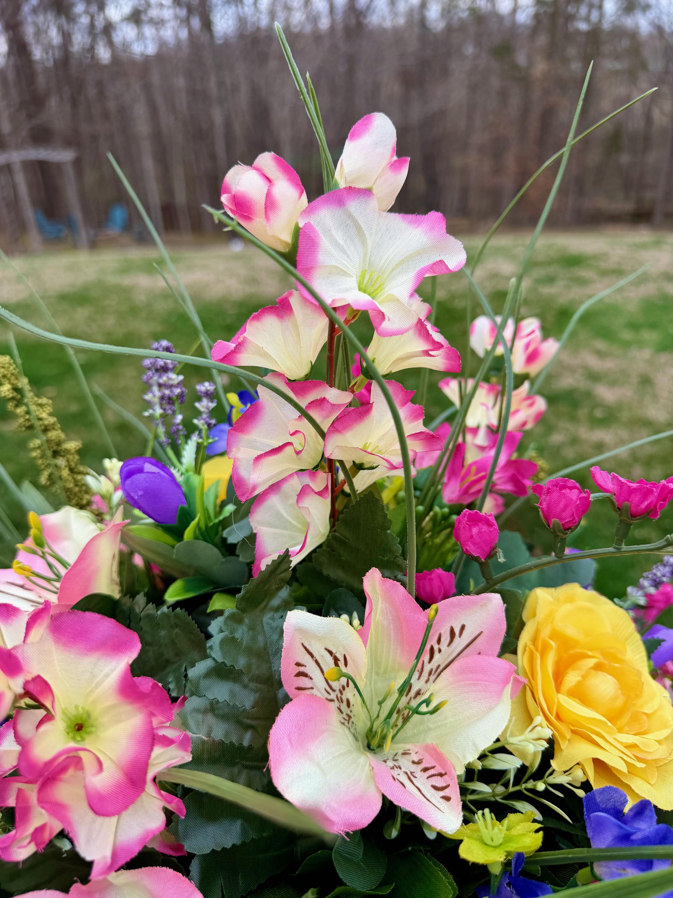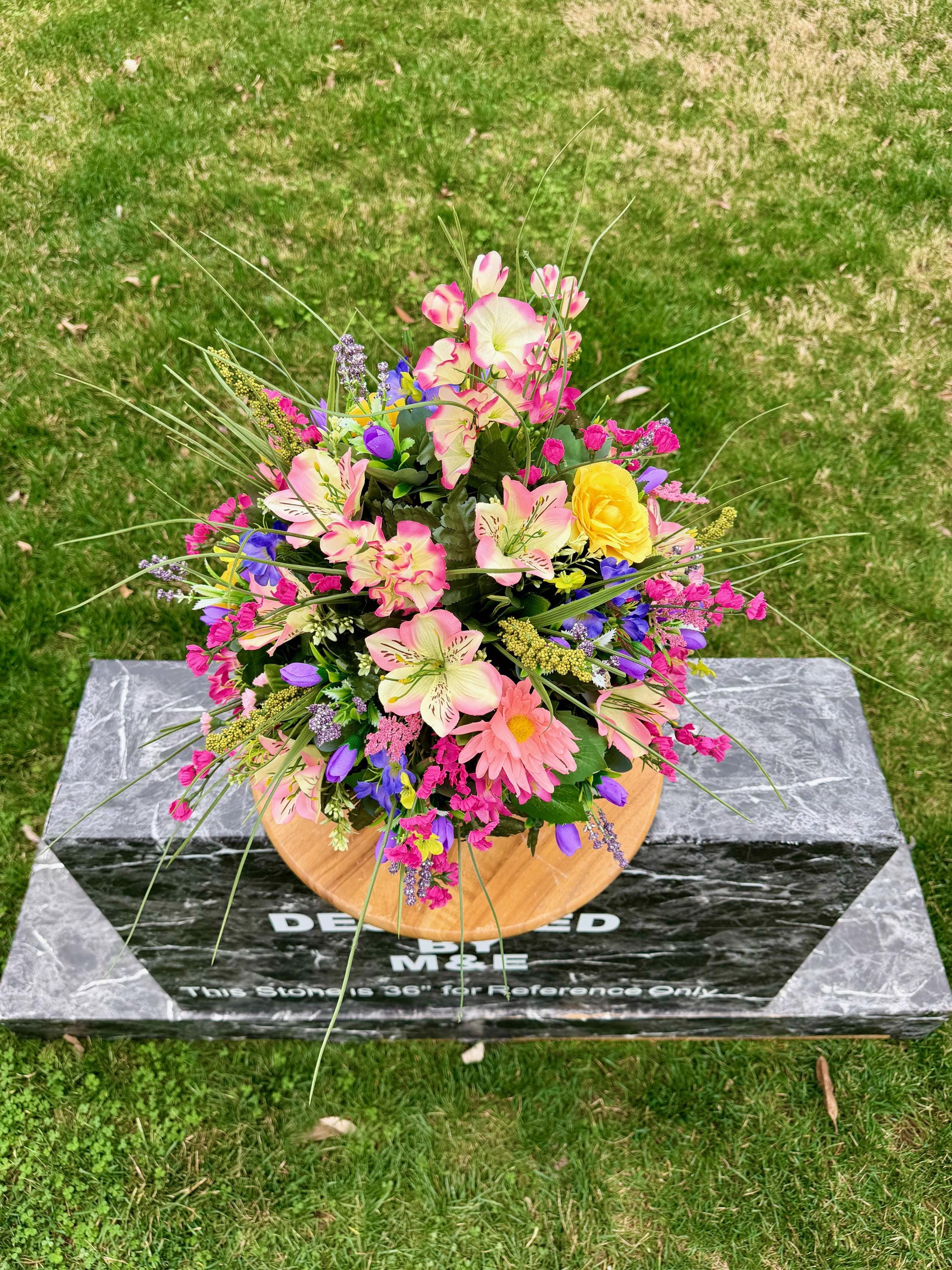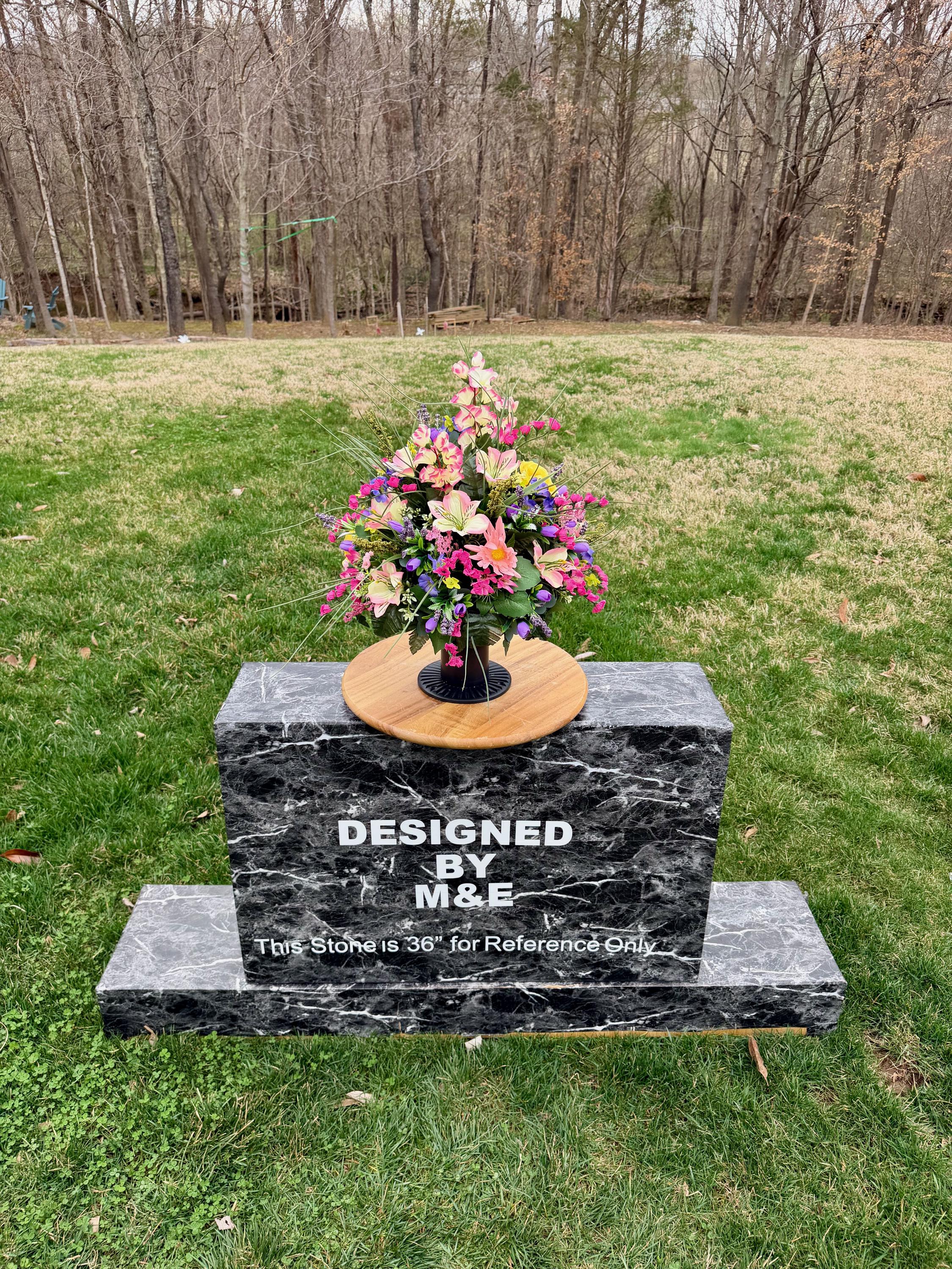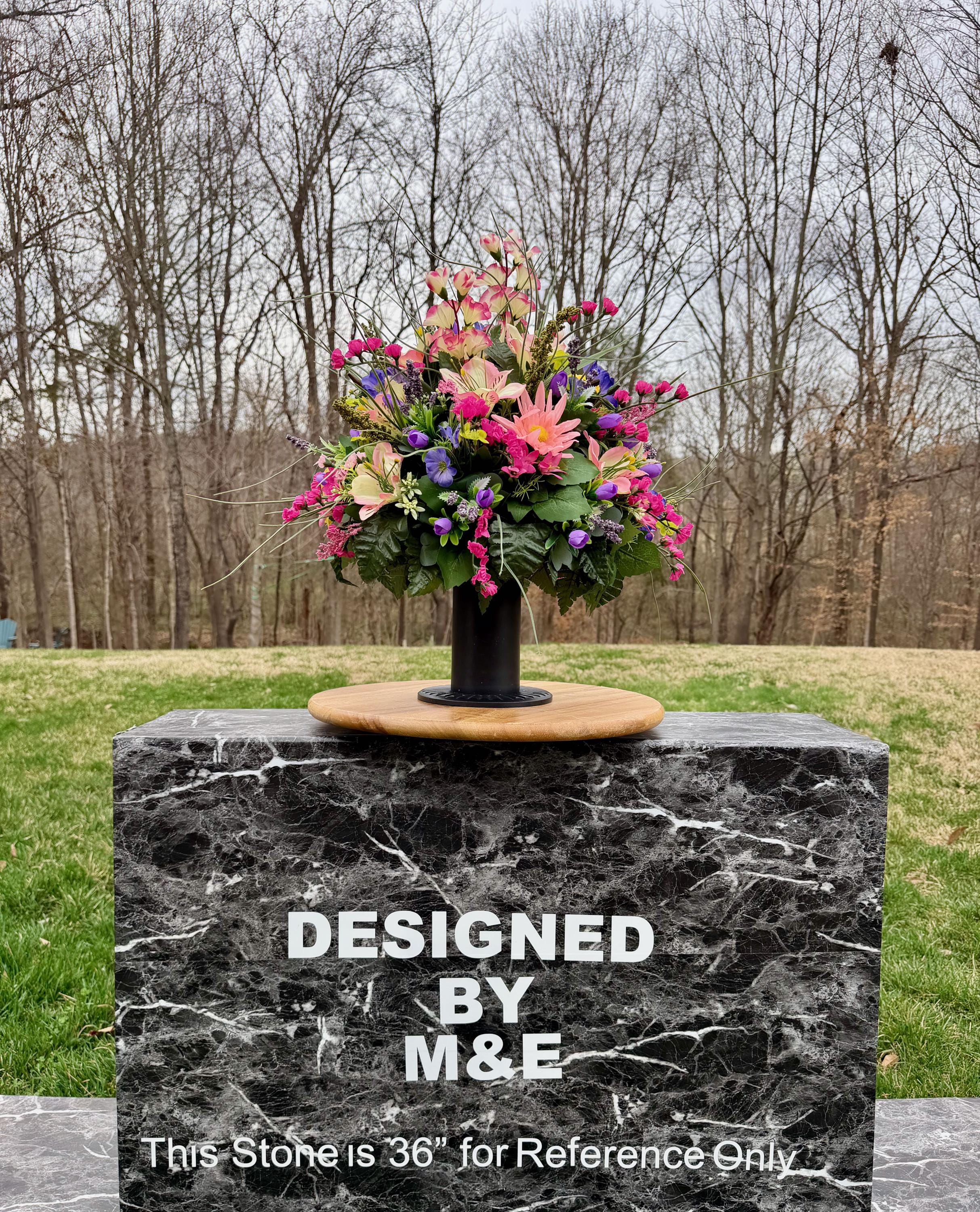 We’re a small, family-operated business consisting of myself, my husband, and my daughter. We personally manage every order and strive for excellent customer service. All our arrangements use high-quality silk flowers, though all silk blooms may fade over time. Each stem is glued into foam to withstand the elements. Designed by M&E uses only premium silks, and we put genuine care into every piece we create. Rest assured, the arrangement shown in our photos is exactly the one you’ll receive, as I design and assemble each one myself. If you’re searching for something unique or have a particular flower, color, or matching vases in mind, please contact me to discuss a custom order.