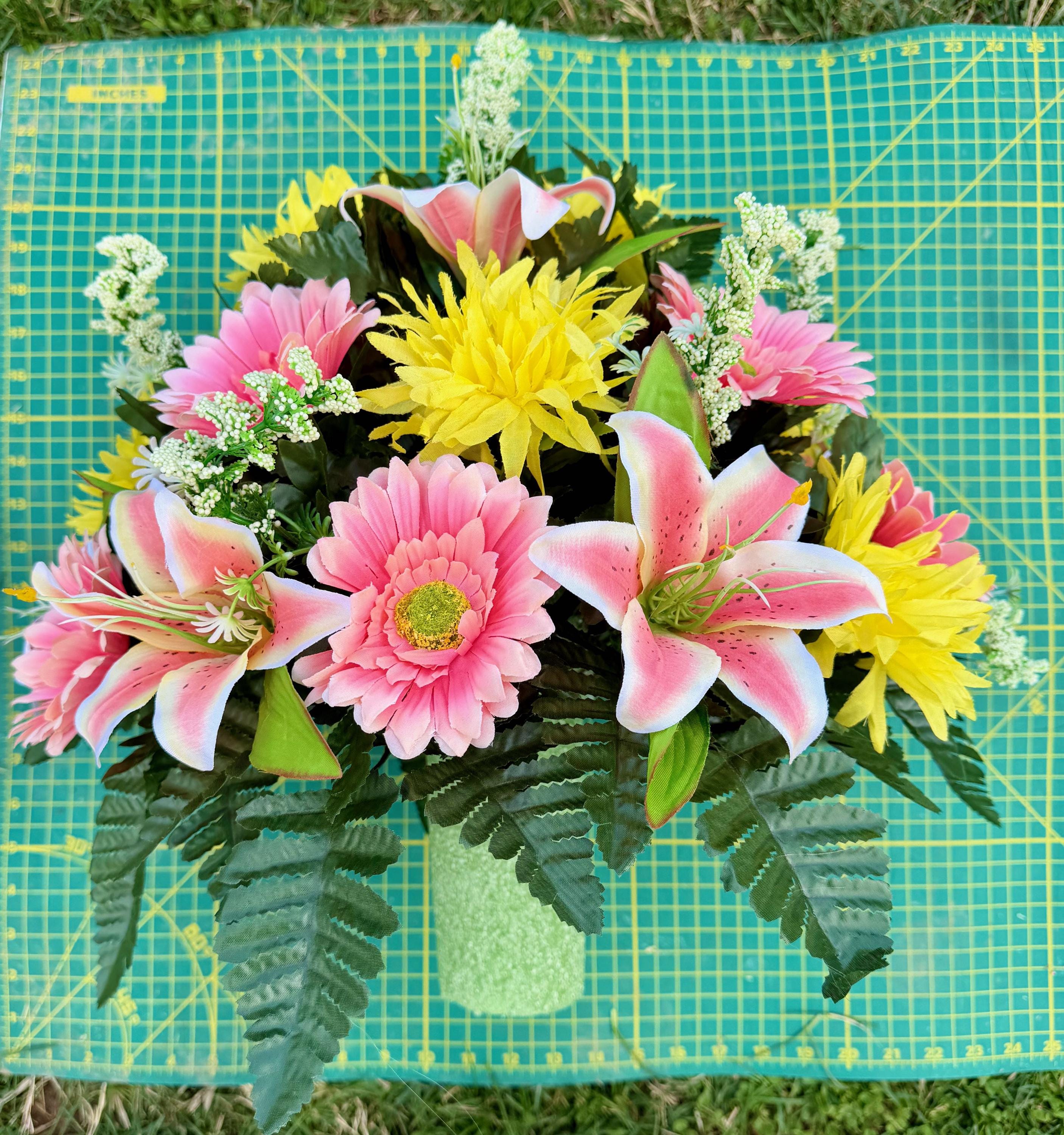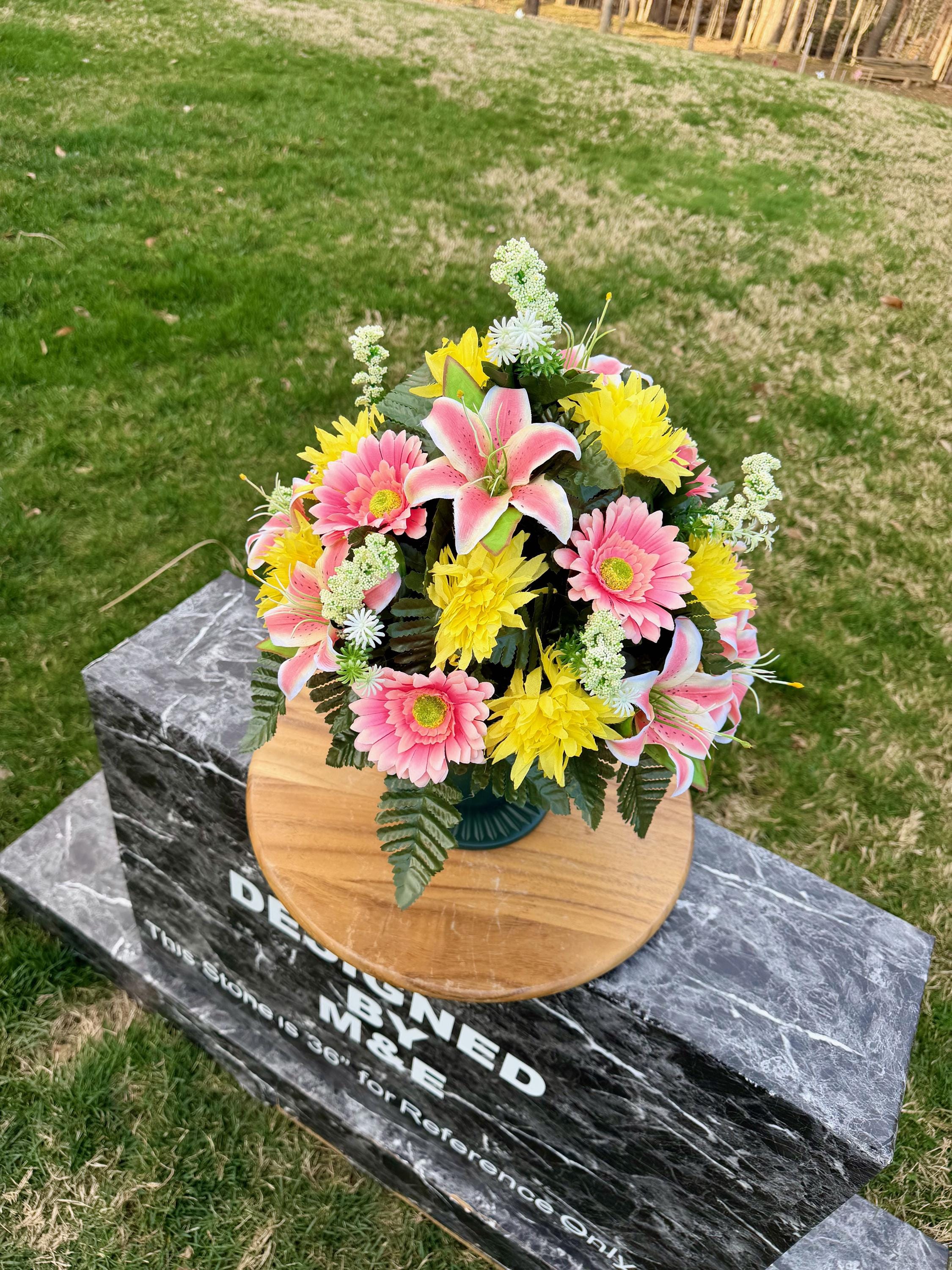 Pink, Yellow and White Cemetery Vase Arrangement, Headstone Arrangement, Memorial Decorations