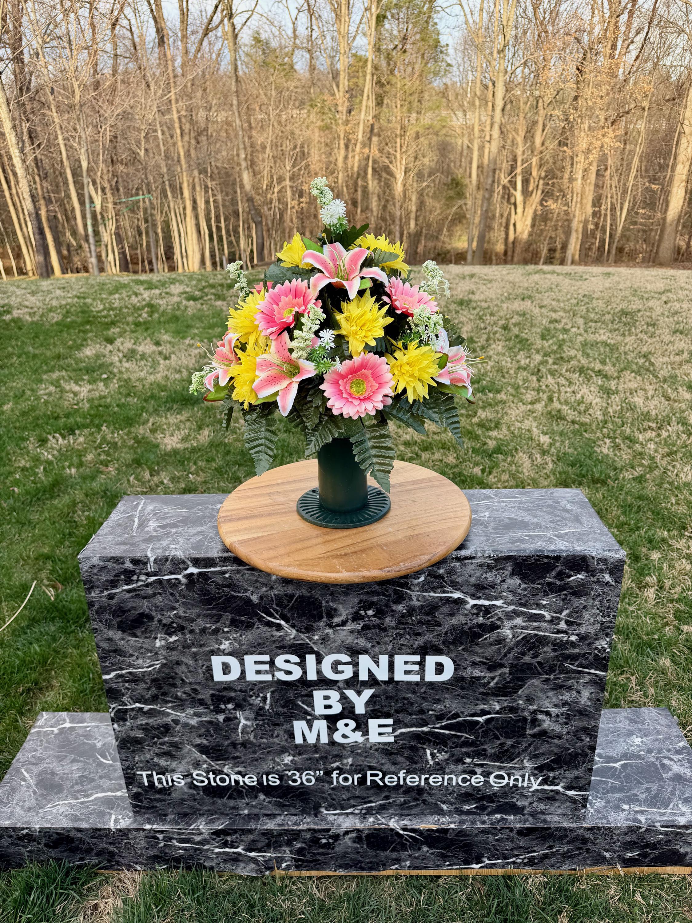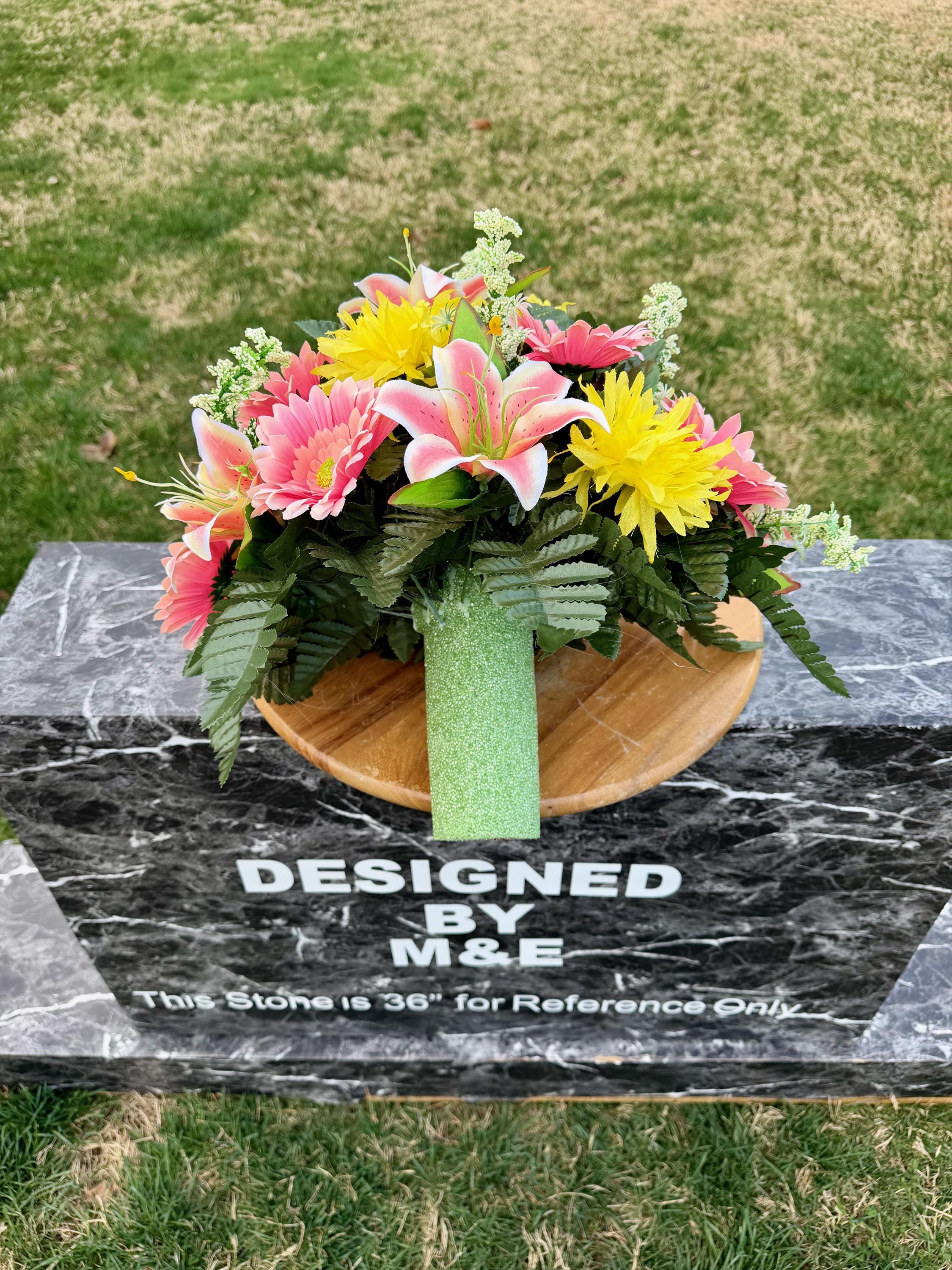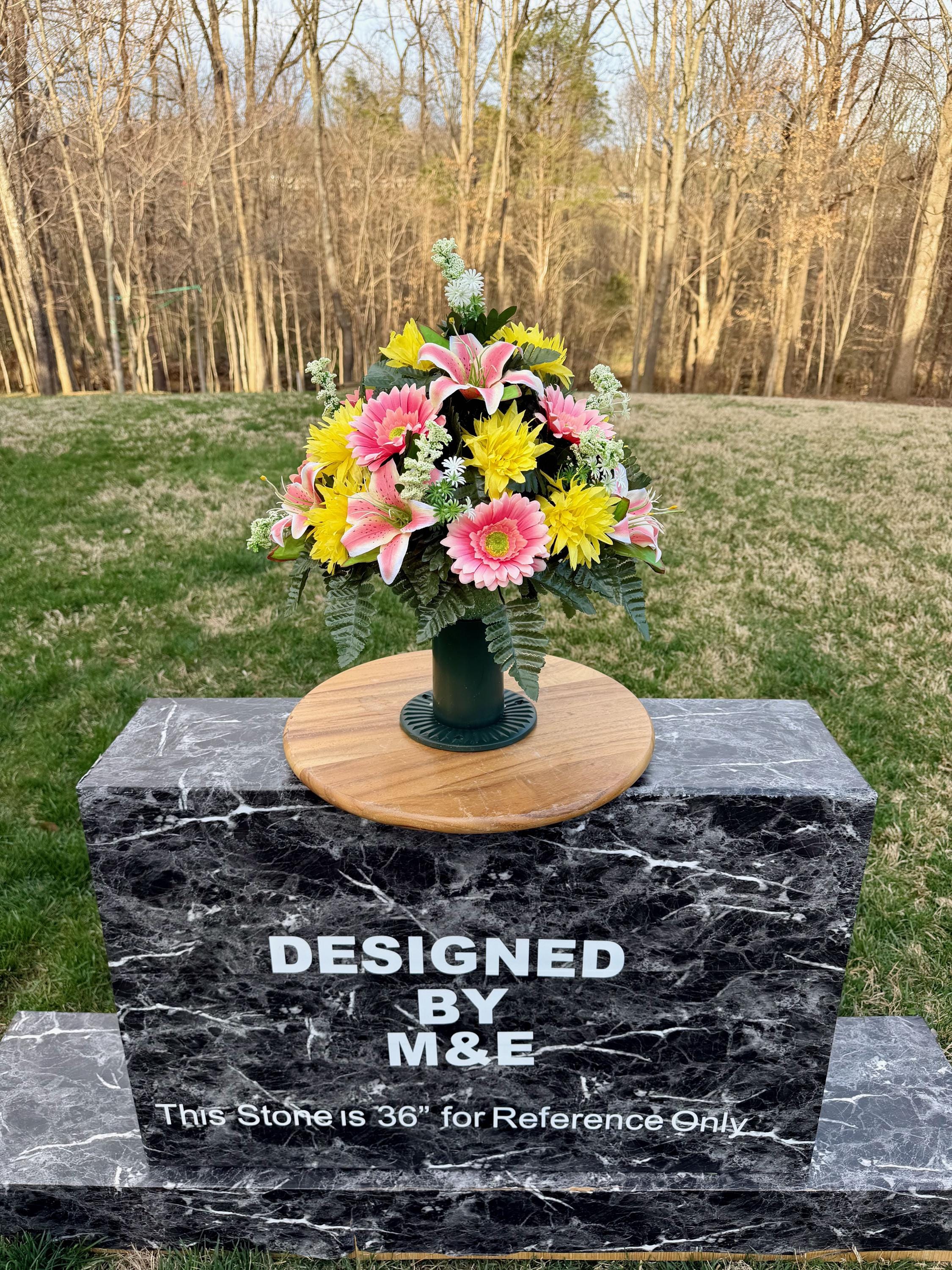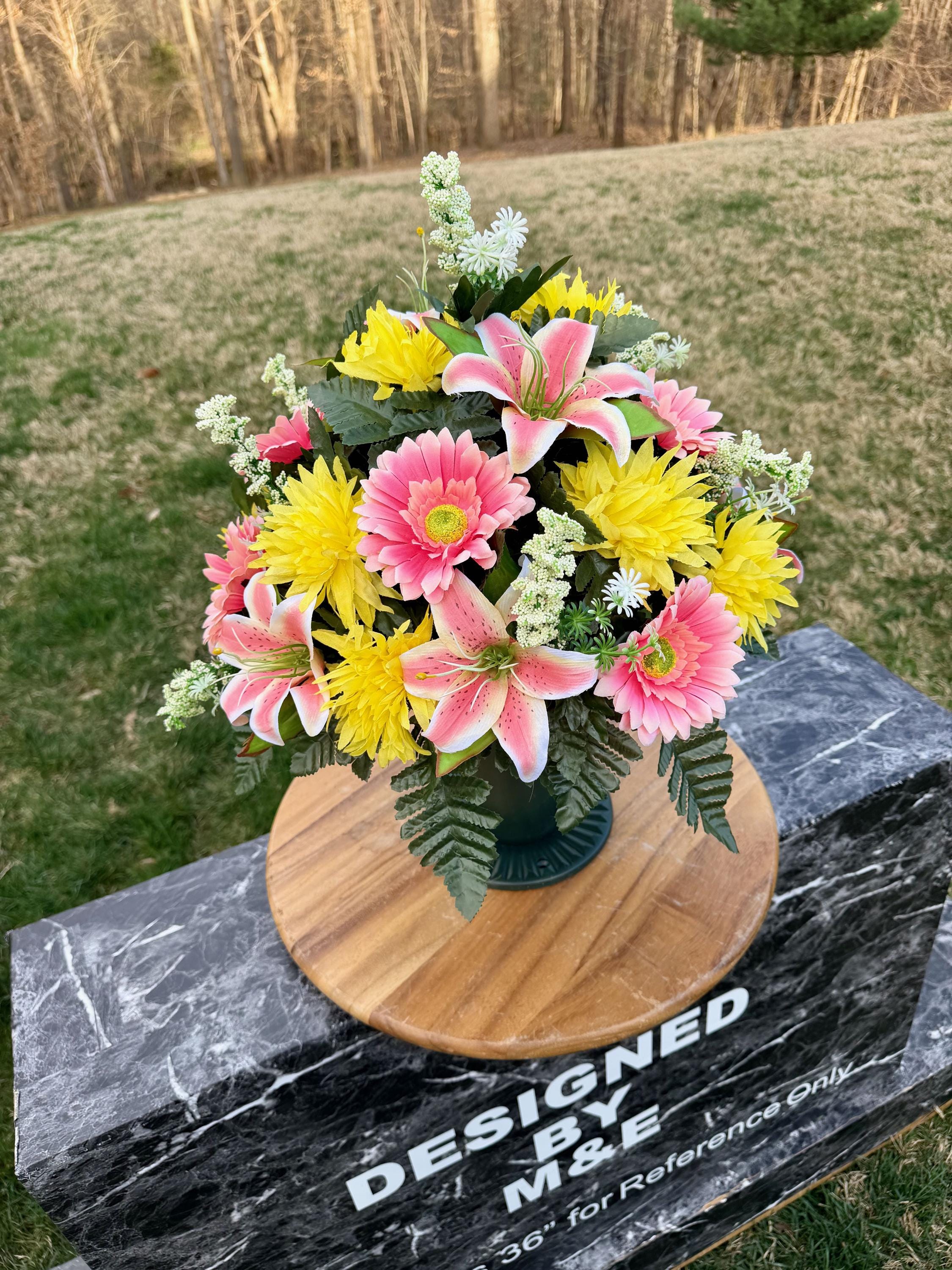 We’re a small, family-operated business consisting of myself, my husband, and my daughter. We personally manage every order and strive for excellent customer service. All our arrangements use high-quality silk flowers, though all silk blooms may fade over time. Each stem is glued into foam to withstand the elements. Designed by M&E uses only premium silks, and we put genuine care into every piece we create. Rest assured, the arrangement shown in our photos is exactly the one you’ll receive, as I design and assemble each one myself. If you’re searching for something unique or have a particular flower, color, or matching vases in mind, please contact me to discuss a custom order.