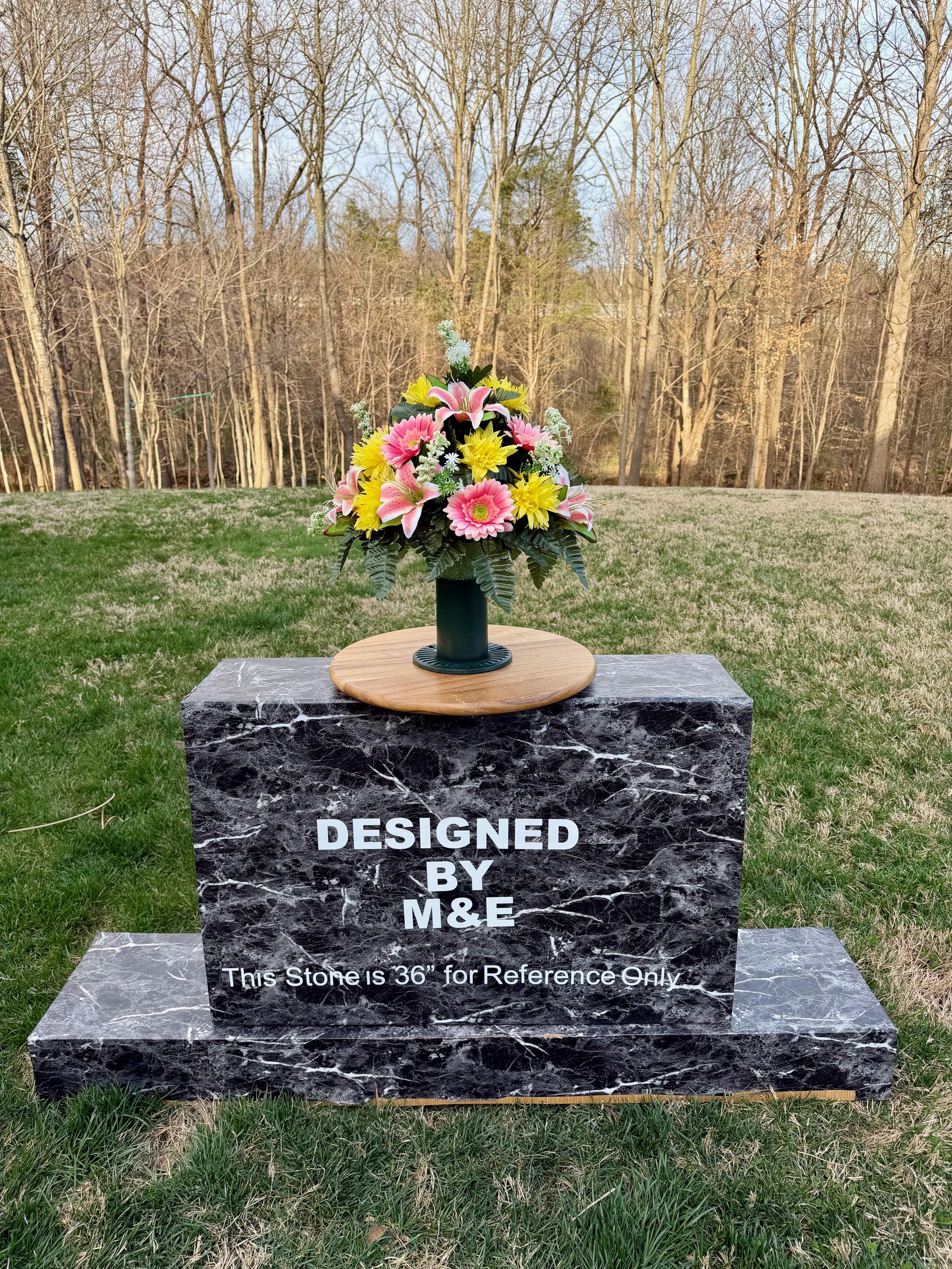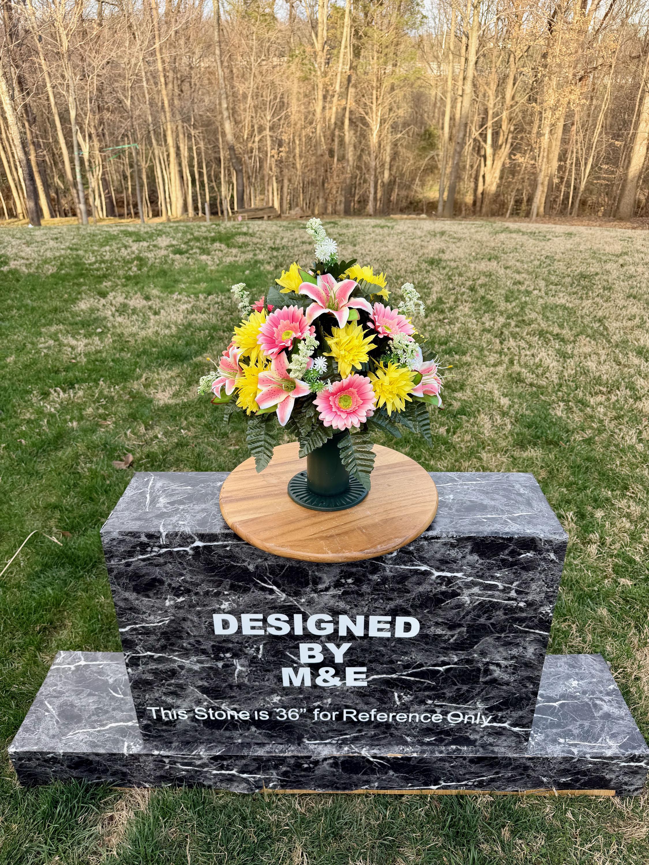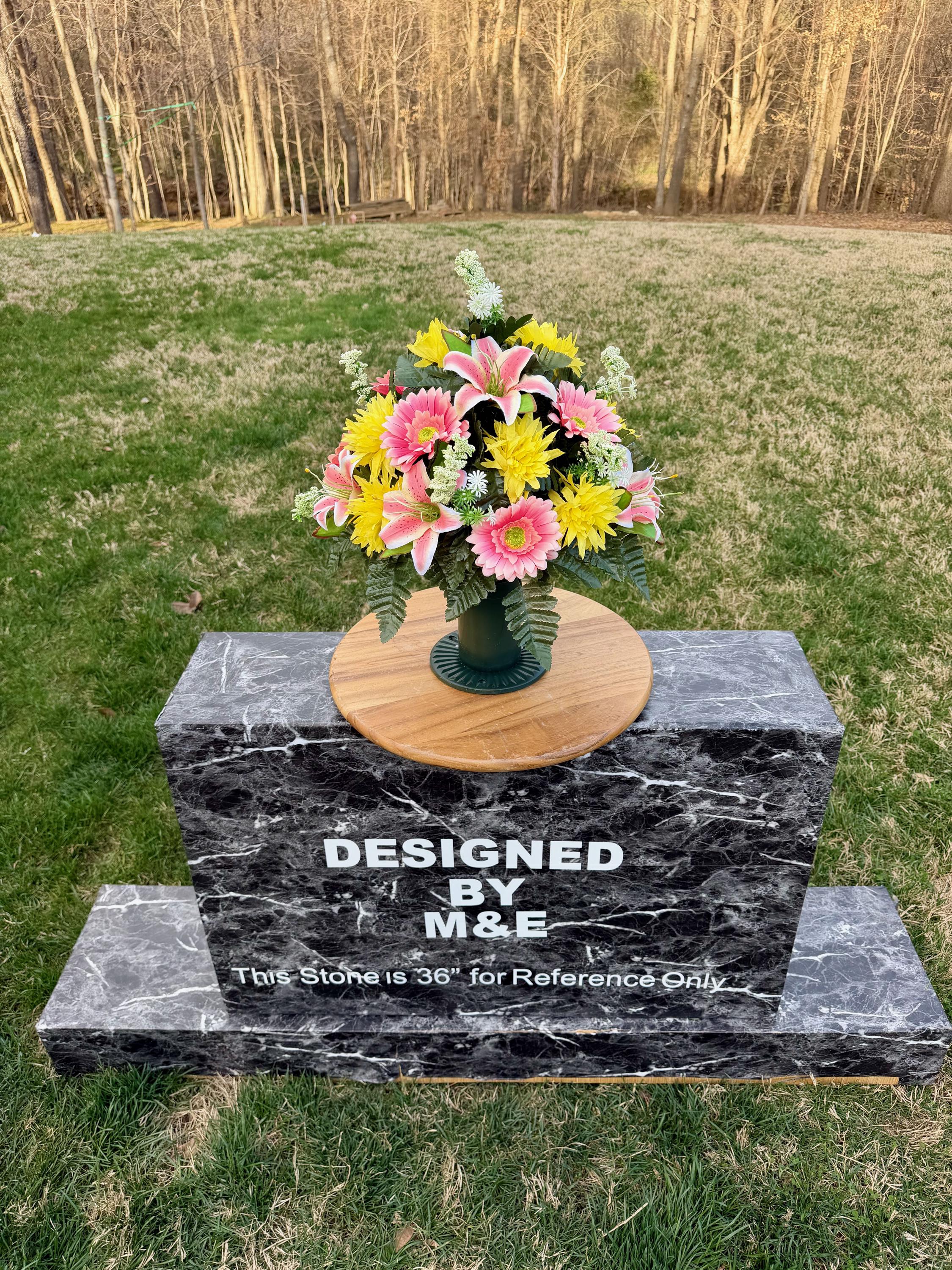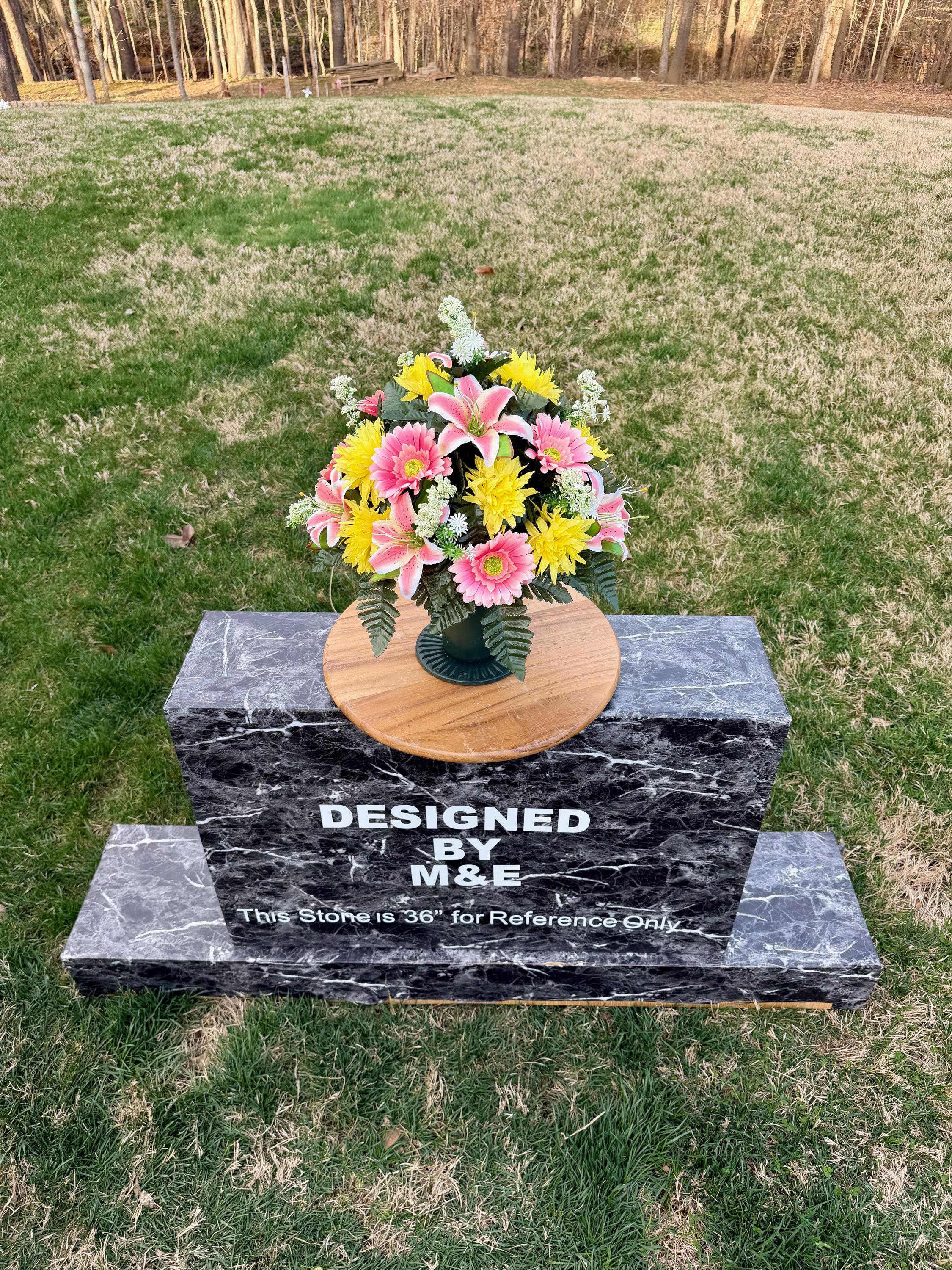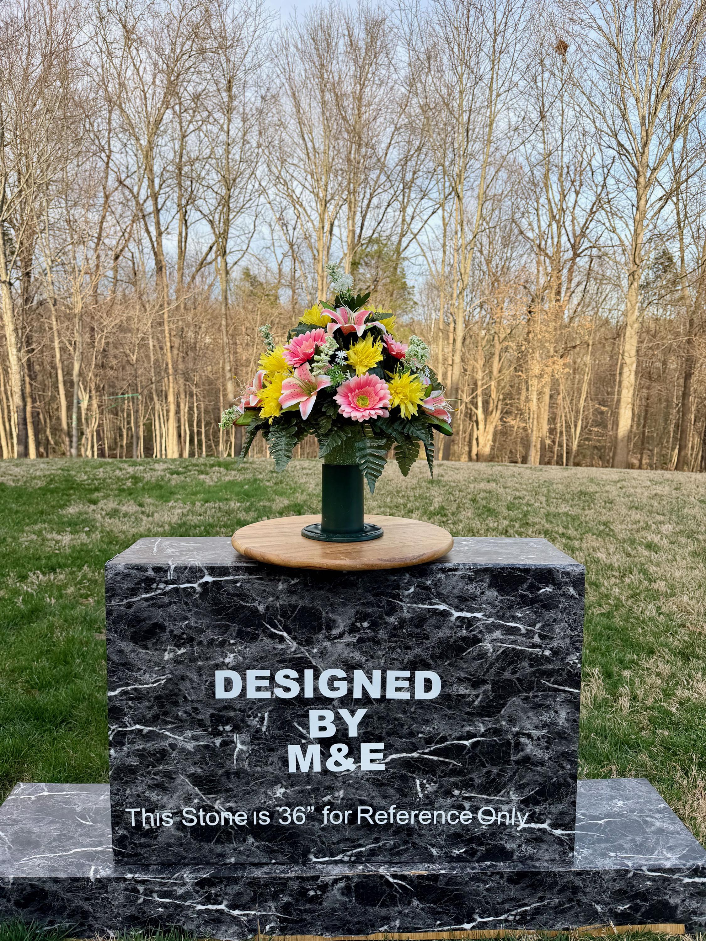 We’re a small, family-operated business consisting of myself, my husband, and my daughter. We personally manage every order and strive for excellent customer service. All our arrangements use high-quality silk flowers, though all silk blooms may fade over time. Each stem is glued into foam to withstand the elements. Designed by M&E uses only premium silks, and we put genuine care into every piece we create. Rest assured, the arrangement shown in our photos is exactly the one you’ll receive, as I design and assemble each one myself. If you’re searching for something unique or have a particular flower, color, or matching vases in mind, please contact me to discuss a custom order.