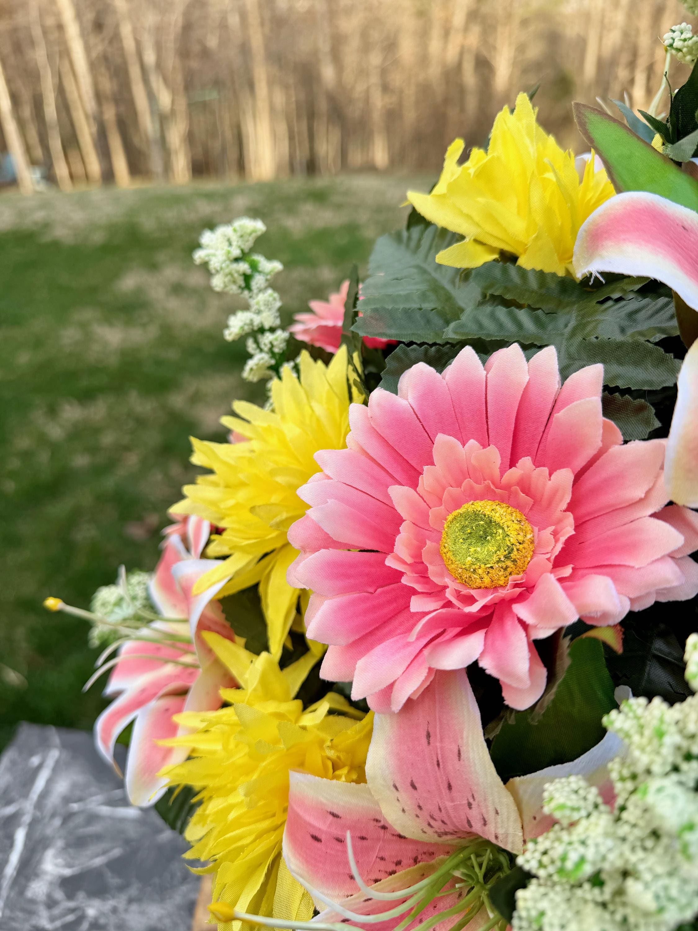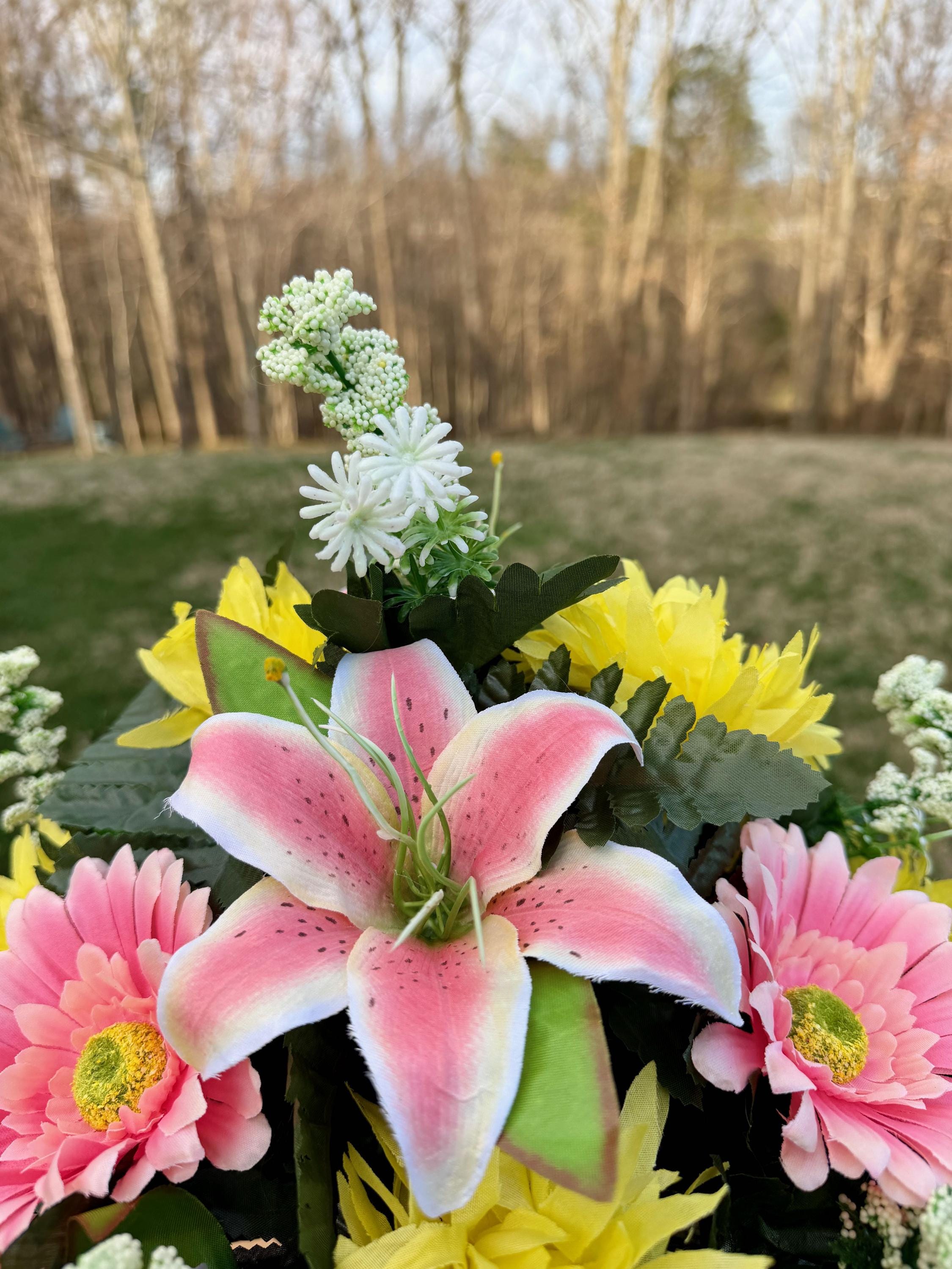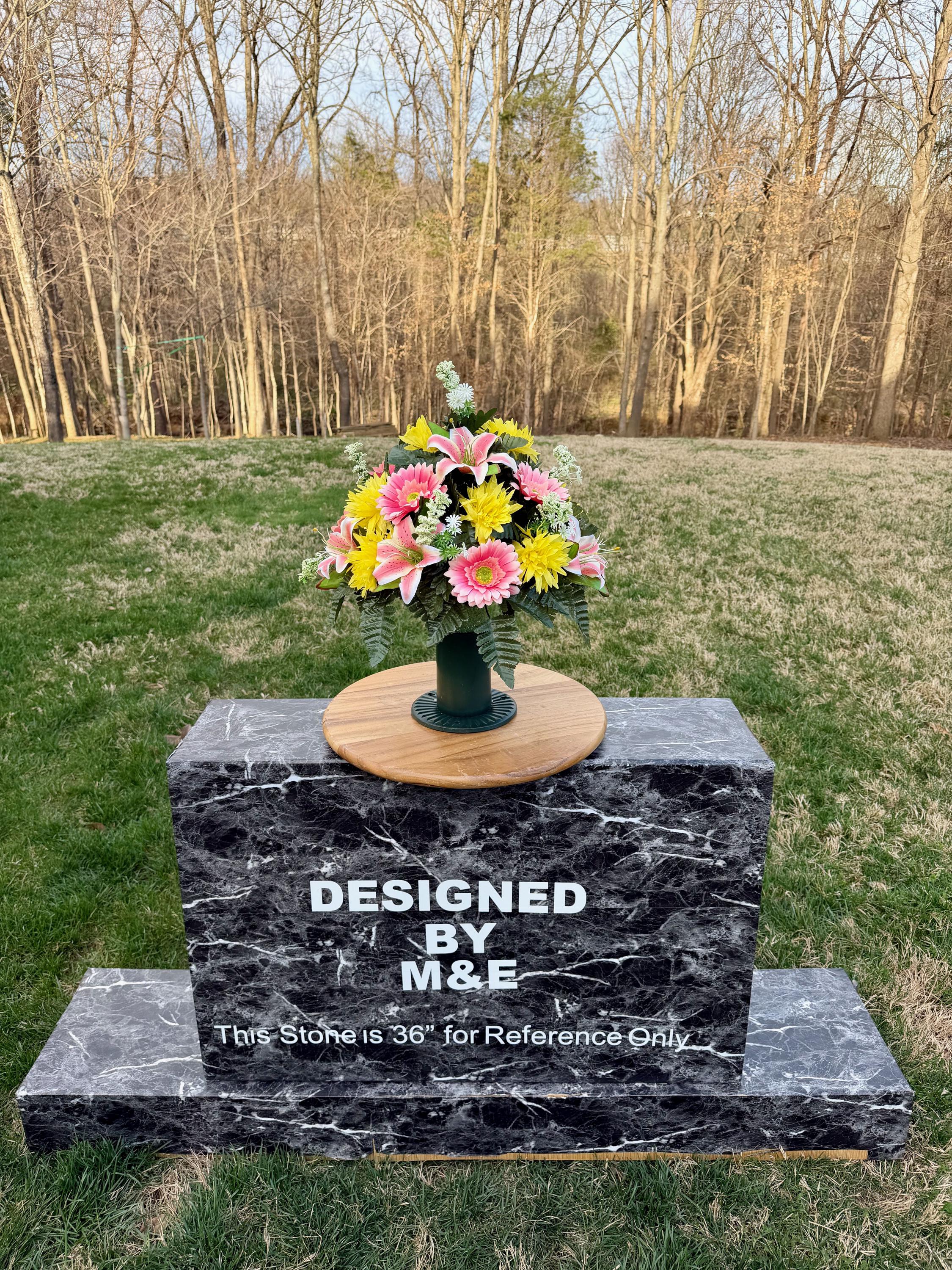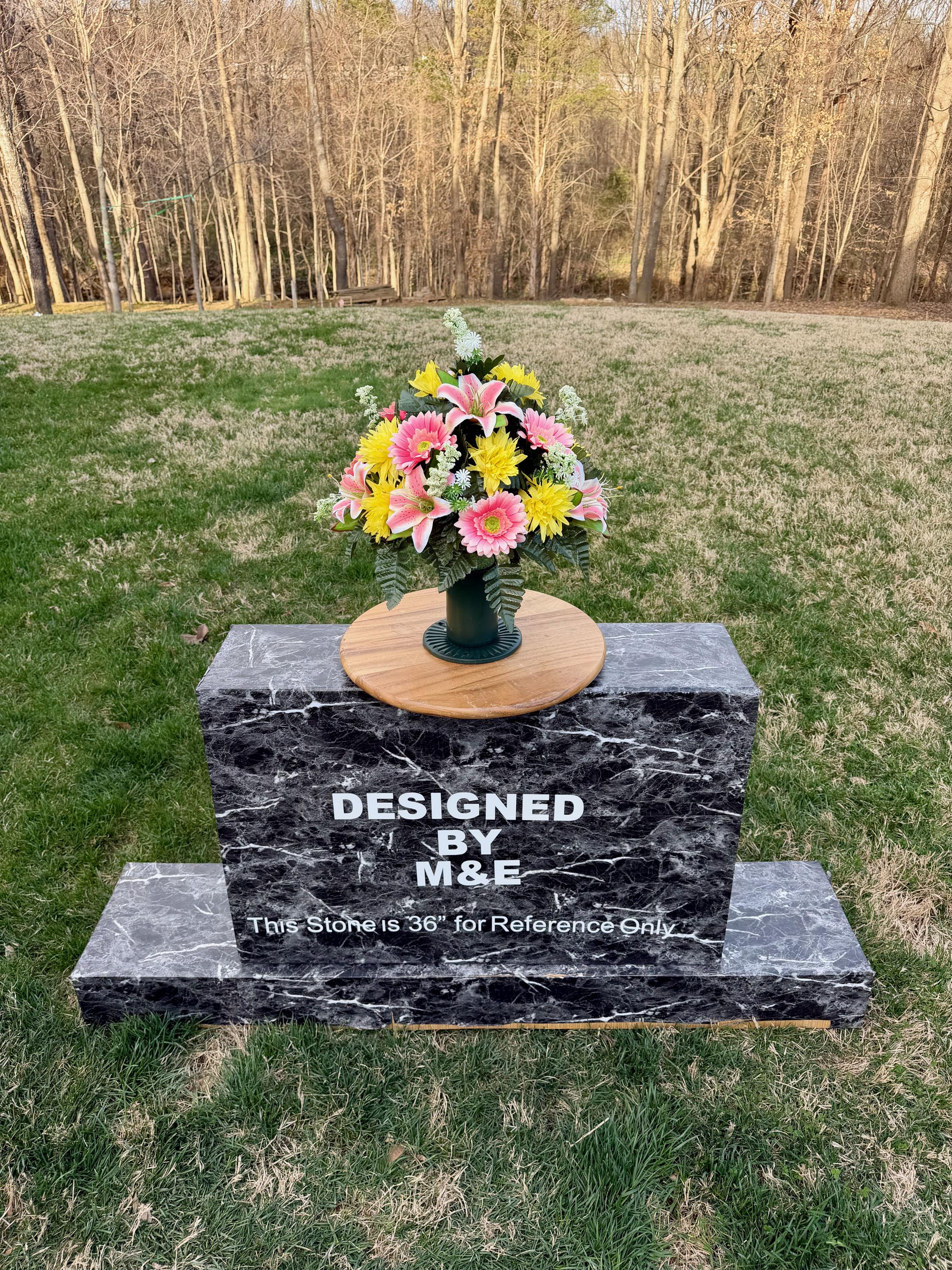 We’re a small, family-operated business consisting of myself, my husband, and my daughter. We personally manage every order and strive for excellent customer service. All our arrangements use high-quality silk flowers, though all silk blooms may fade over time. Each stem is glued into foam to withstand the elements. Designed by M&E uses only premium silks, and we put genuine care into every piece we create. Rest assured, the arrangement shown in our photos is exactly the one you’ll receive, as I design and assemble each one myself. If you’re searching for something unique or have a particular flower, color, or matching vases in mind, please contact me to discuss a custom order.