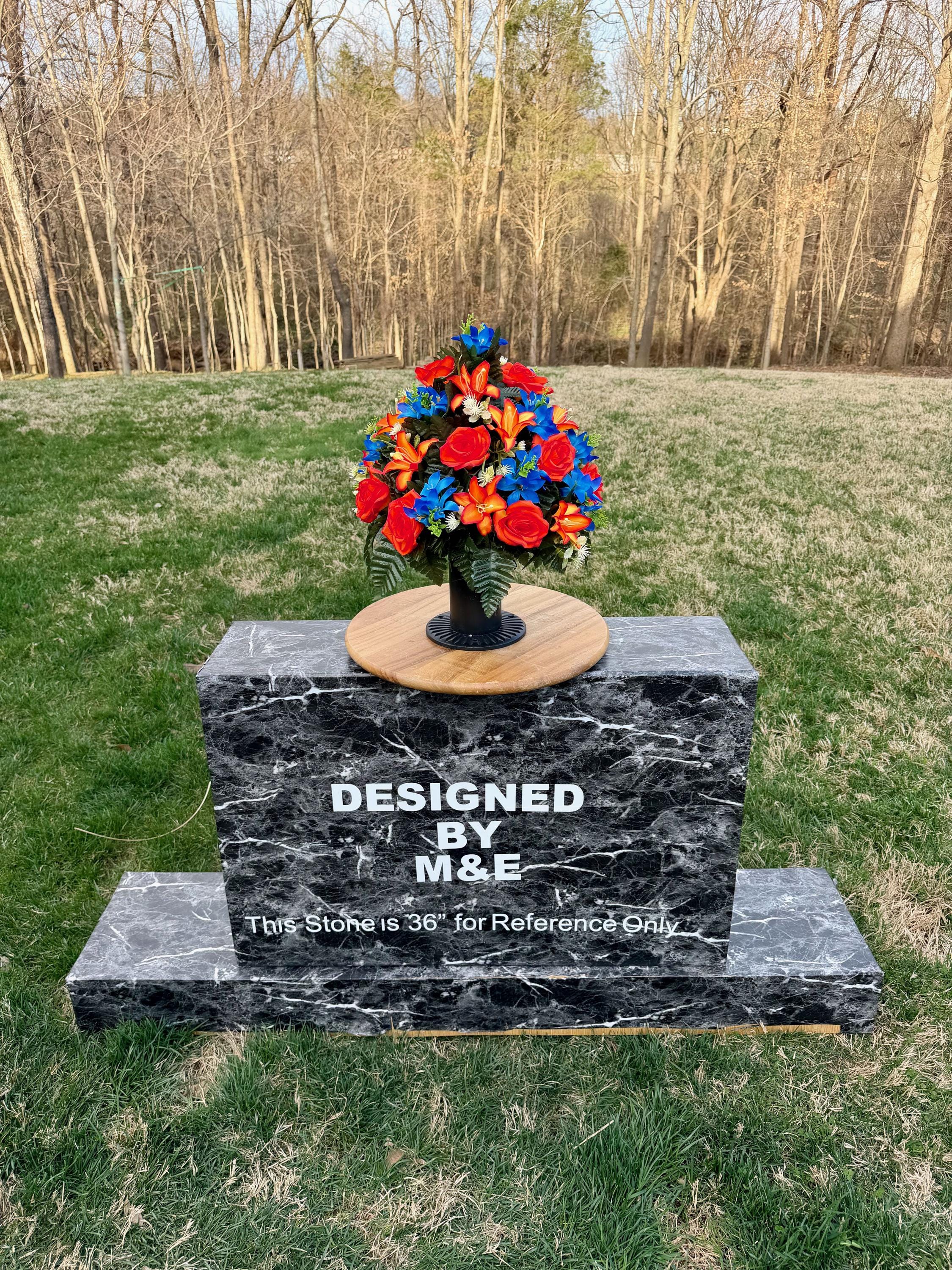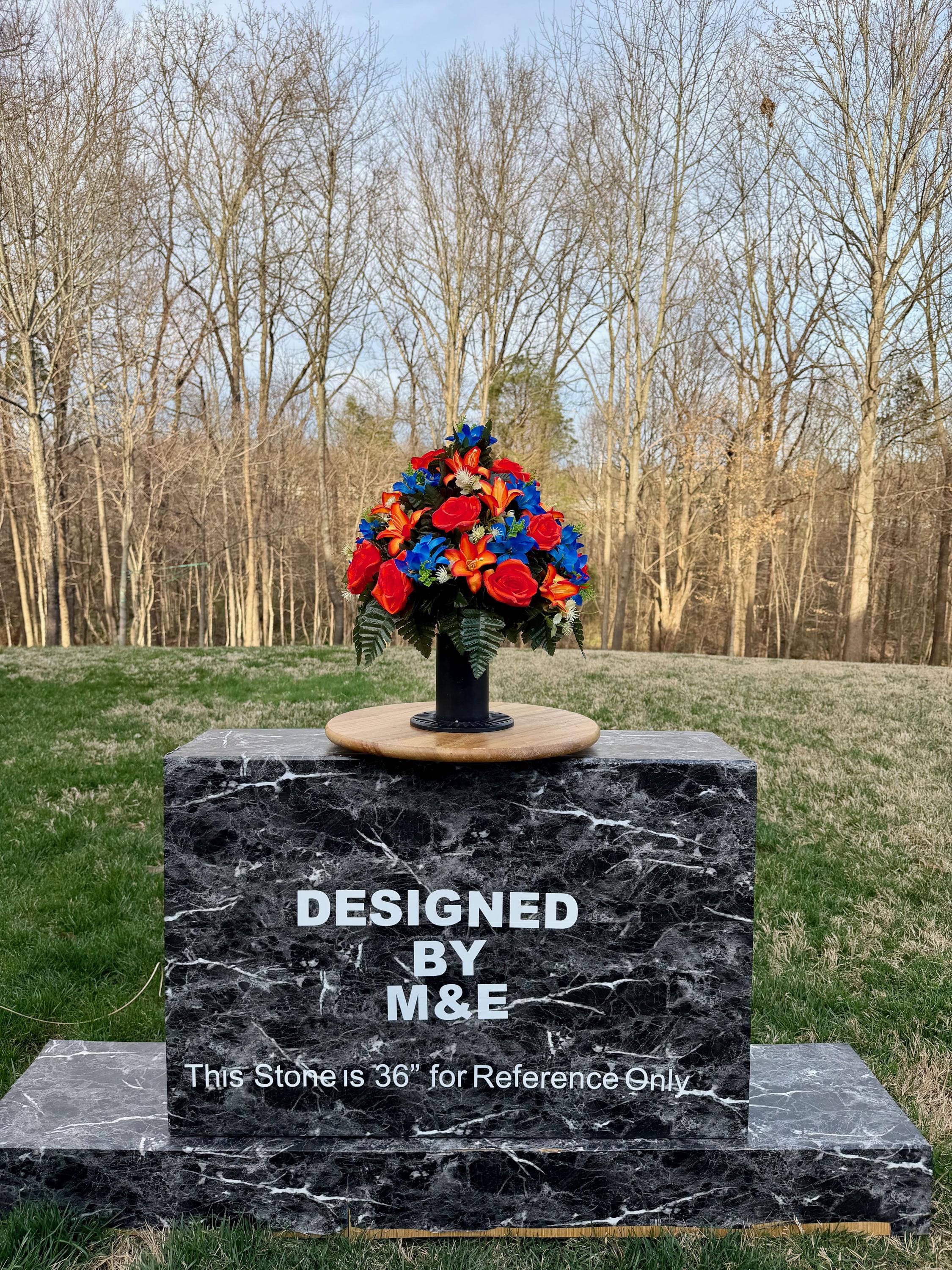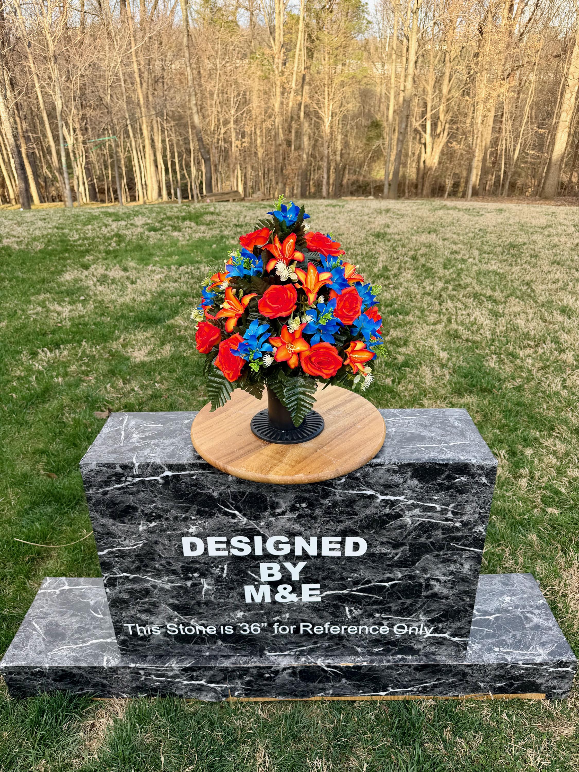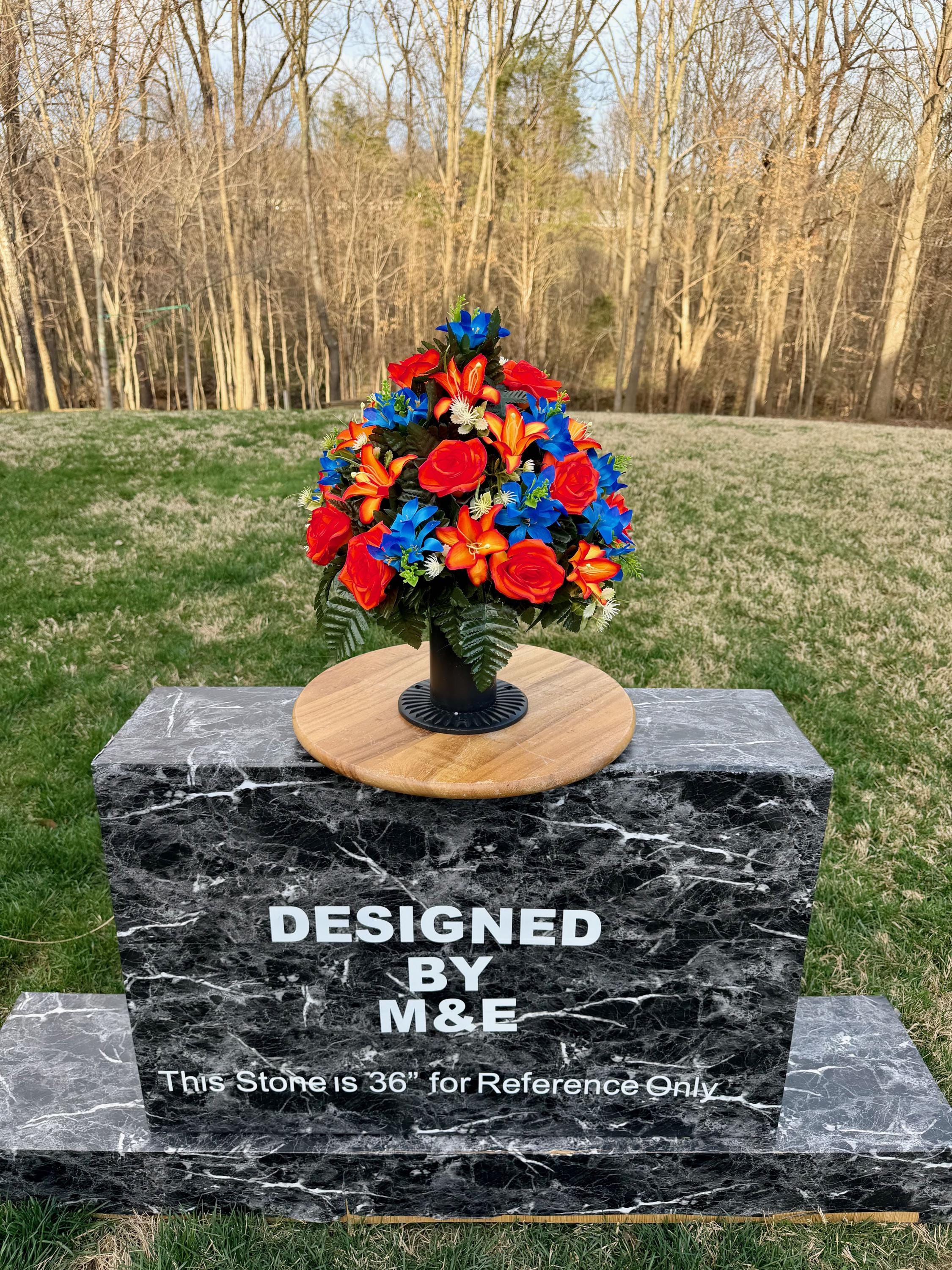 We’re a small, family-operated business consisting of myself, my husband, and my daughter. We personally manage every order and strive for excellent customer service. All our arrangements use high-quality silk flowers, though all silk blooms may fade over time. Each stem is glued into foam to withstand the elements. Designed by M&E uses only premium silks, and we put genuine care into every piece we create. Rest assured, the arrangement shown in our photos is exactly the one you’ll receive, as I design and assemble each one myself. If you’re searching for something unique or have a particular flower, color, or matching vases in mind, please contact me to discuss a custom order.