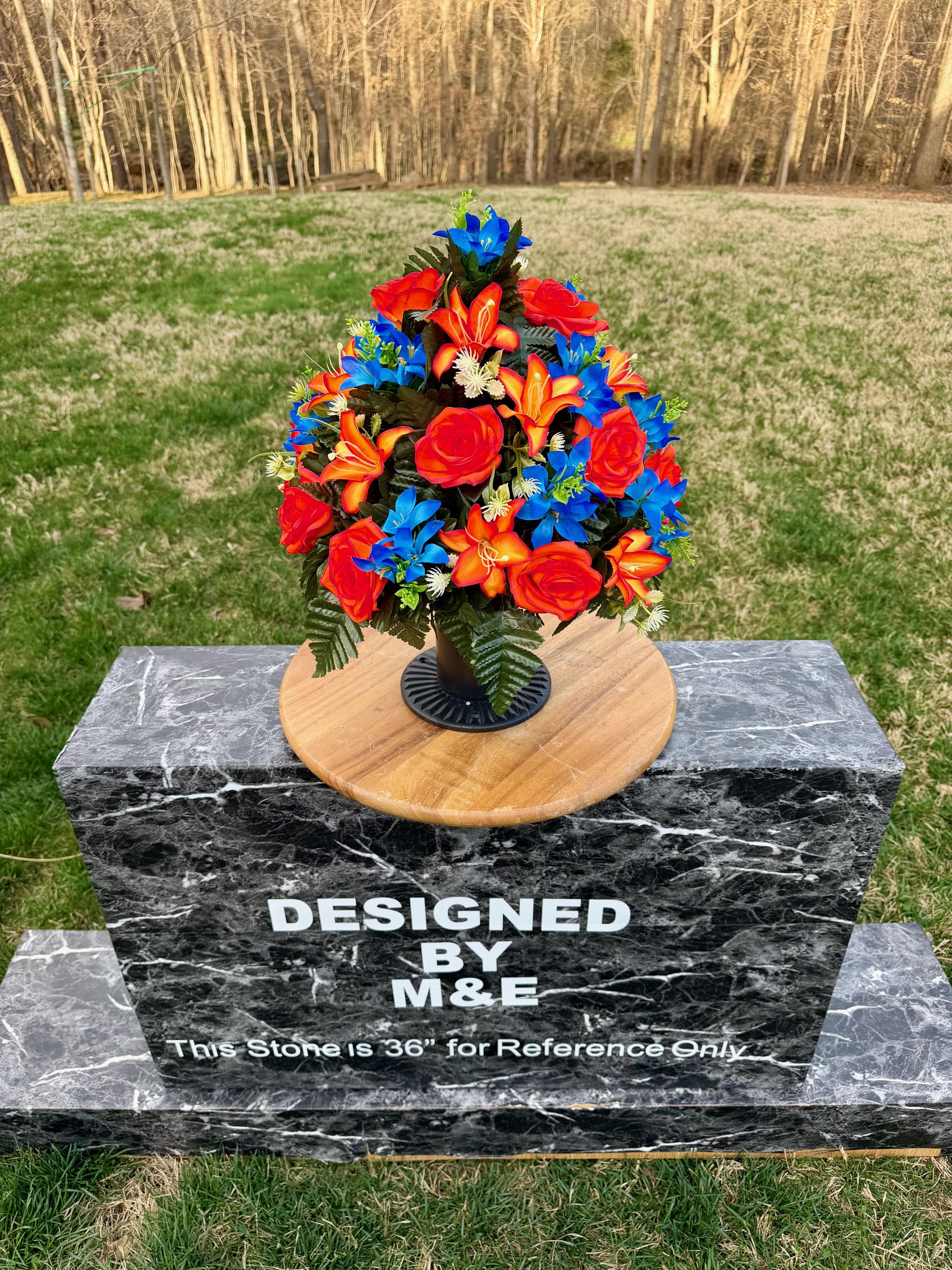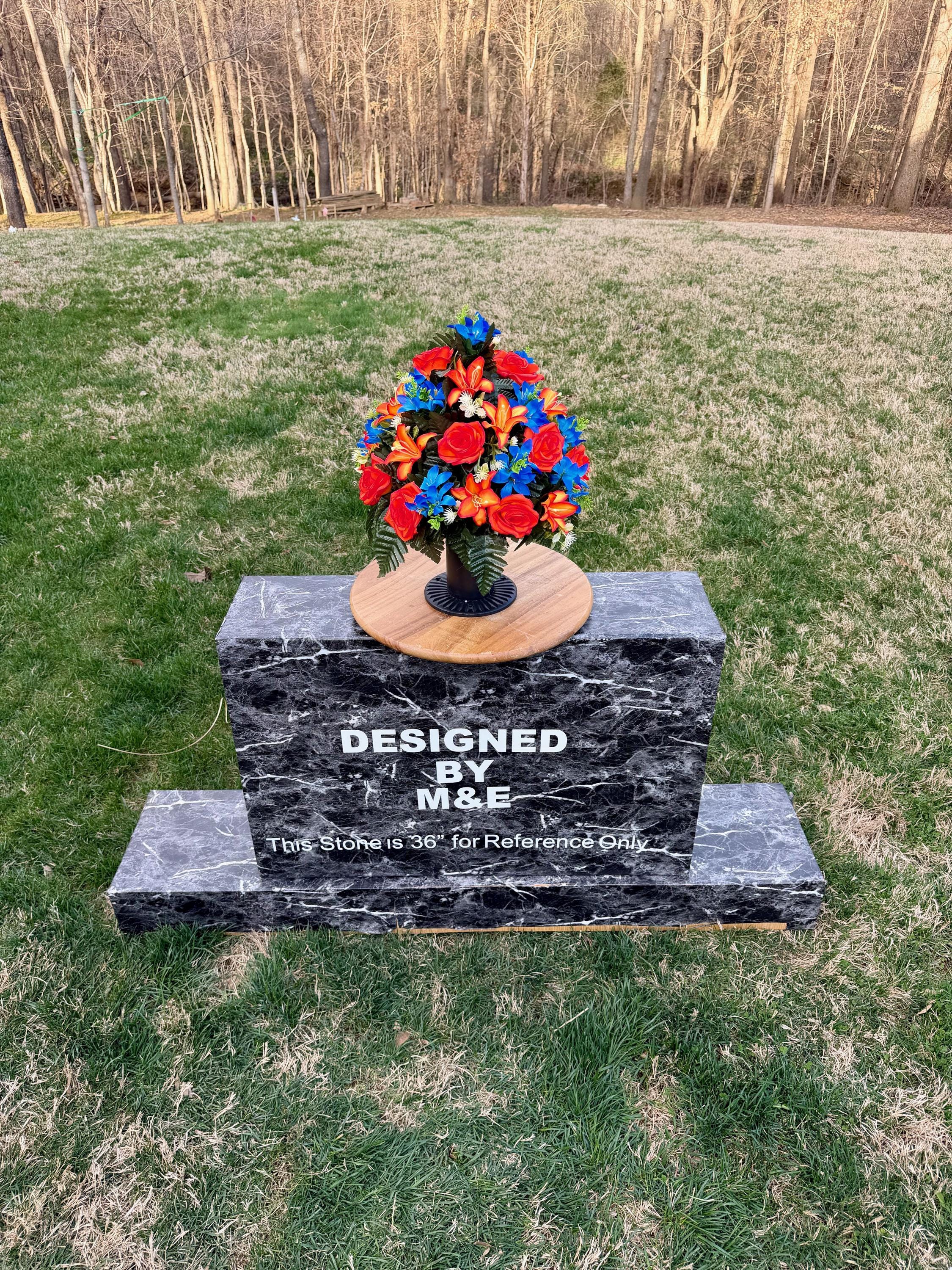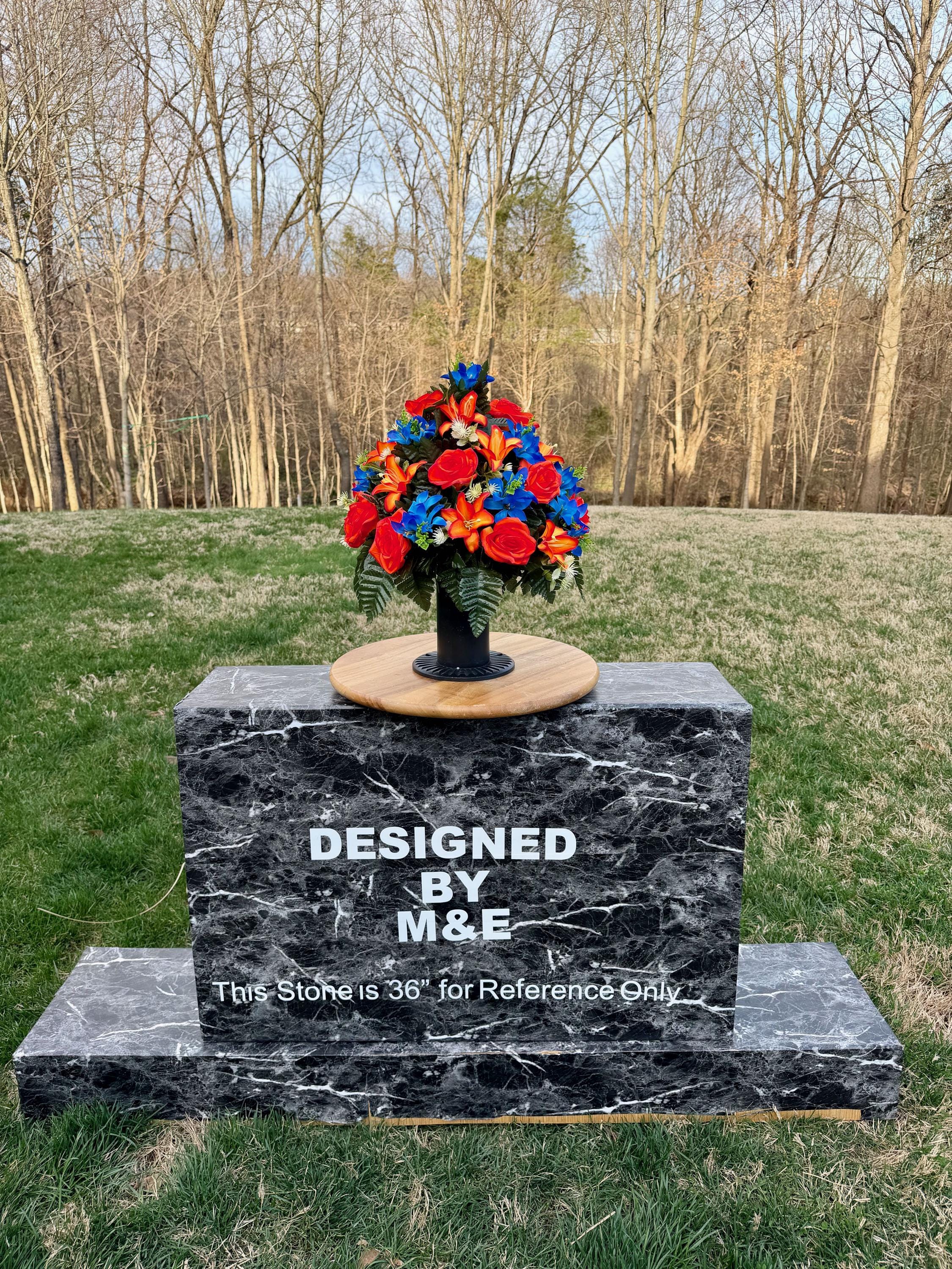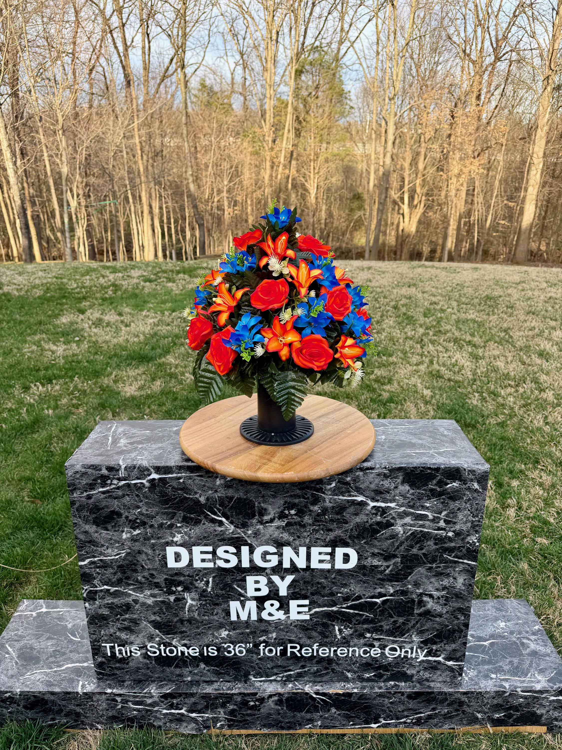 We’re a small, family-operated business consisting of myself, my husband, and my daughter. We personally manage every order and strive for excellent customer service. All our arrangements use high-quality silk flowers, though all silk blooms may fade over time. Each stem is glued into foam to withstand the elements. Designed by M&E uses only premium silks, and we put genuine care into every piece we create. Rest assured, the arrangement shown in our photos is exactly the one you’ll receive, as I design and assemble each one myself. If you’re searching for something unique or have a particular flower, color, or matching vases in mind, please contact me to discuss a custom order.