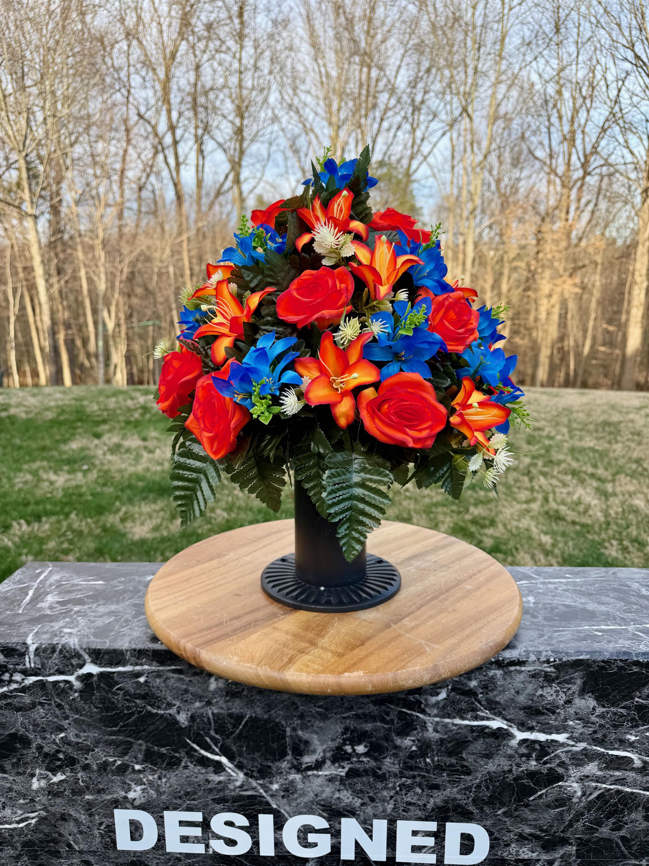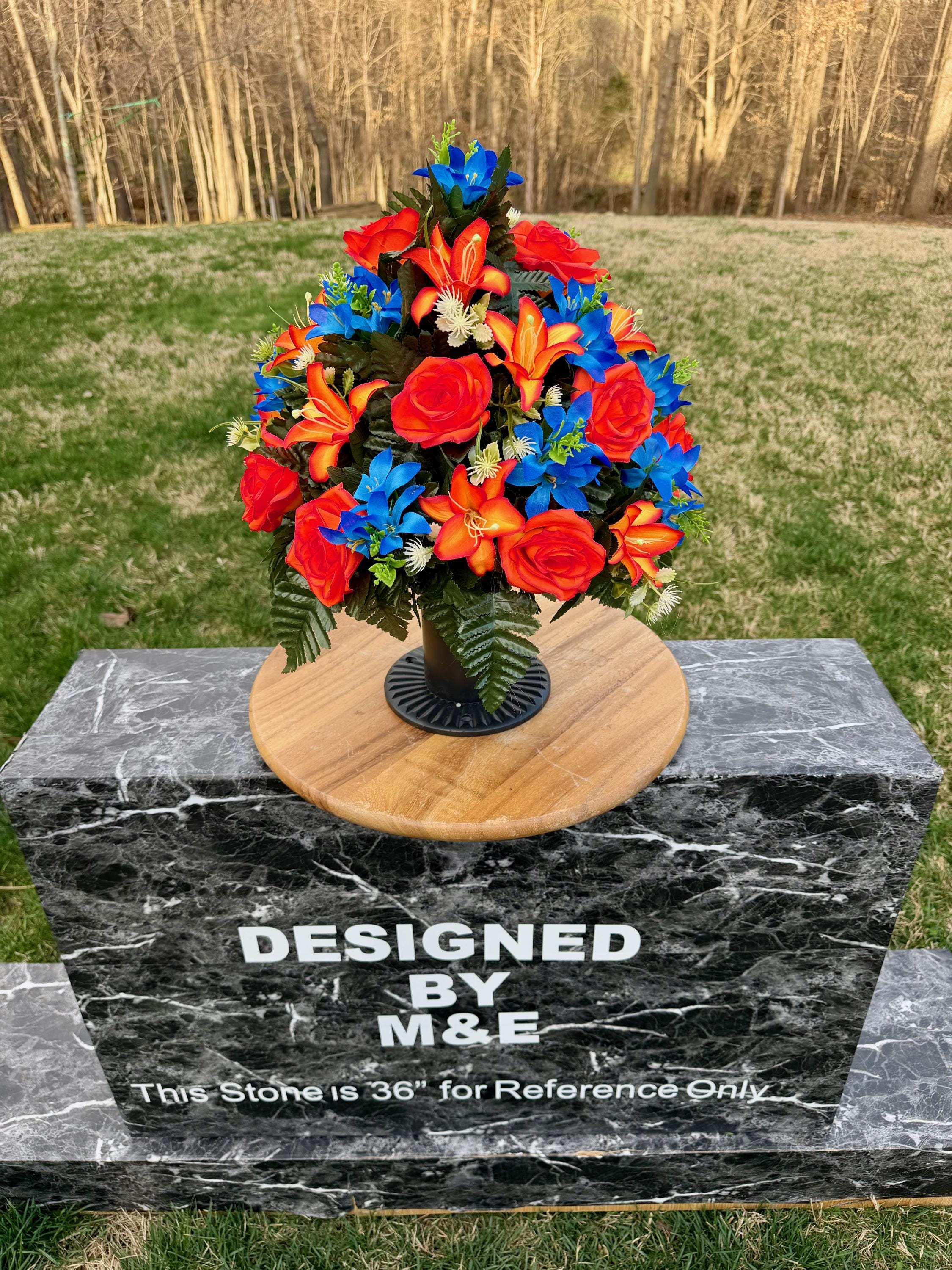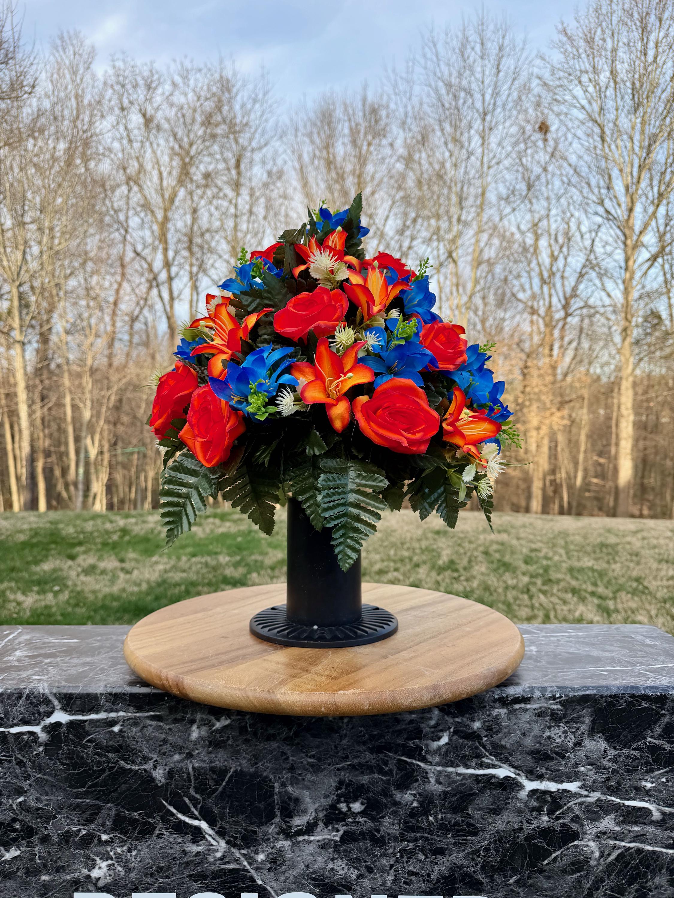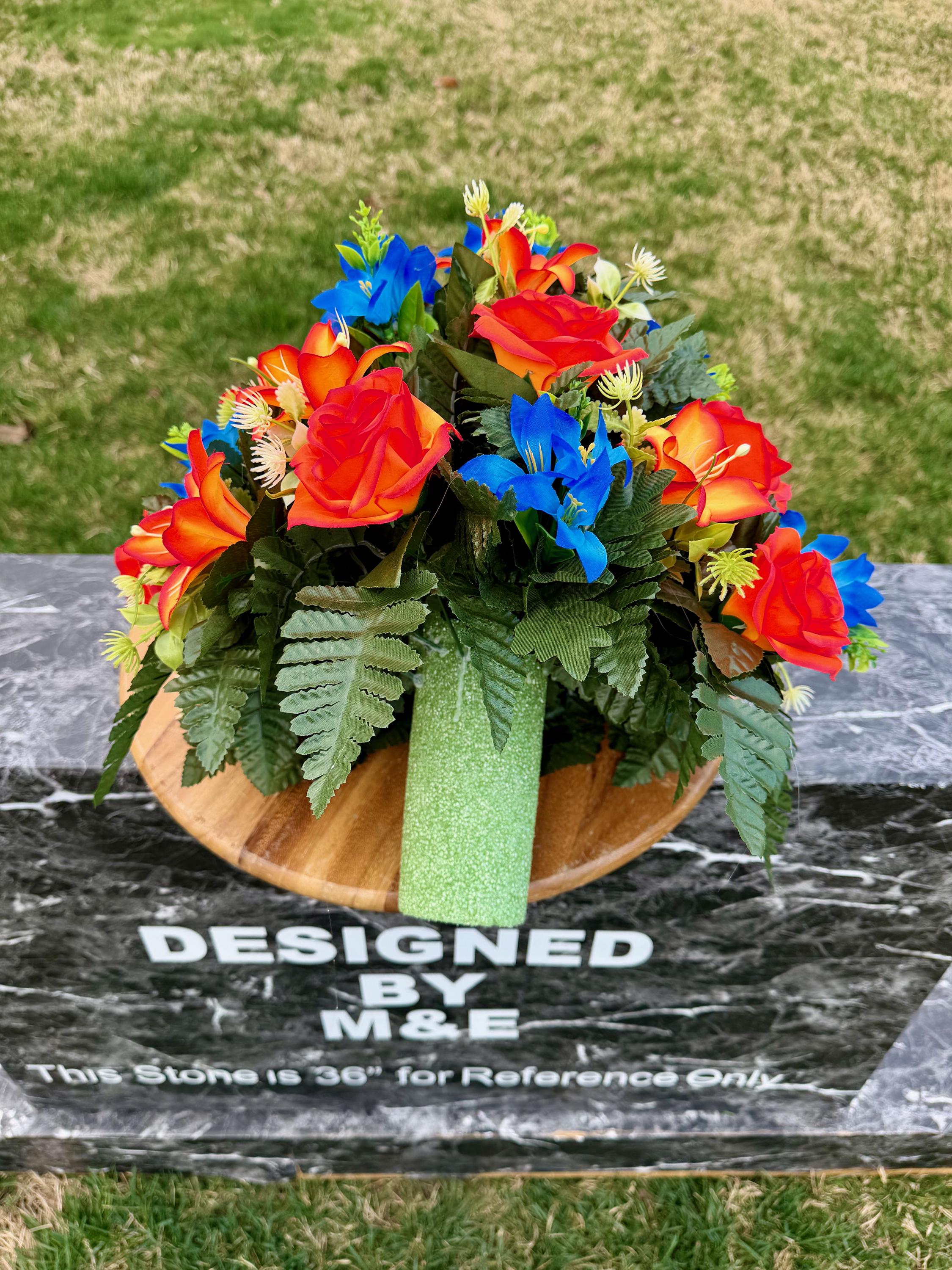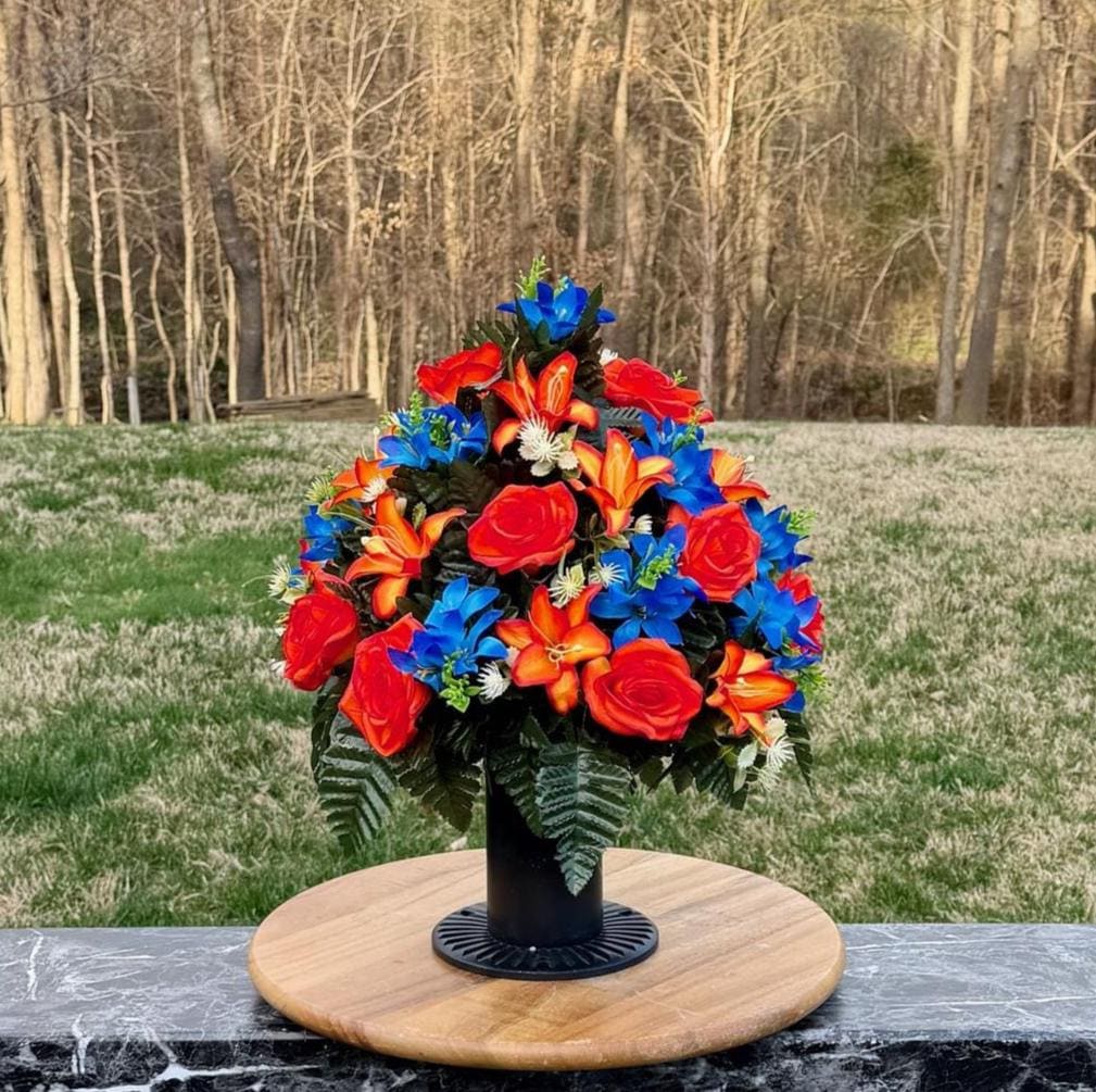 Bright Blue and Orange Cemetery Vase Arrangement, Headstone Arrangement, Memorial Decorations