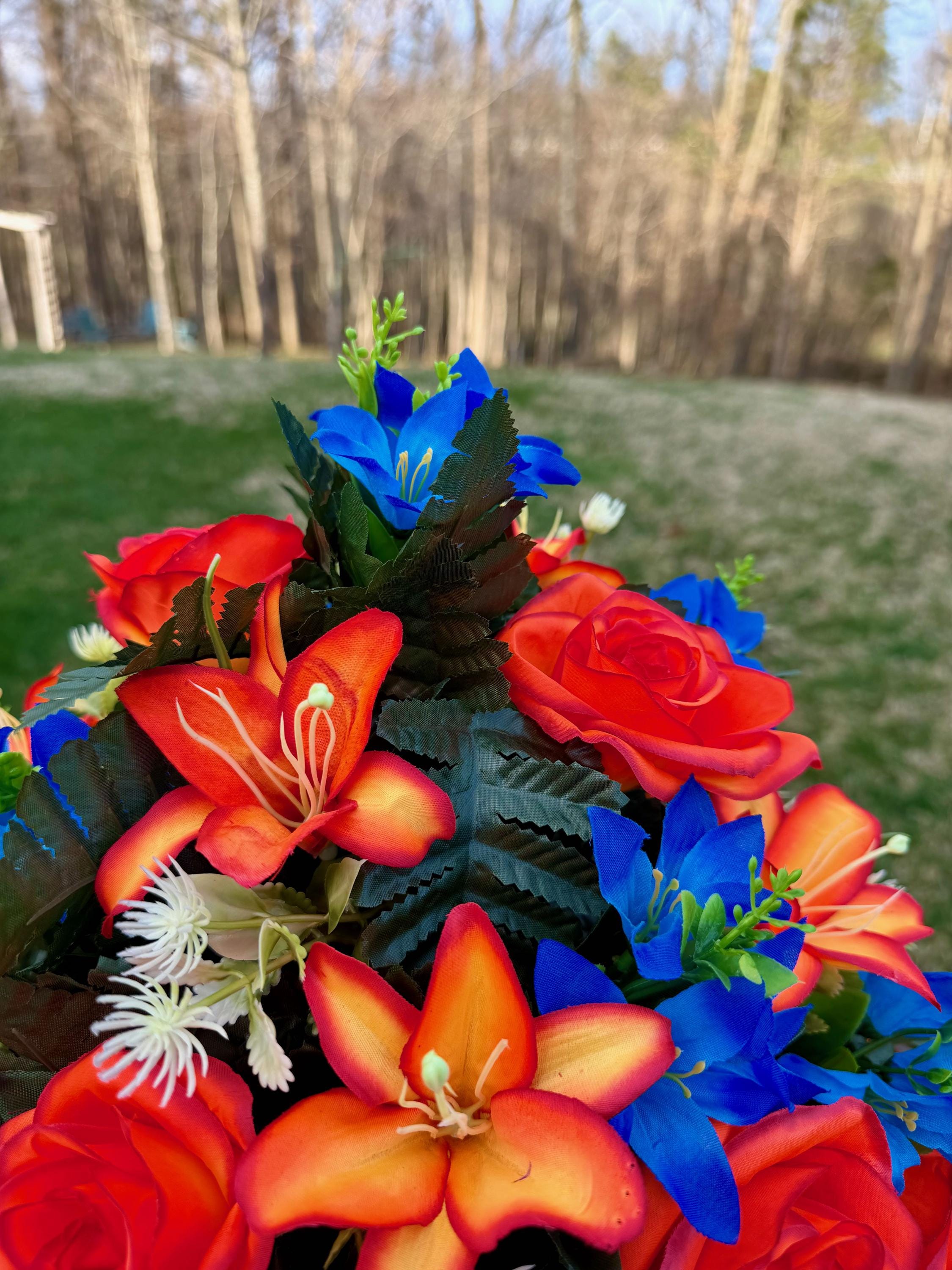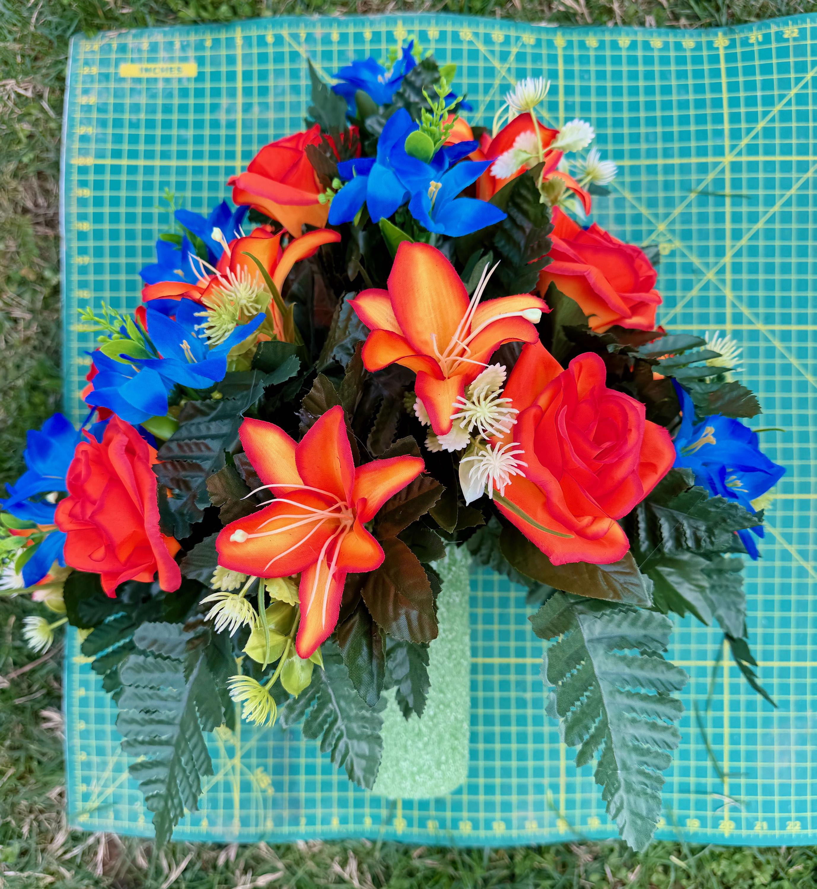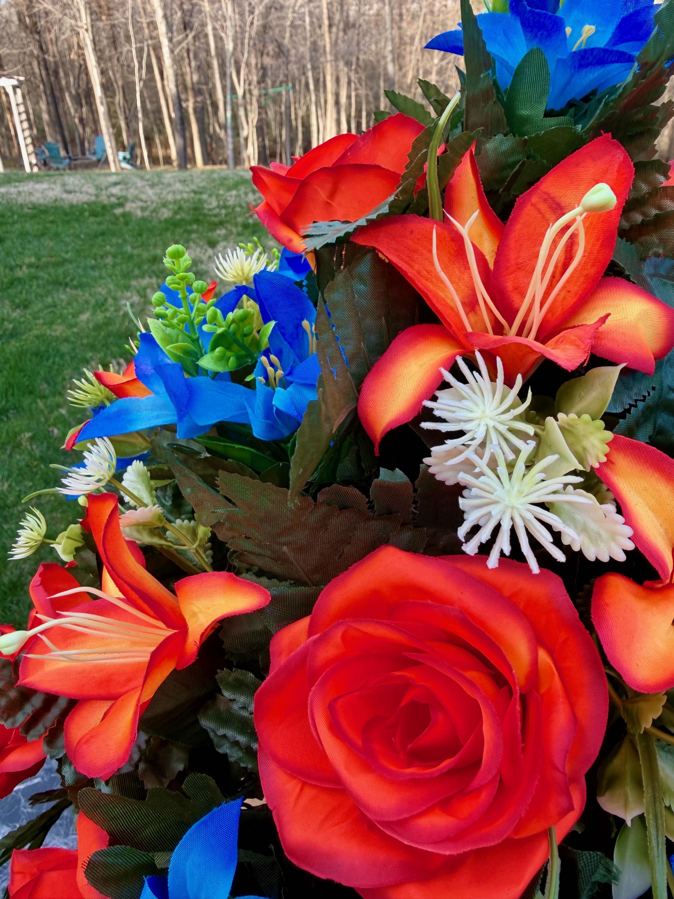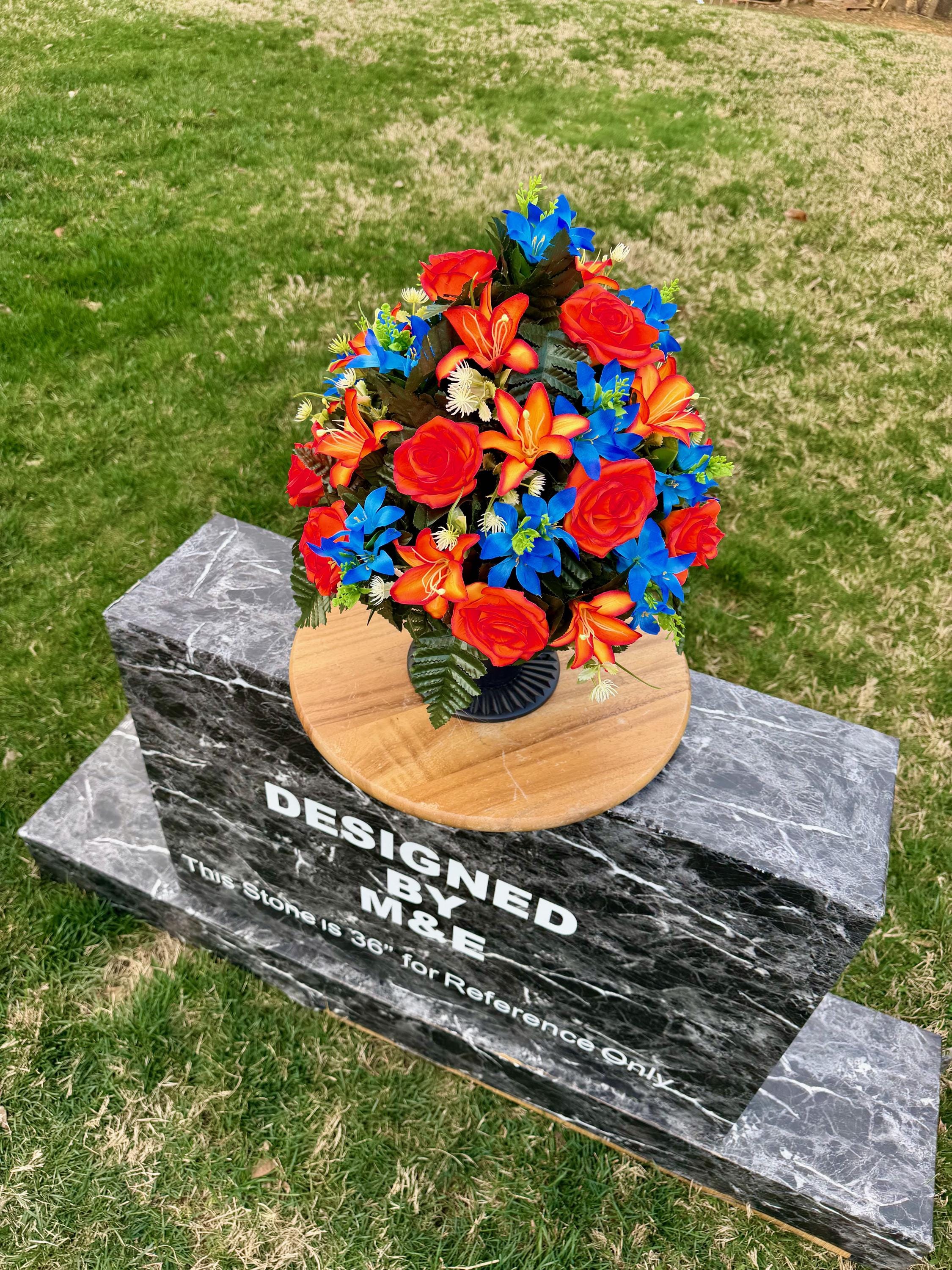 Bright Blue and Orange Cemetery Vase Arrangement, Headstone Arrangement, Memorial Decorations
