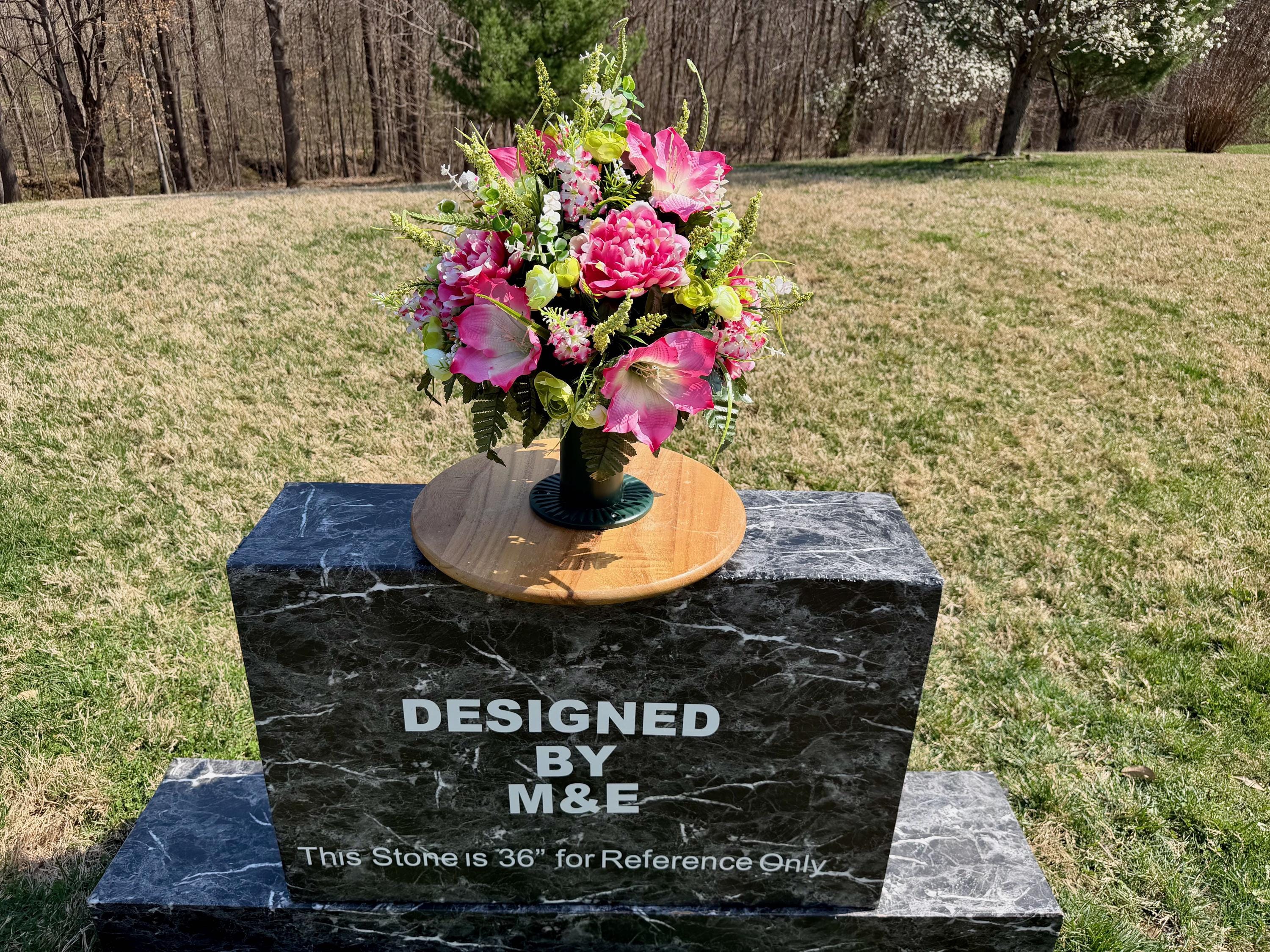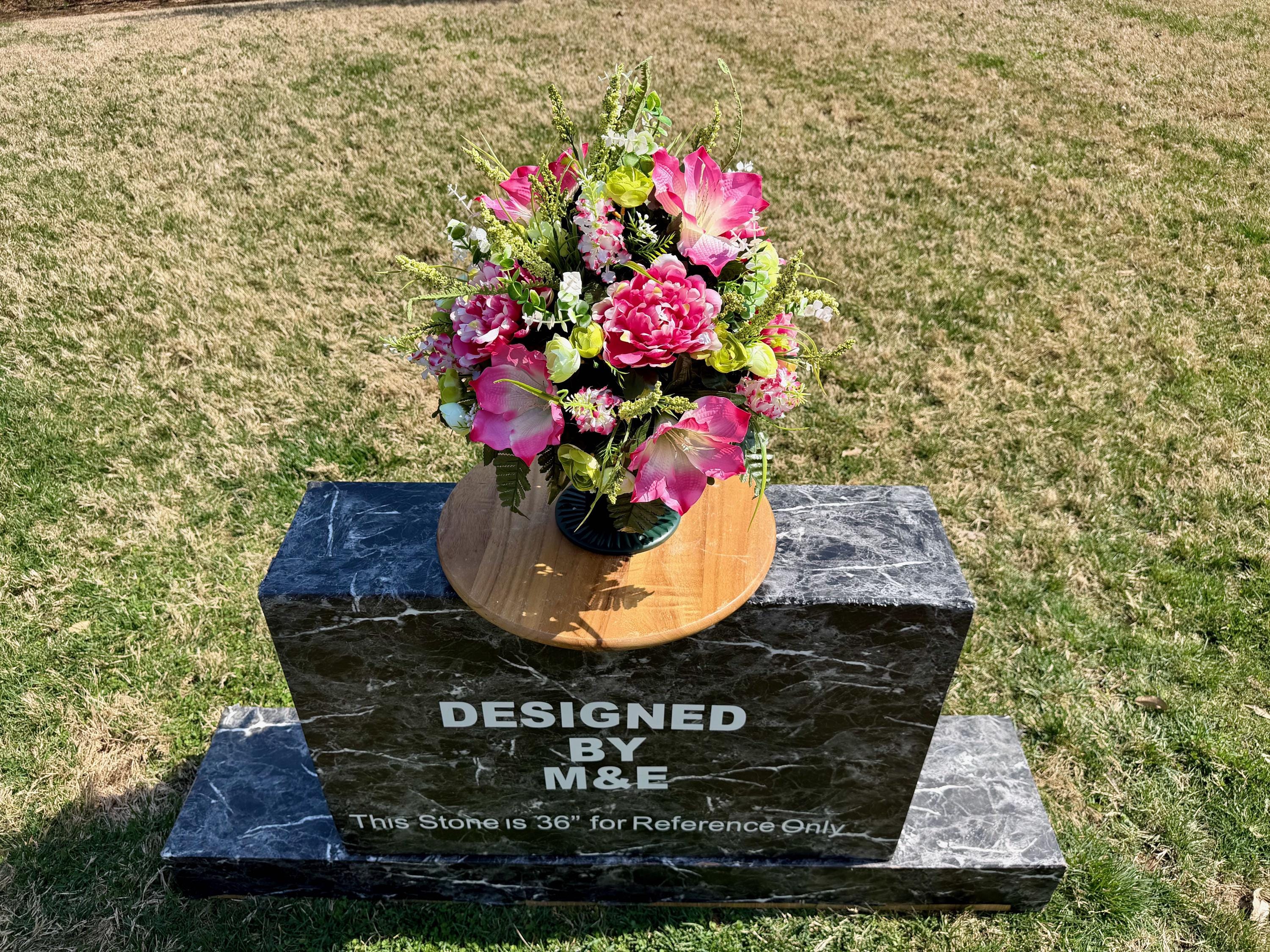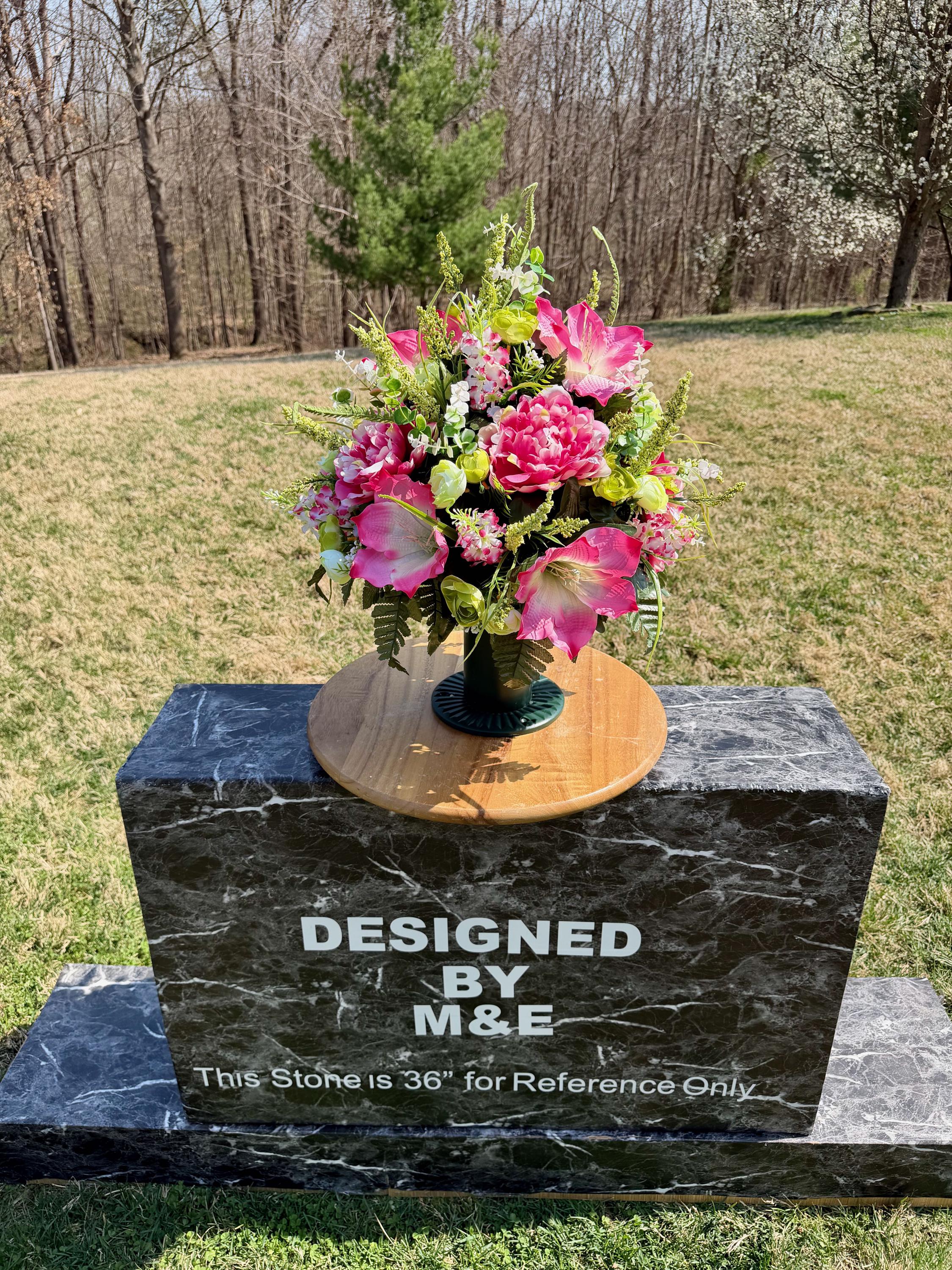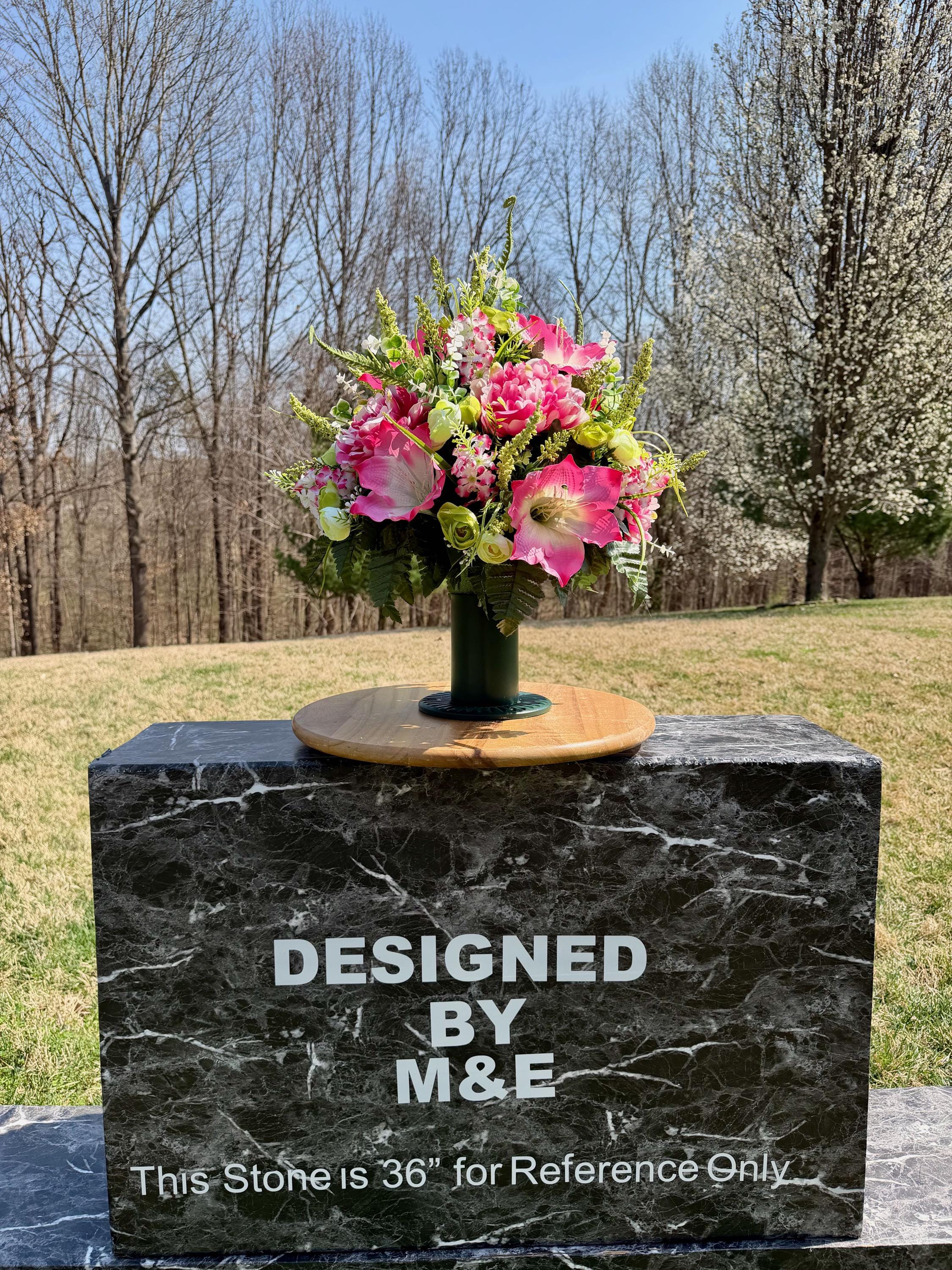 We’re a small, family-operated business consisting of myself, my husband, and my daughter. We personally manage every order and strive for excellent customer service. All our arrangements use high-quality silk flowers, though all silk blooms may fade over time. Each stem is glued into foam to withstand the elements. Designed by M&E uses only premium silks, and we put genuine care into every piece we create. Rest assured, the arrangement shown in our photos is exactly the one you’ll receive, as I design and assemble each one myself. If you’re searching for something unique or have a particular flower, color, or matching vases in mind, please contact me to discuss a custom order.