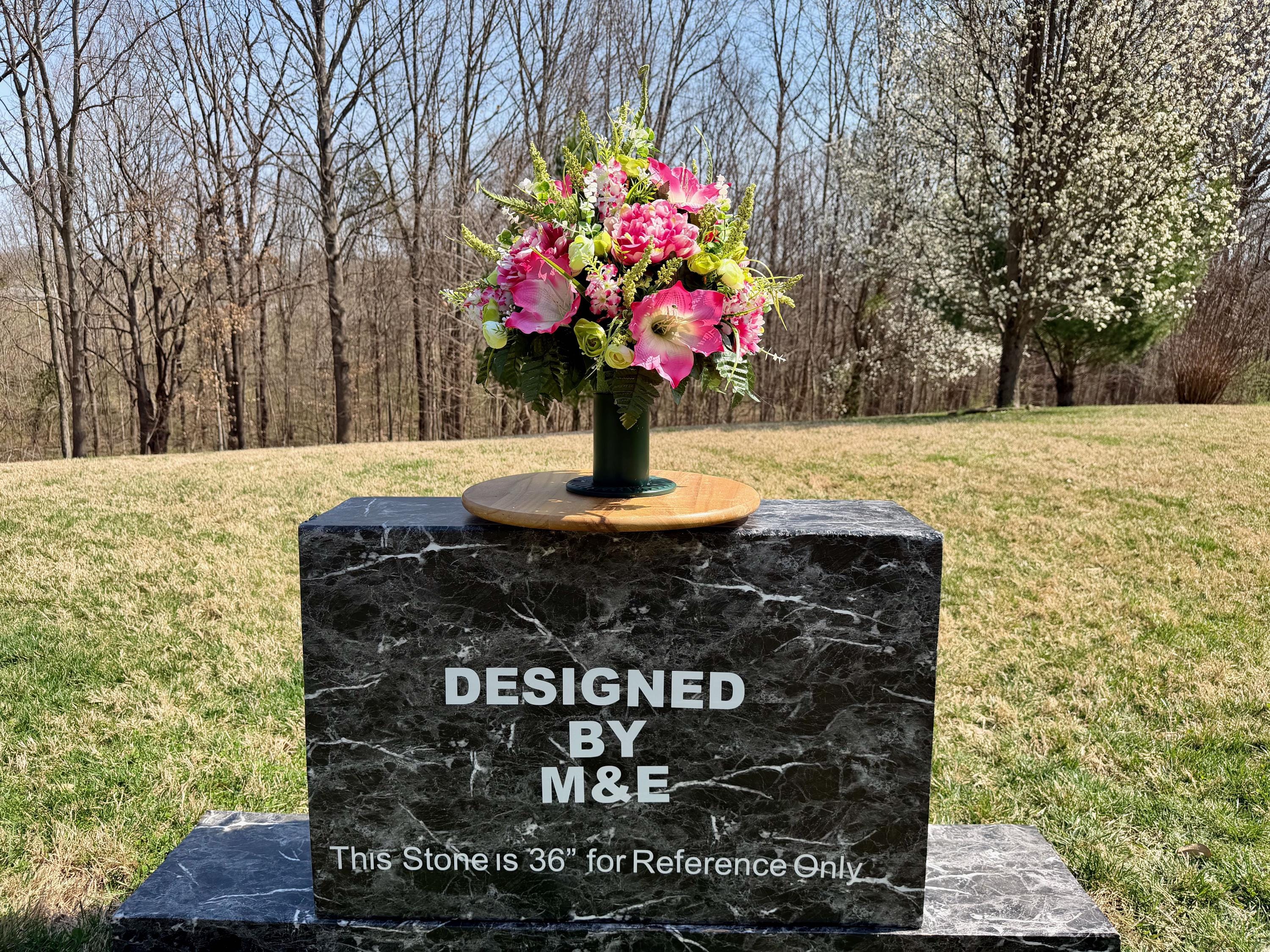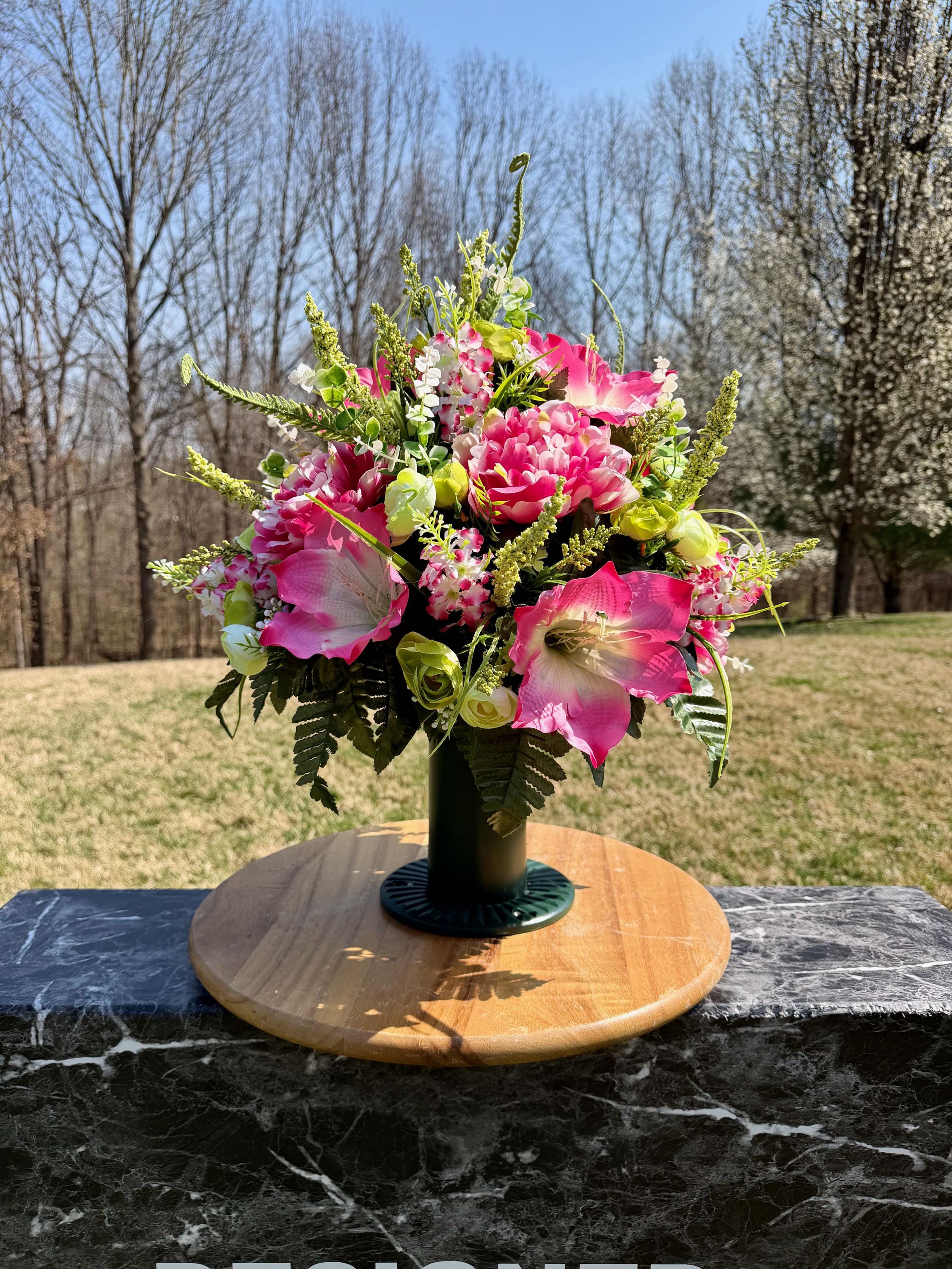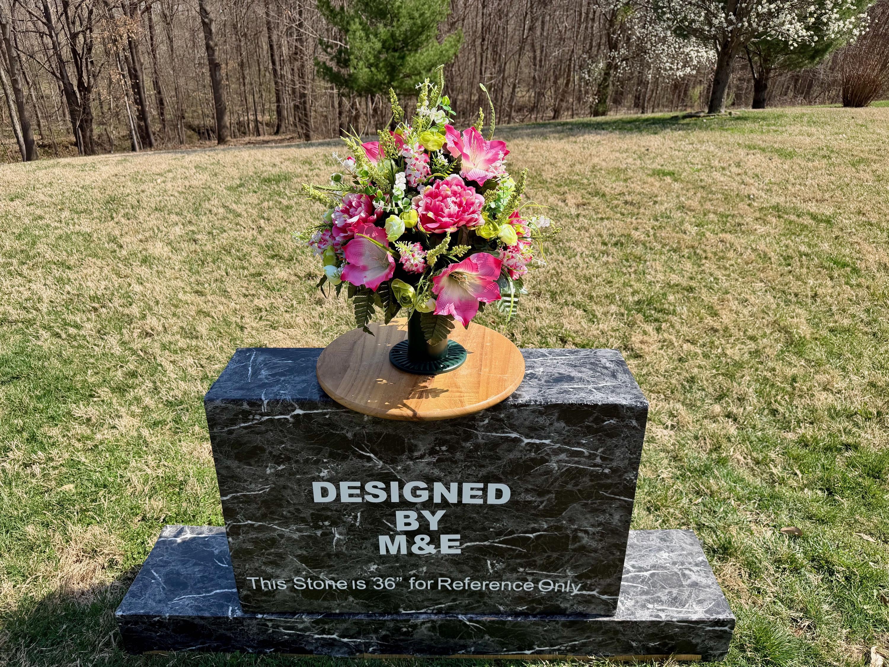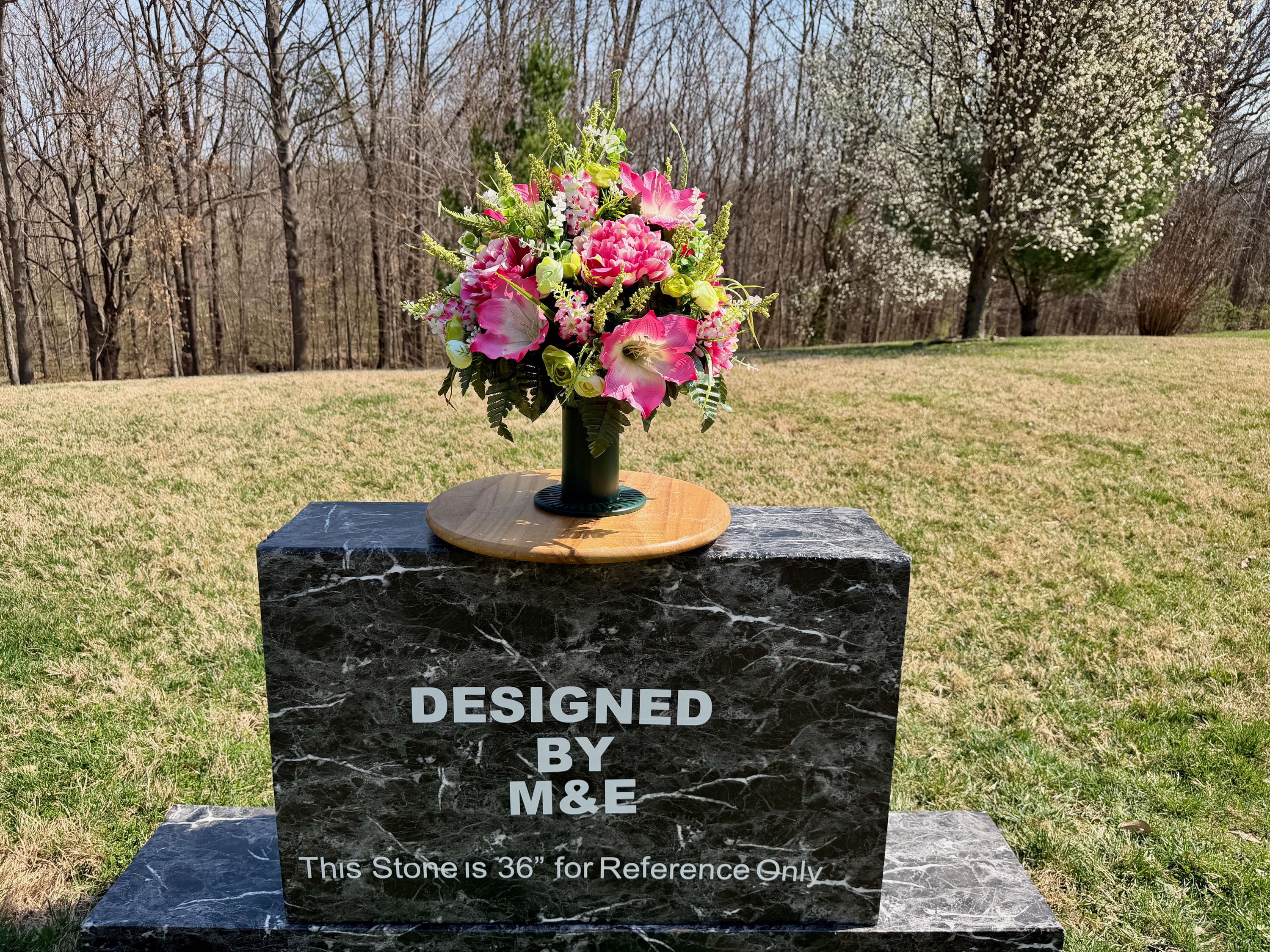 We’re a small, family-operated business consisting of myself, my husband, and my daughter. We personally manage every order and strive for excellent customer service. All our arrangements use high-quality silk flowers, though all silk blooms may fade over time. Each stem is glued into foam to withstand the elements. Designed by M&E uses only premium silks, and we put genuine care into every piece we create. Rest assured, the arrangement shown in our photos is exactly the one you’ll receive, as I design and assemble each one myself. If you’re searching for something unique or have a particular flower, color, or matching vases in mind, please contact me to discuss a custom order.