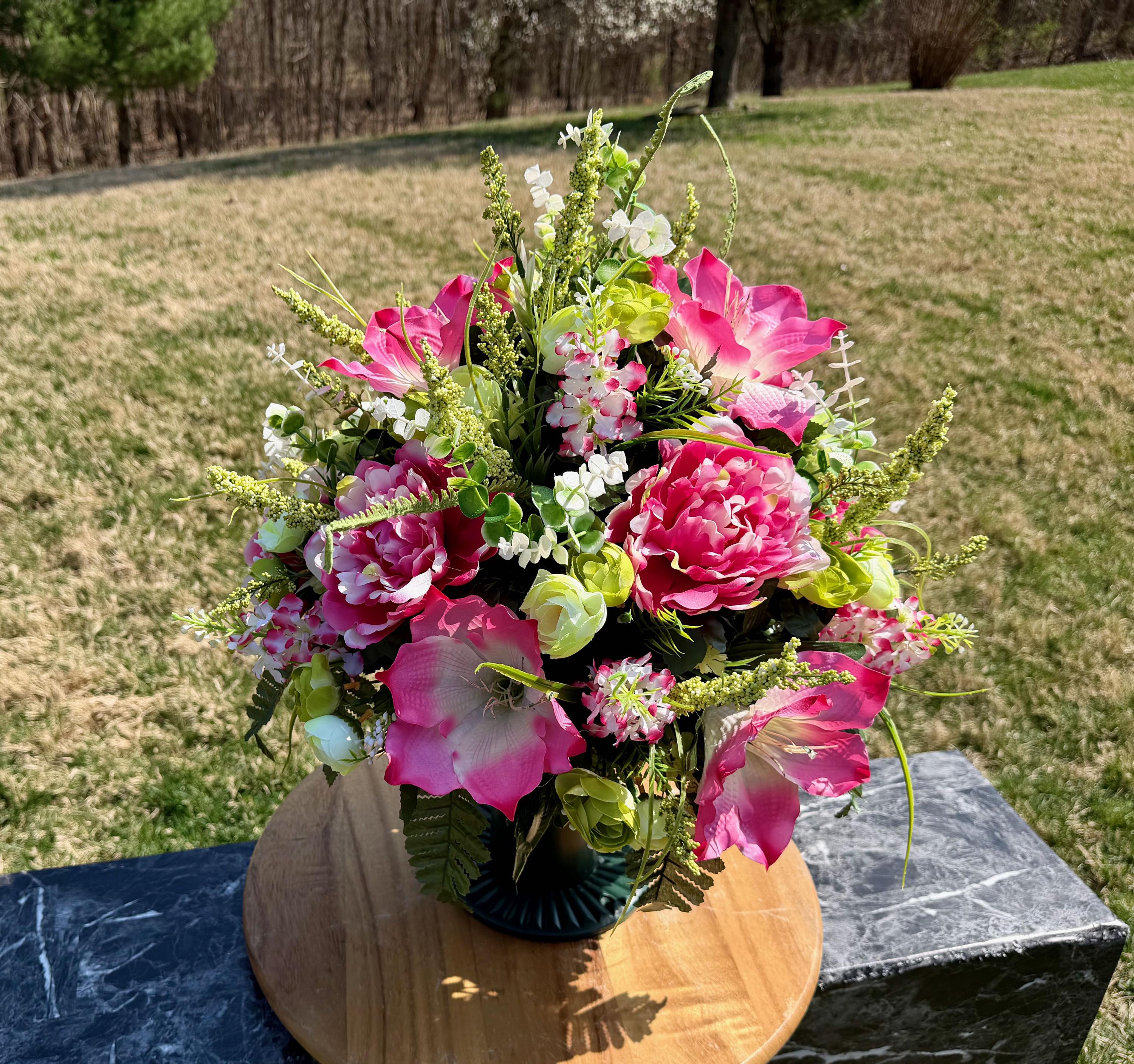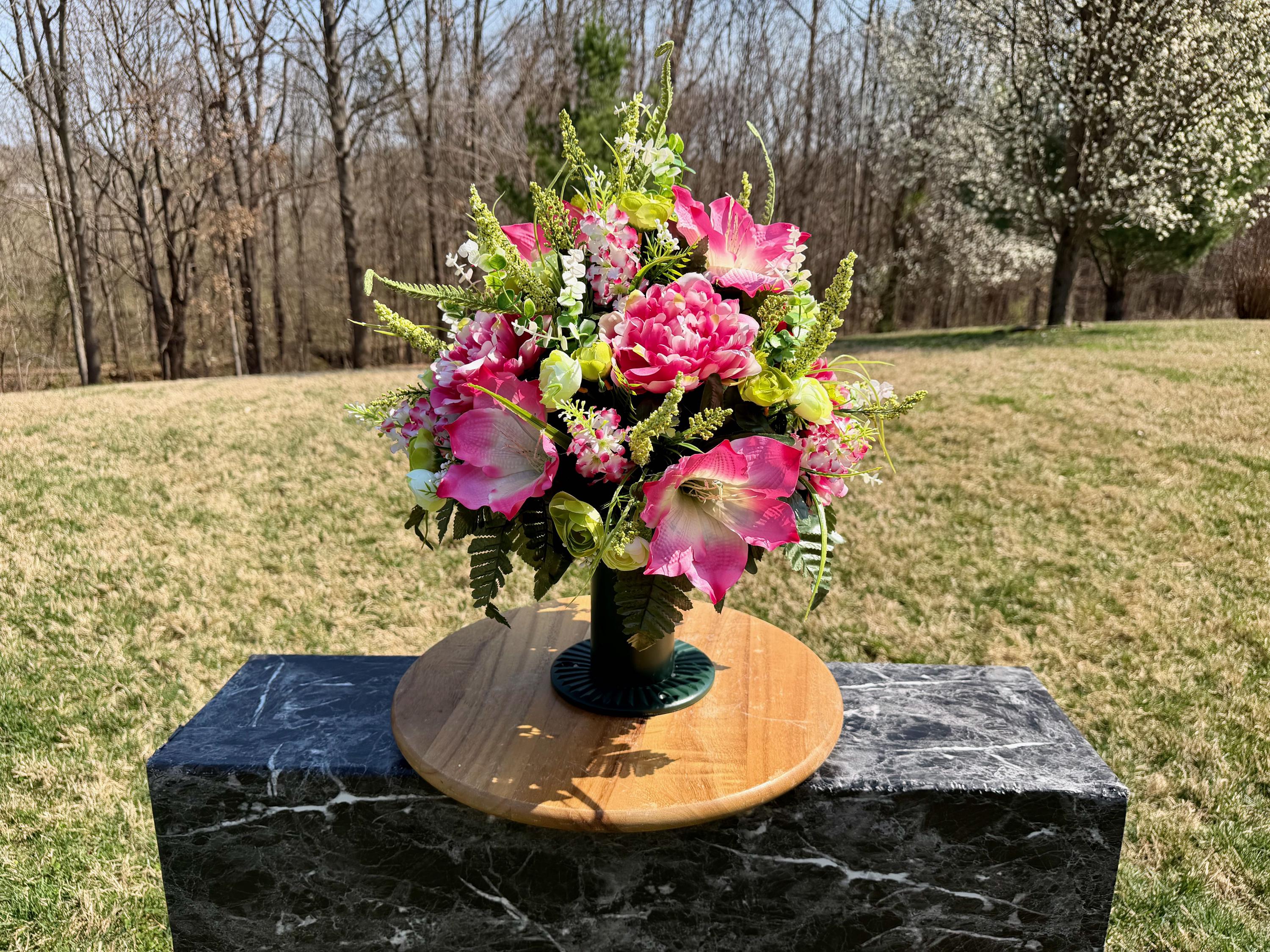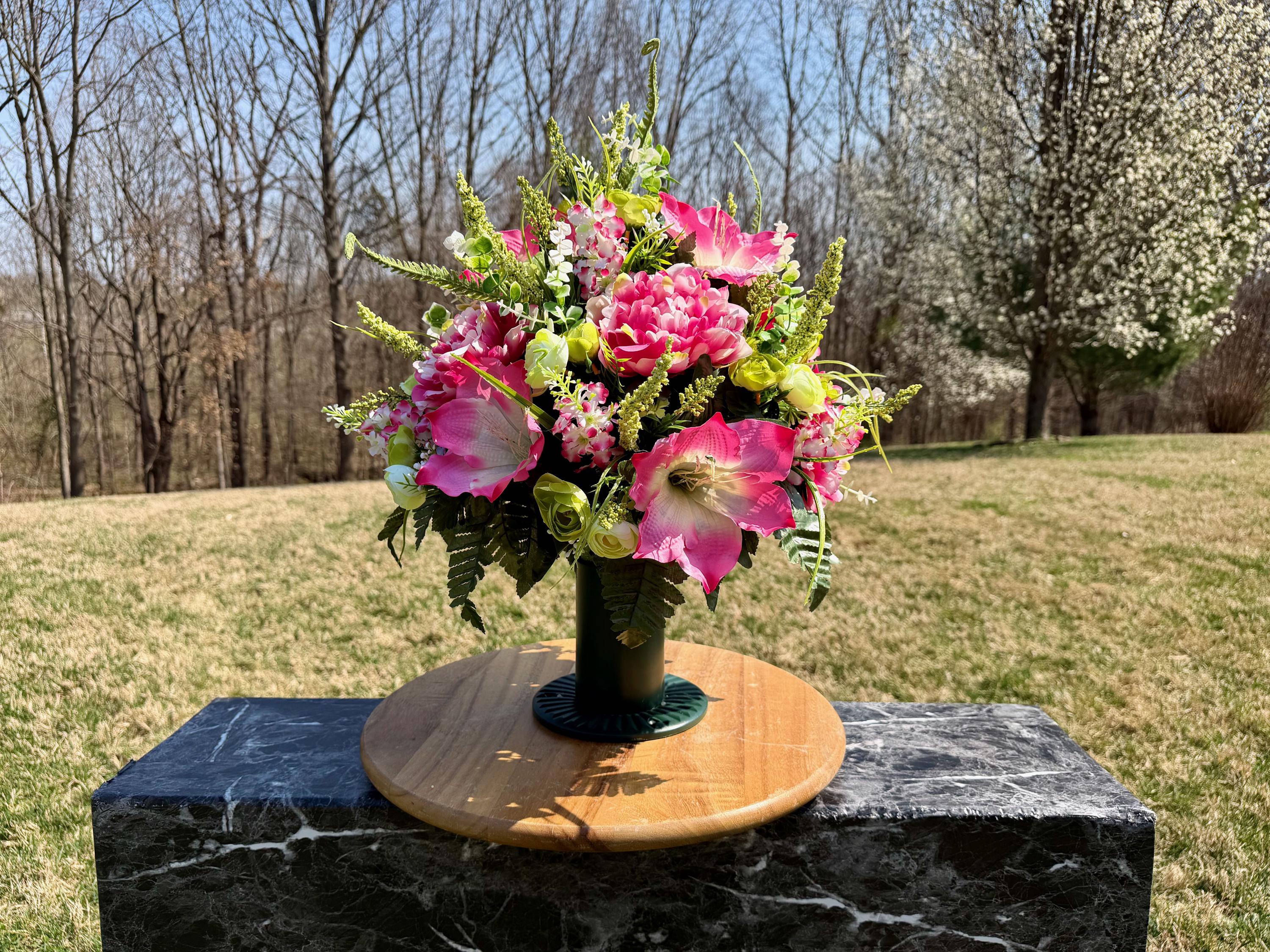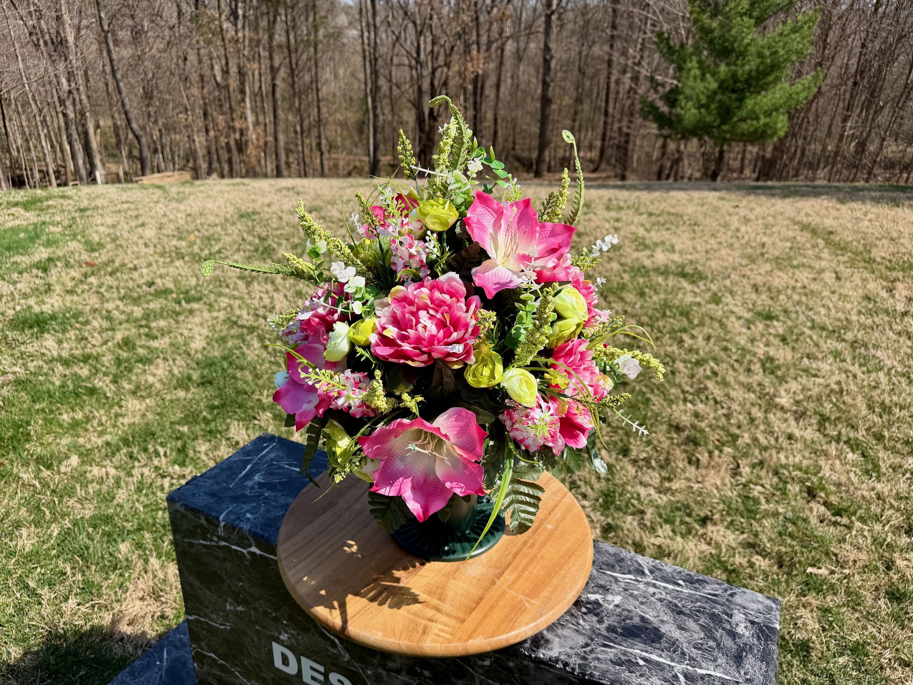We’re a small, family-operated business consisting of myself, my husband, and my daughter. We personally manage every order and strive for excellent customer service. All our arrangements use high-quality silk flowers, though all silk blooms may fade over time. Each stem is glued into foam to withstand the elements. Designed by M&E uses only premium silks, and we put genuine care into every piece we create. Rest assured, the arrangement shown in our photos is exactly the one you’ll receive, as I design and assemble each one myself. If you’re searching for something unique or have a particular flower, color, or matching vases in mind, please contact me to discuss a custom order.