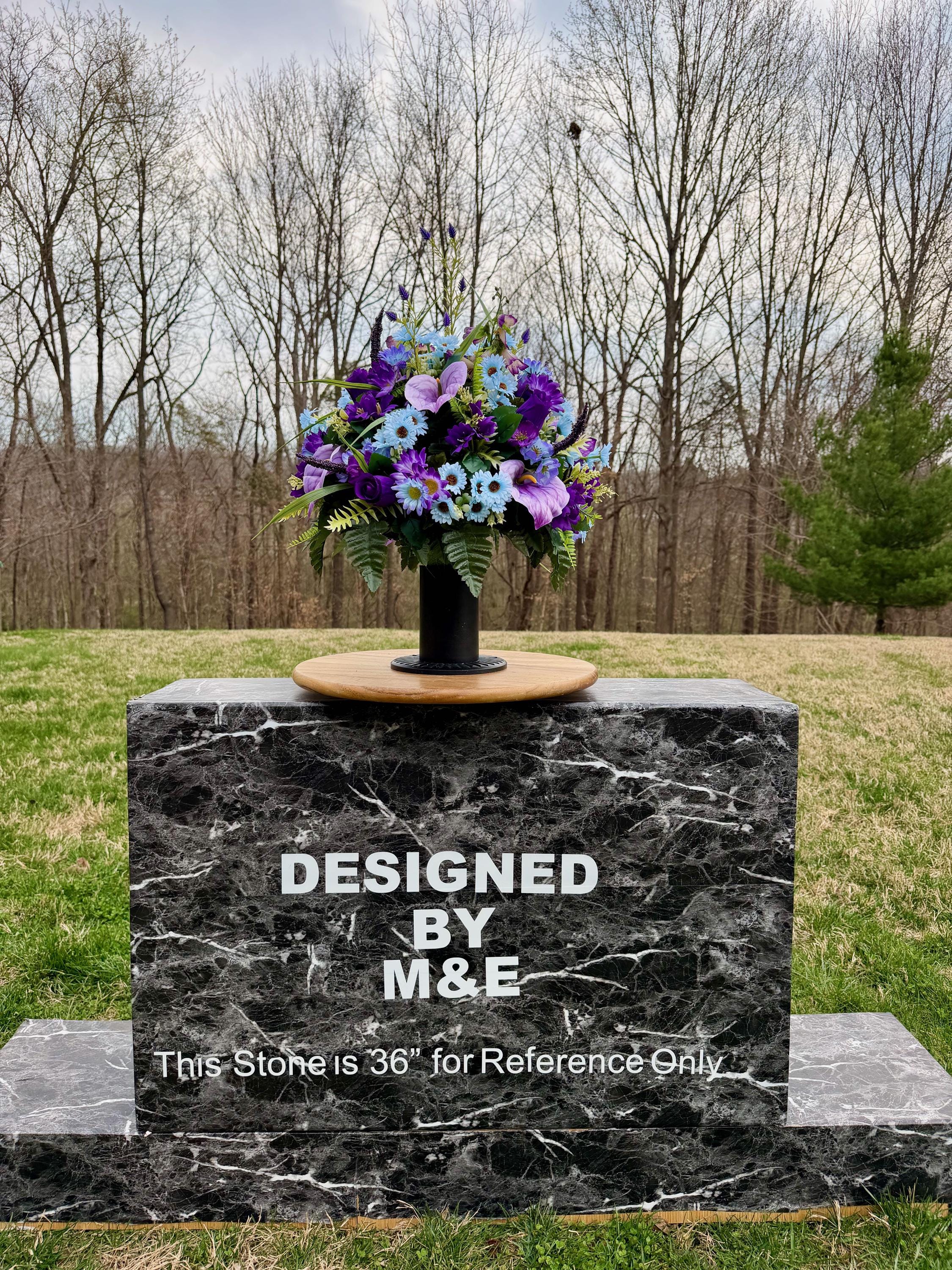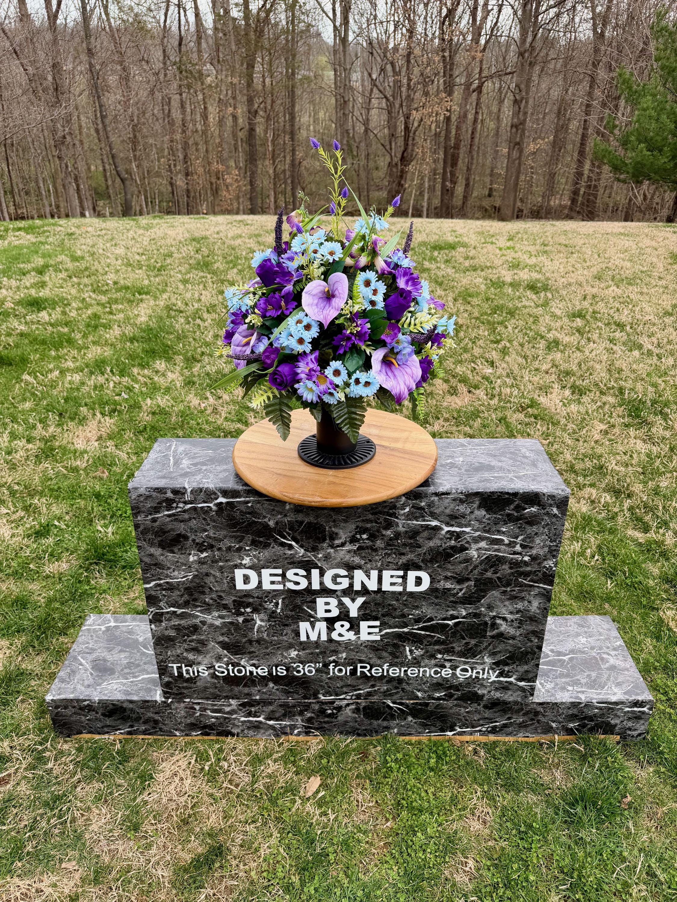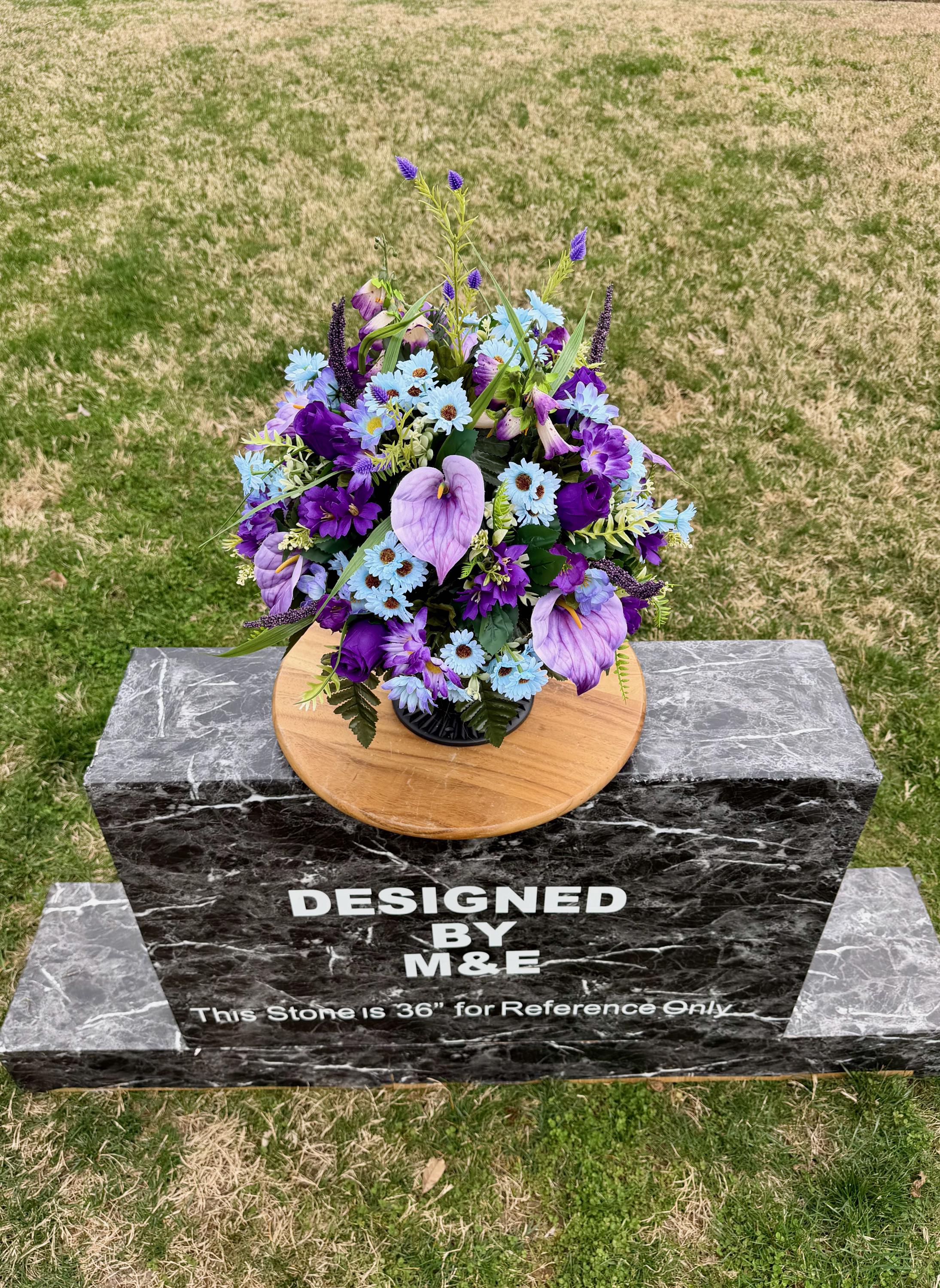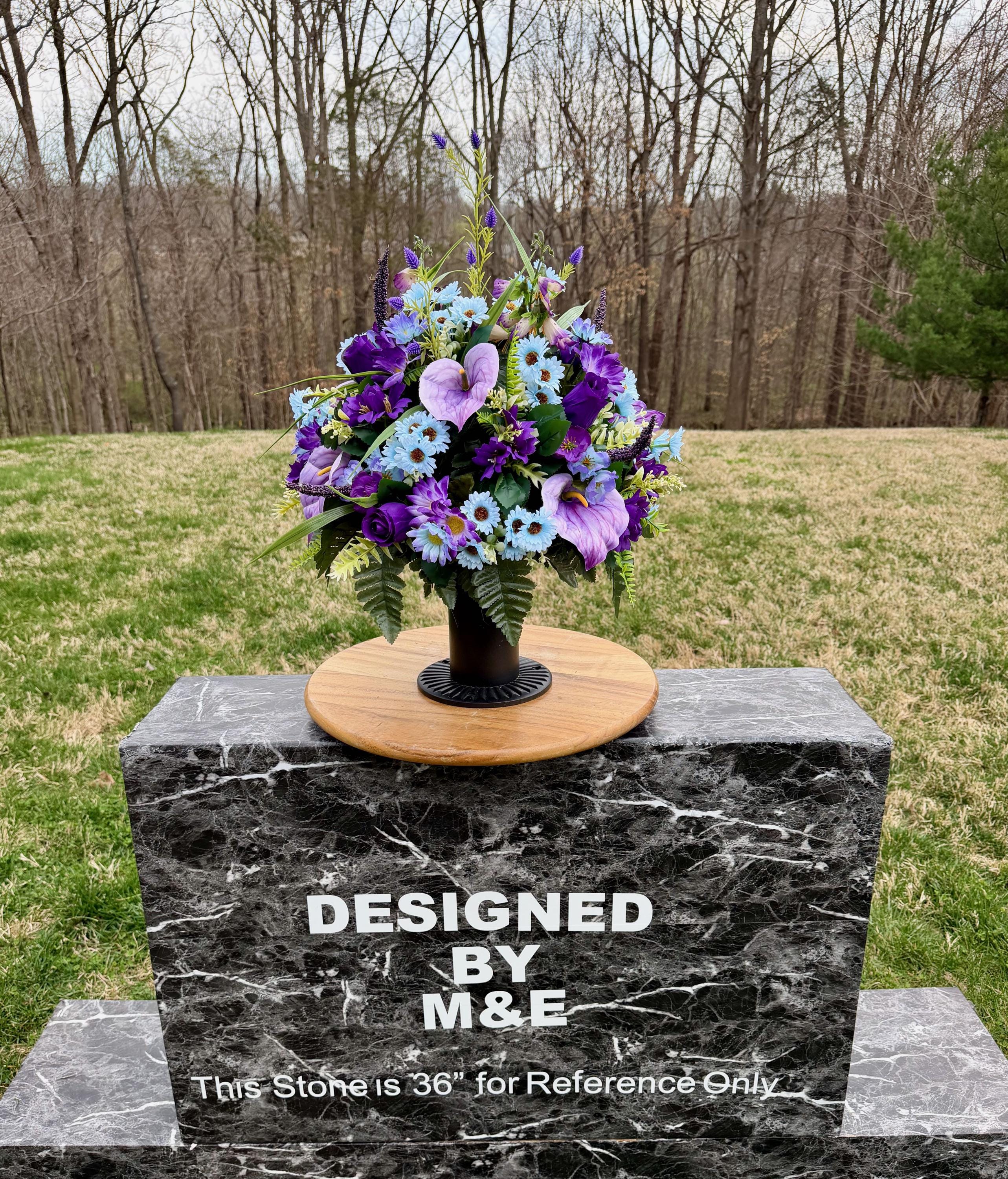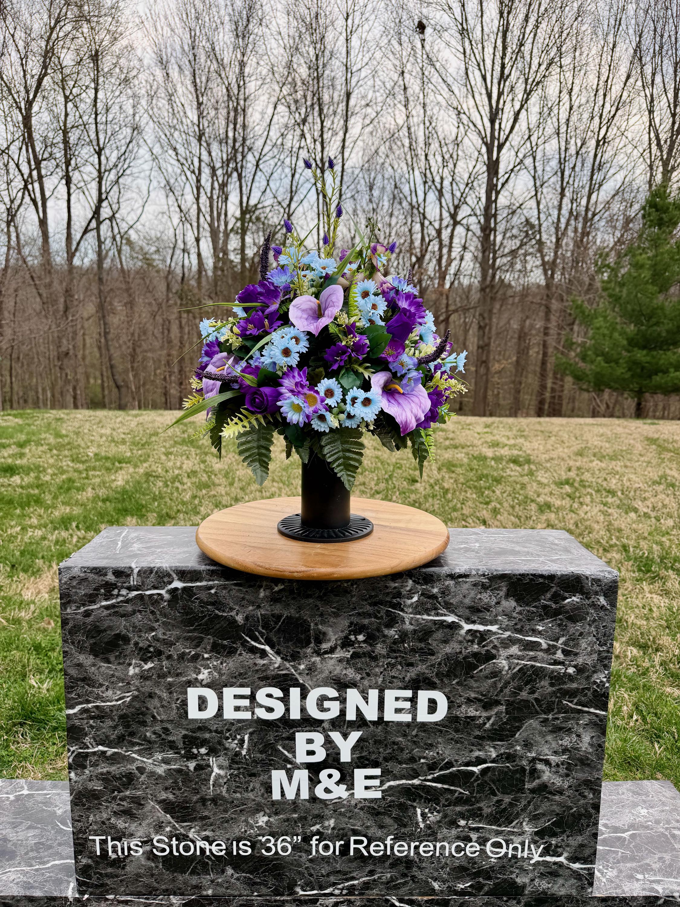 We’re a small, family-operated business consisting of myself, my husband, and my daughter. We personally manage every order and strive for excellent customer service. All our arrangements use high-quality silk flowers, though all silk blooms may fade over time. Each stem is glued into foam to withstand the elements. Designed by M&E uses only premium silks, and we put genuine care into every piece we create. Rest assured, the arrangement shown in our photos is exactly the one you’ll receive, as I design and assemble each one myself. If you’re searching for something unique or have a particular flower, color, or matching vases in mind, please contact me to discuss a custom order.