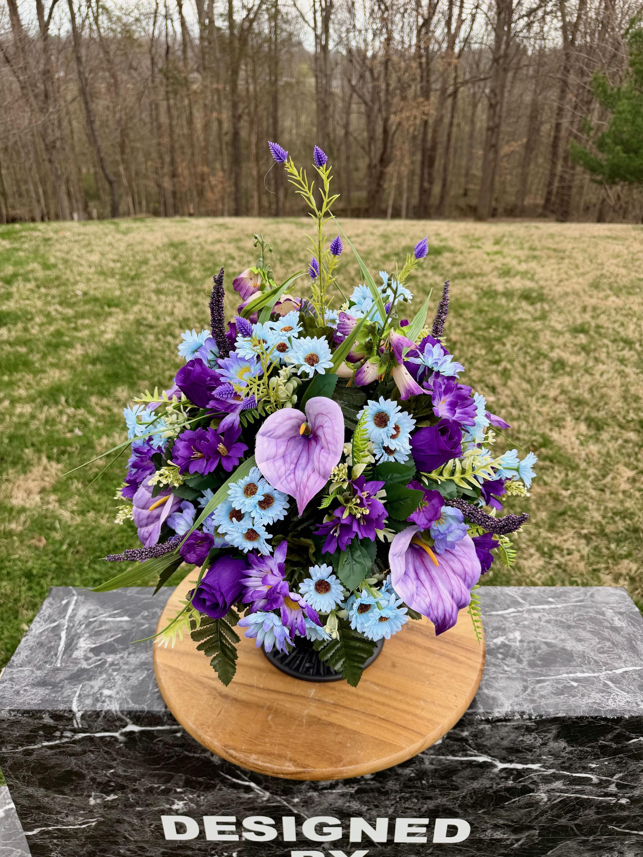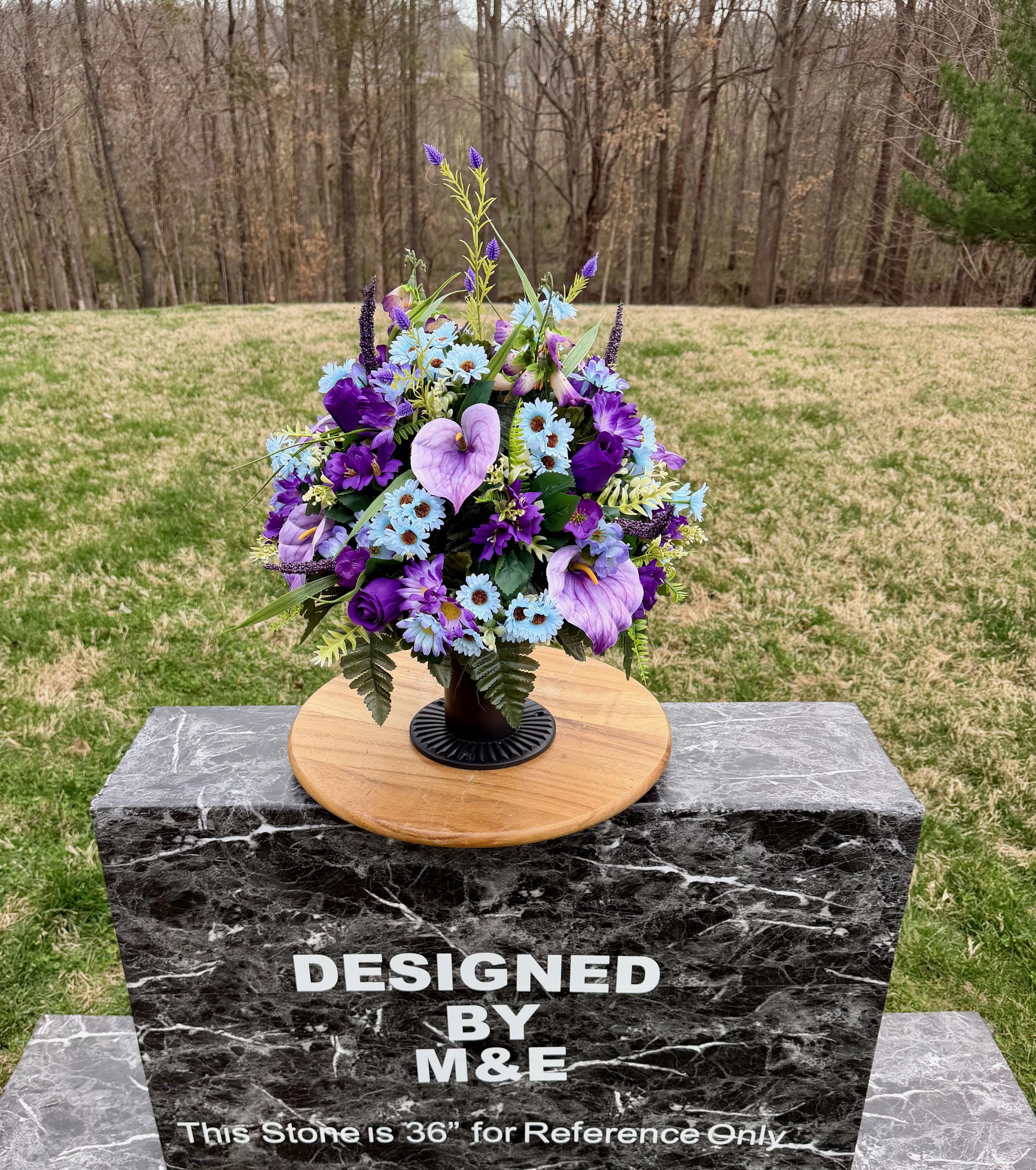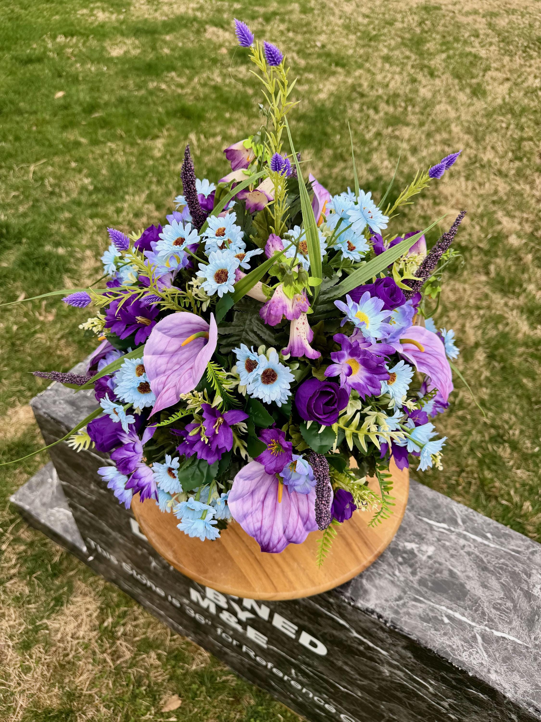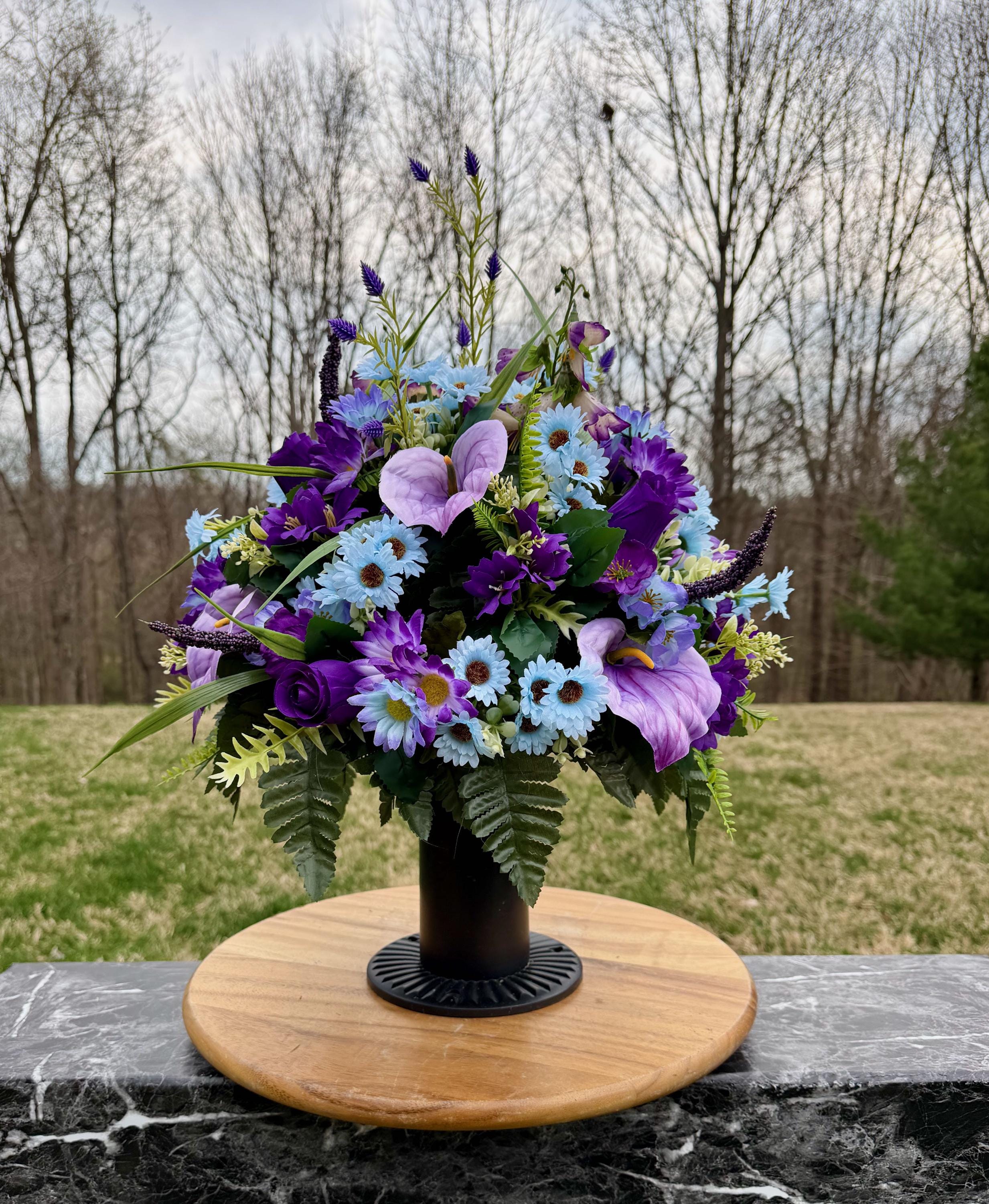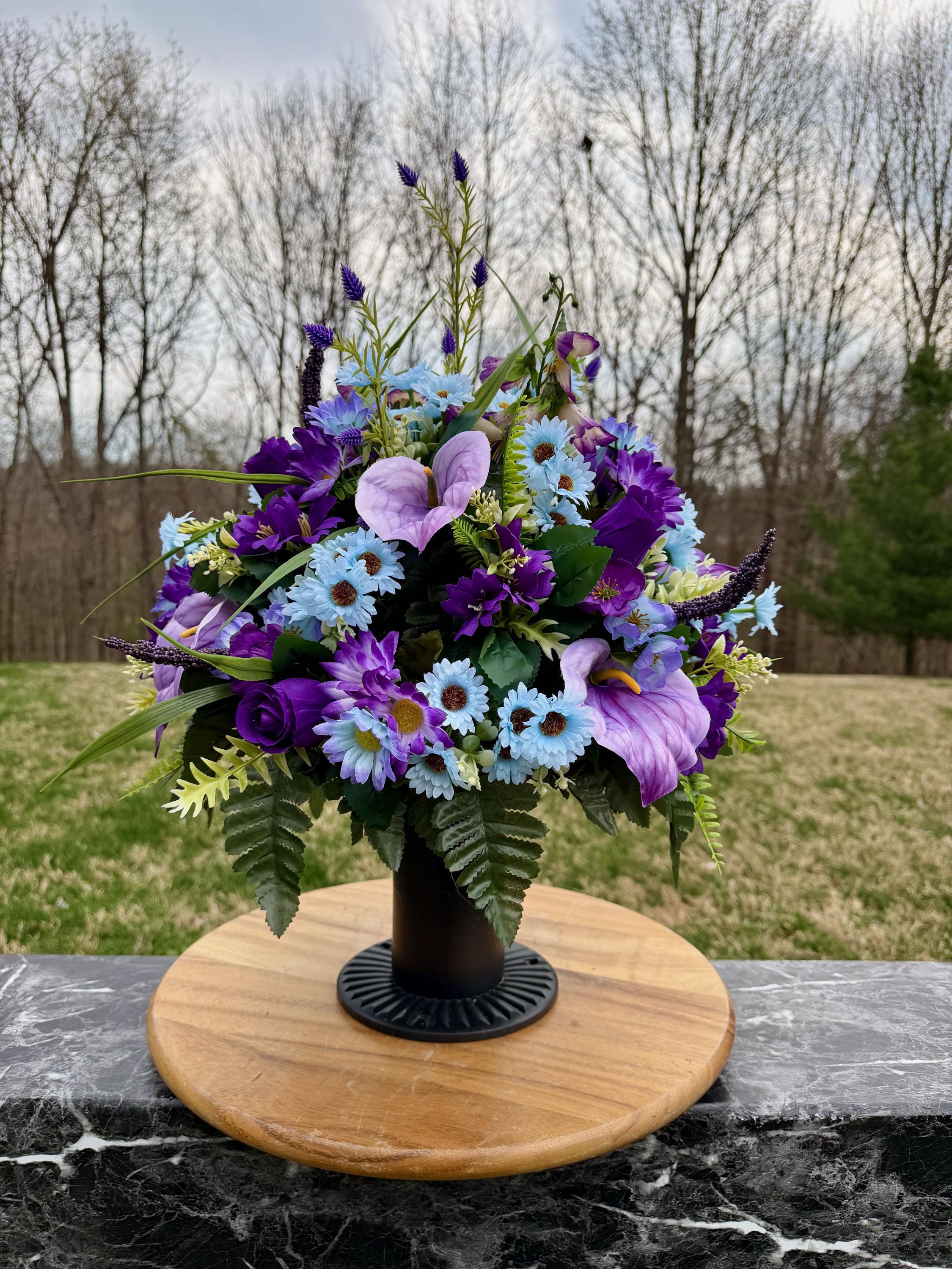 Purple, Violet and Blue Cemetery Vase, Grave Decorations, Memorial Arrangement Flowers