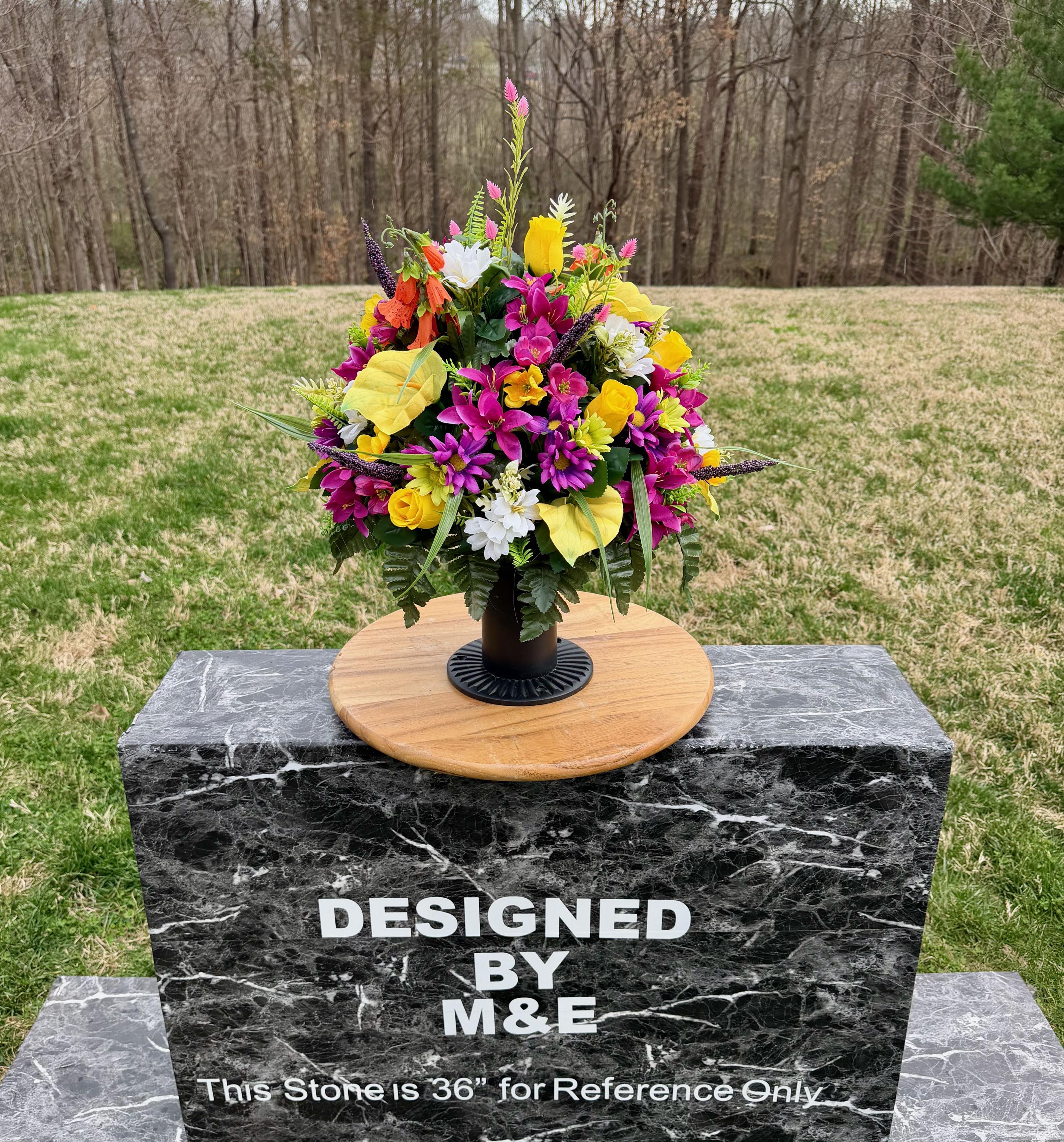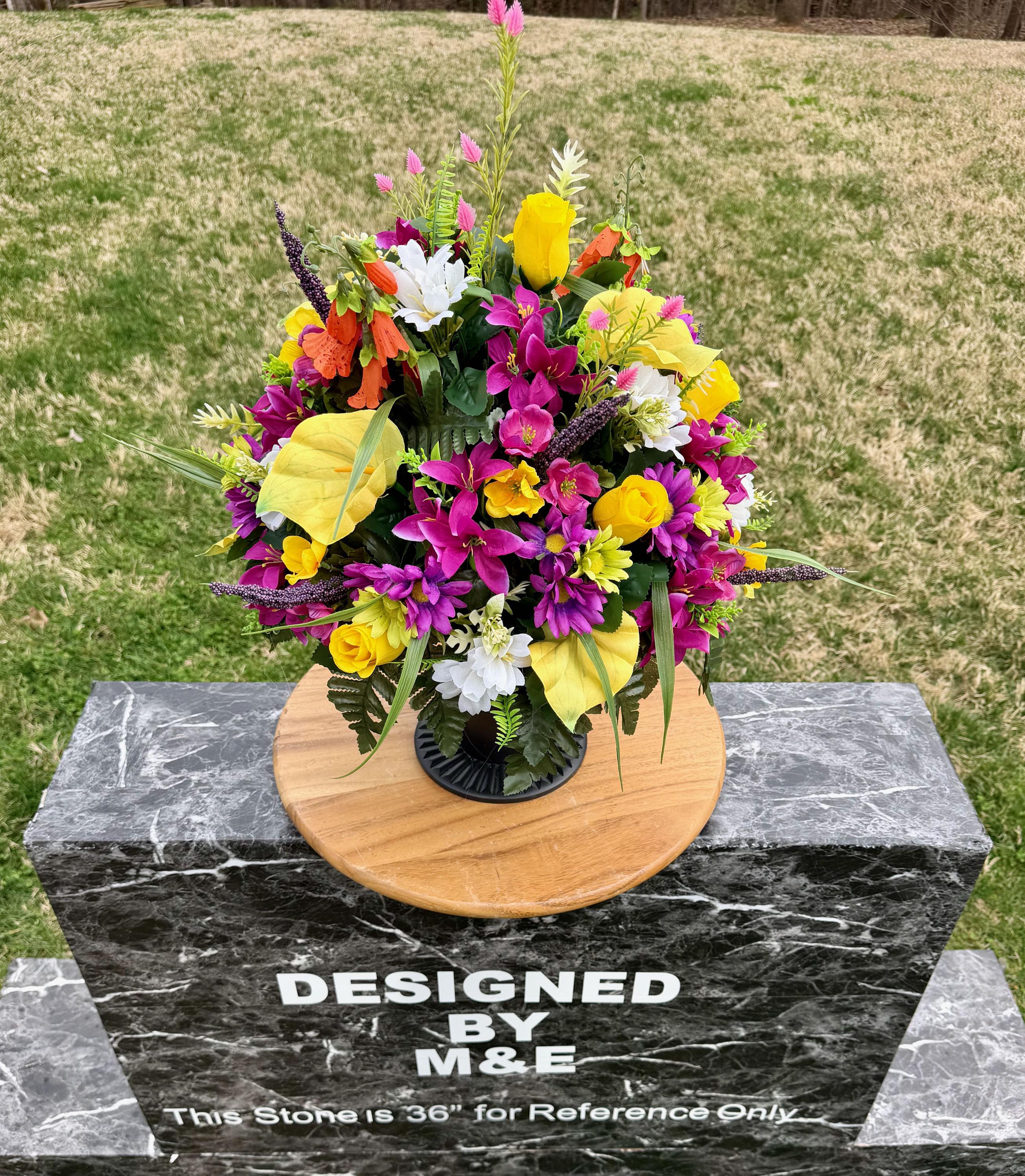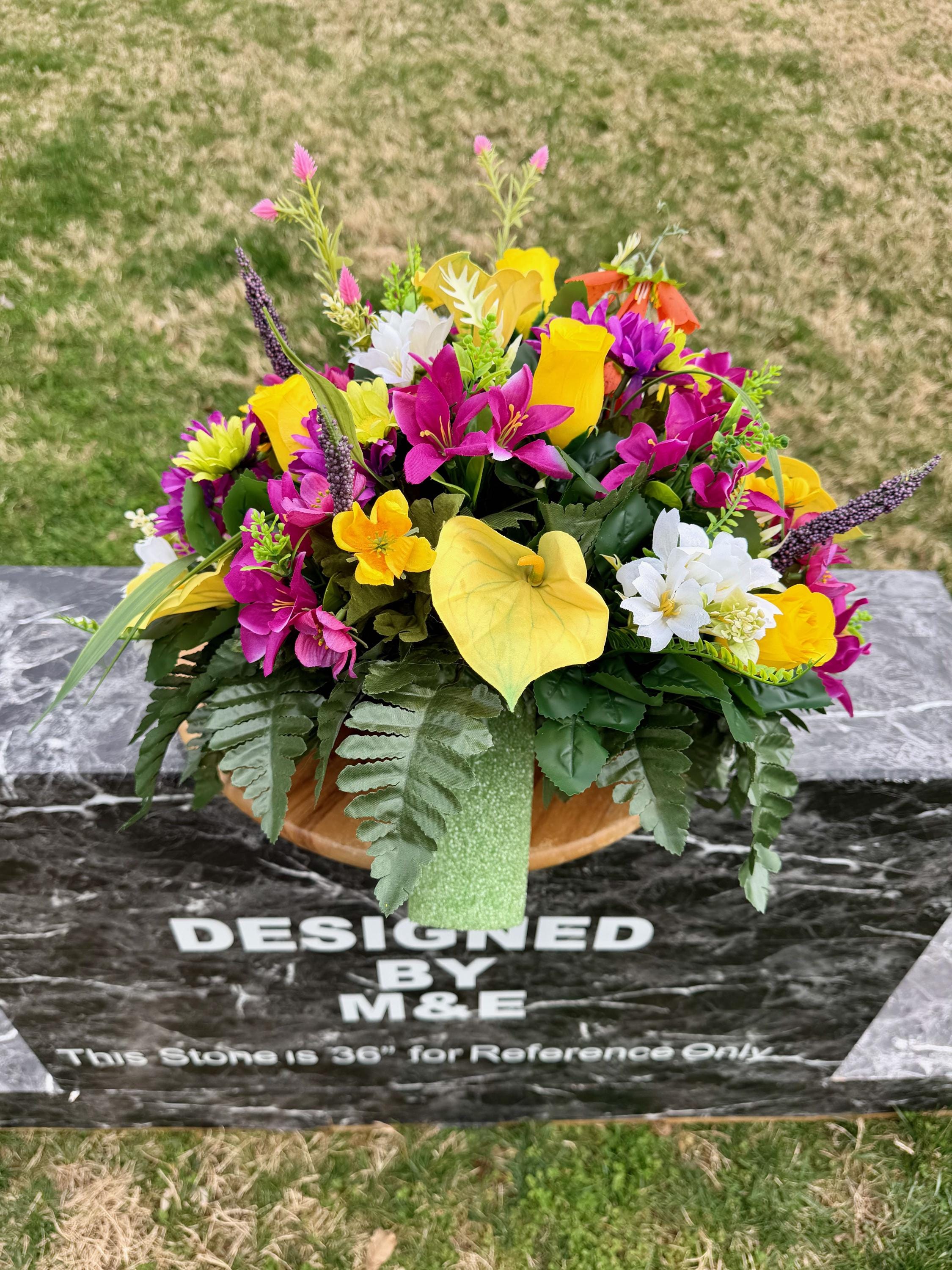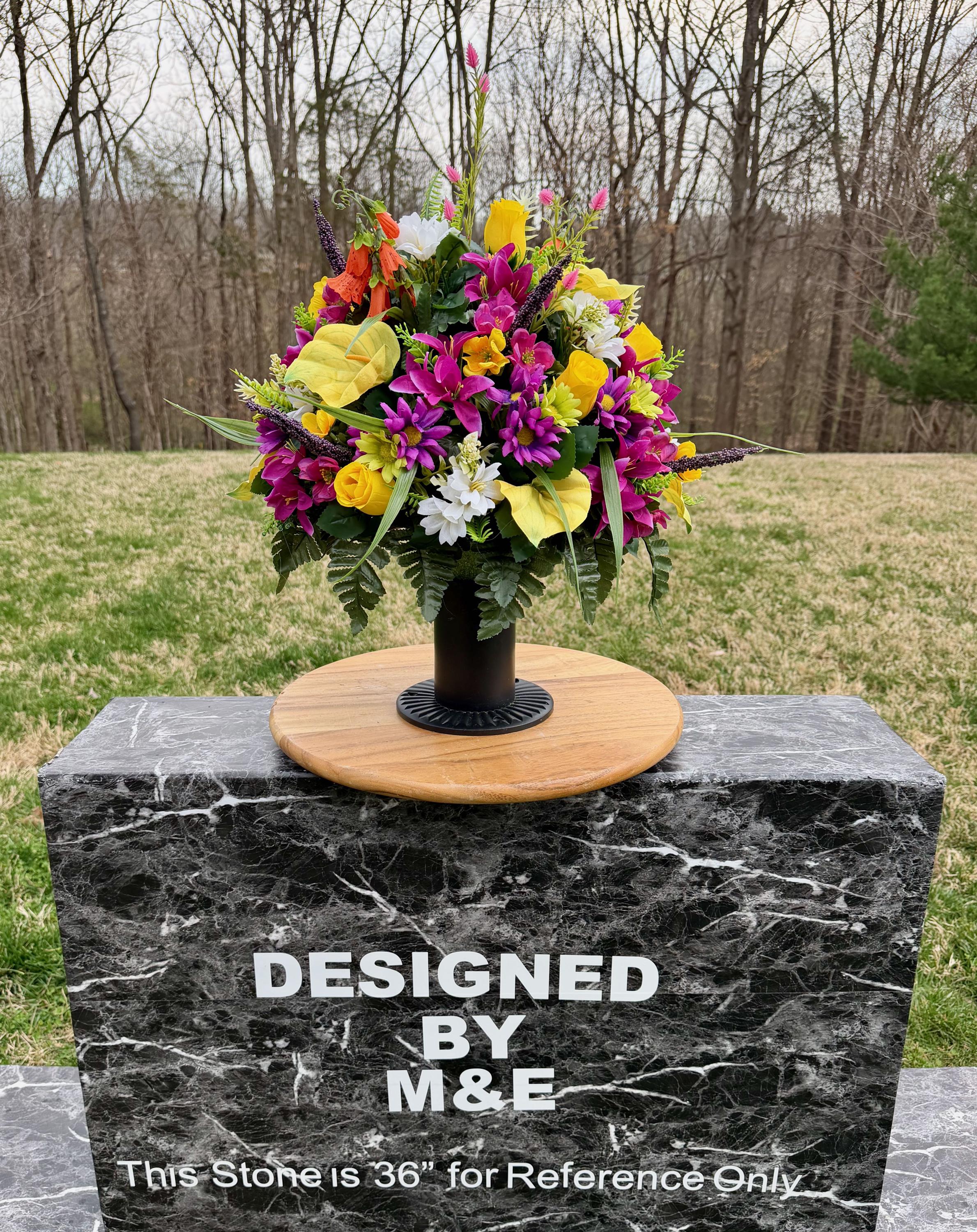 We’re a small, family-operated business consisting of myself, my husband, and my daughter. We personally manage every order and strive for excellent customer service. All our arrangements use high-quality silk flowers, though all silk blooms may fade over time. Each stem is glued into foam to withstand the elements. Designed by M&E uses only premium silks, and we put genuine care into every piece we create. Rest assured, the arrangement shown in our photos is exactly the one you’ll receive, as I design and assemble each one myself. If you’re searching for something unique or have a particular flower, color, or matching vases in mind, please contact me to discuss a custom order.