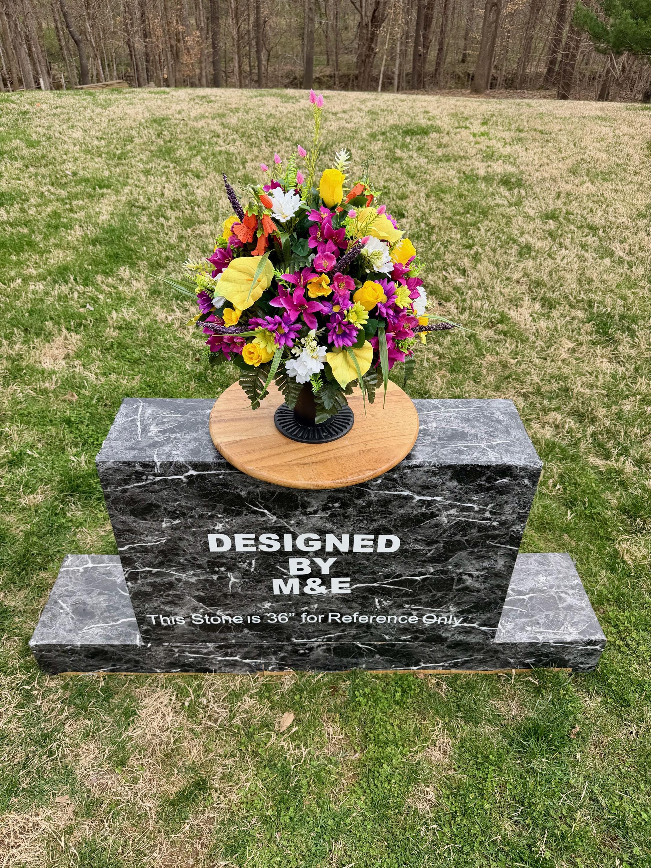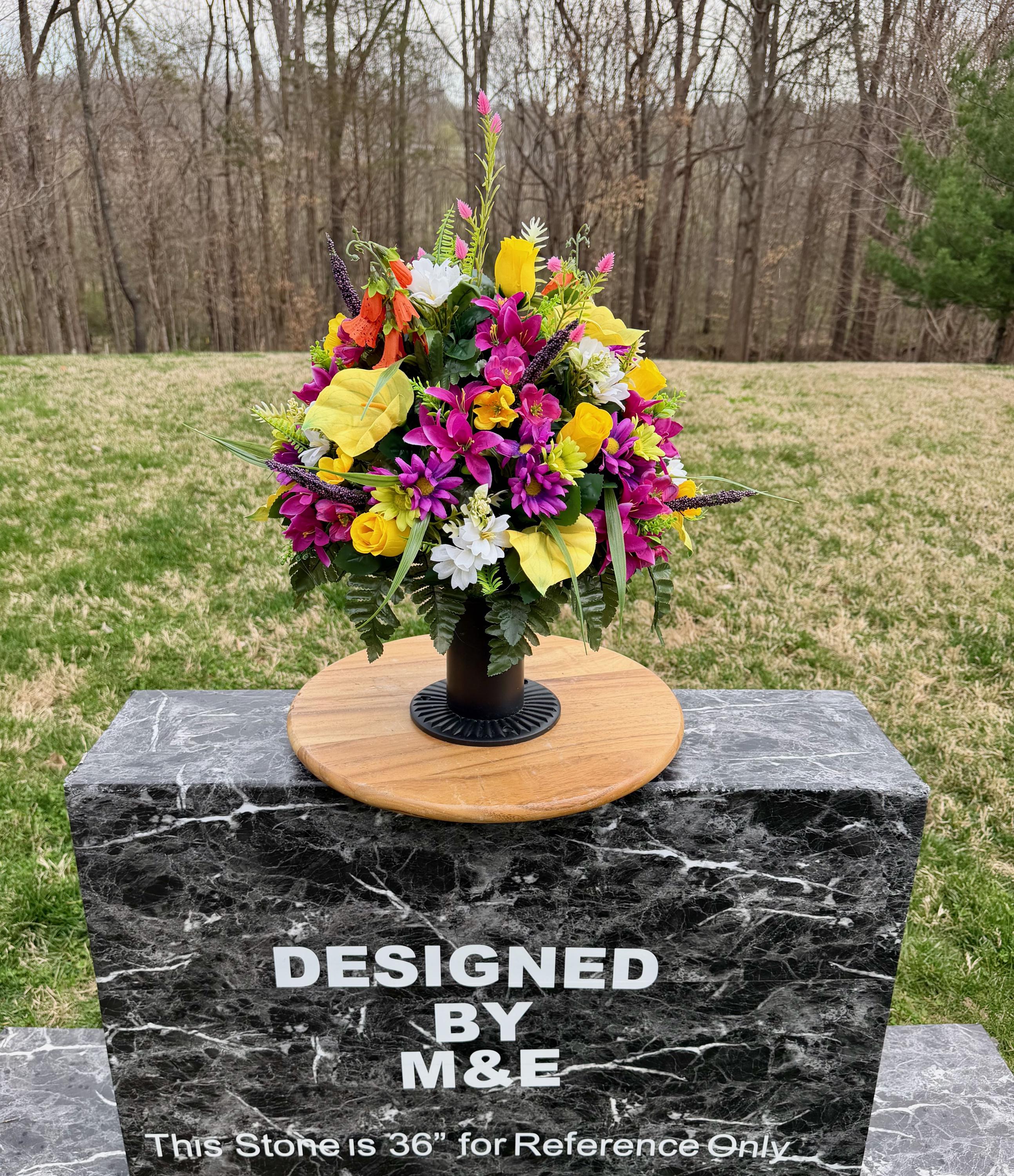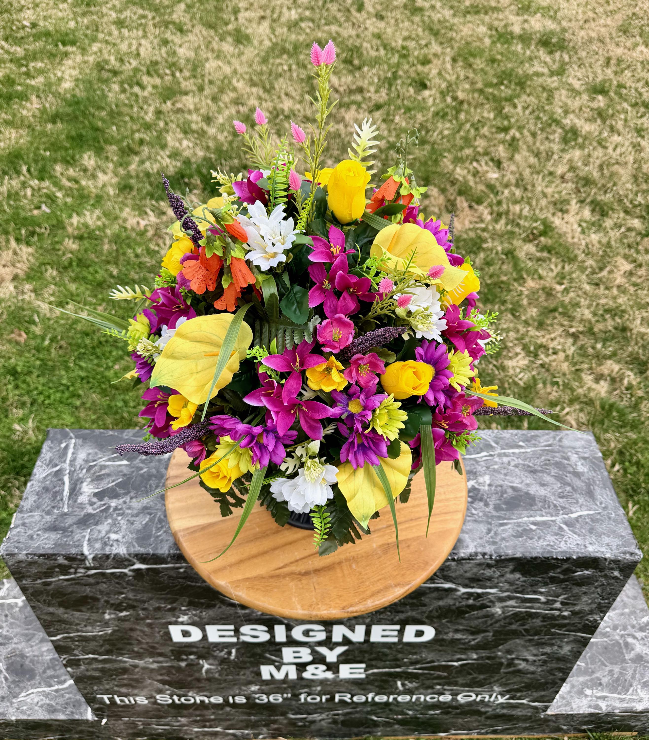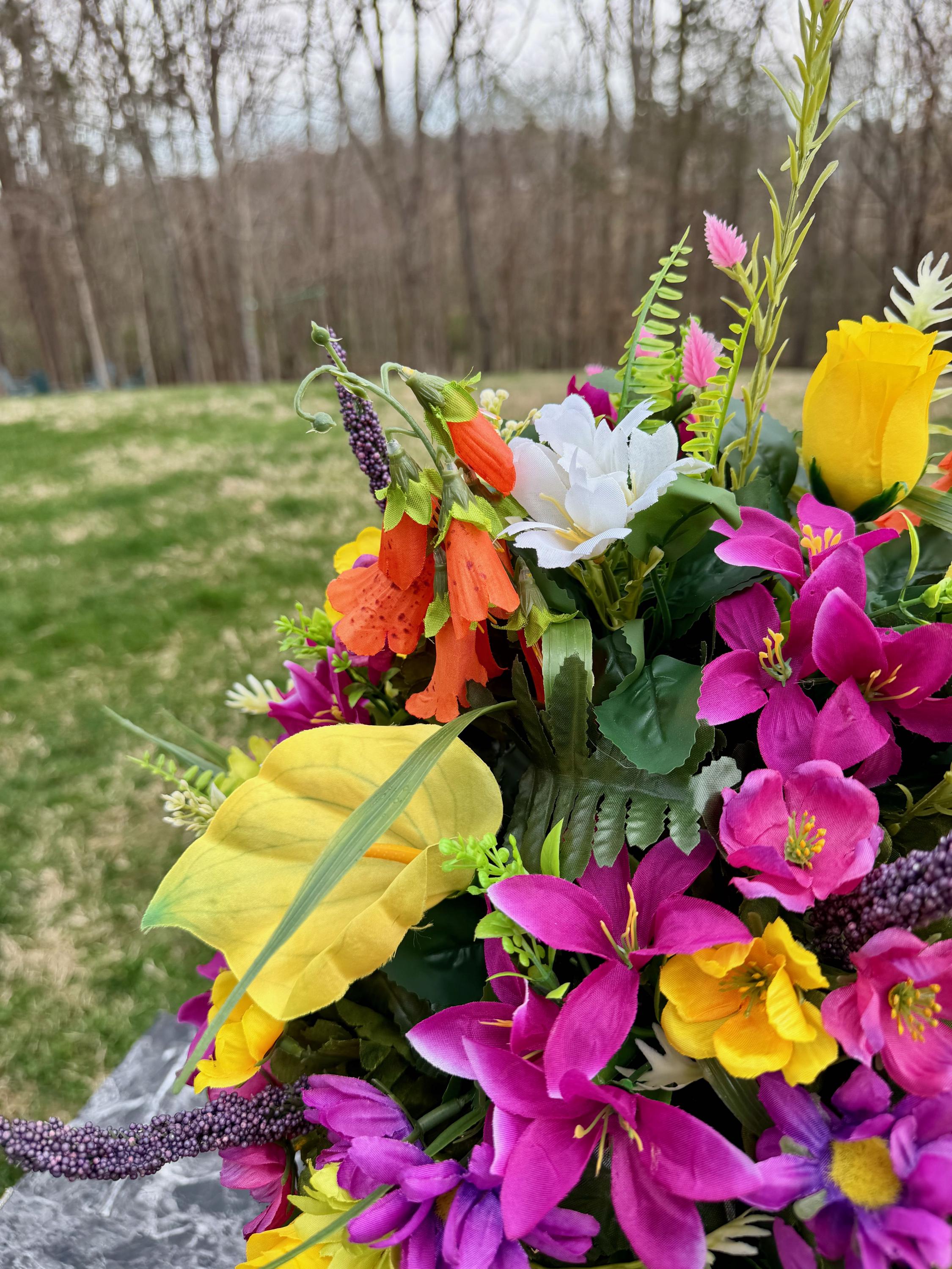 We’re a small, family-operated business consisting of myself, my husband, and my daughter. We personally manage every order and strive for excellent customer service. All our arrangements use high-quality silk flowers, though all silk blooms may fade over time. Each stem is glued into foam to withstand the elements. Designed by M&E uses only premium silks, and we put genuine care into every piece we create. Rest assured, the arrangement shown in our photos is exactly the one you’ll receive, as I design and assemble each one myself. If you’re searching for something unique or have a particular flower, color, or matching vases in mind, please contact me to discuss a custom order.