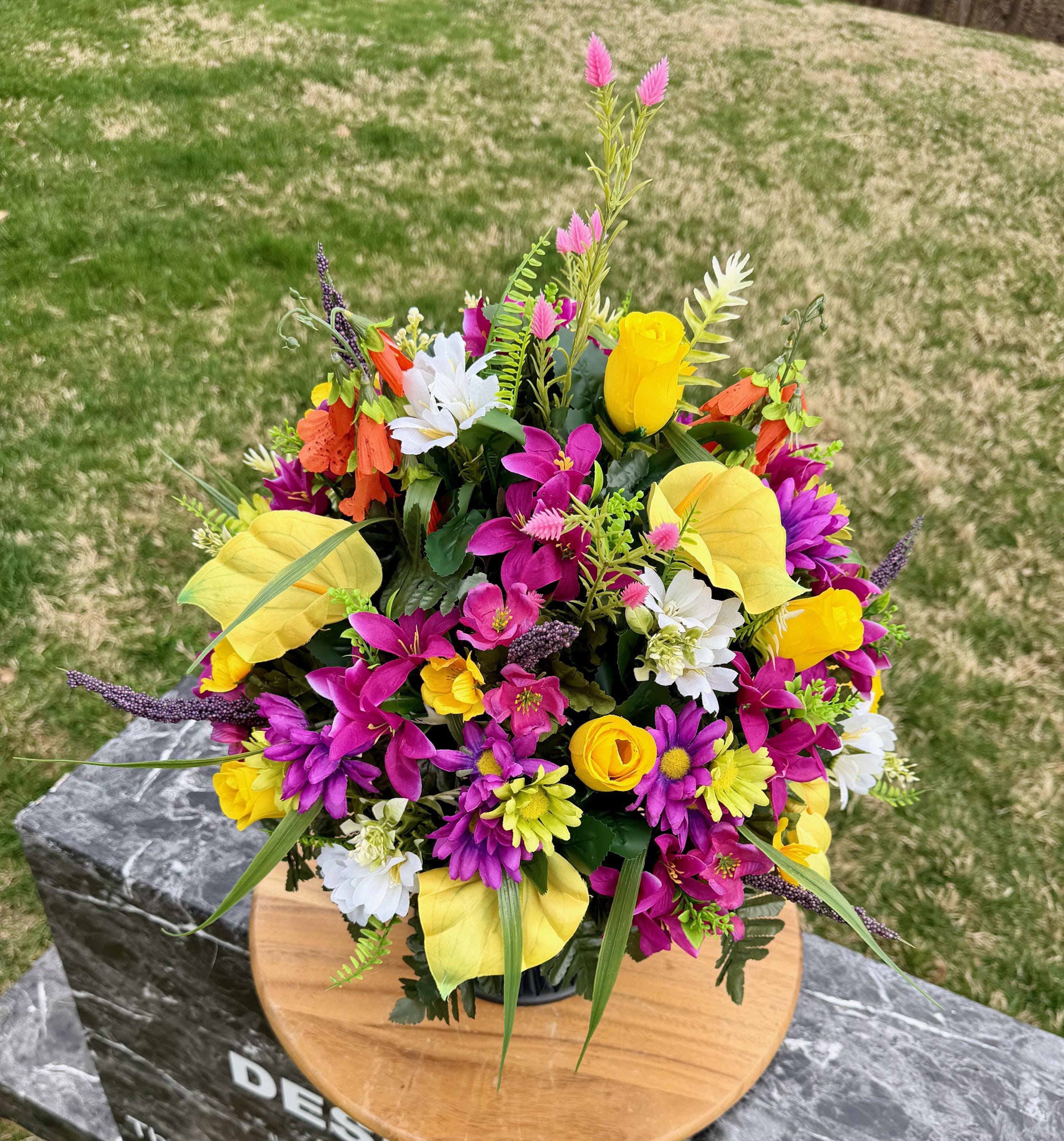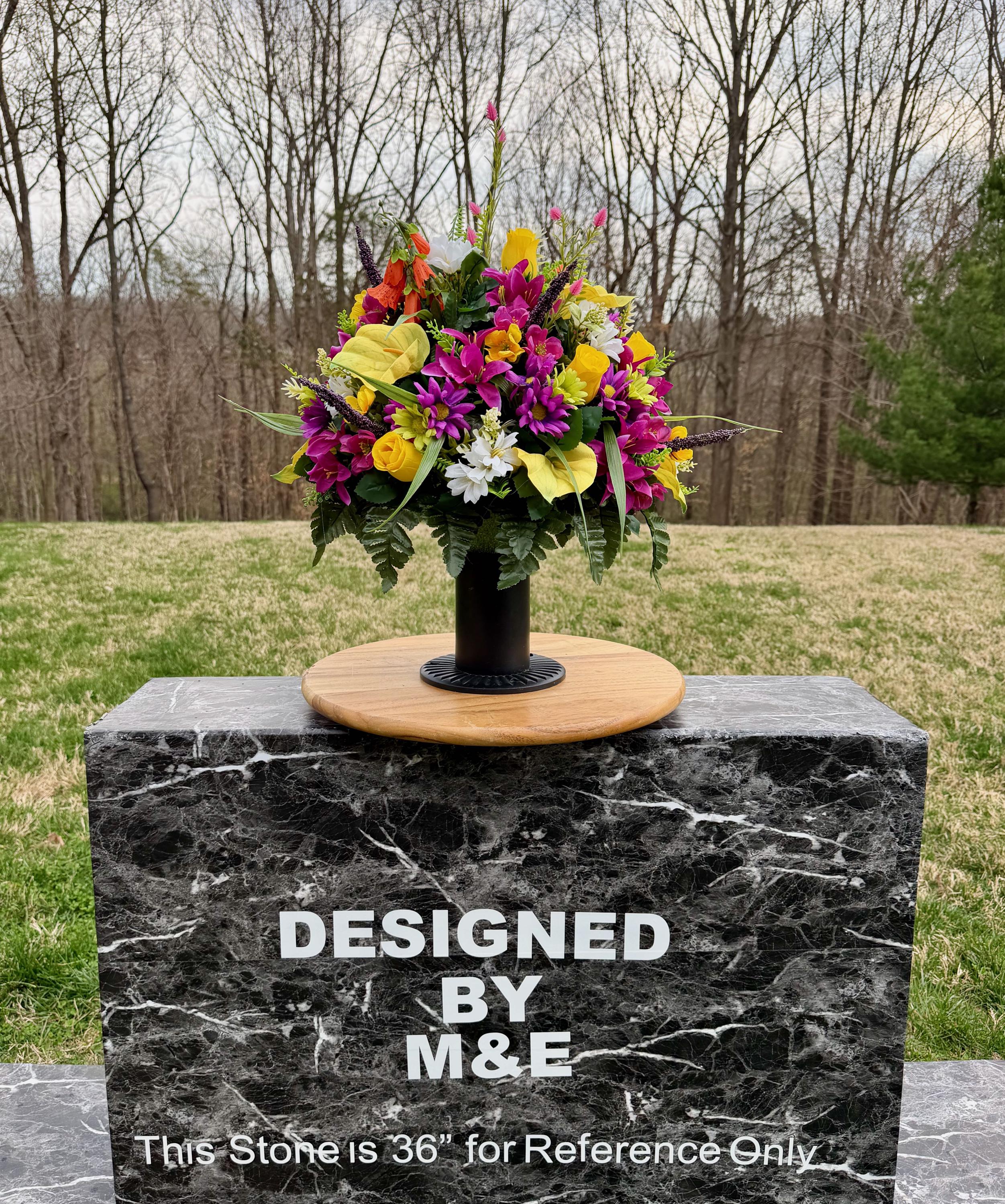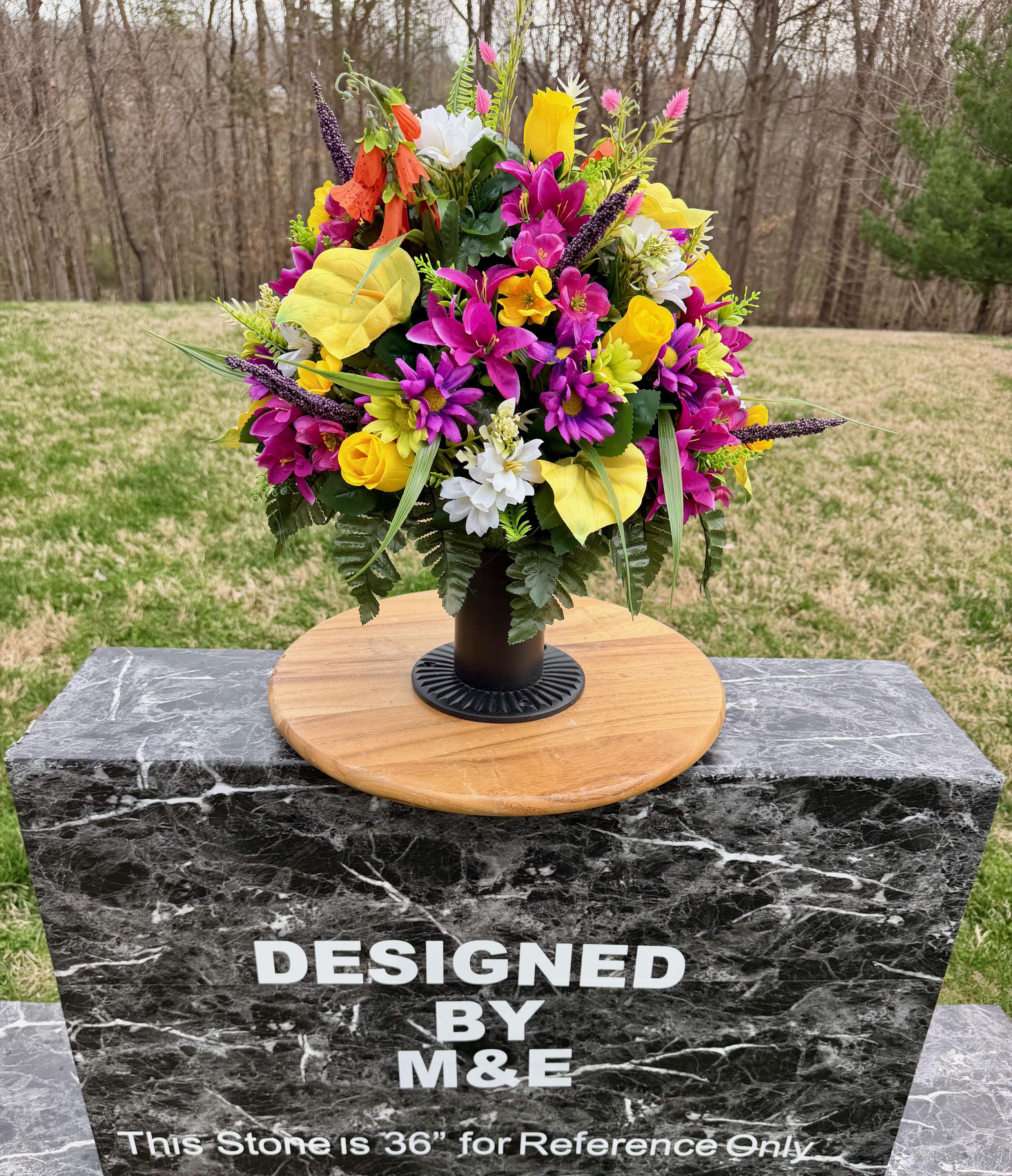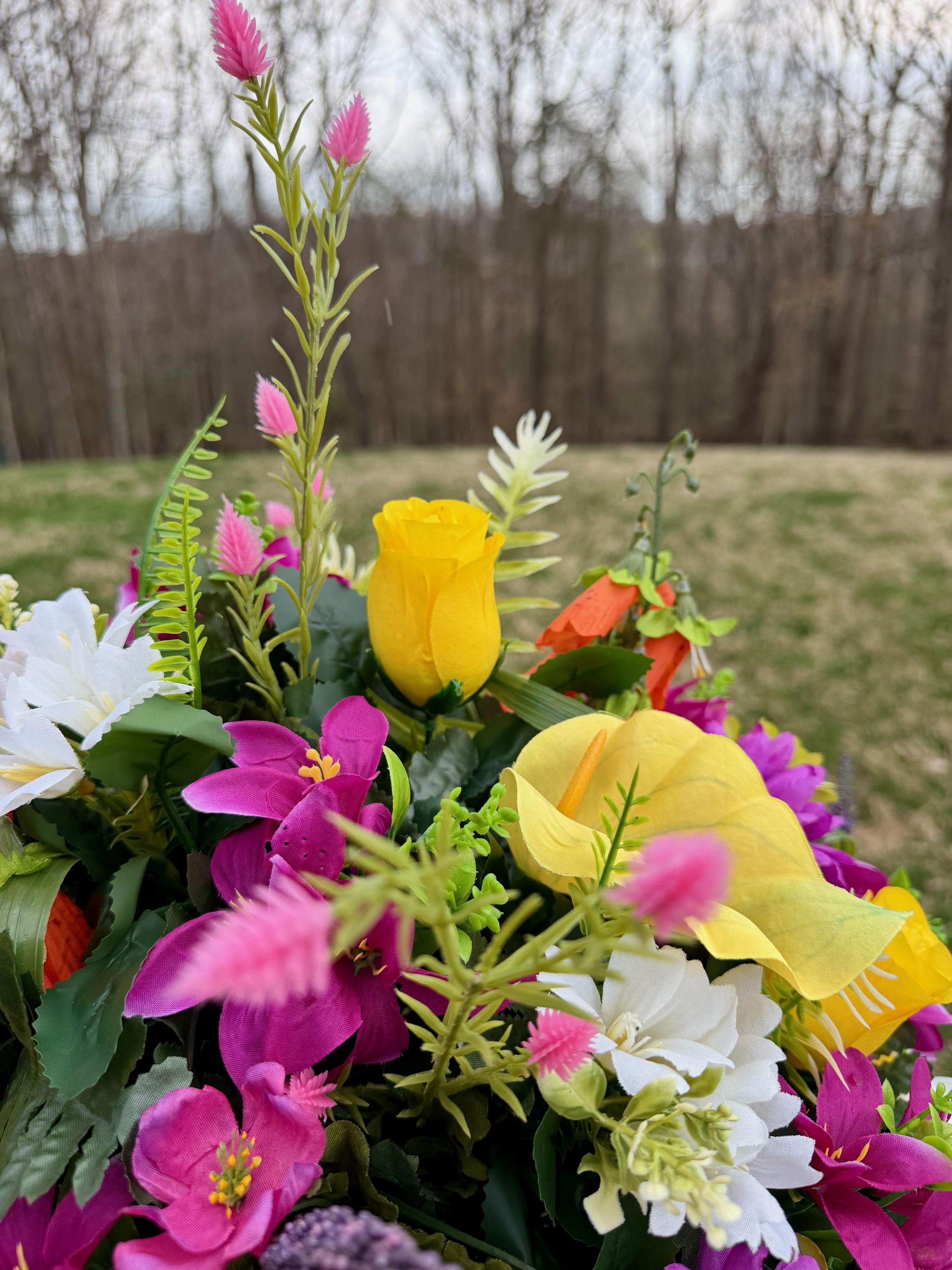 We’re a small, family-operated business consisting of myself, my husband, and my daughter. We personally manage every order and strive for excellent customer service. All our arrangements use high-quality silk flowers, though all silk blooms may fade over time. Each stem is glued into foam to withstand the elements. Designed by M&E uses only premium silks, and we put genuine care into every piece we create. Rest assured, the arrangement shown in our photos is exactly the one you’ll receive, as I design and assemble each one myself. If you’re searching for something unique or have a particular flower, color, or matching vases in mind, please contact me to discuss a custom order.