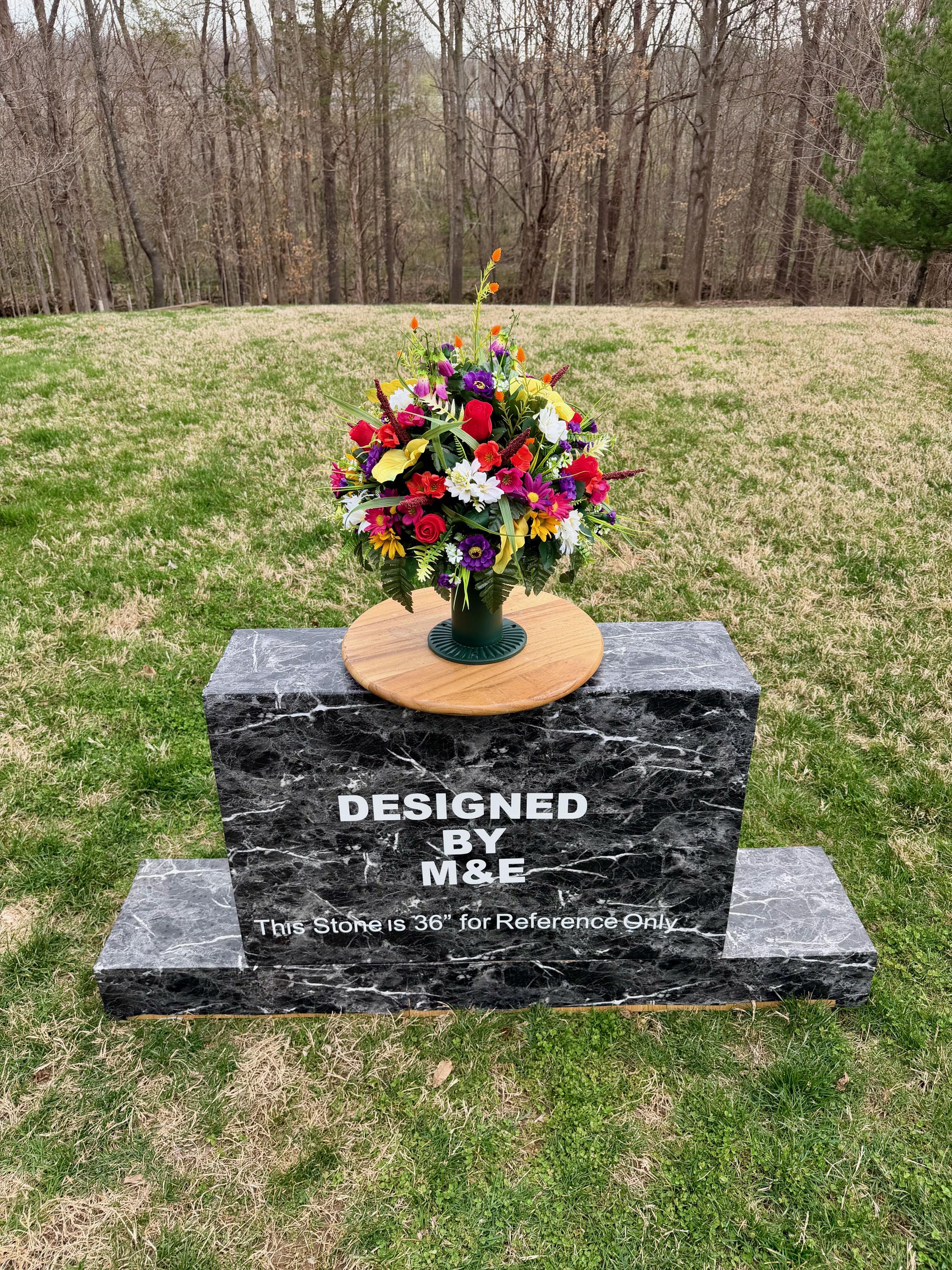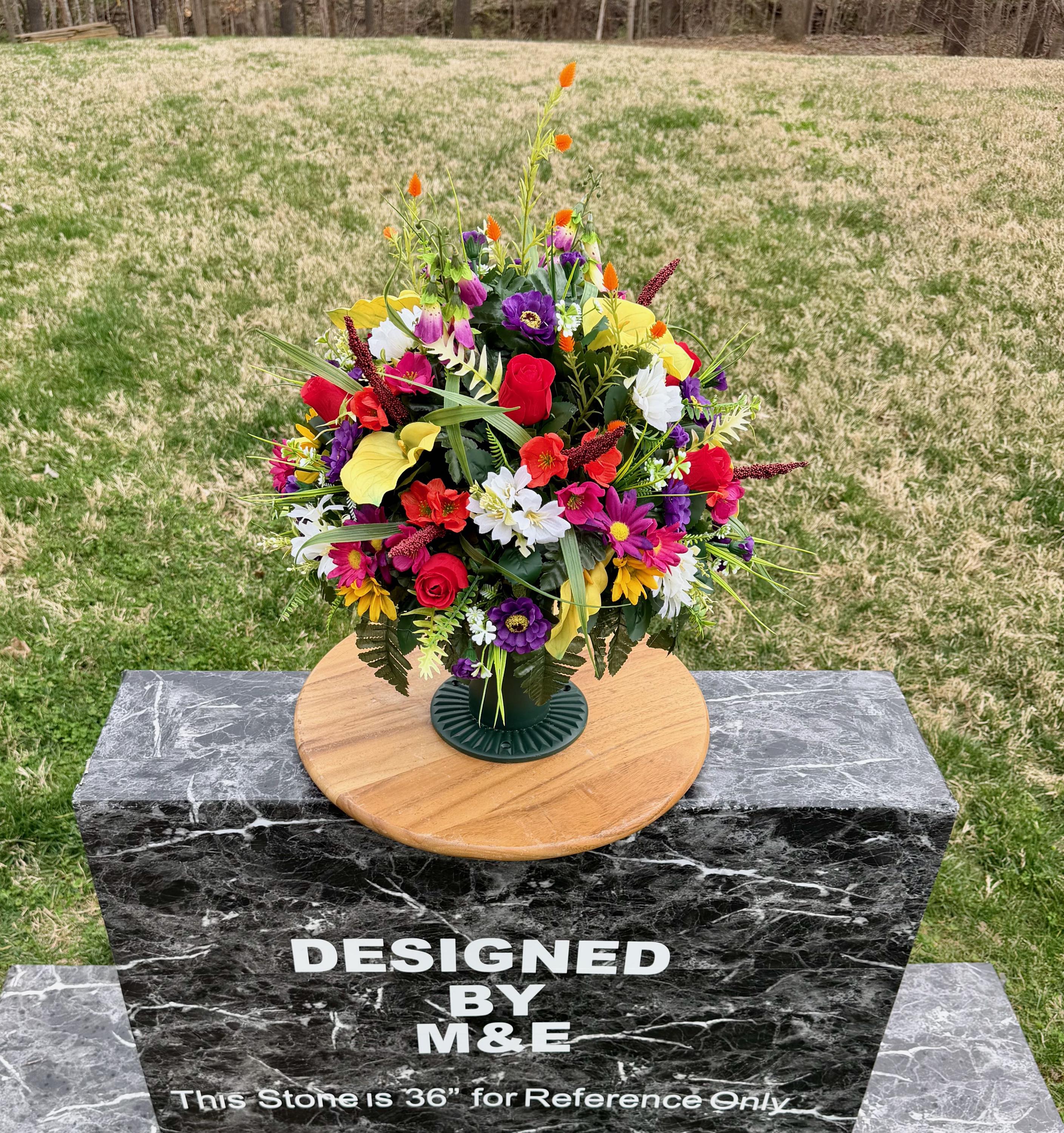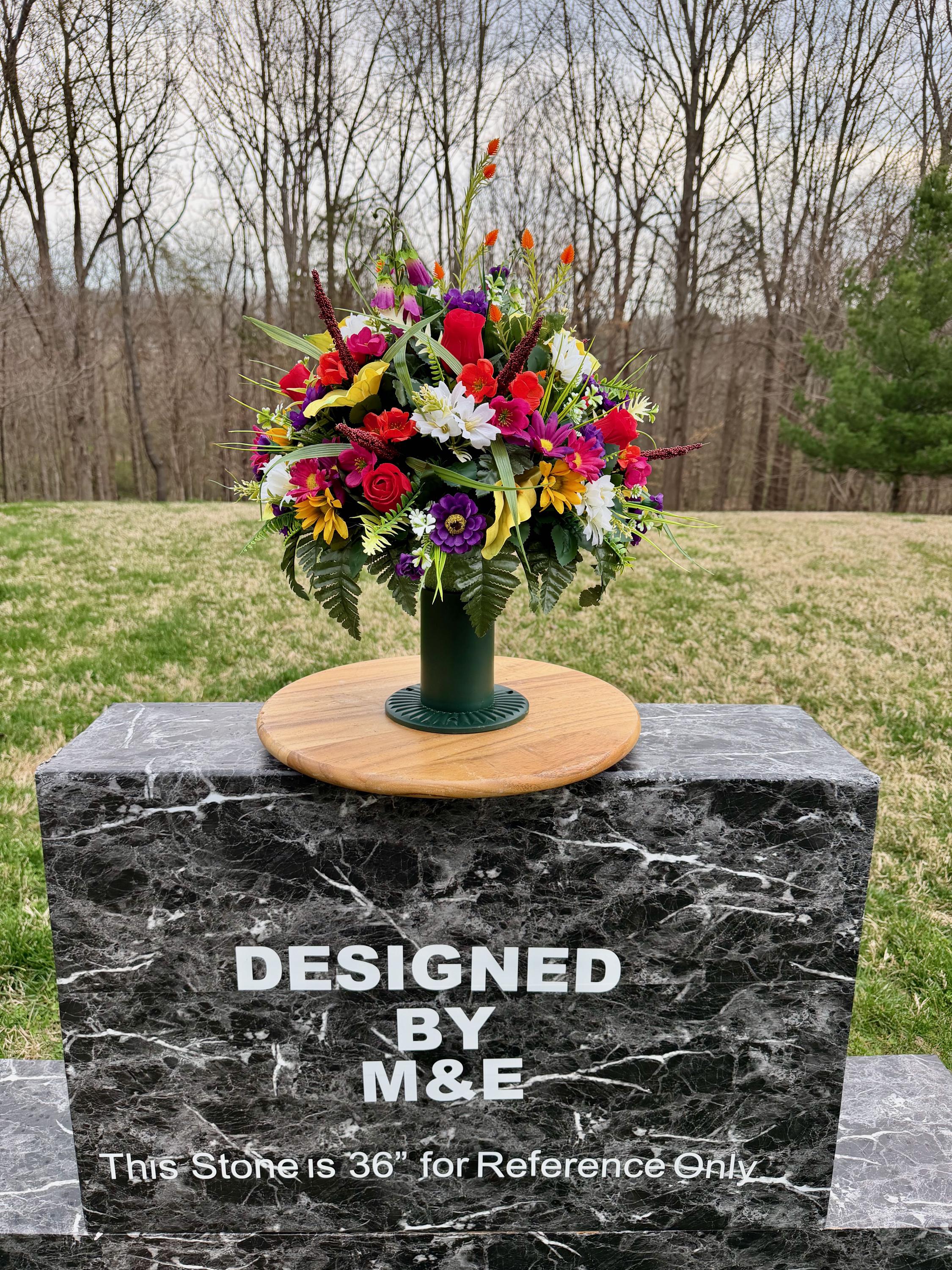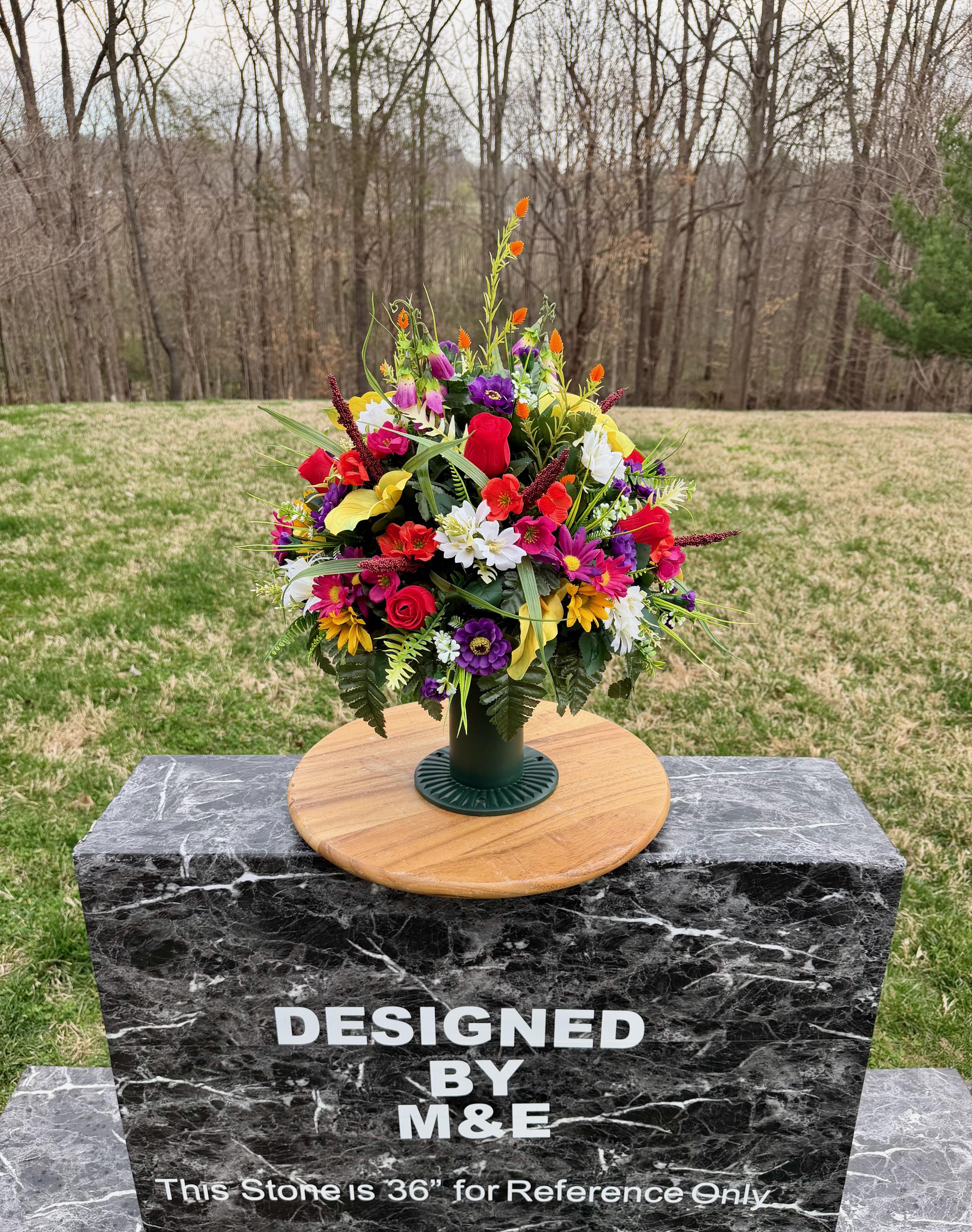 We’re a small, family-operated business consisting of myself, my husband, and my daughter. We personally manage every order and strive for excellent customer service. All our arrangements use high-quality silk flowers, though all silk blooms may fade over time. Each stem is glued into foam to withstand the elements. Designed by M&E uses only premium silks, and we put genuine care into every piece we create. Rest assured, the arrangement shown in our photos is exactly the one you’ll receive, as I design and assemble each one myself. If you’re searching for something unique or have a particular flower, color, or matching vases in mind, please contact me to discuss a custom order.