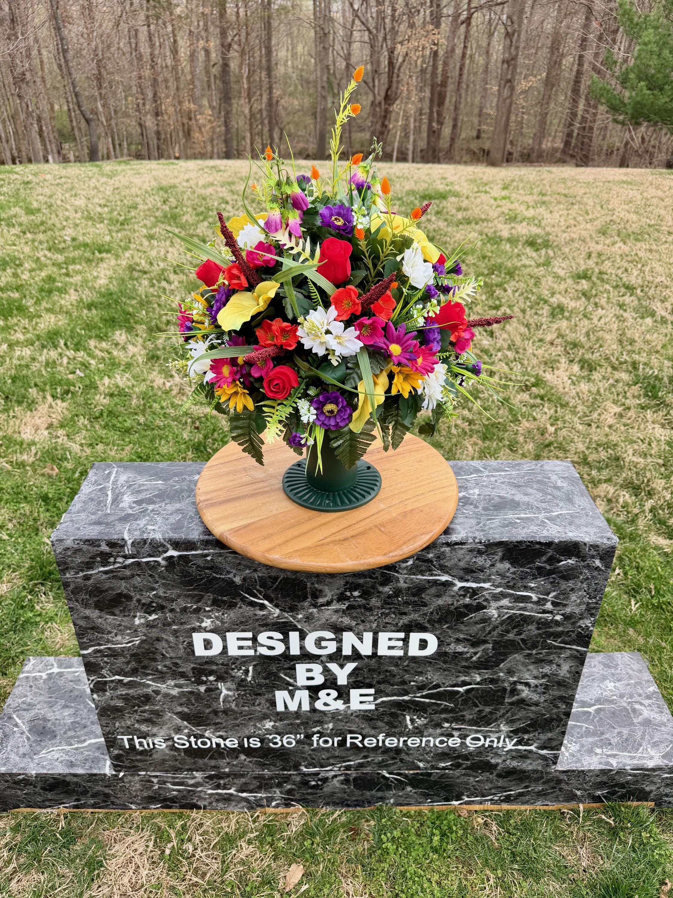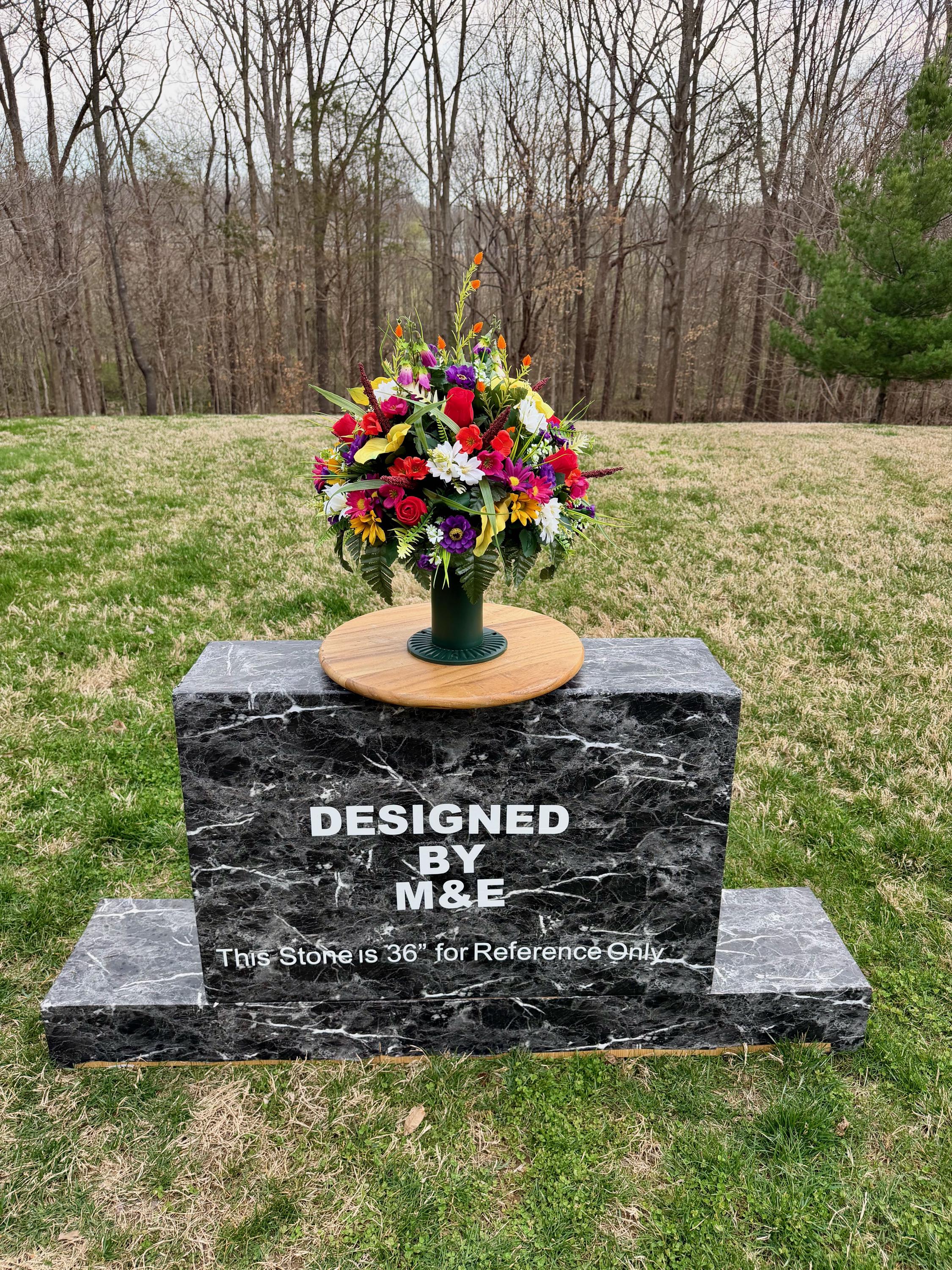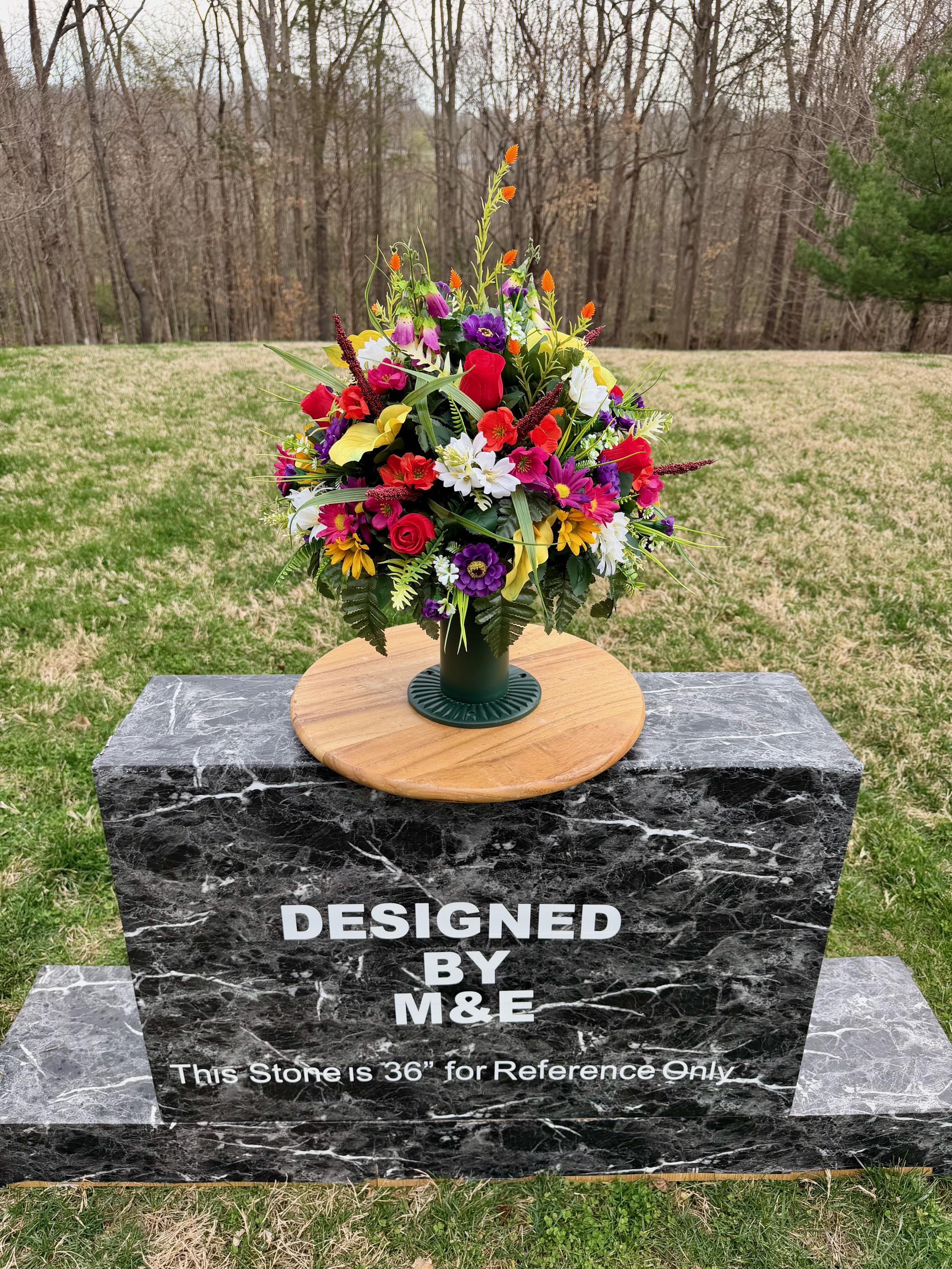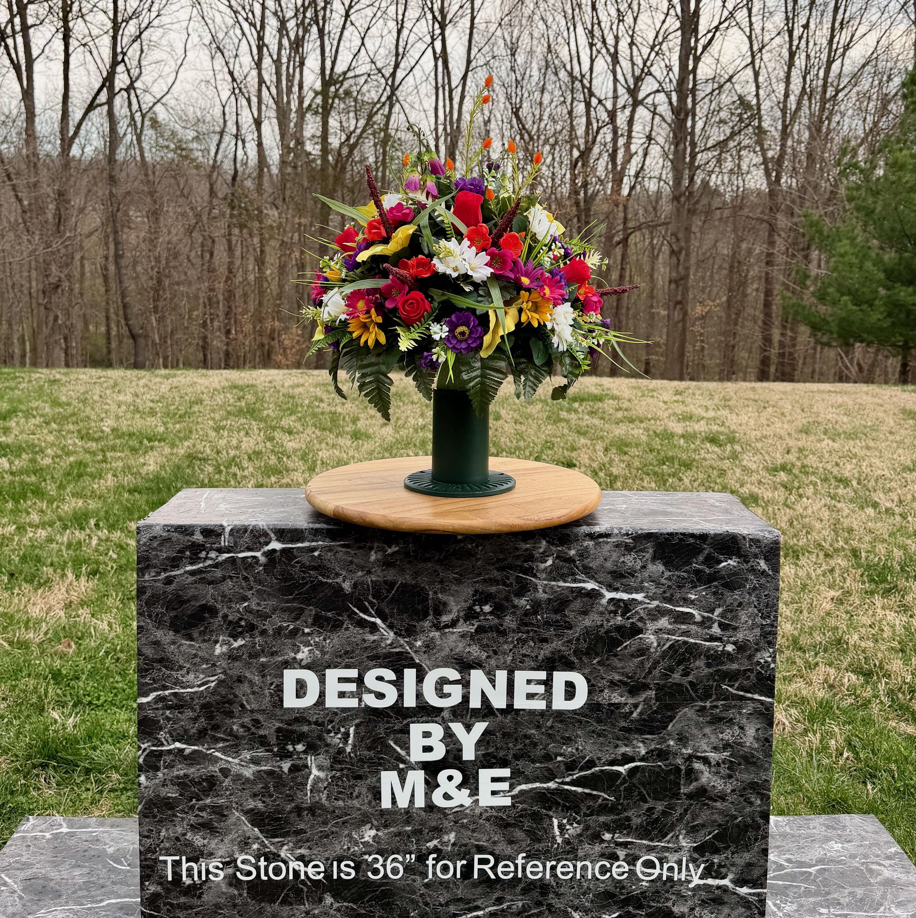 We’re a small, family-operated business consisting of myself, my husband, and my daughter. We personally manage every order and strive for excellent customer service. All our arrangements use high-quality silk flowers, though all silk blooms may fade over time. Each stem is glued into foam to withstand the elements. Designed by M&E uses only premium silks, and we put genuine care into every piece we create. Rest assured, the arrangement shown in our photos is exactly the one you’ll receive, as I design and assemble each one myself. If you’re searching for something unique or have a particular flower, color, or matching vases in mind, please contact me to discuss a custom order.
