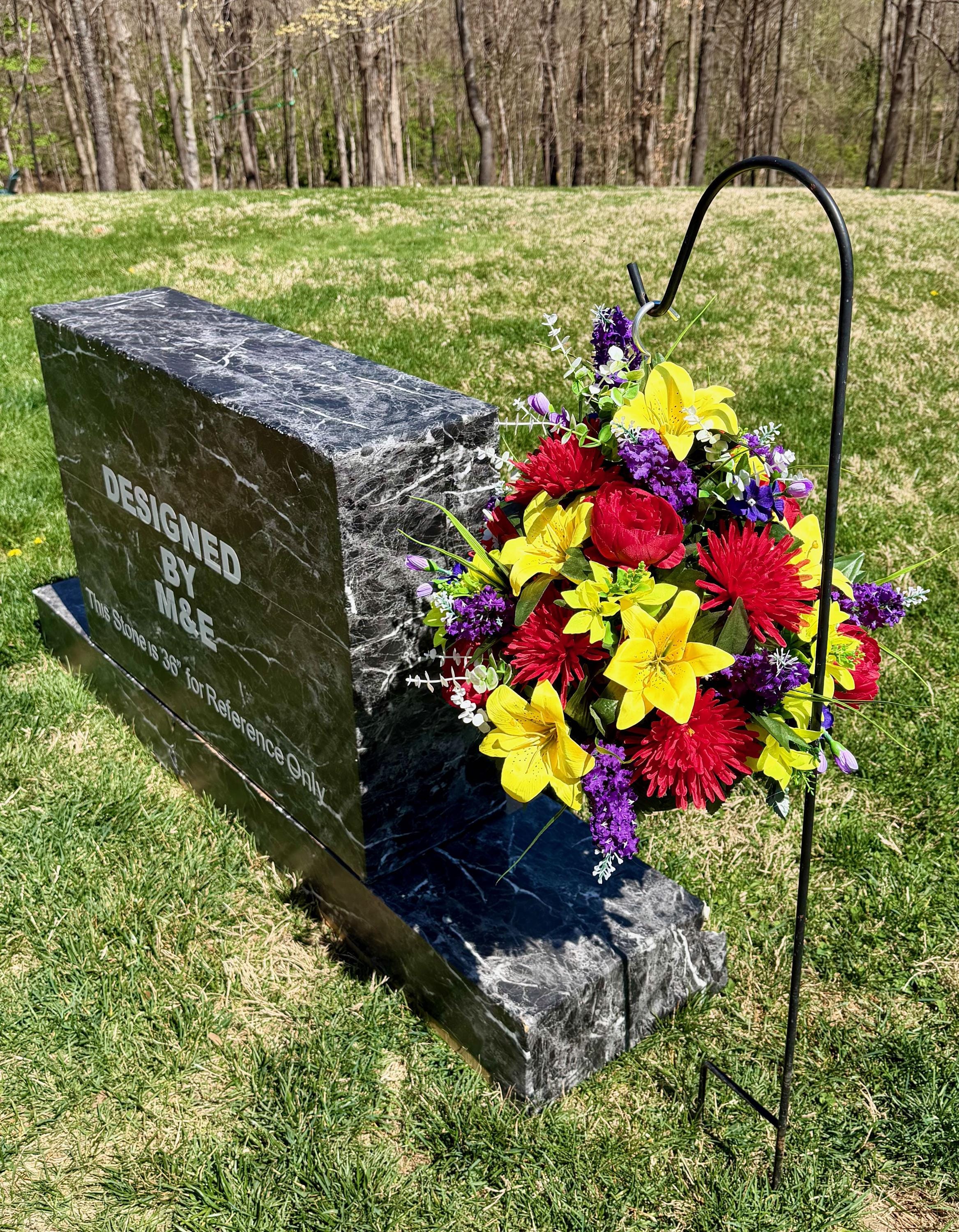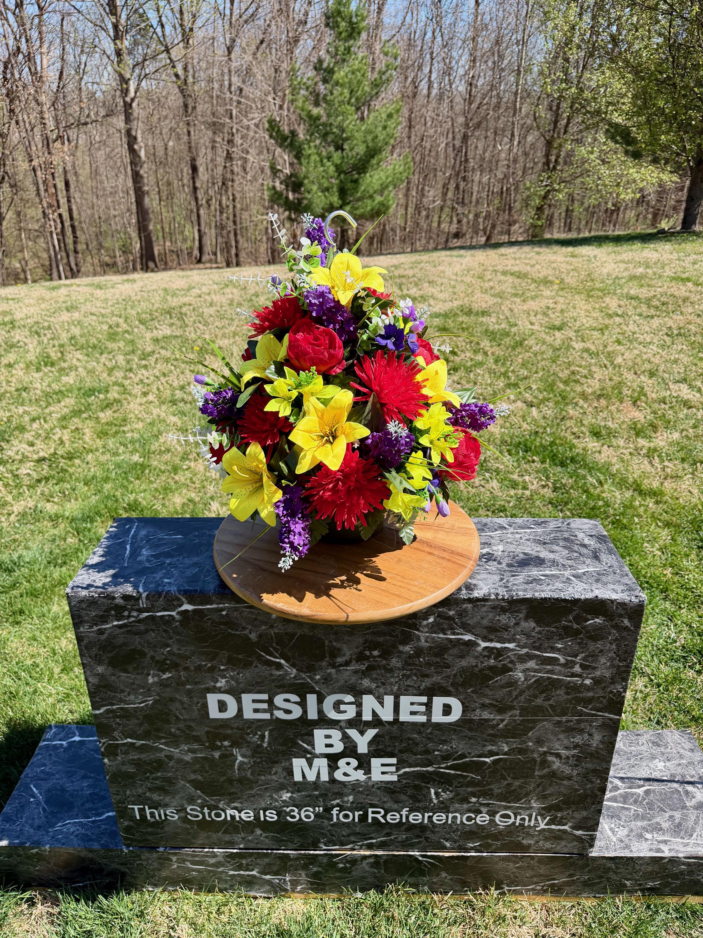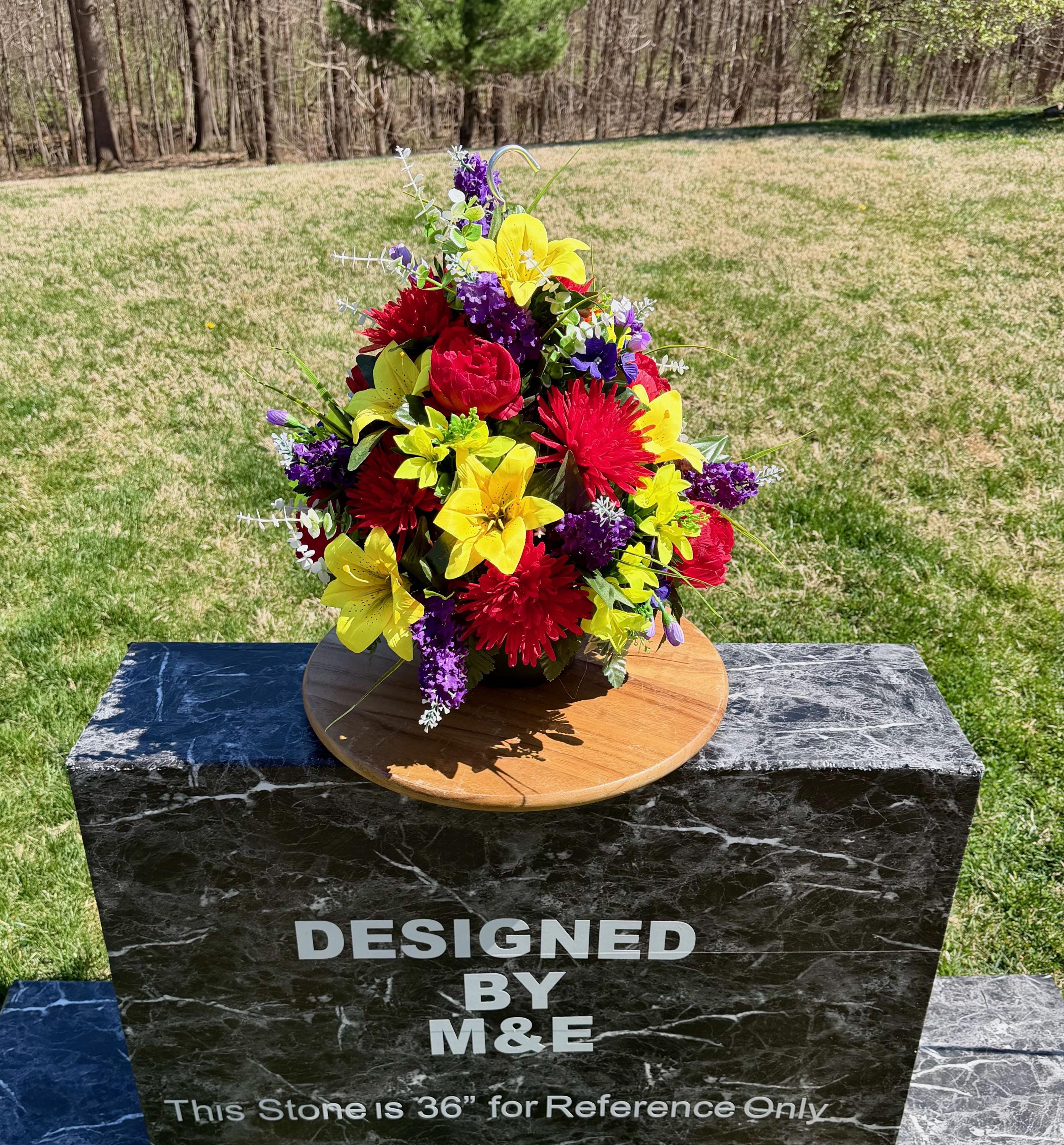 We’re a small, family-operated business consisting of myself, my husband, and my daughter. We personally manage every order and strive for excellent customer service. All our arrangements use high-quality silk flowers, though all silk blooms may fade over time. Each stem is glued into foam to withstand the elements. Designed by M&E uses only premium silks, and we put genuine care into every piece we create. Rest assured, the arrangement shown in our photos is exactly the one you’ll receive, as I design and assemble each one myself. If you’re searching for something unique or have a particular flower, color, or matching vases in mind, please contact me to discuss a custom order.