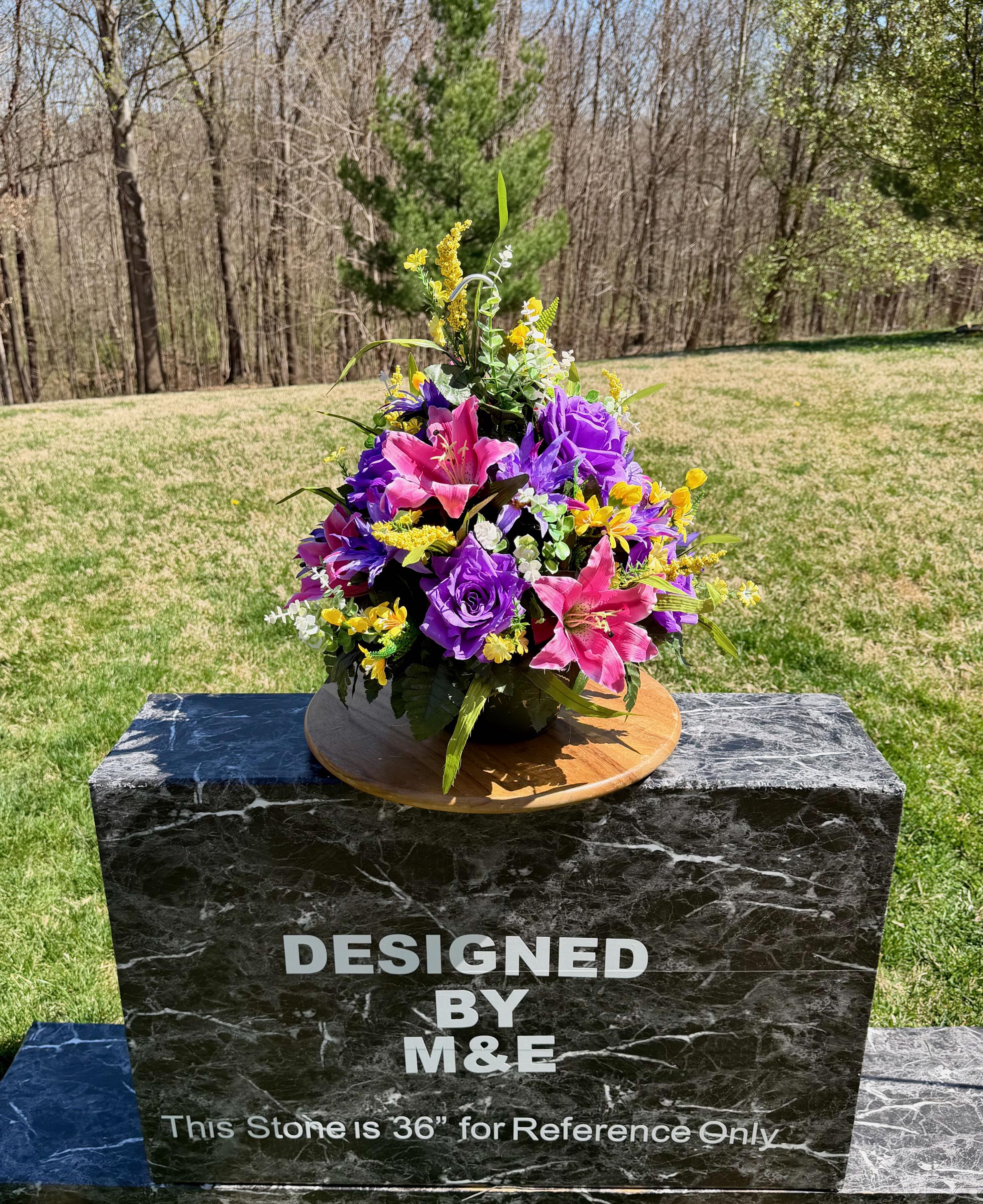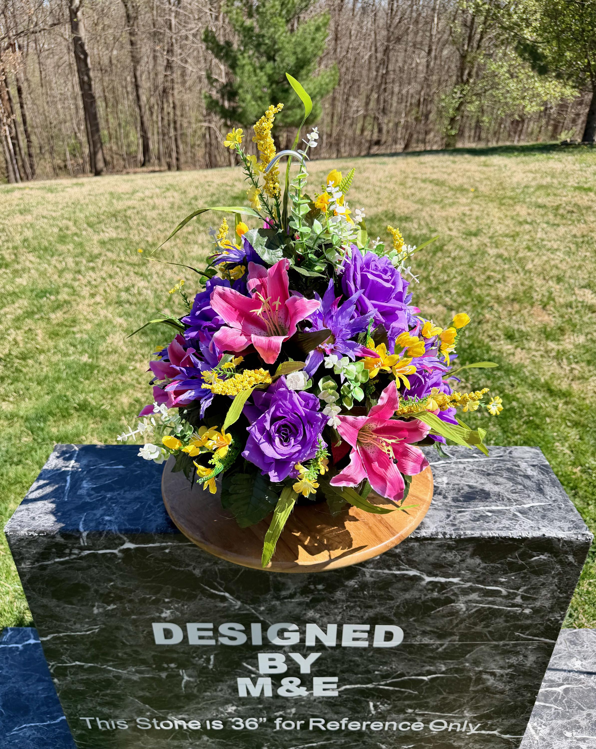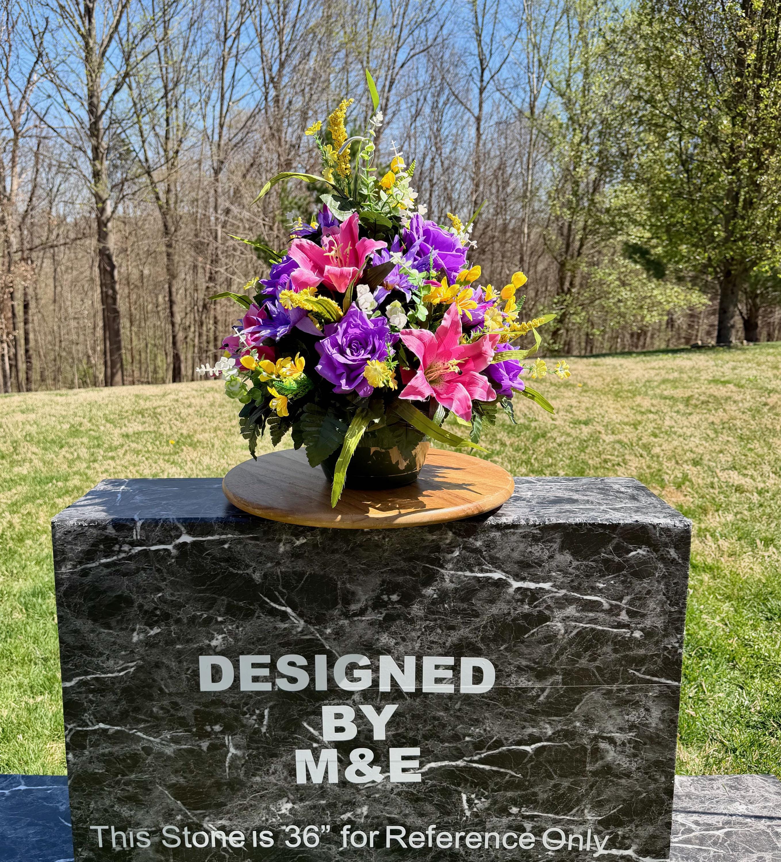 We’re a small, family-operated business consisting of myself, my husband, and my daughter. We personally manage every order and strive for excellent customer service. All our arrangements use high-quality silk flowers, though all silk blooms may fade over time. Each stem is glued into foam to withstand the elements. Designed by M&E uses only premium silks, and we put genuine care into every piece we create. Rest assured, the arrangement shown in our photos is exactly the one you’ll receive, as I design and assemble each one myself. If you’re searching for something unique or have a particular flower, color, or matching vases in mind, please contact me to discuss a custom order.