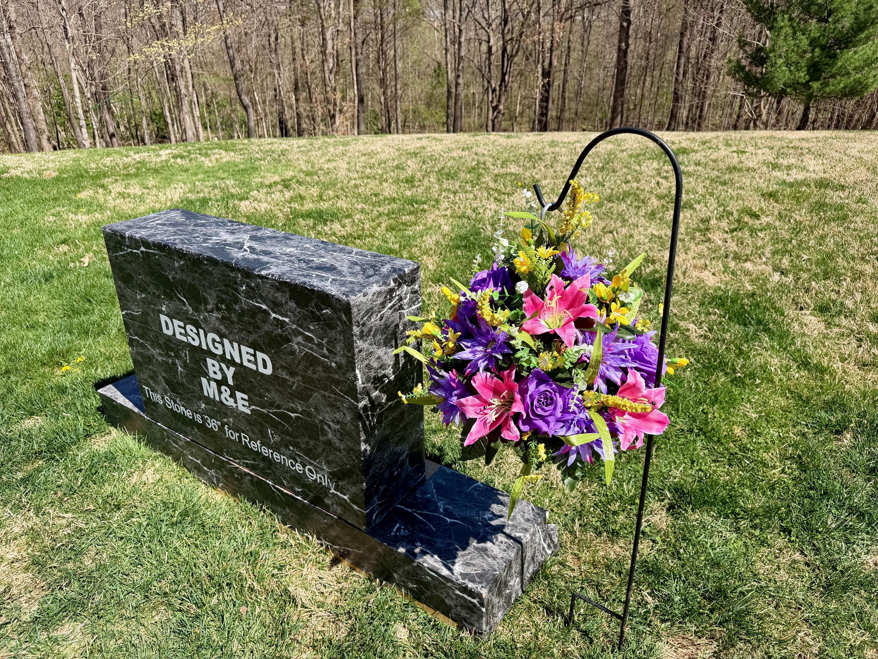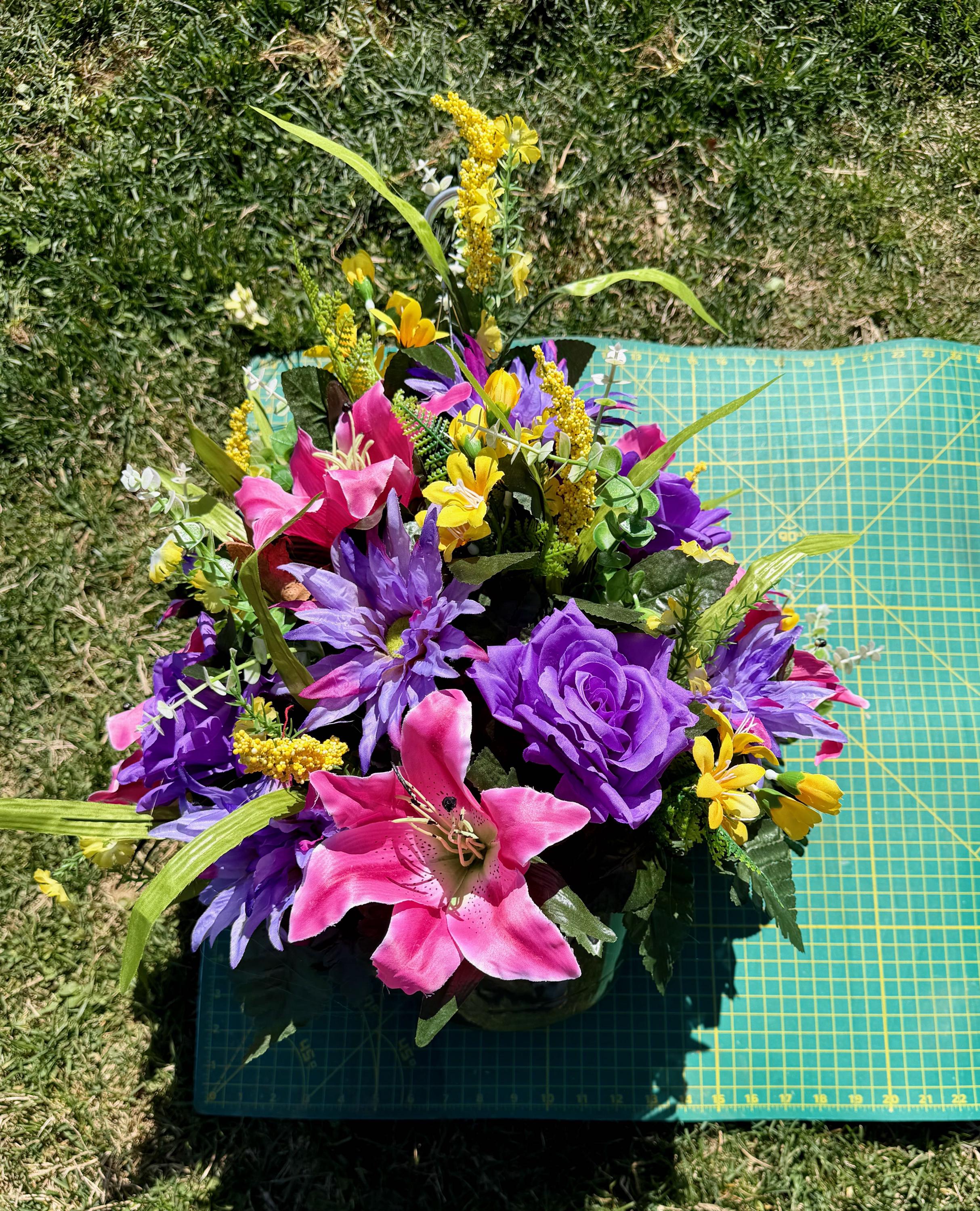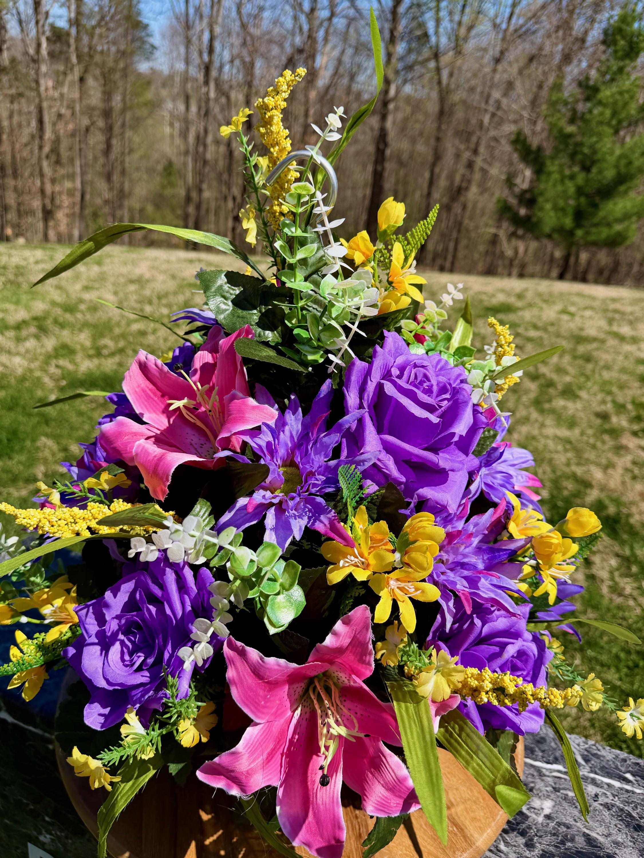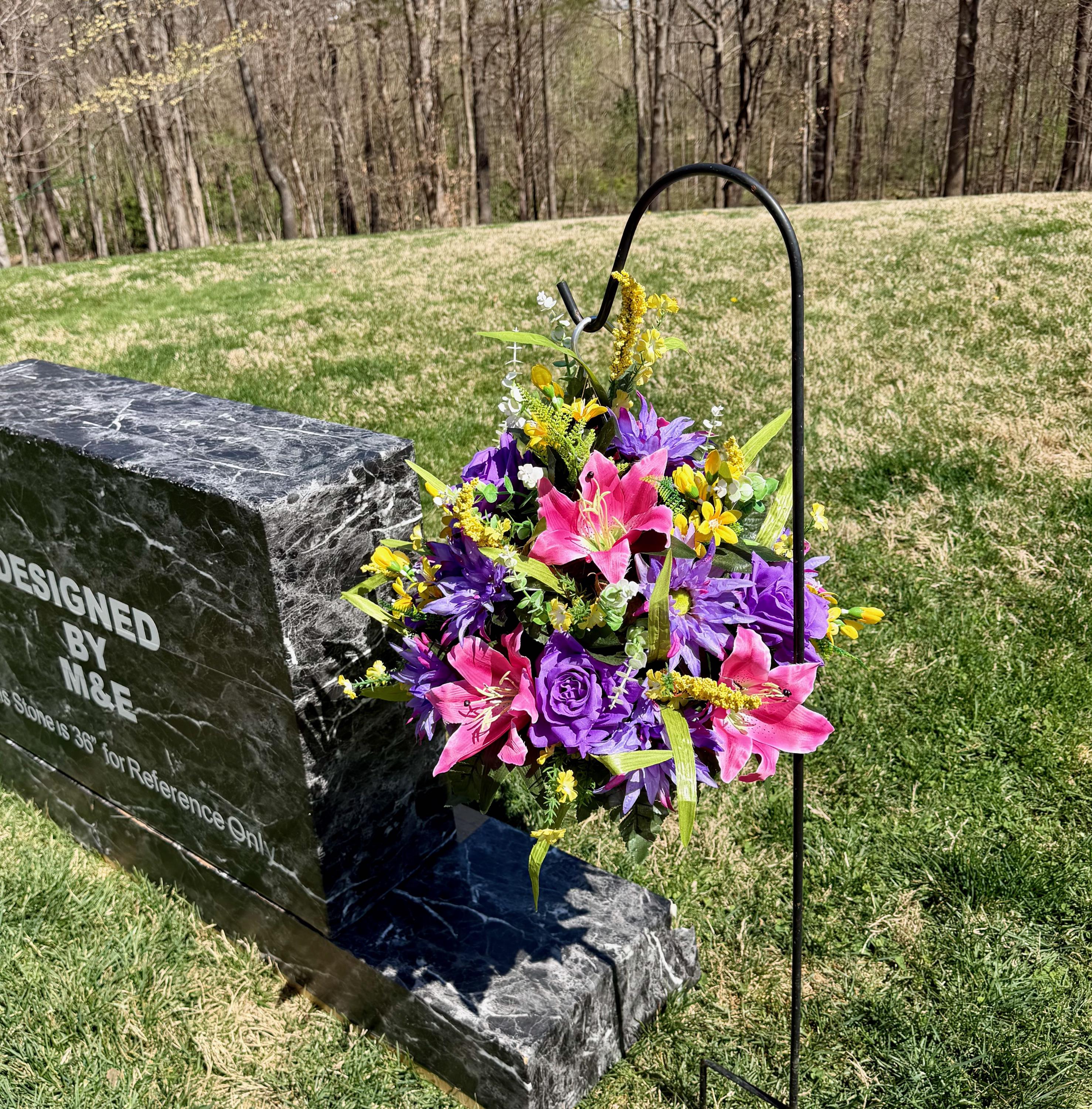 We’re a small, family-operated business consisting of myself, my husband, and my daughter. We personally manage every order and strive for excellent customer service. All our arrangements use high-quality silk flowers, though all silk blooms may fade over time. Each stem is glued into foam to withstand the elements. Designed by M&E uses only premium silks, and we put genuine care into every piece we create. Rest assured, the arrangement shown in our photos is exactly the one you’ll receive, as I design and assemble each one myself. If you’re searching for something unique or have a particular flower, color, or matching vases in mind, please contact me to discuss a custom order.