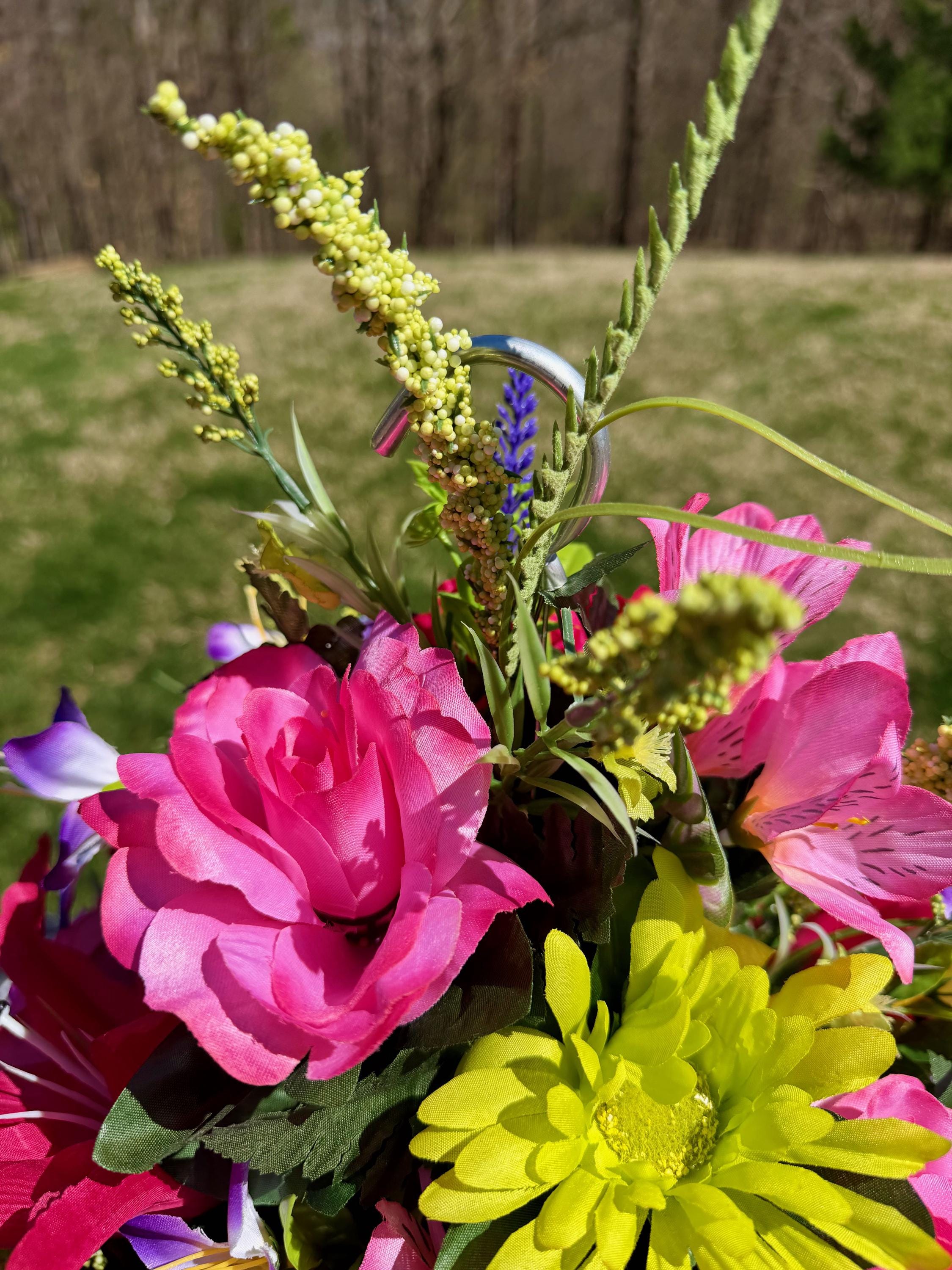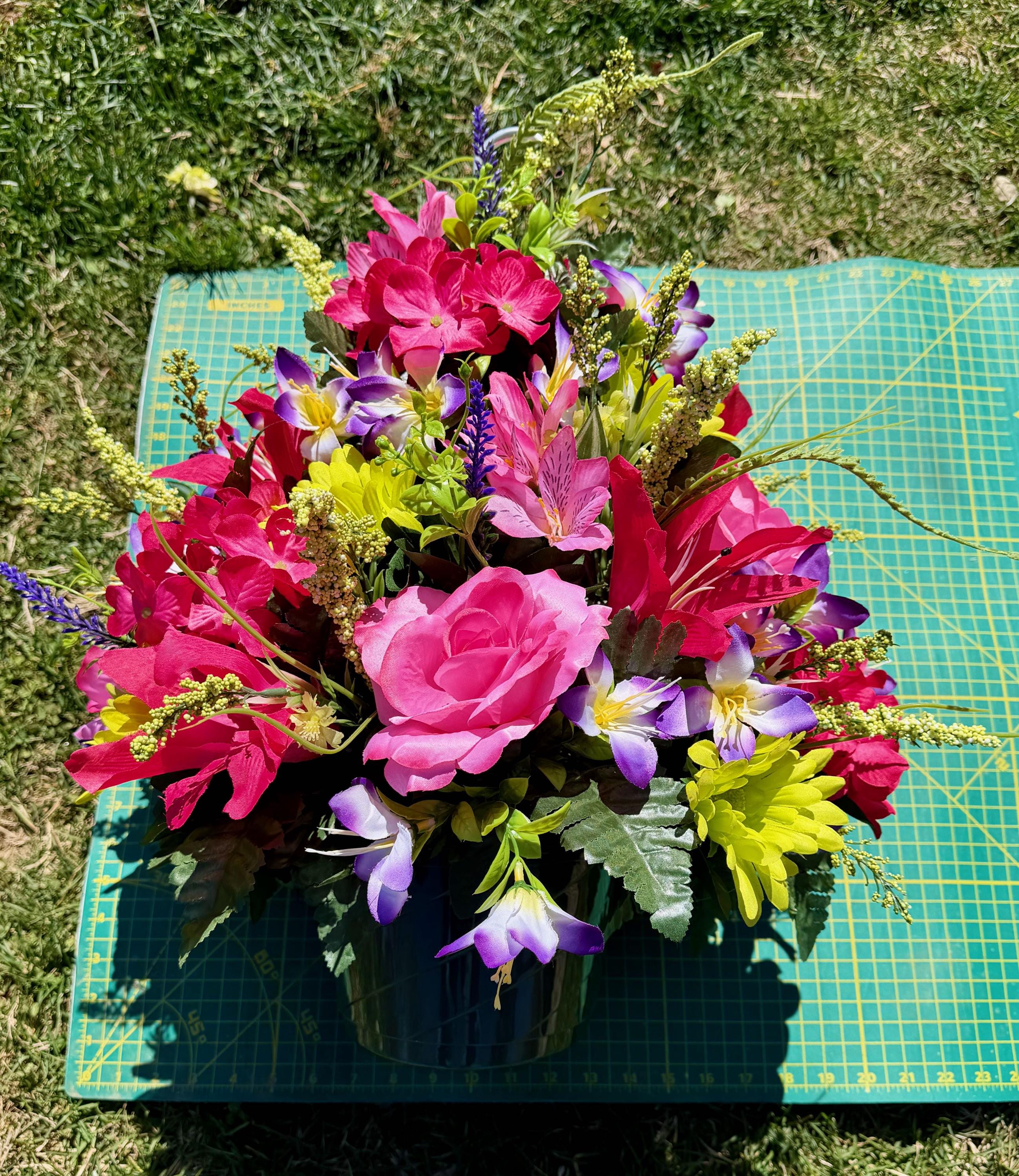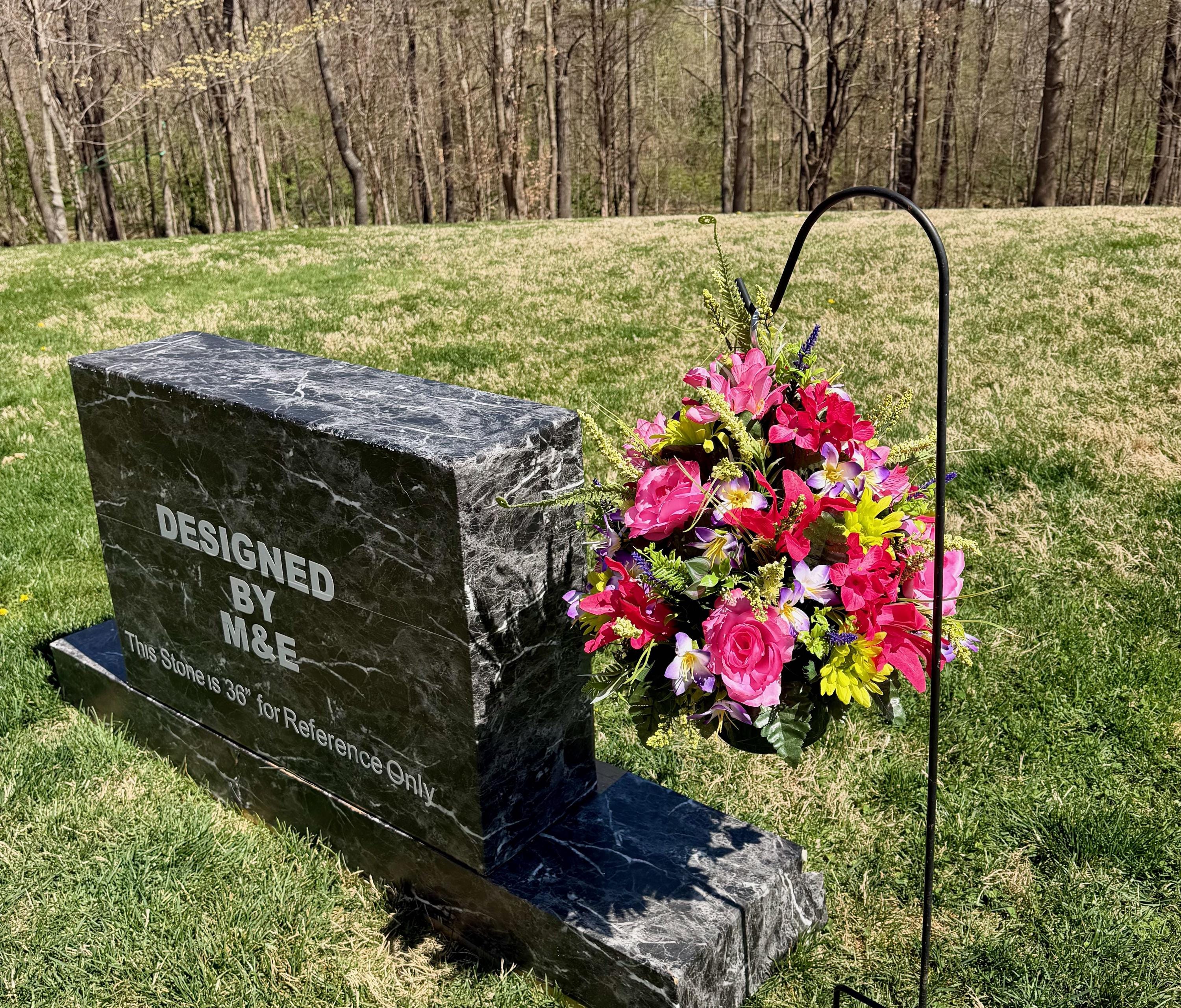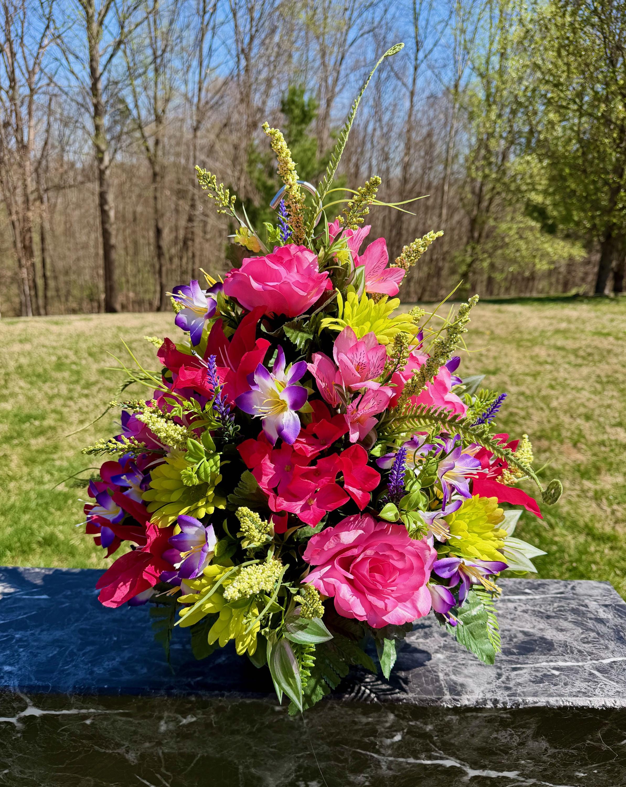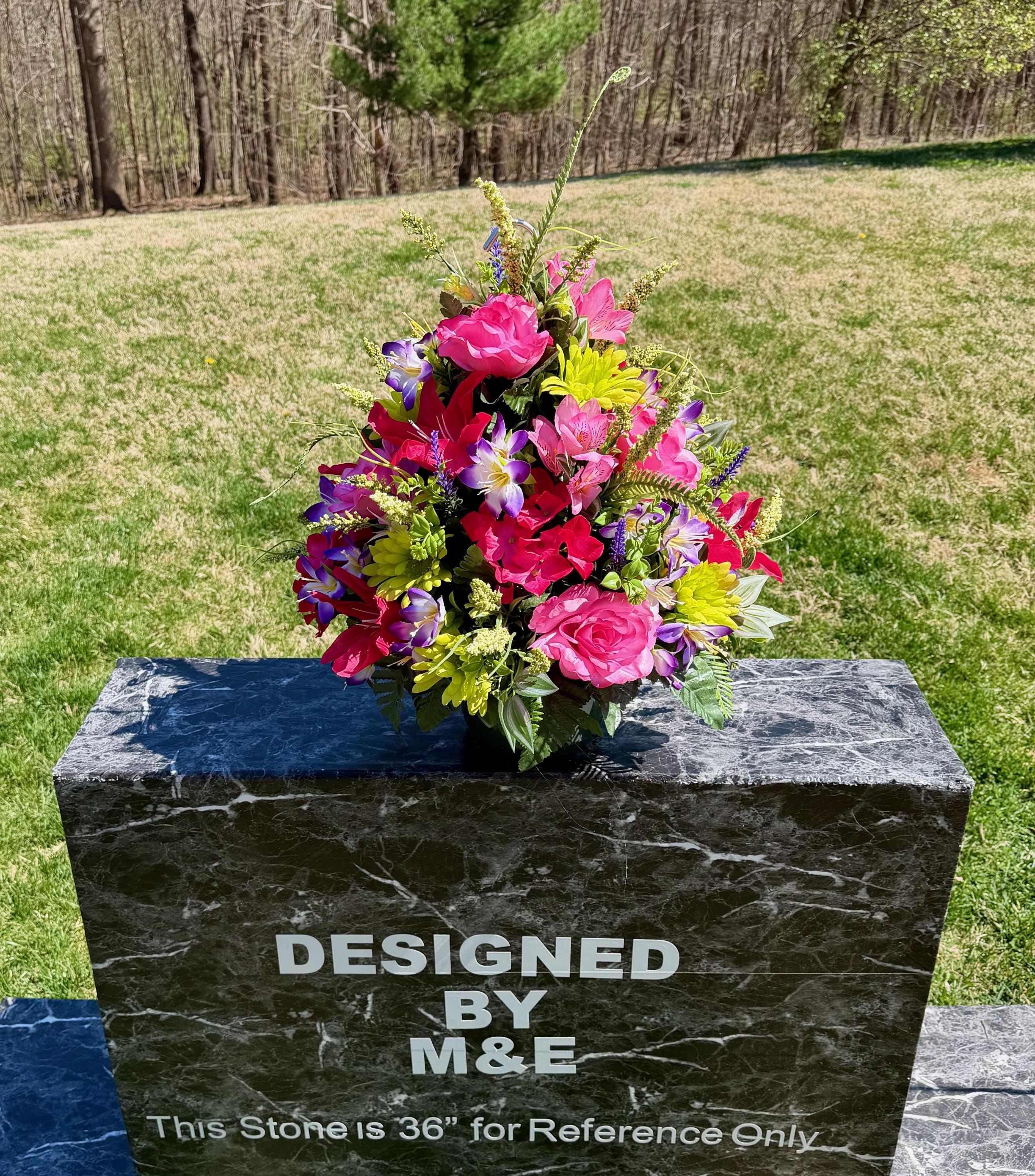 We’re a small, family-operated business consisting of myself, my husband, and my daughter. We personally manage every order and strive for excellent customer service. All our arrangements use high-quality silk flowers, though all silk blooms may fade over time. Each stem is glued into foam to withstand the elements. Designed by M&E uses only premium silks, and we put genuine care into every piece we create. Rest assured, the arrangement shown in our photos is exactly the one you’ll receive, as I design and assemble each one myself. If you’re searching for something unique or have a particular flower, color, or matching vases in mind, please contact me to discuss a custom order.