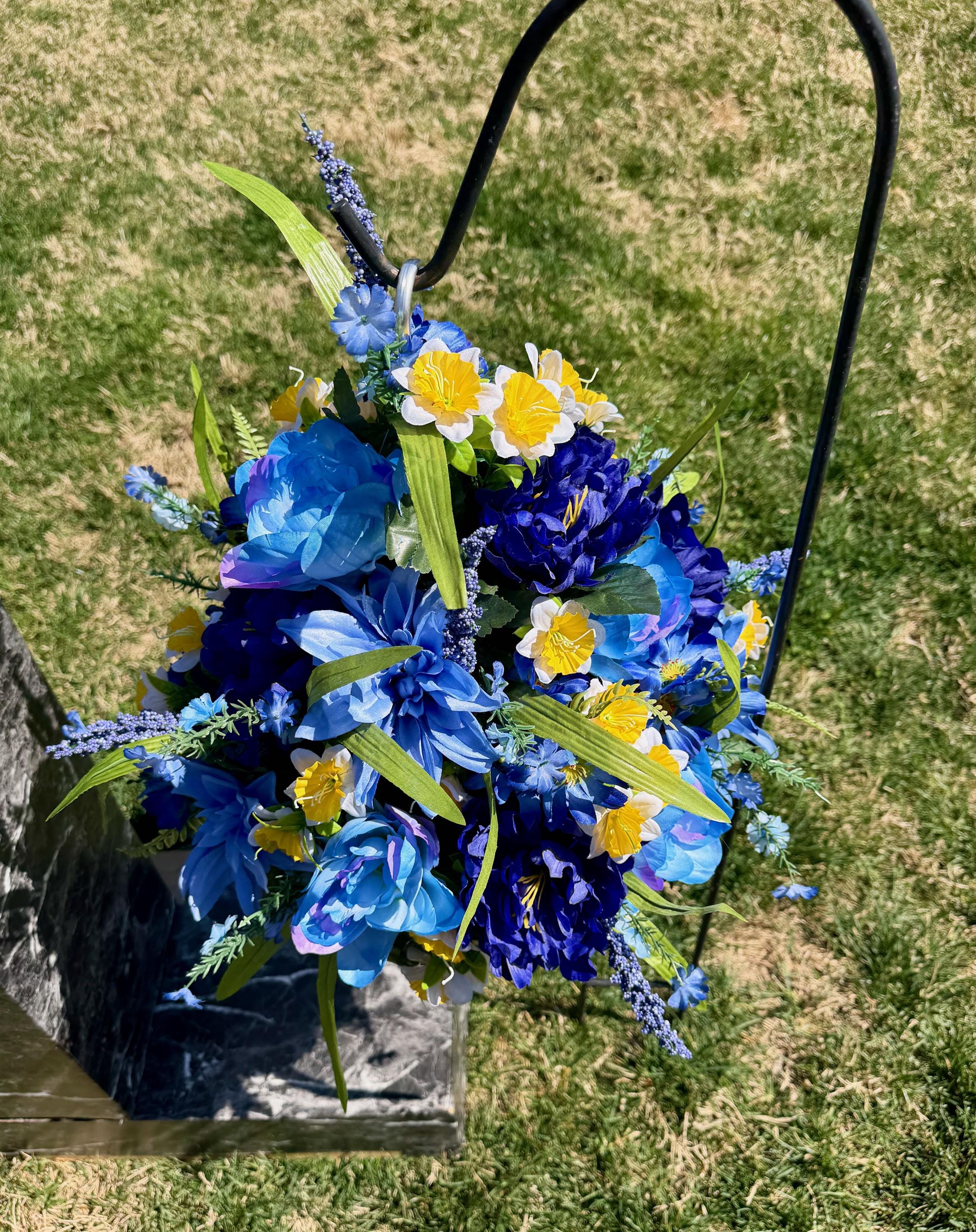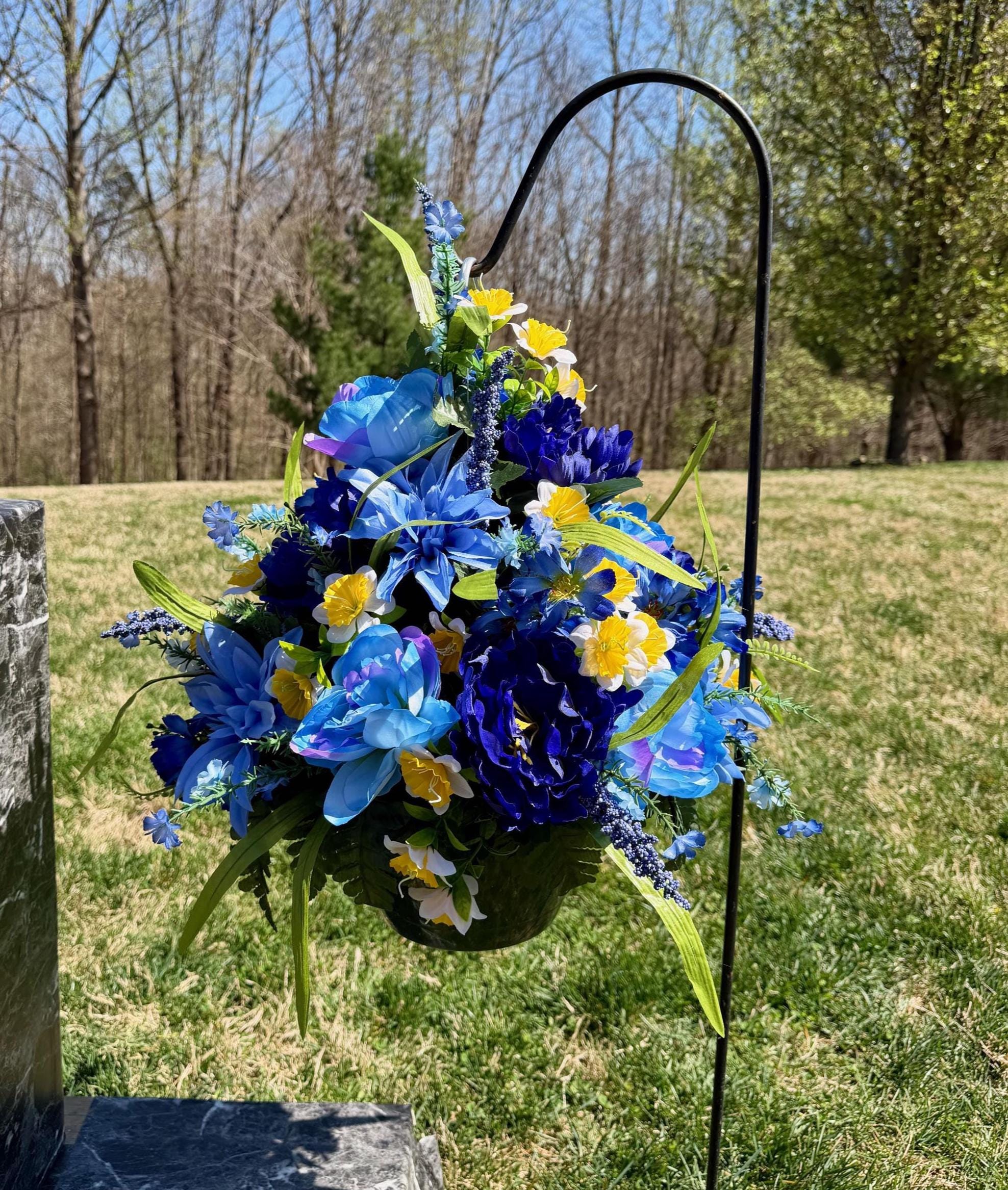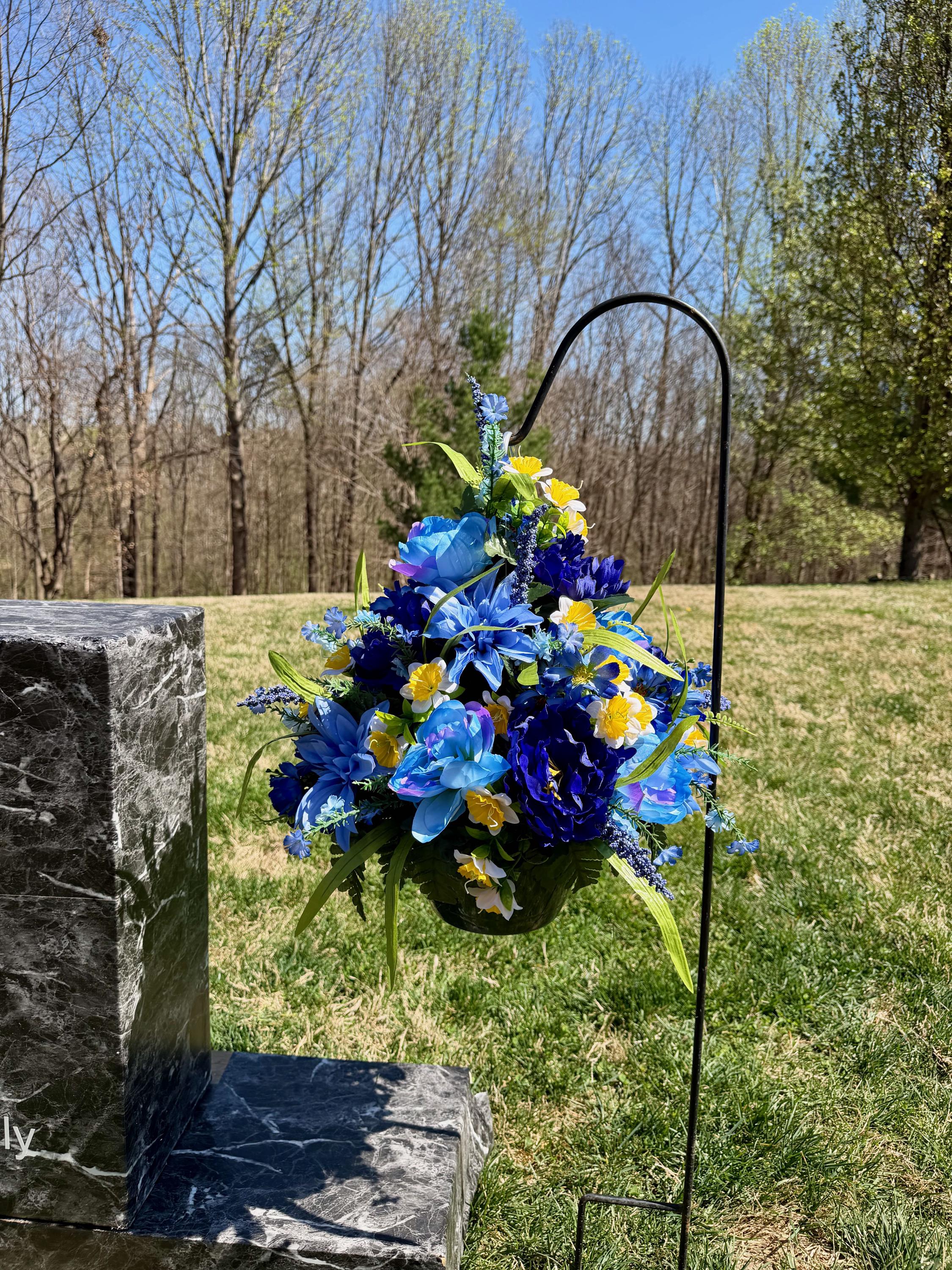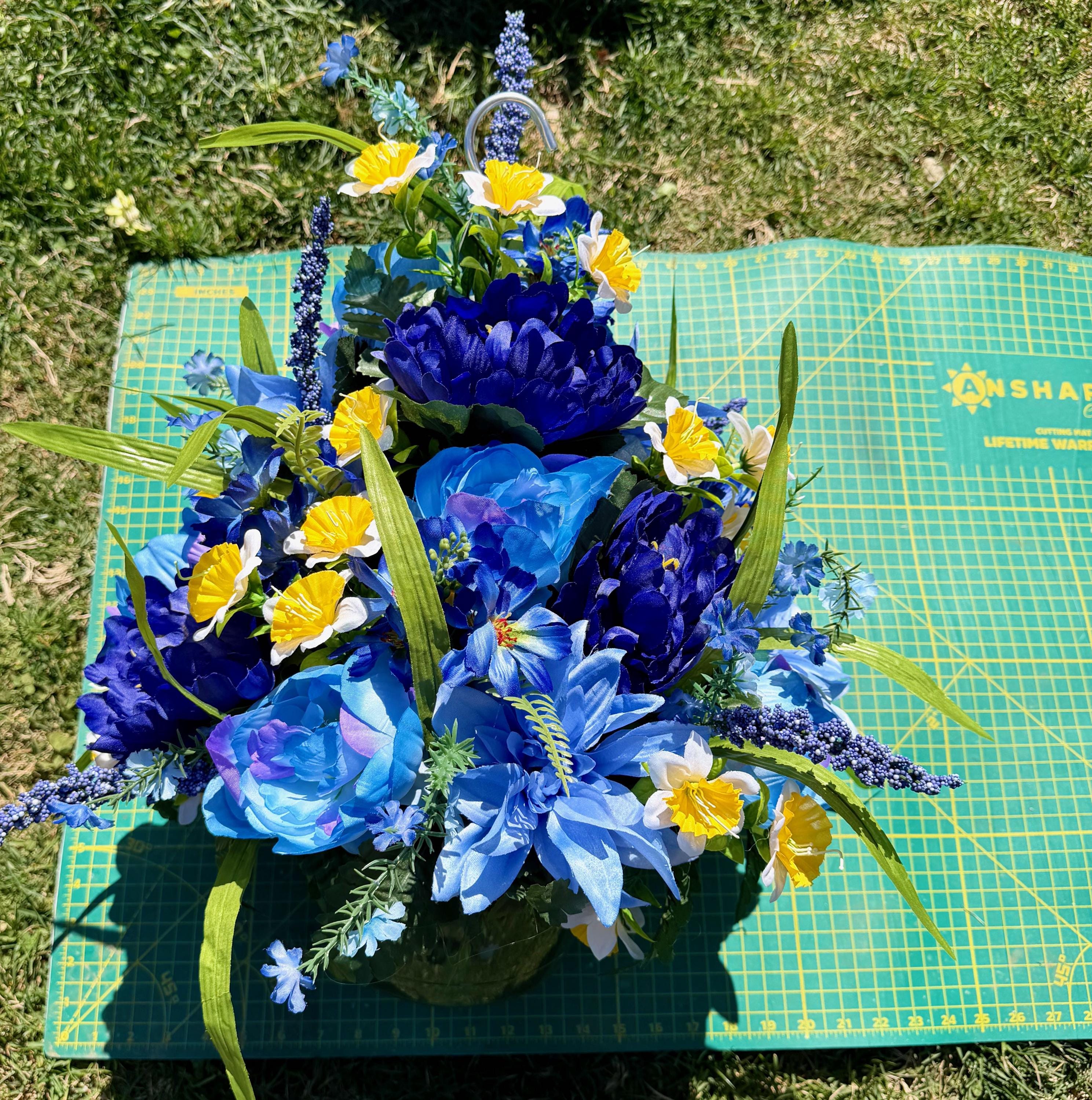Beautiful Blue and Yellow Cemetery Hanging Basket, Grave Decorations, Memorial Flowers