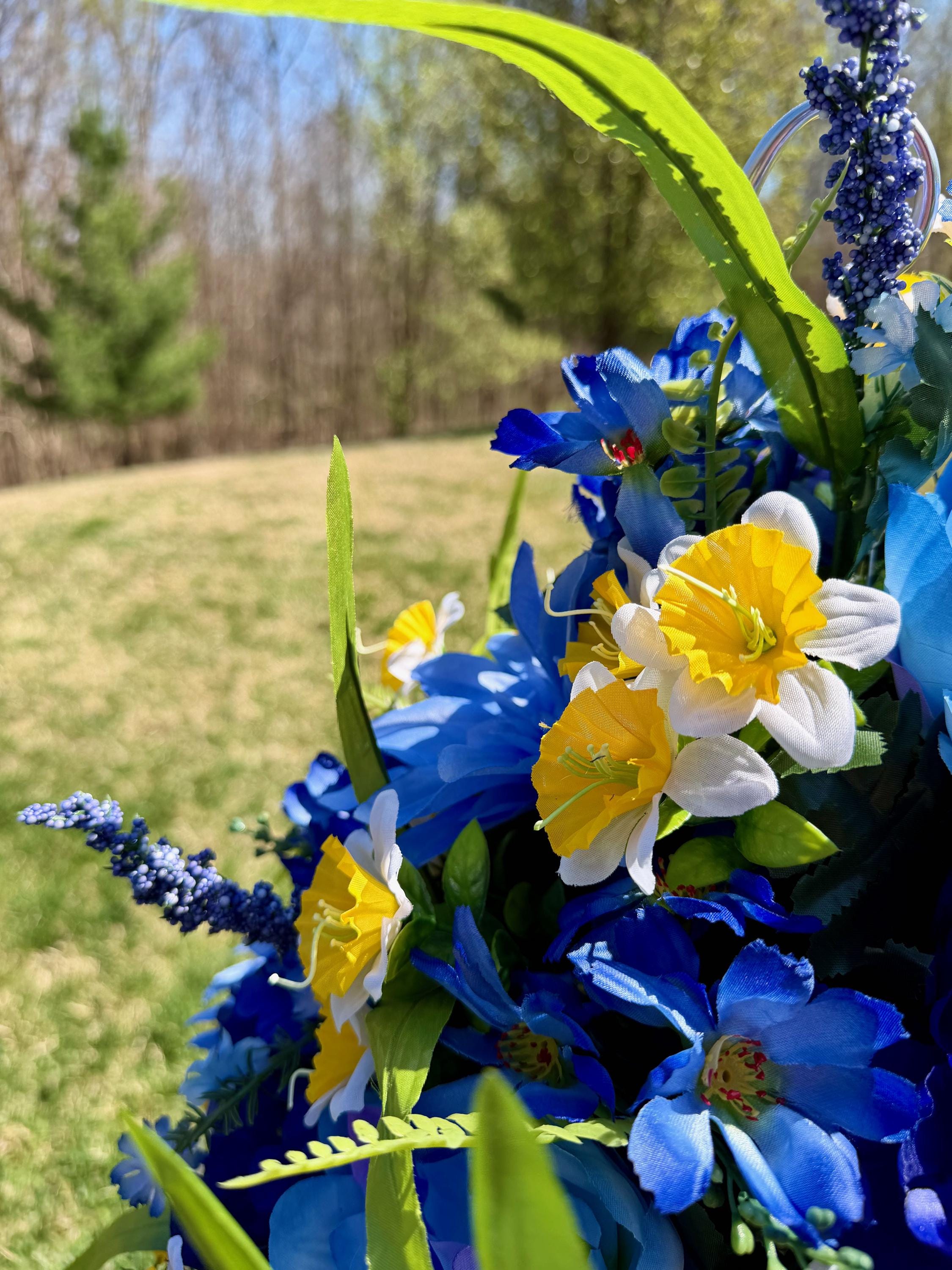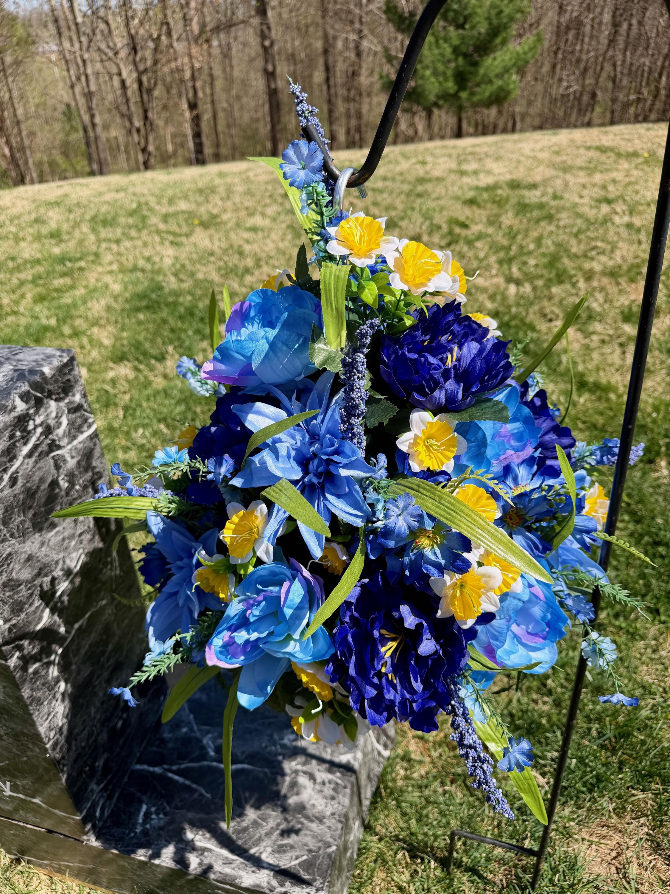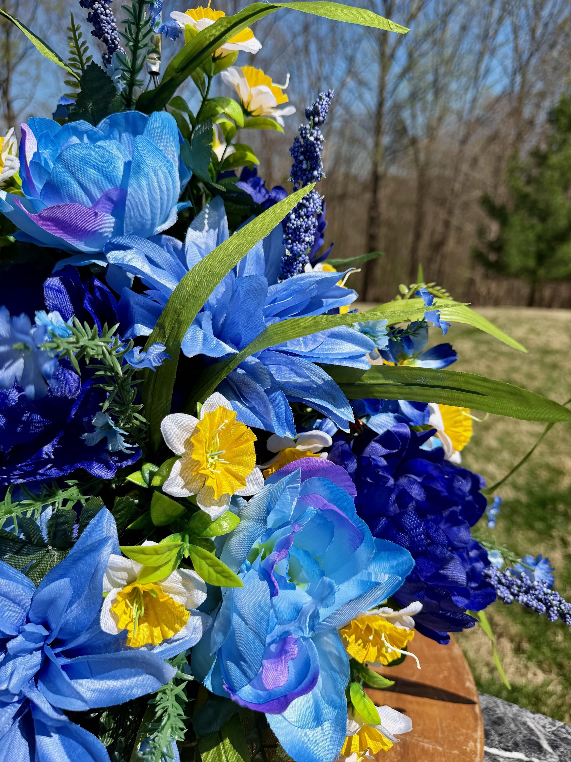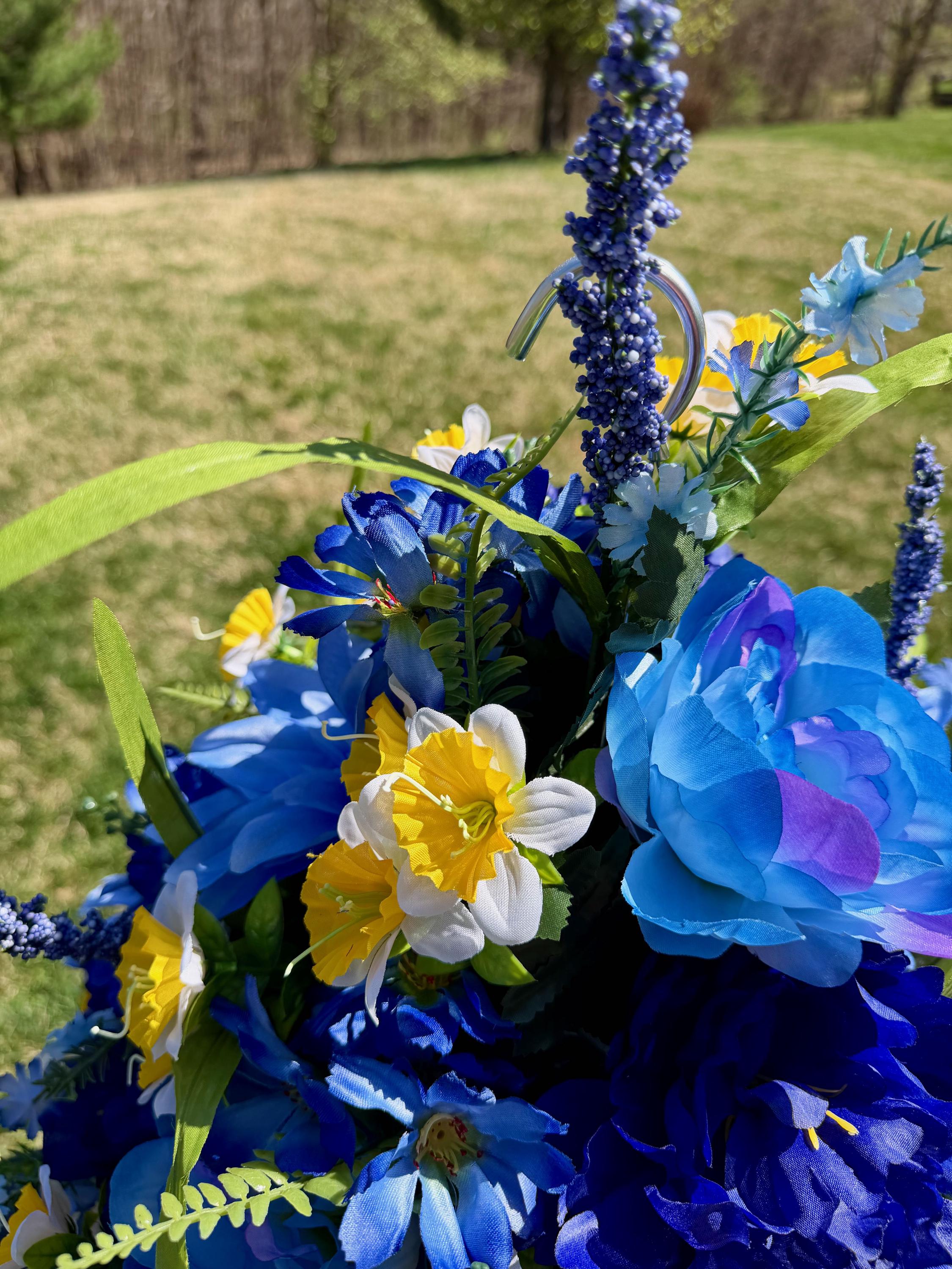Beautiful Blue and Yellow Cemetery Hanging Basket, Grave Decorations, Memorial Flowers
