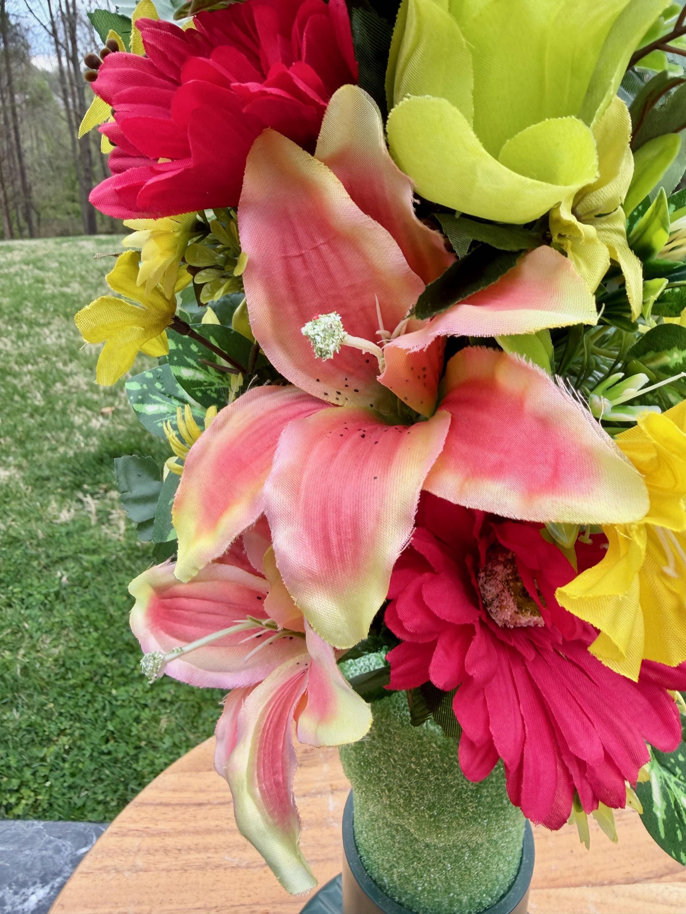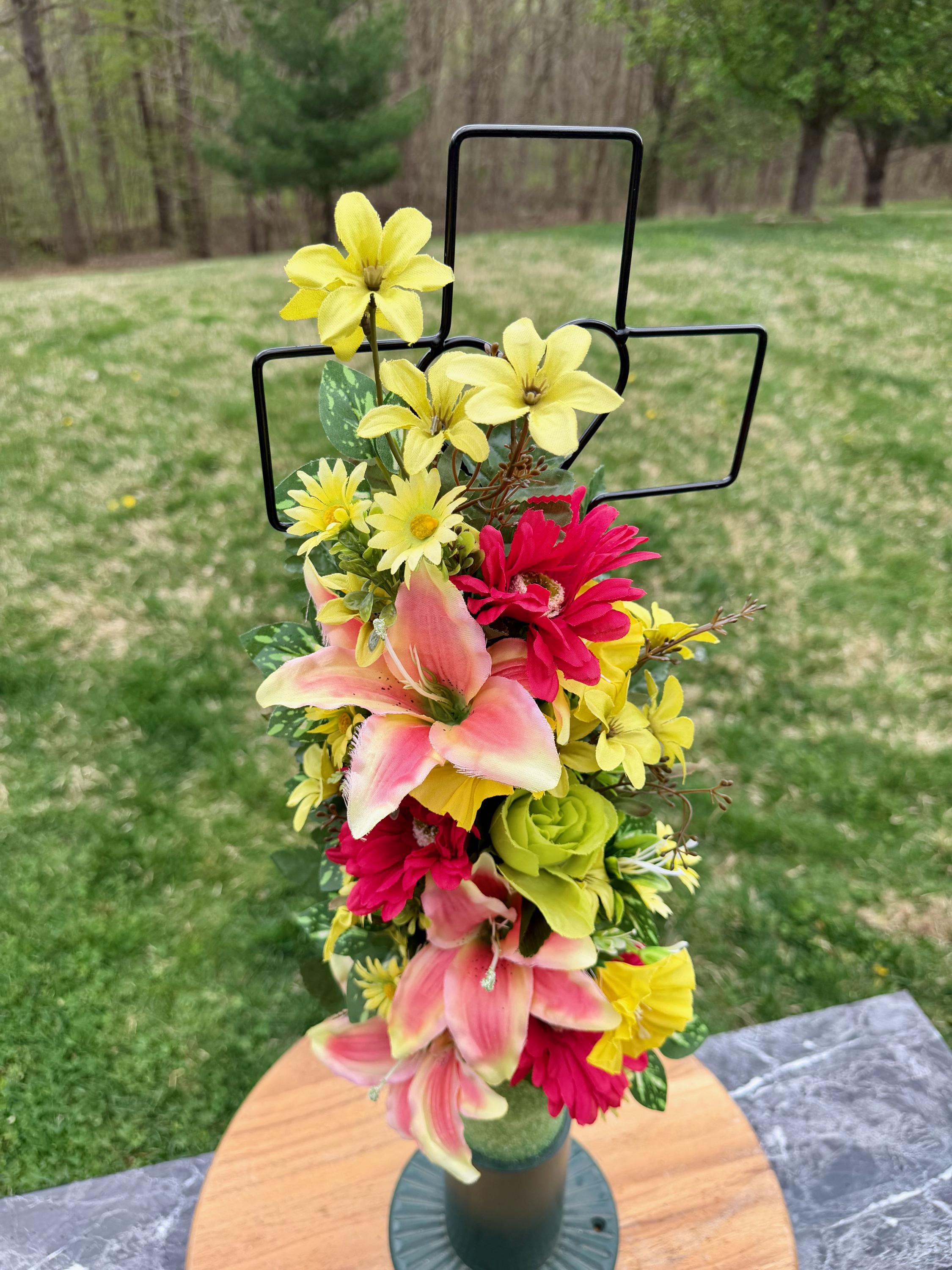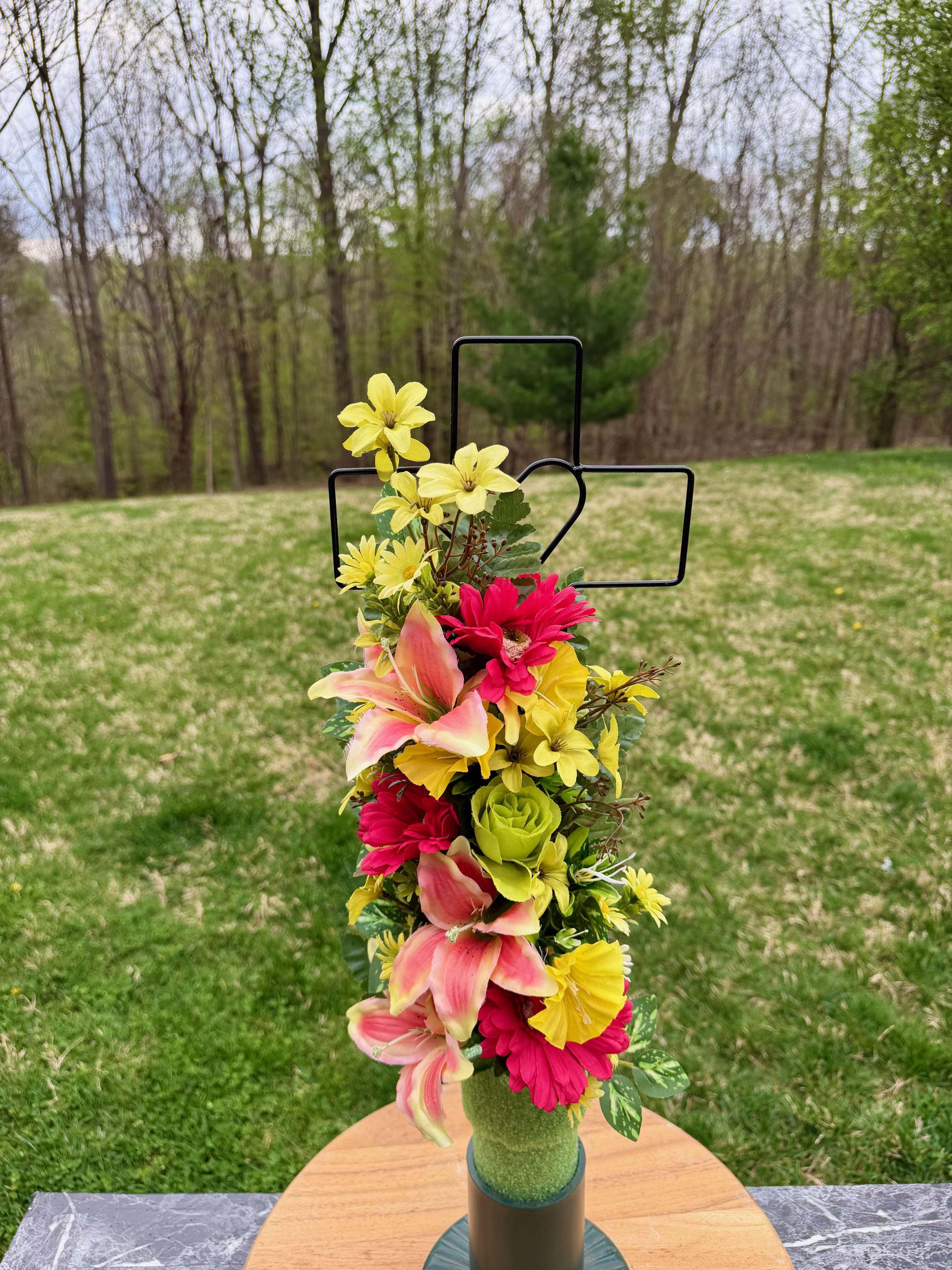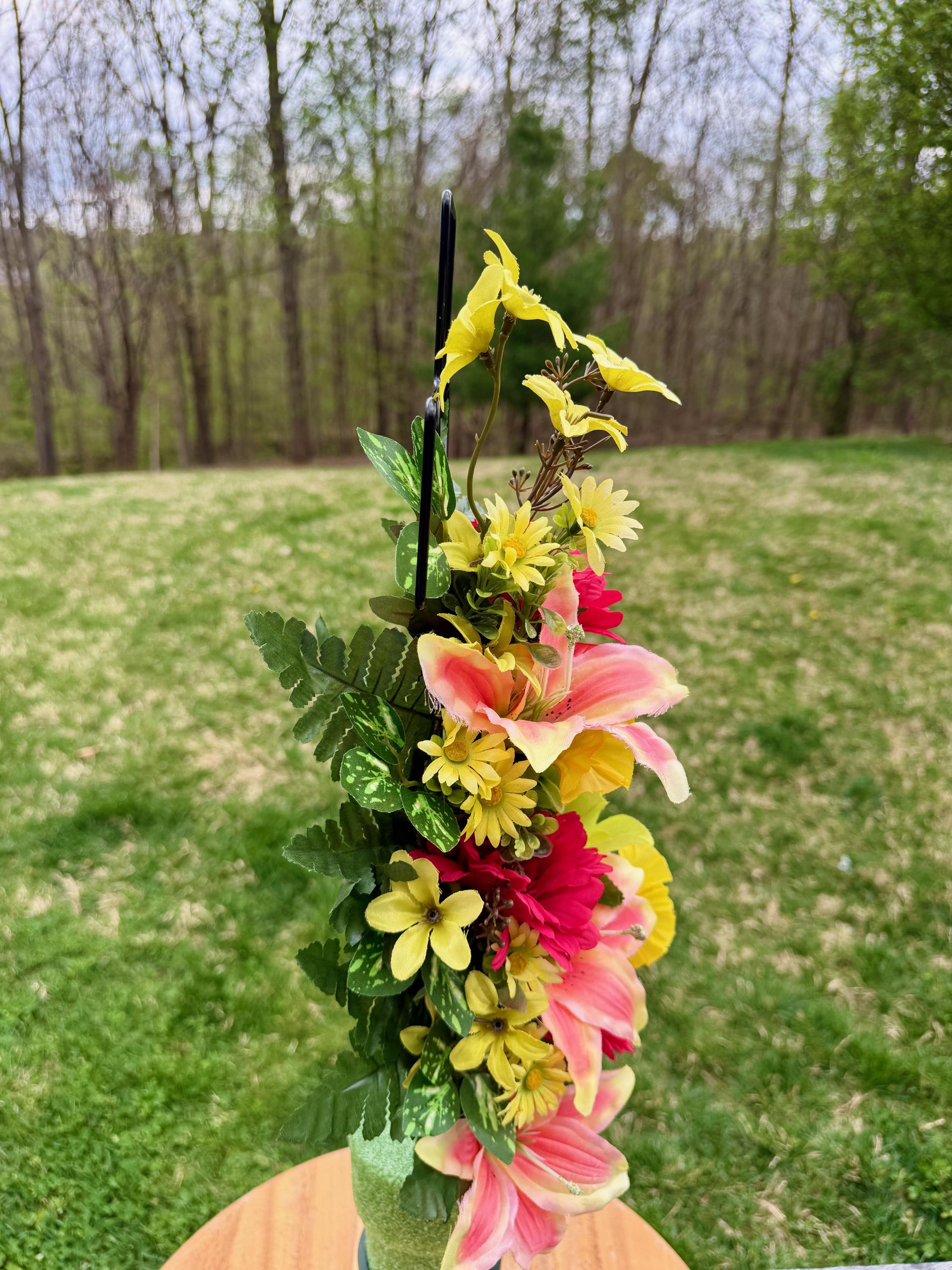 We’re a small, family-operated business consisting of myself, my husband, and my daughter. We personally manage every order and strive for excellent customer service. All our arrangements use high-quality silk flowers, though all silk blooms may fade over time. Each stem is glued into foam to withstand the elements. Designed by M&E uses only premium silks, and we put genuine care into every piece we create. Rest assured, the arrangement shown in our photos is exactly the one you’ll receive, as I design and assemble each one myself. If you’re searching for something unique or have a particular flower, color, or matching vases in mind, please contact me to discuss a custom order.
