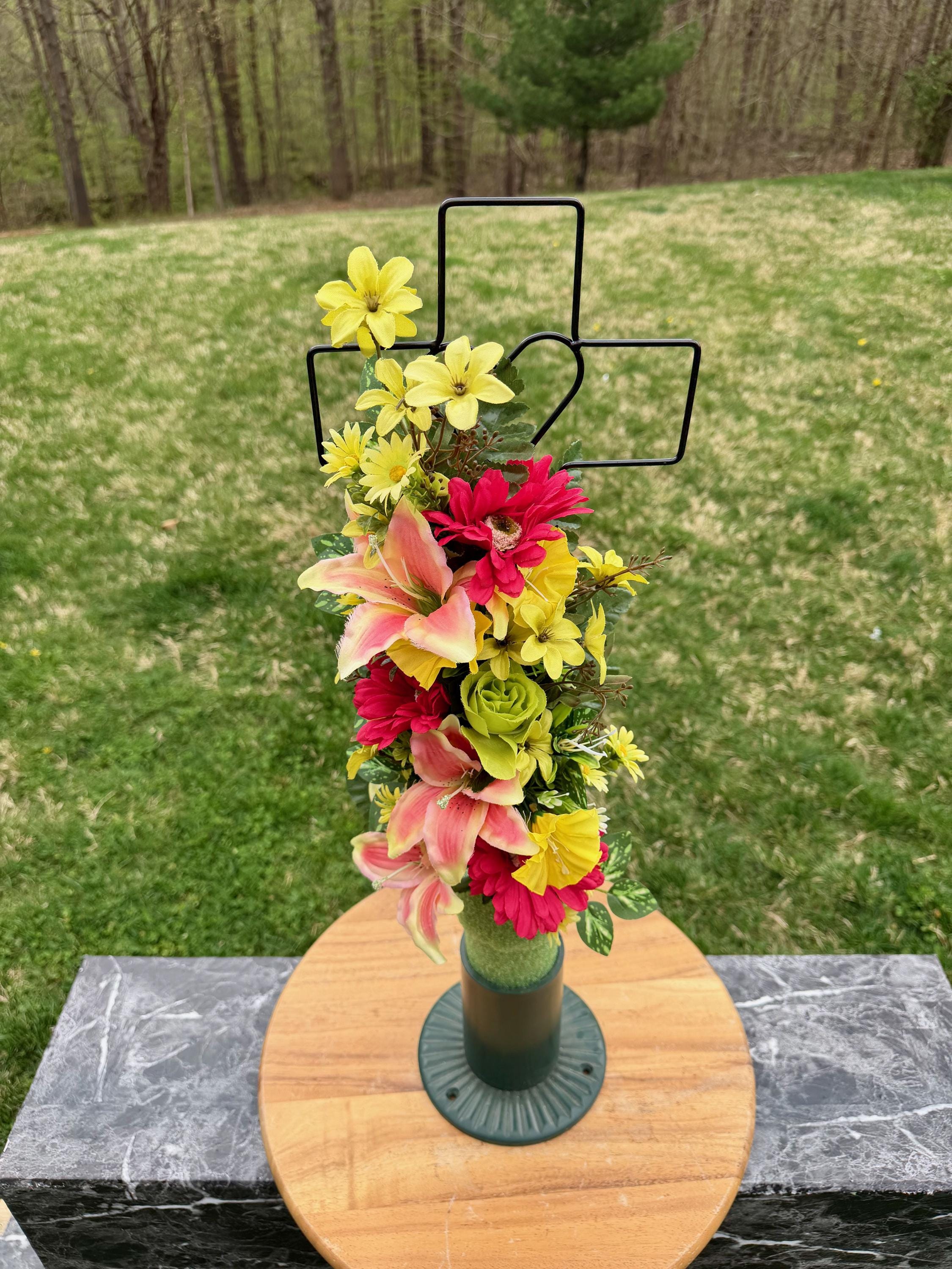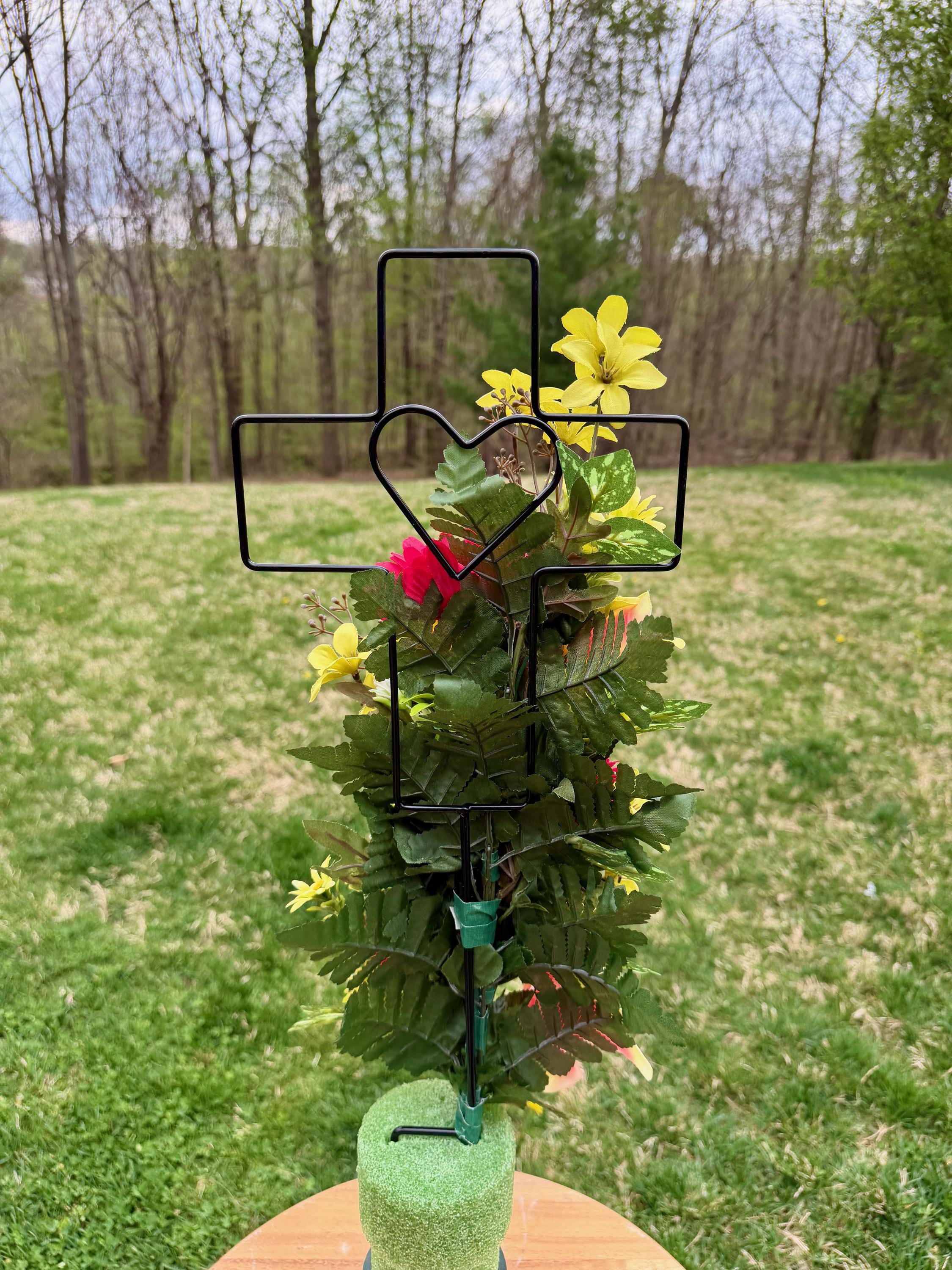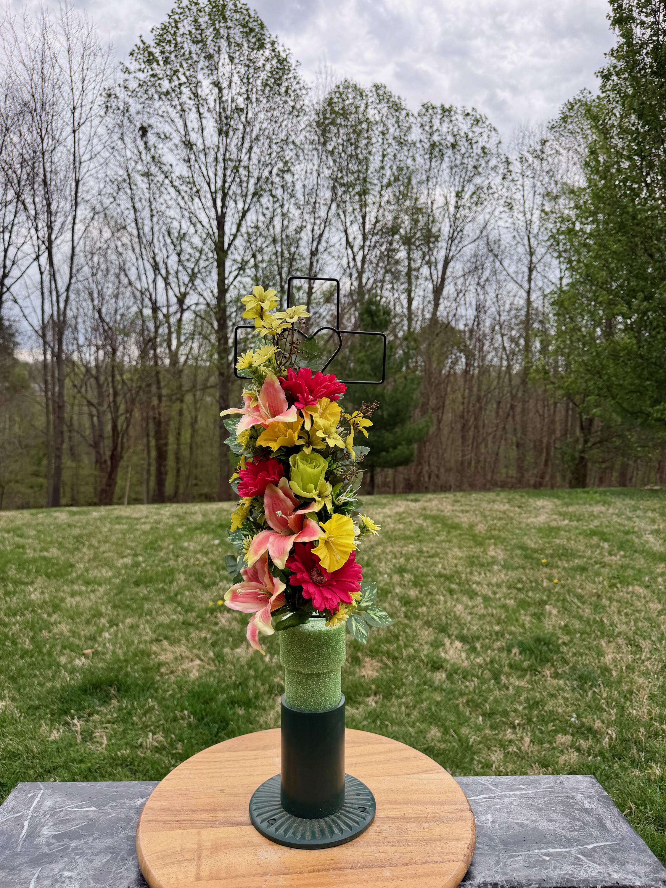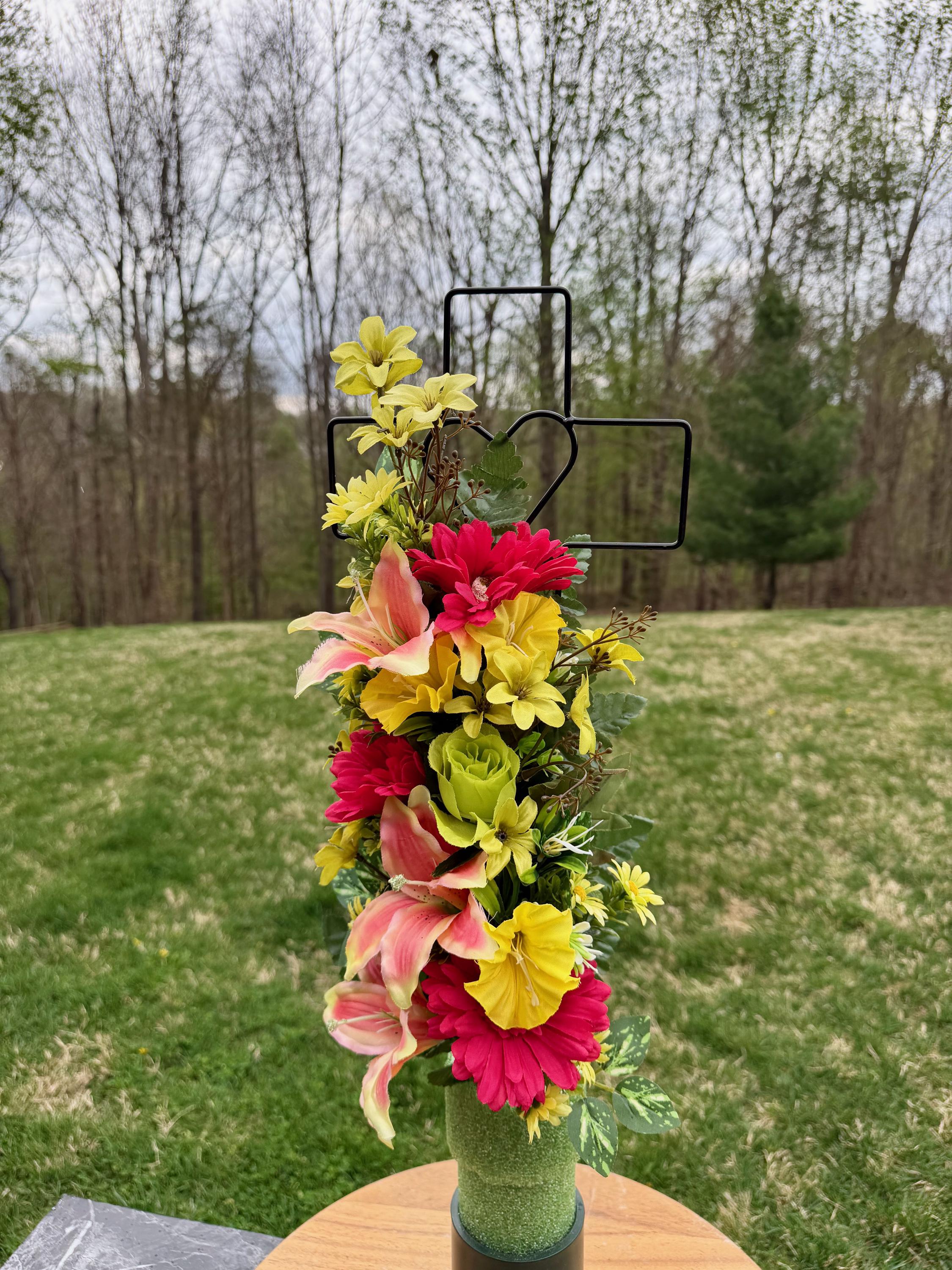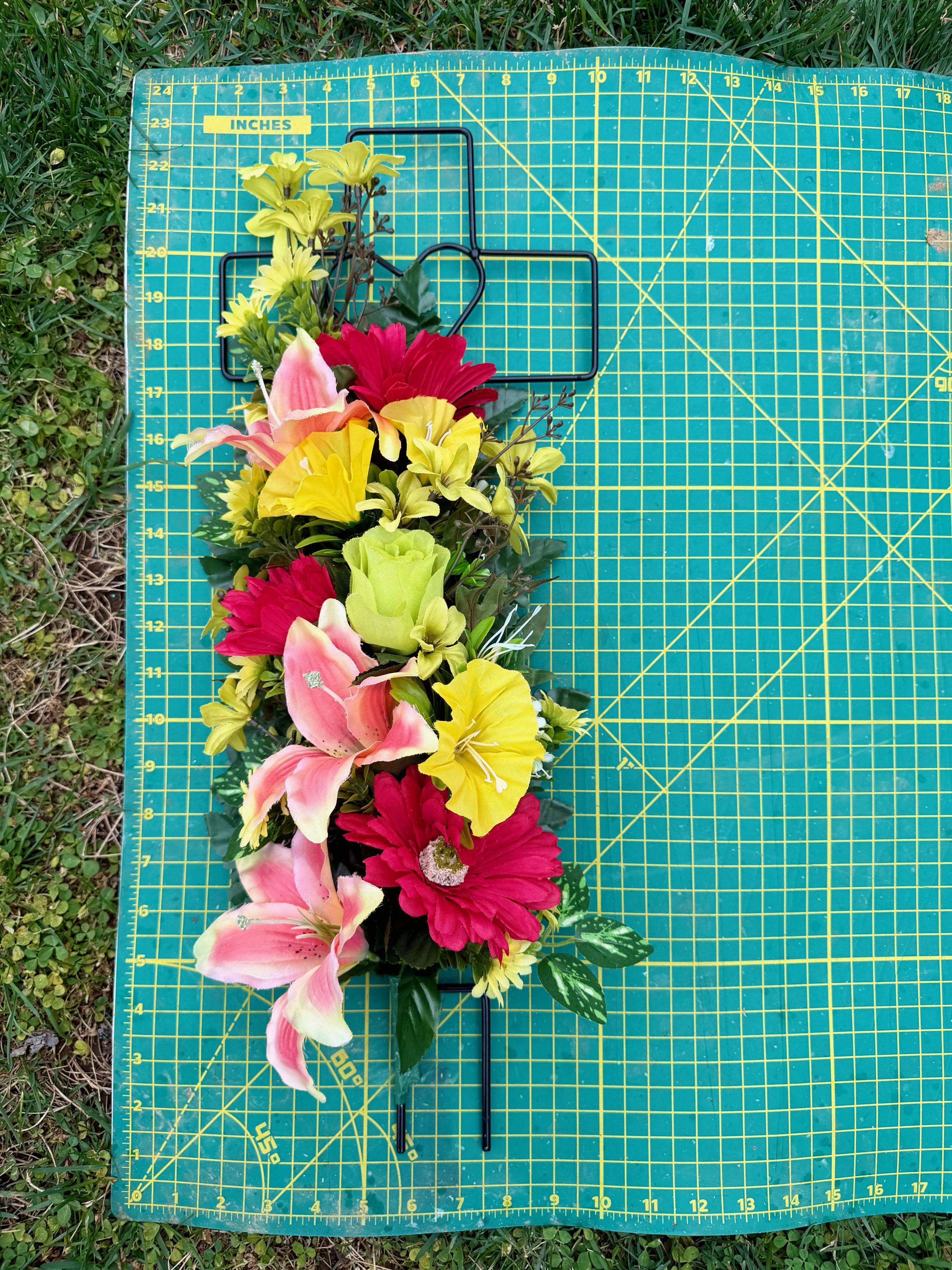 Pink, Peach, Green and Yellow Silk Flower Heart Cemetery Cross - Grave Decoration - Memorial Arrangement