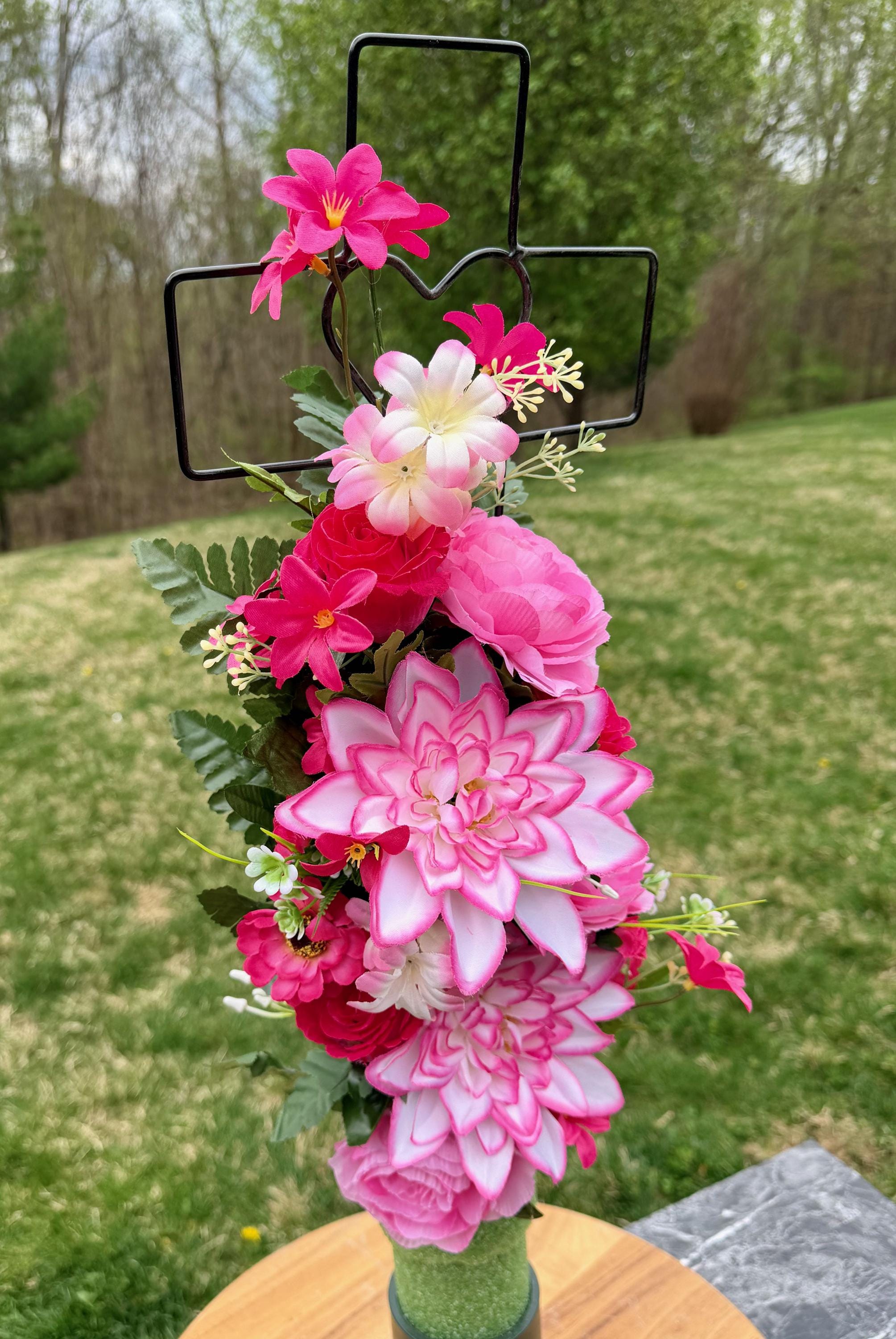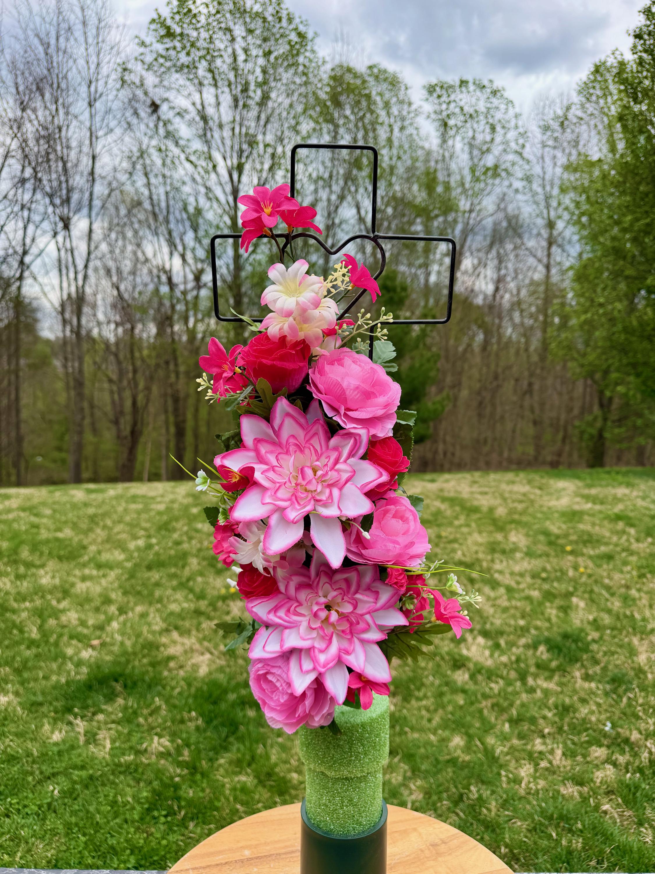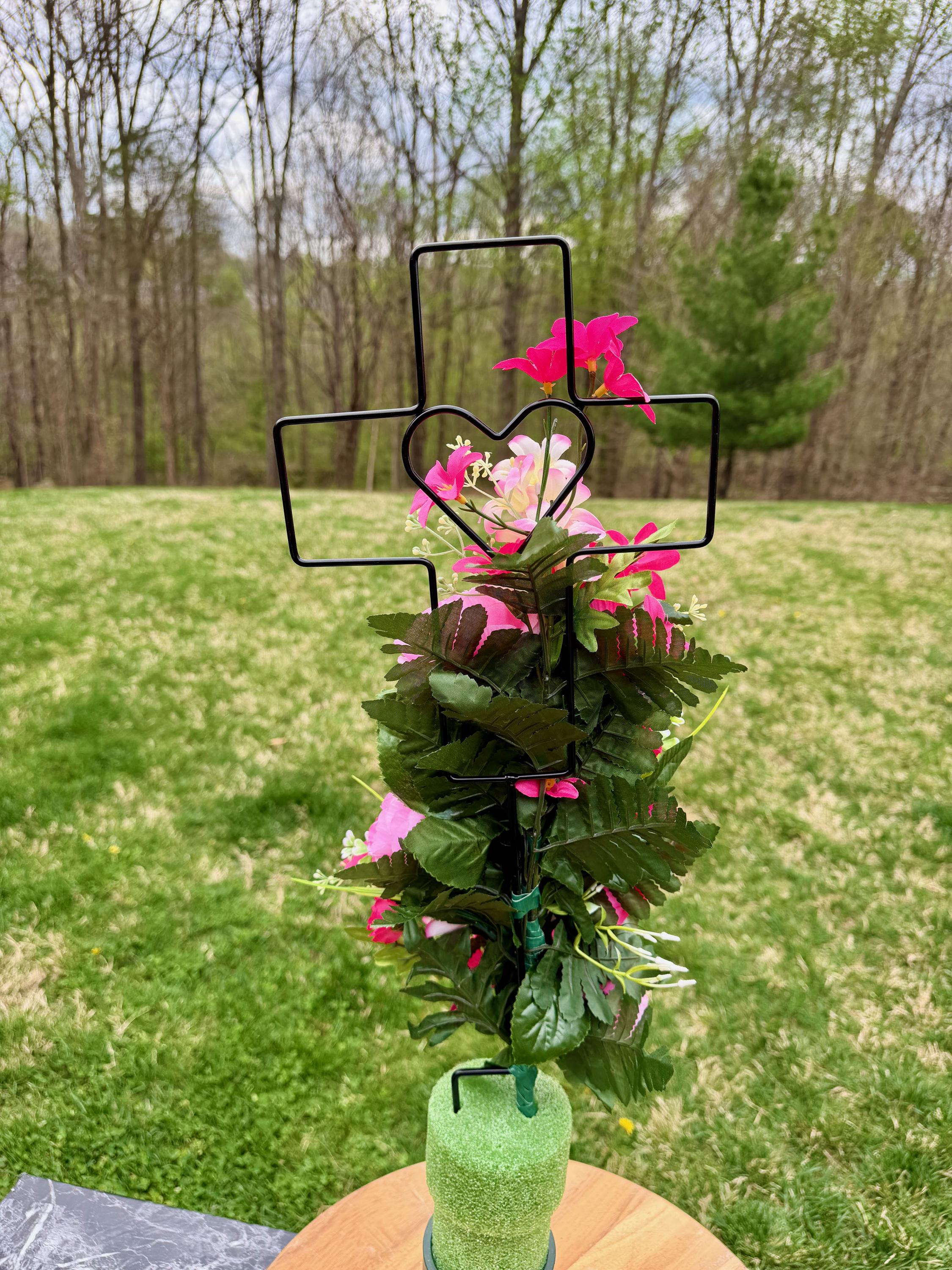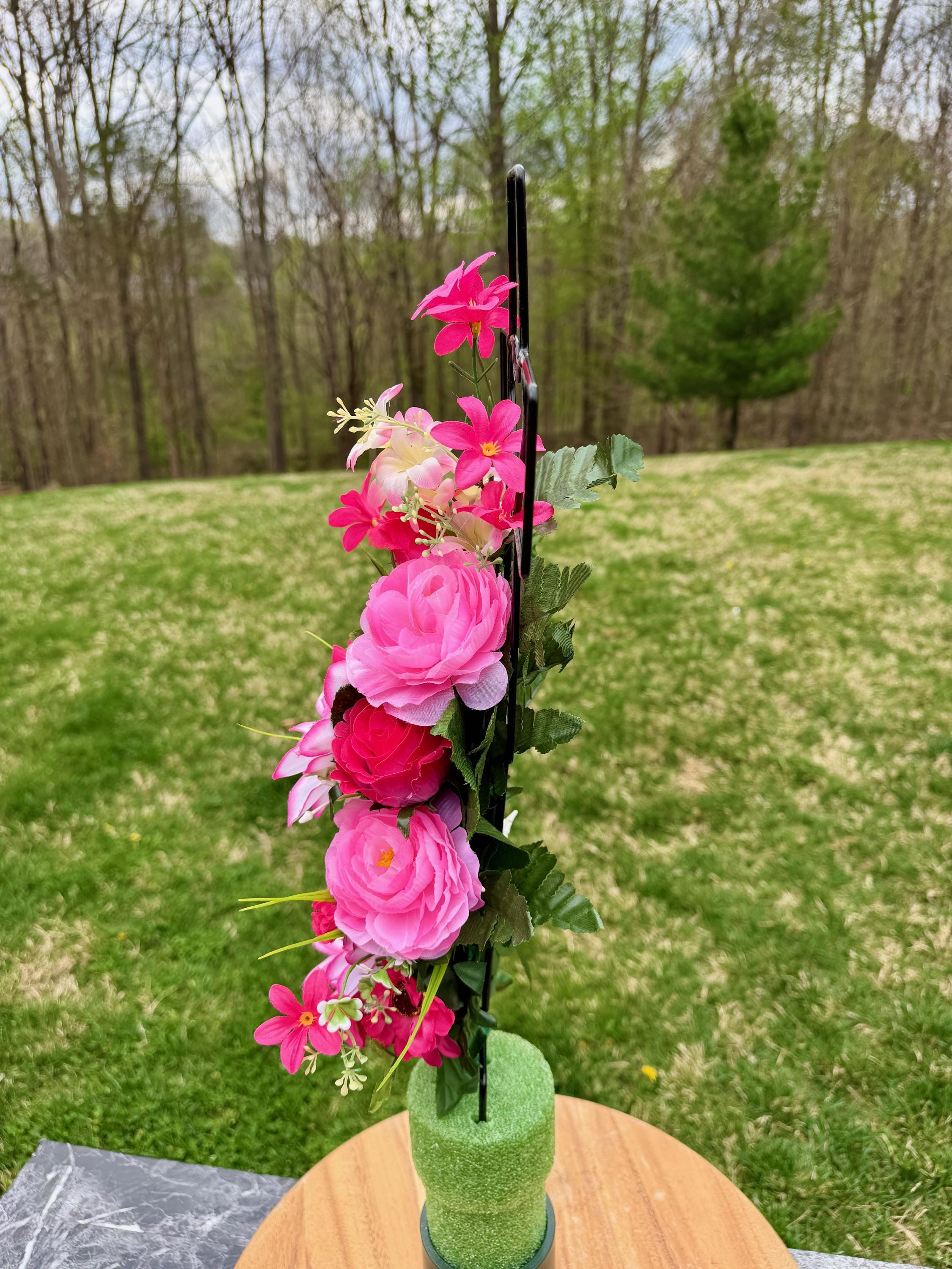 - Vase and Metal Cross arrangements use a “foam” insert; but for photos, they're displayed in a “plastic” holder just for stability—which is not included but can be purchased separately.