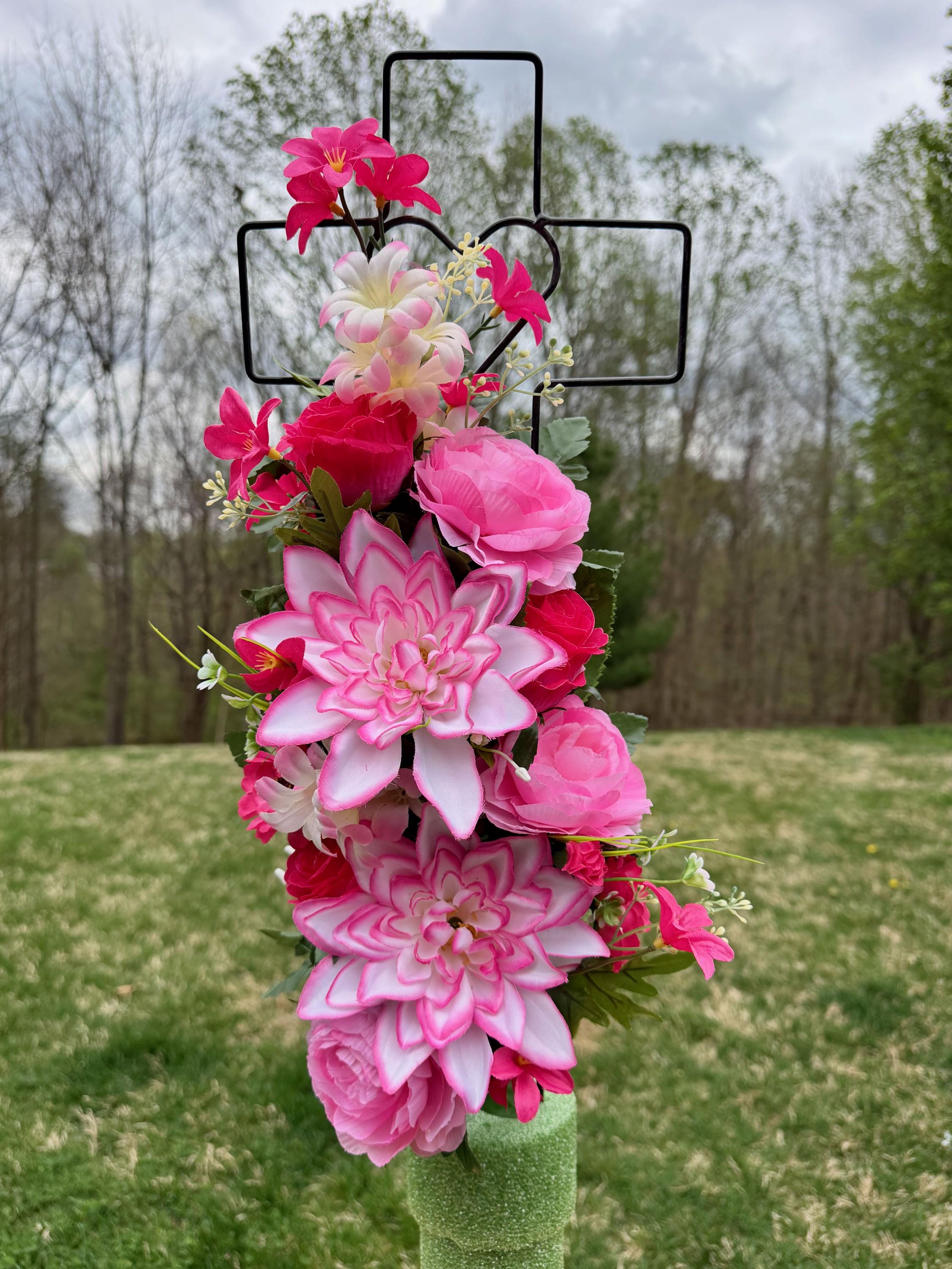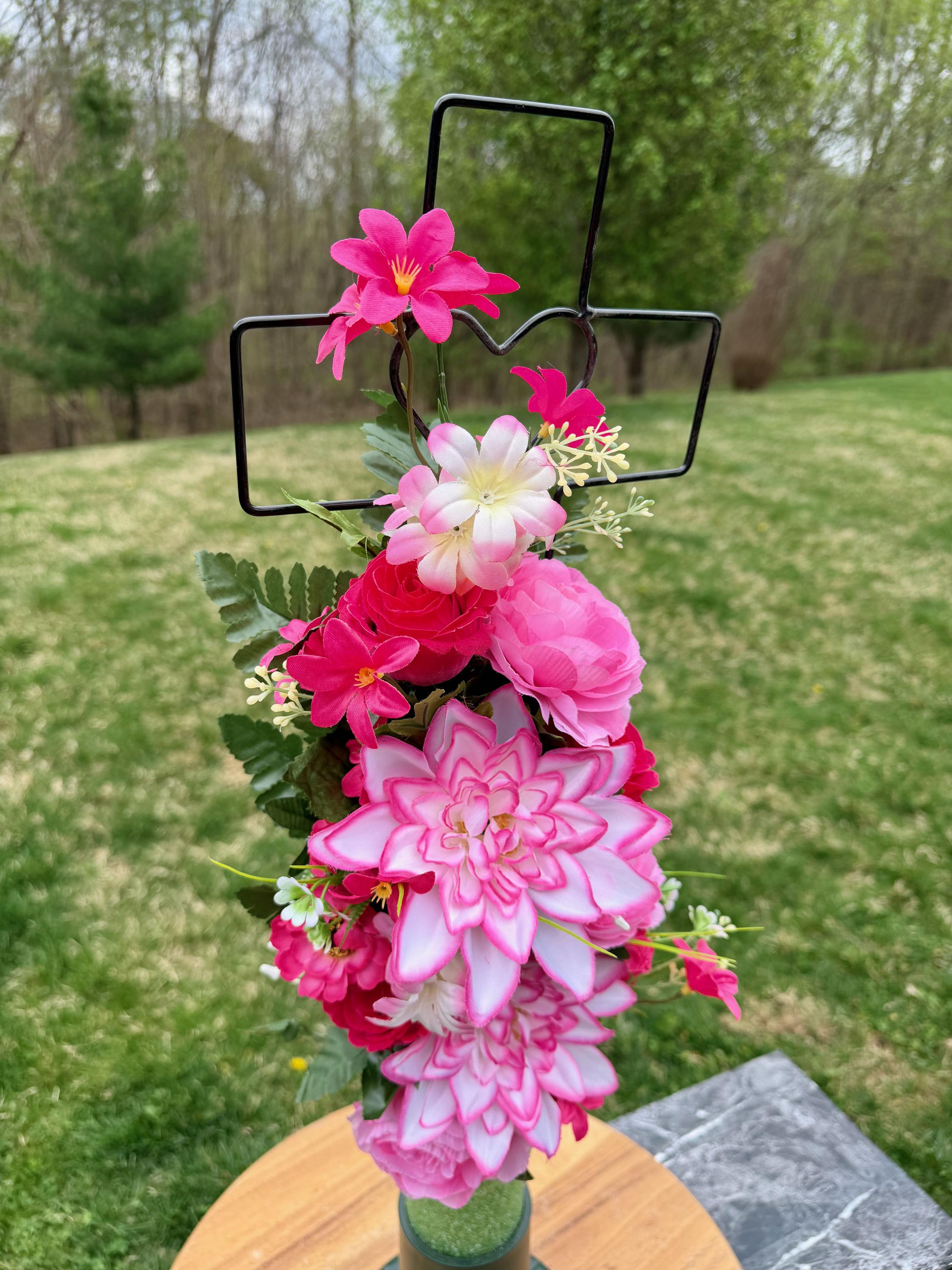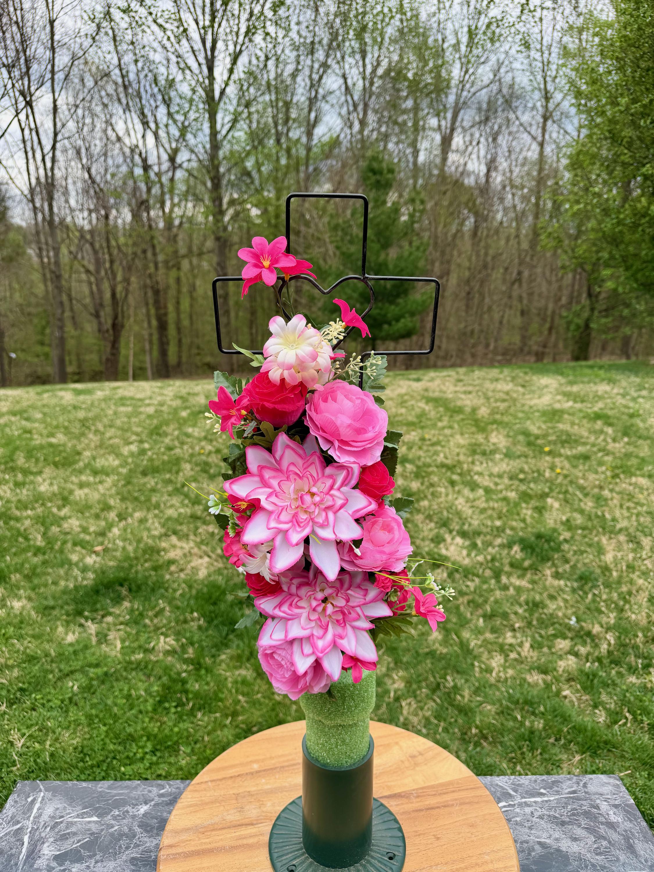- Vase and Metal Cross arrangements use a “foam” insert; but for photos, they're displayed in a “plastic” holder just for stability—which is not included but can be purchased separately.