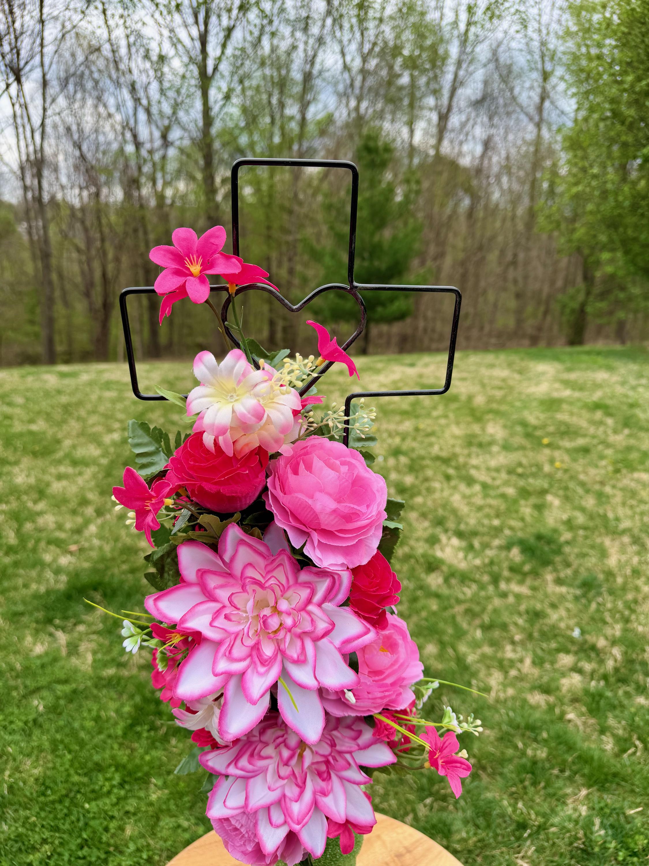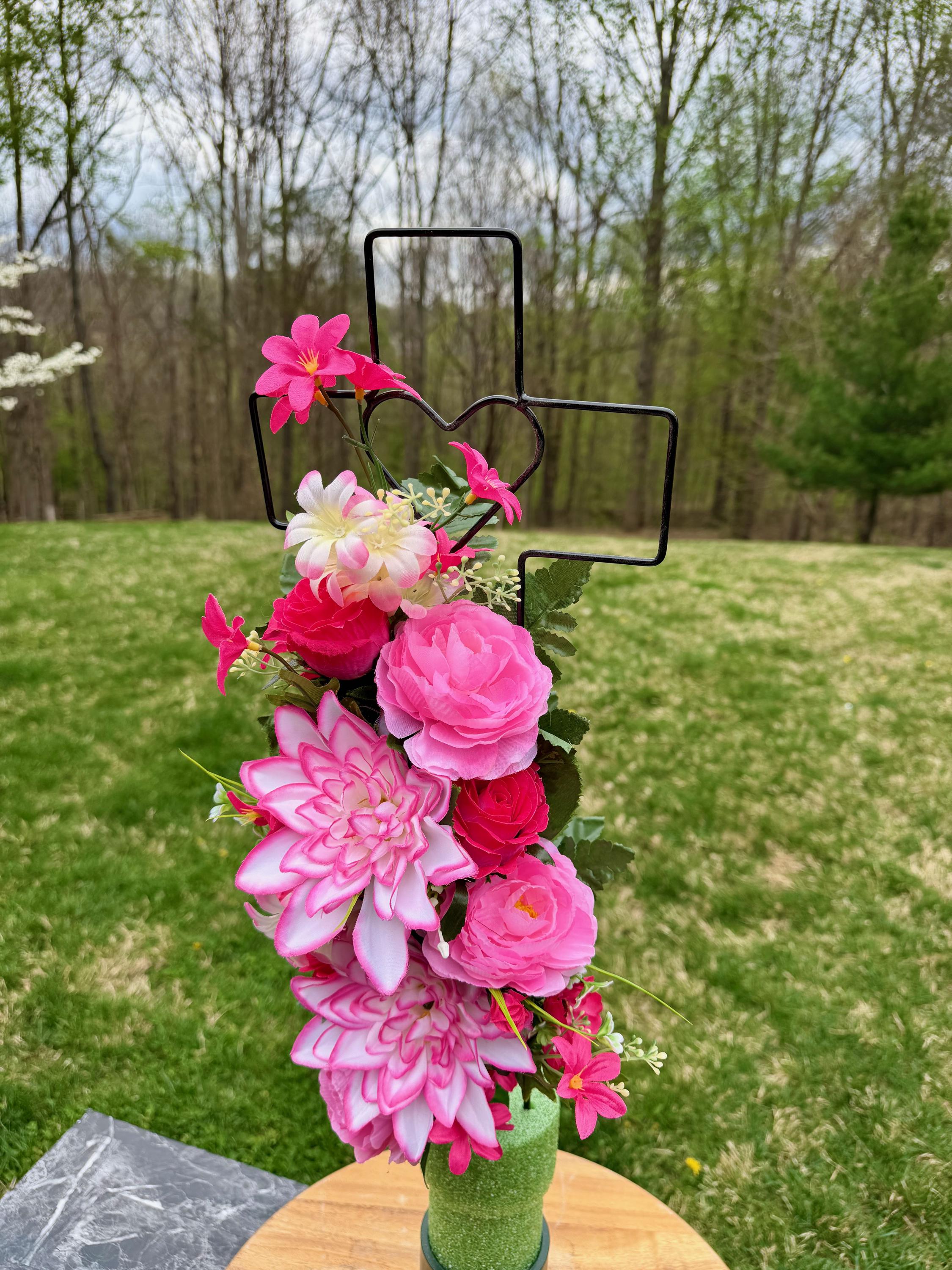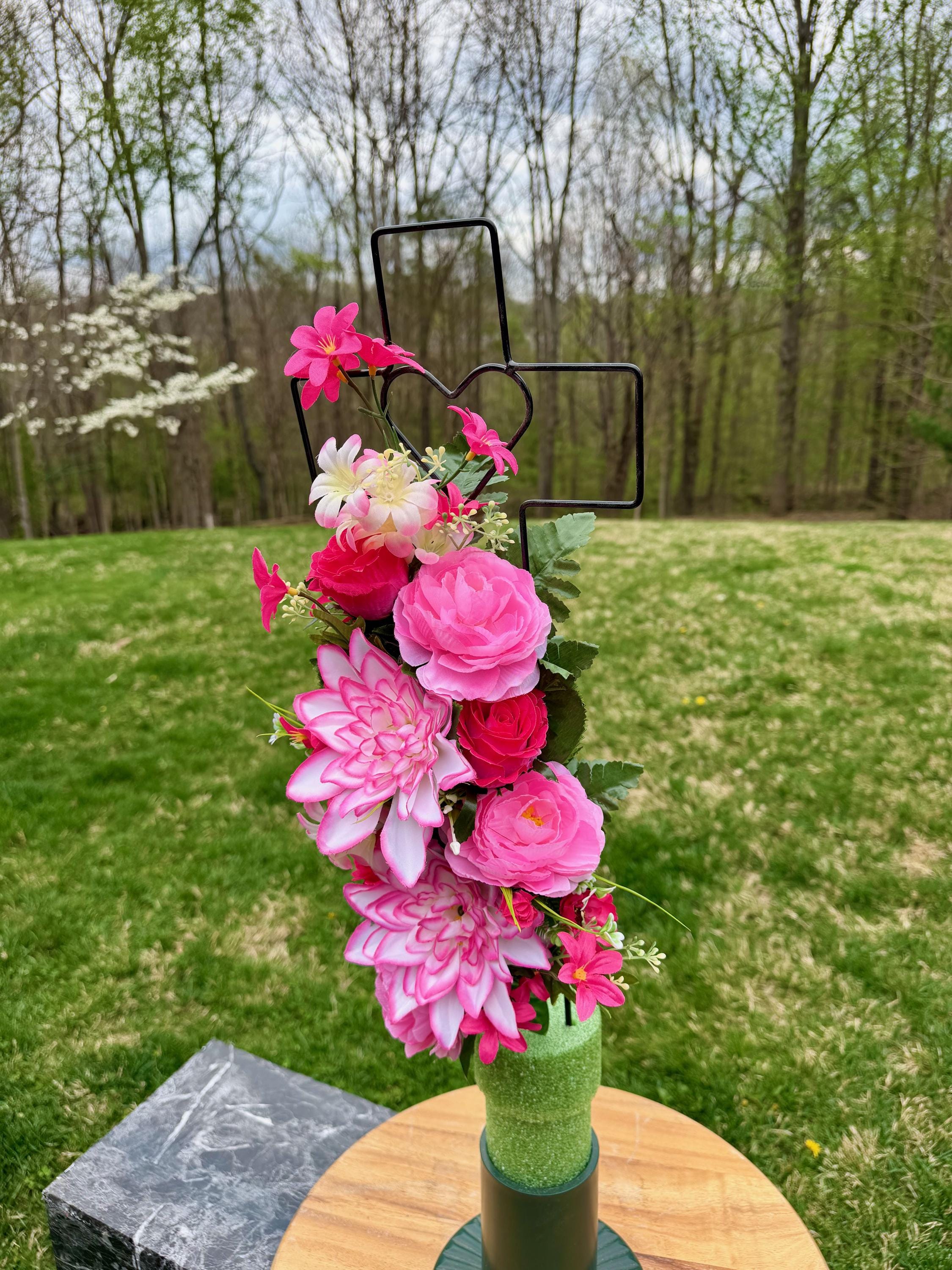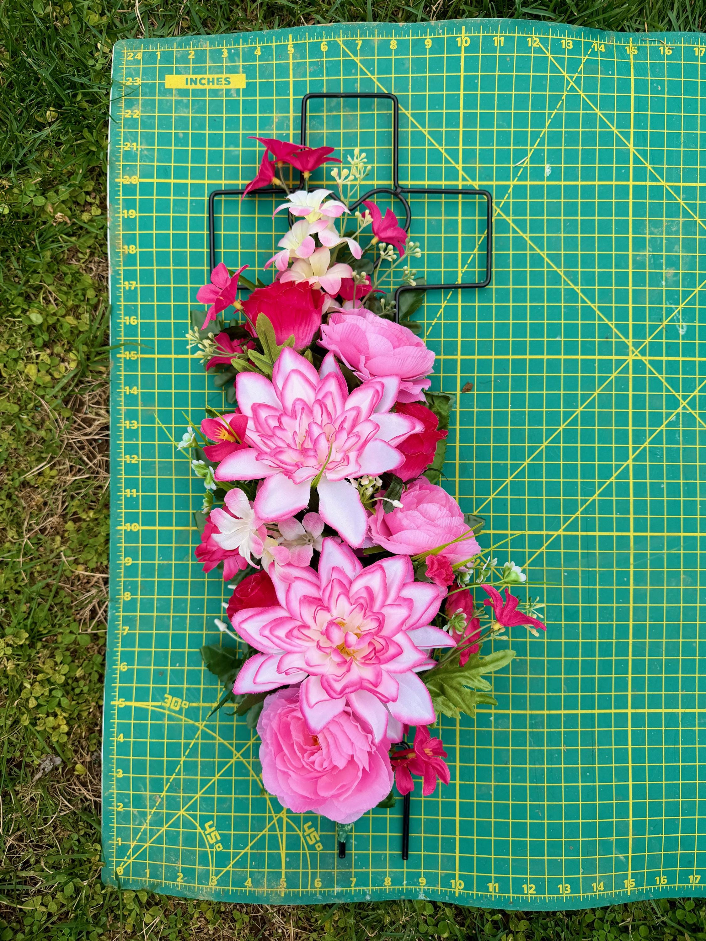 - Vase and Metal Cross arrangements use a “foam” insert; but for photos, they're displayed in a “plastic” holder just for stability—which is not included but can be purchased separately.