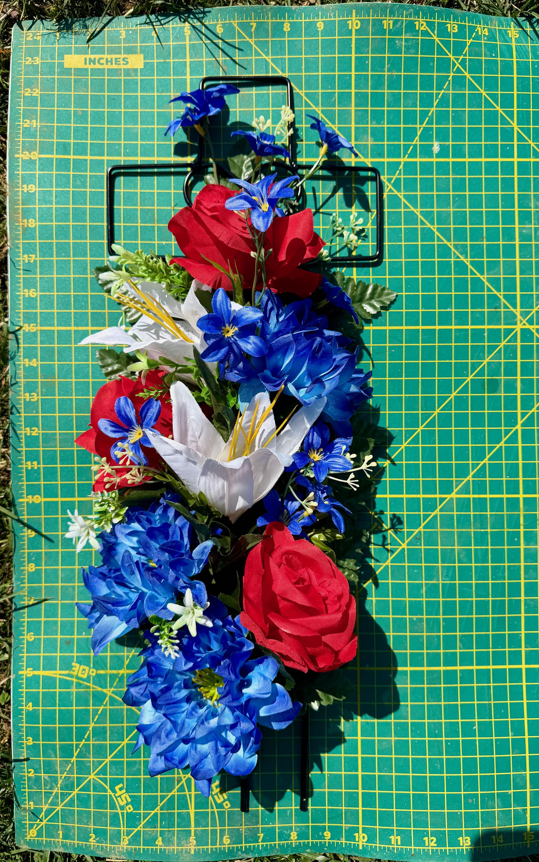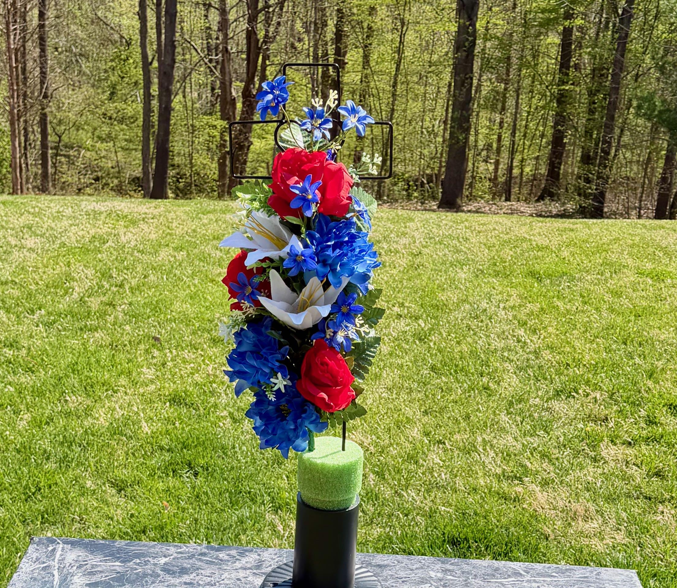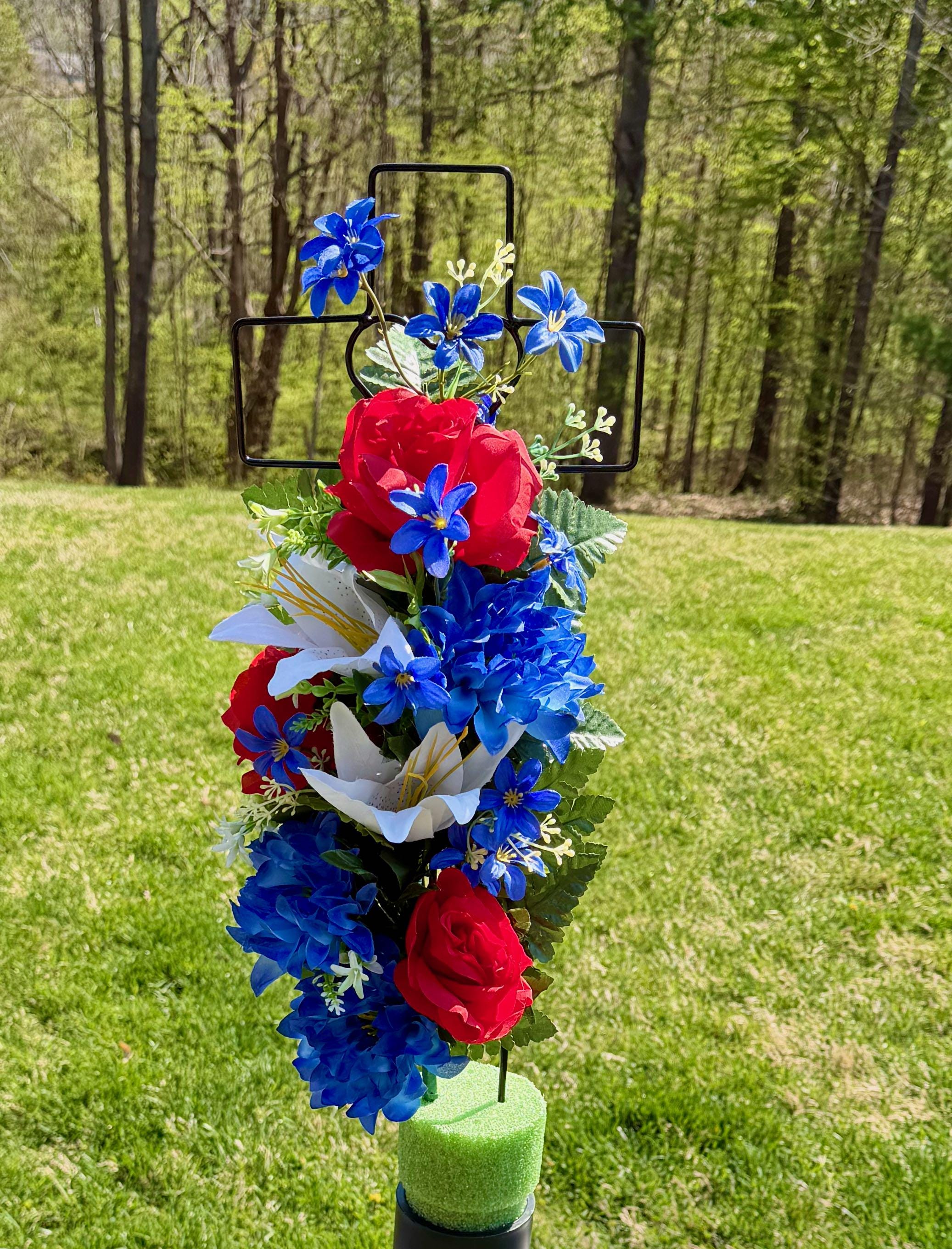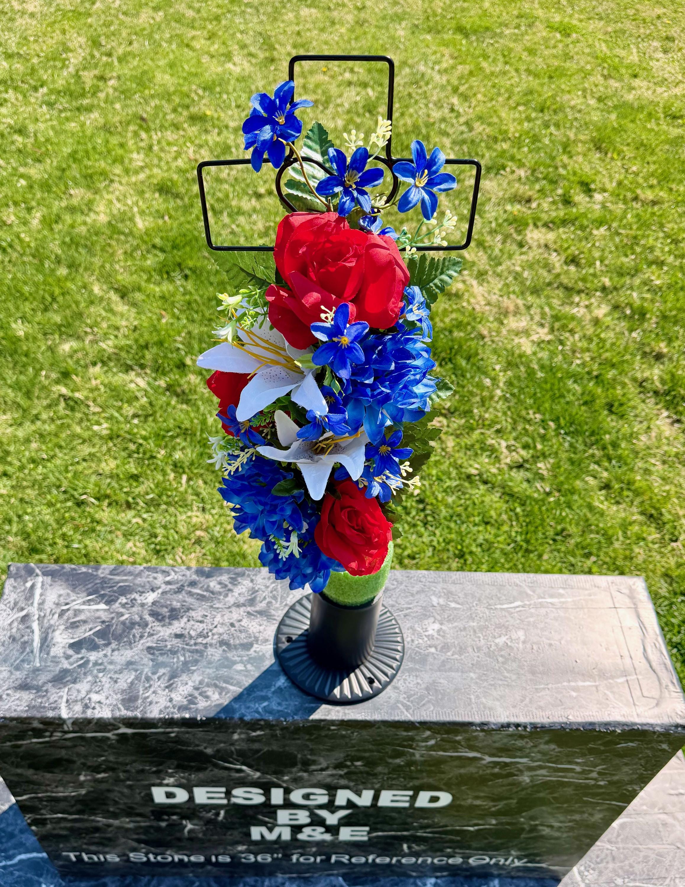 Patriotic Red, White and Blue Silk Flower Cemetery Reusable Cross - Grave Decoration - Memorial Arrangement