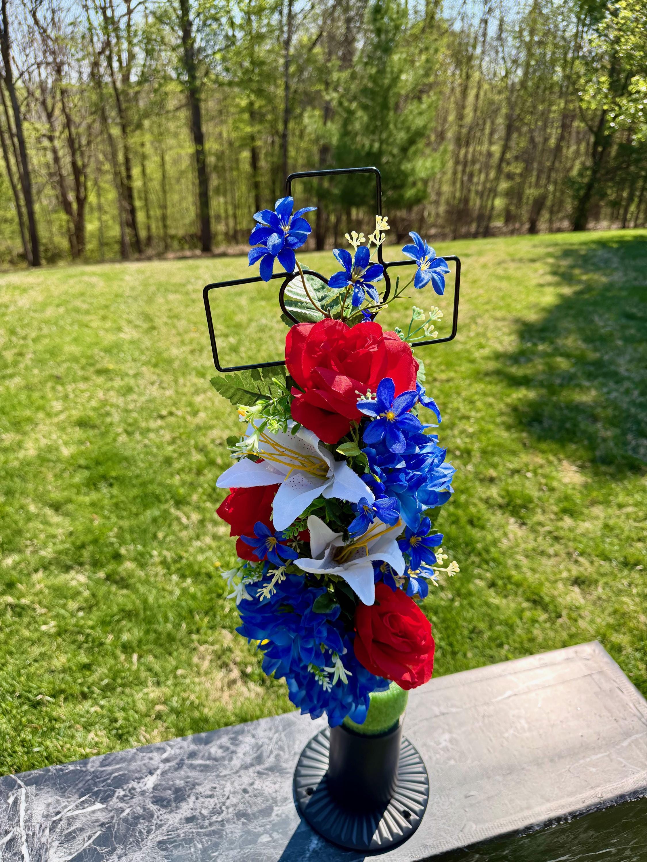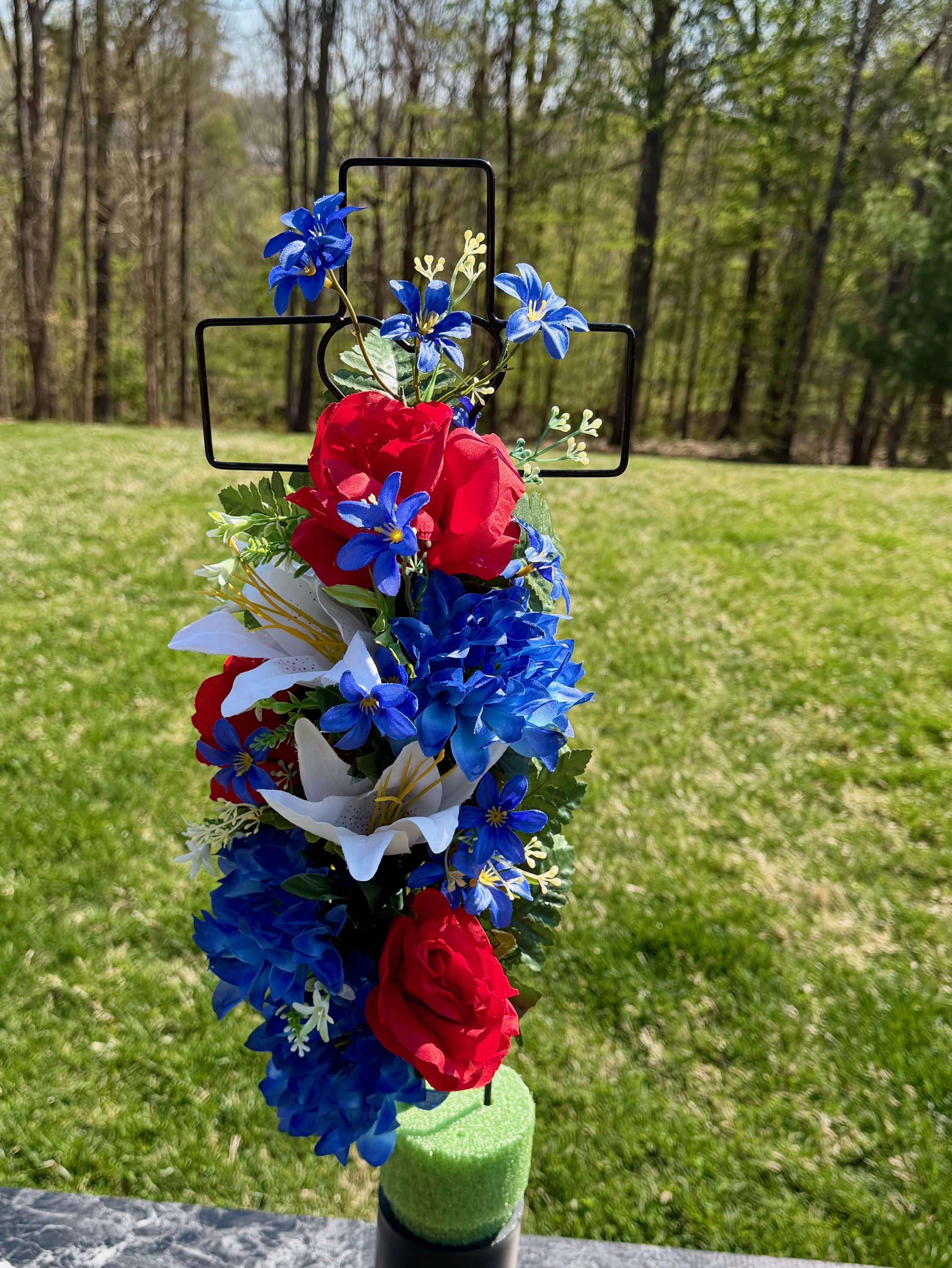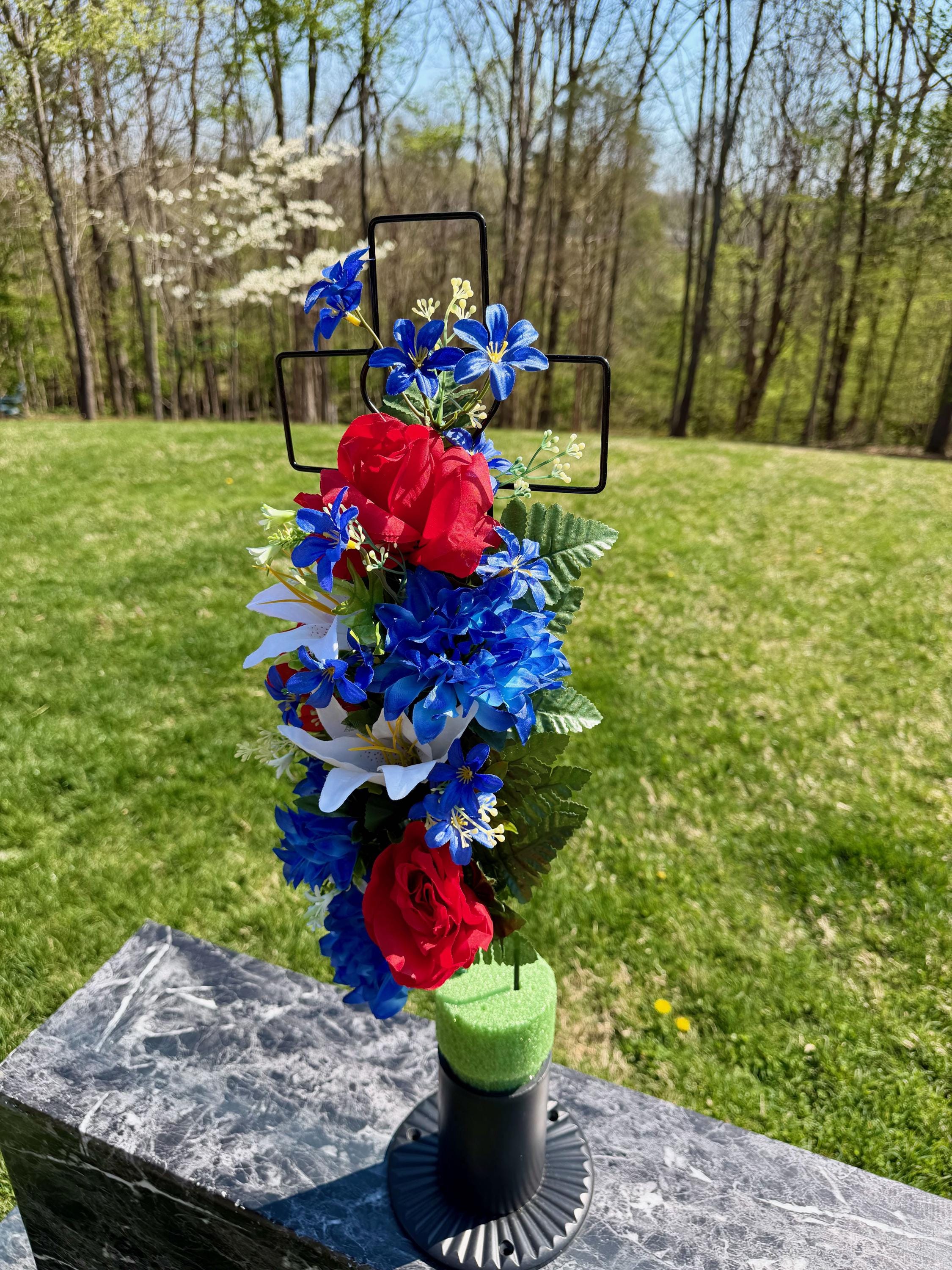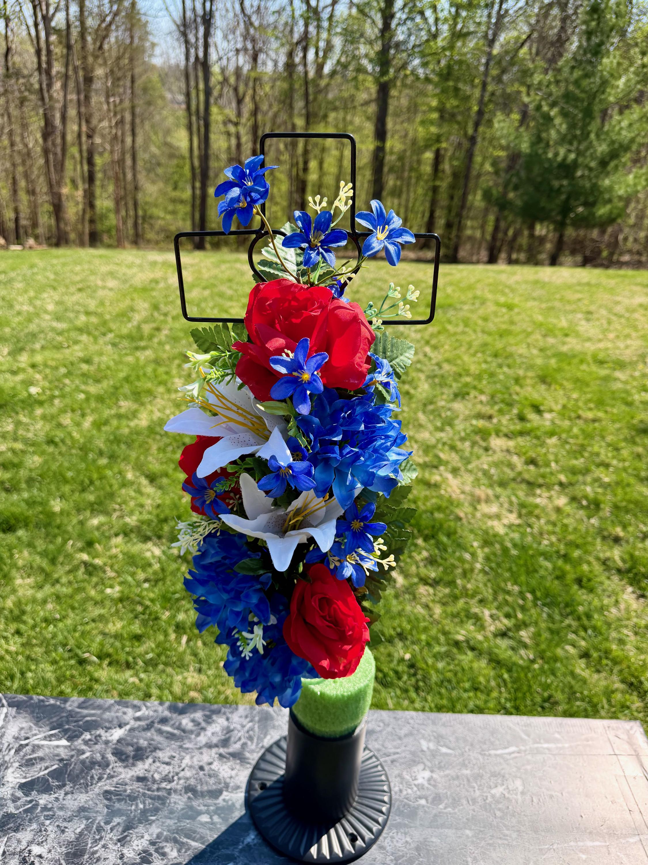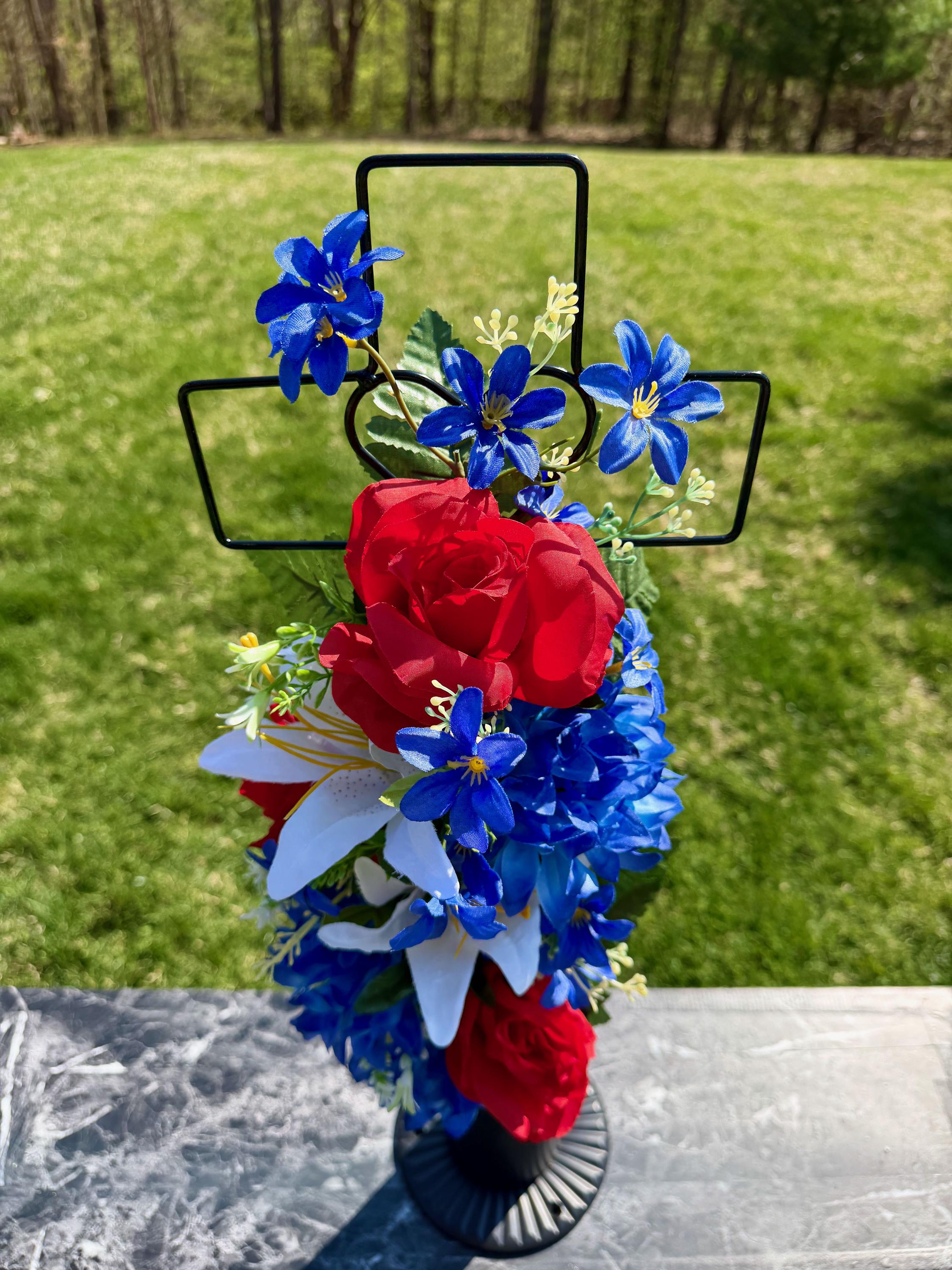 Patriotic Red, White and Blue Silk Flower Cemetery Reusable Cross - Grave Decoration - Memorial Arrangement