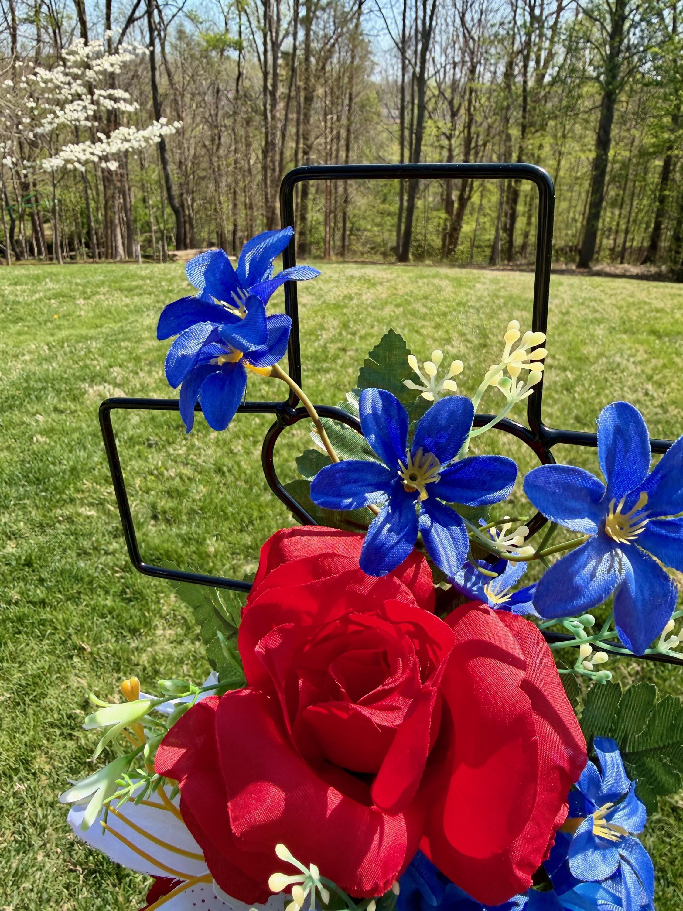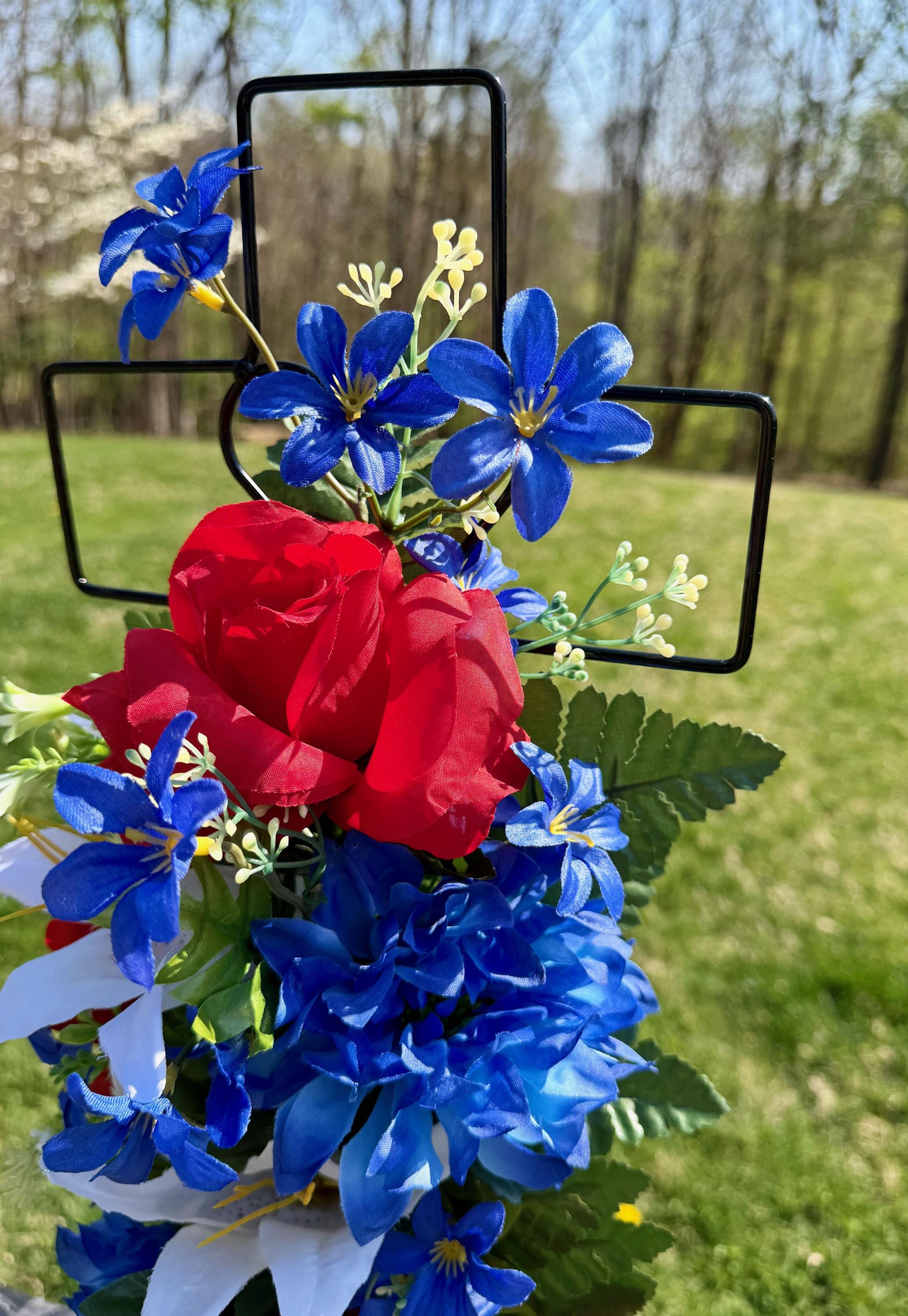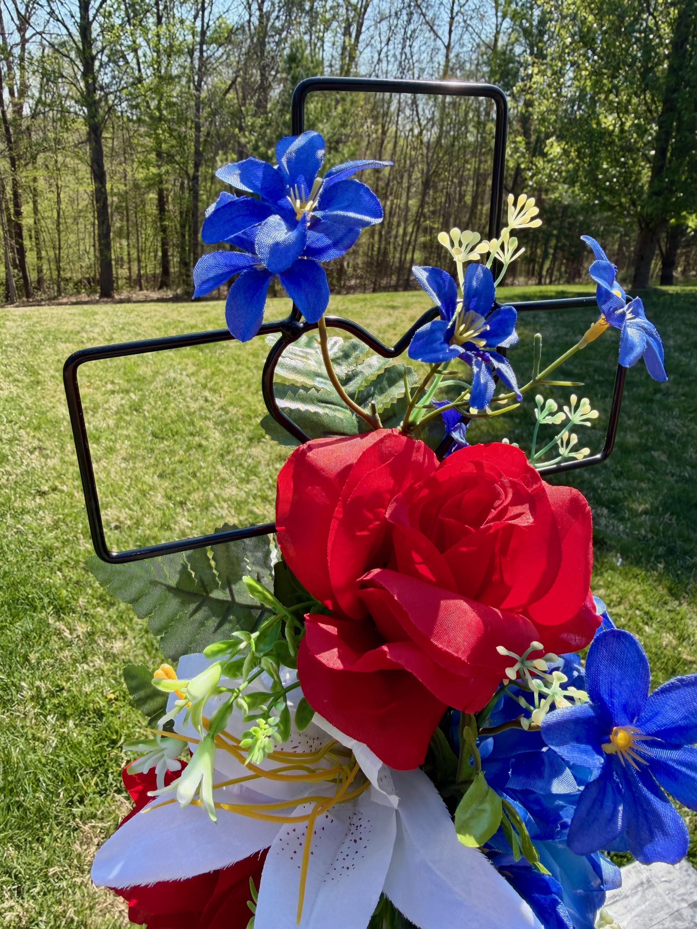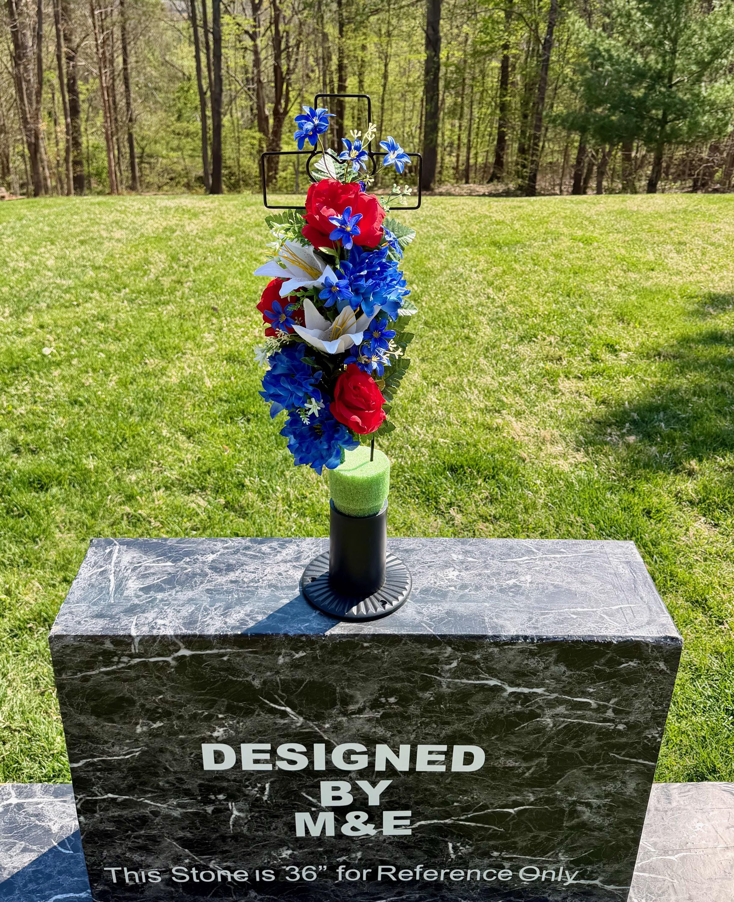 Patriotic Red, White and Blue Silk Flower Cemetery Reusable Cross - Grave Decoration - Memorial Arrangement