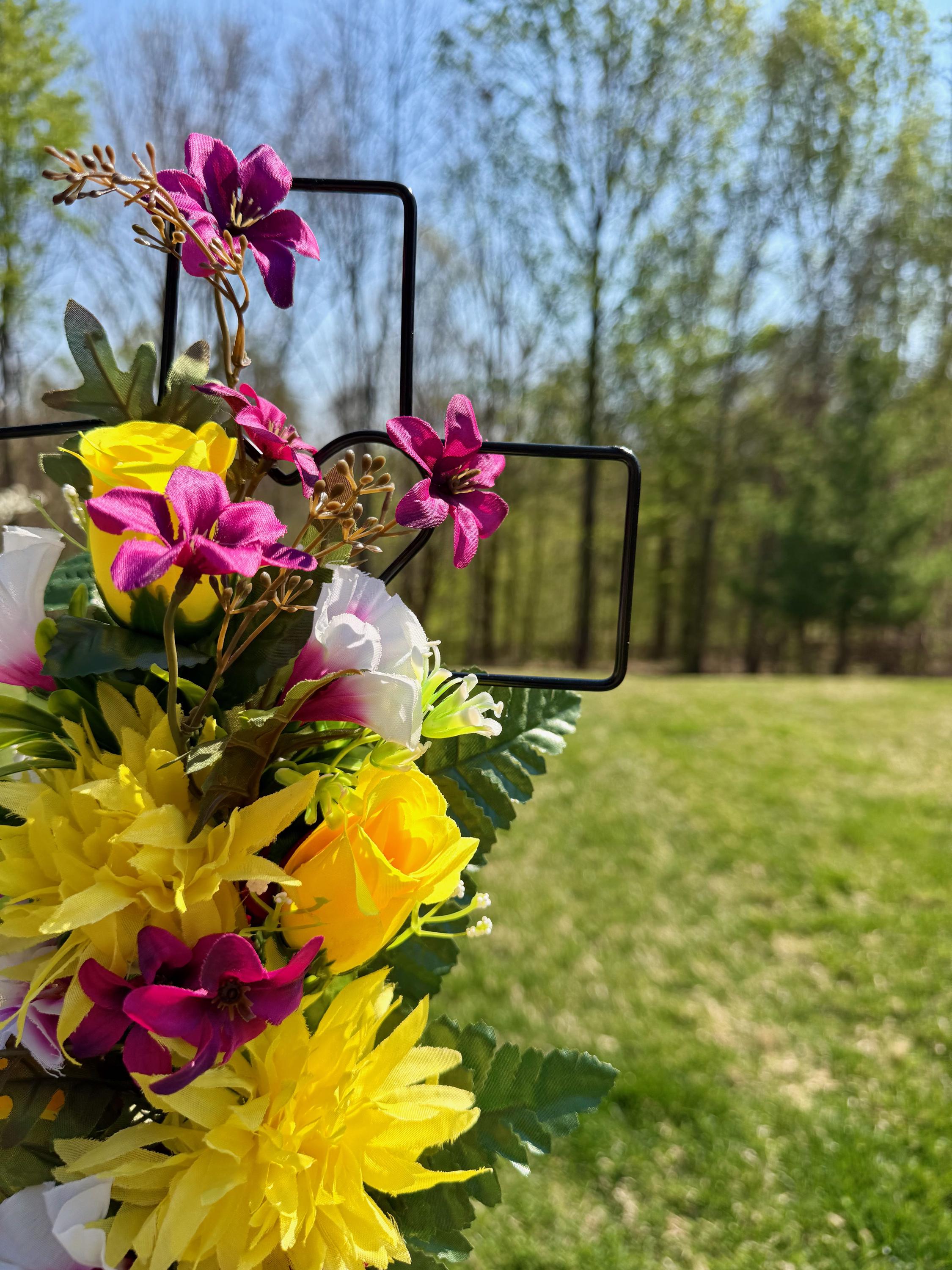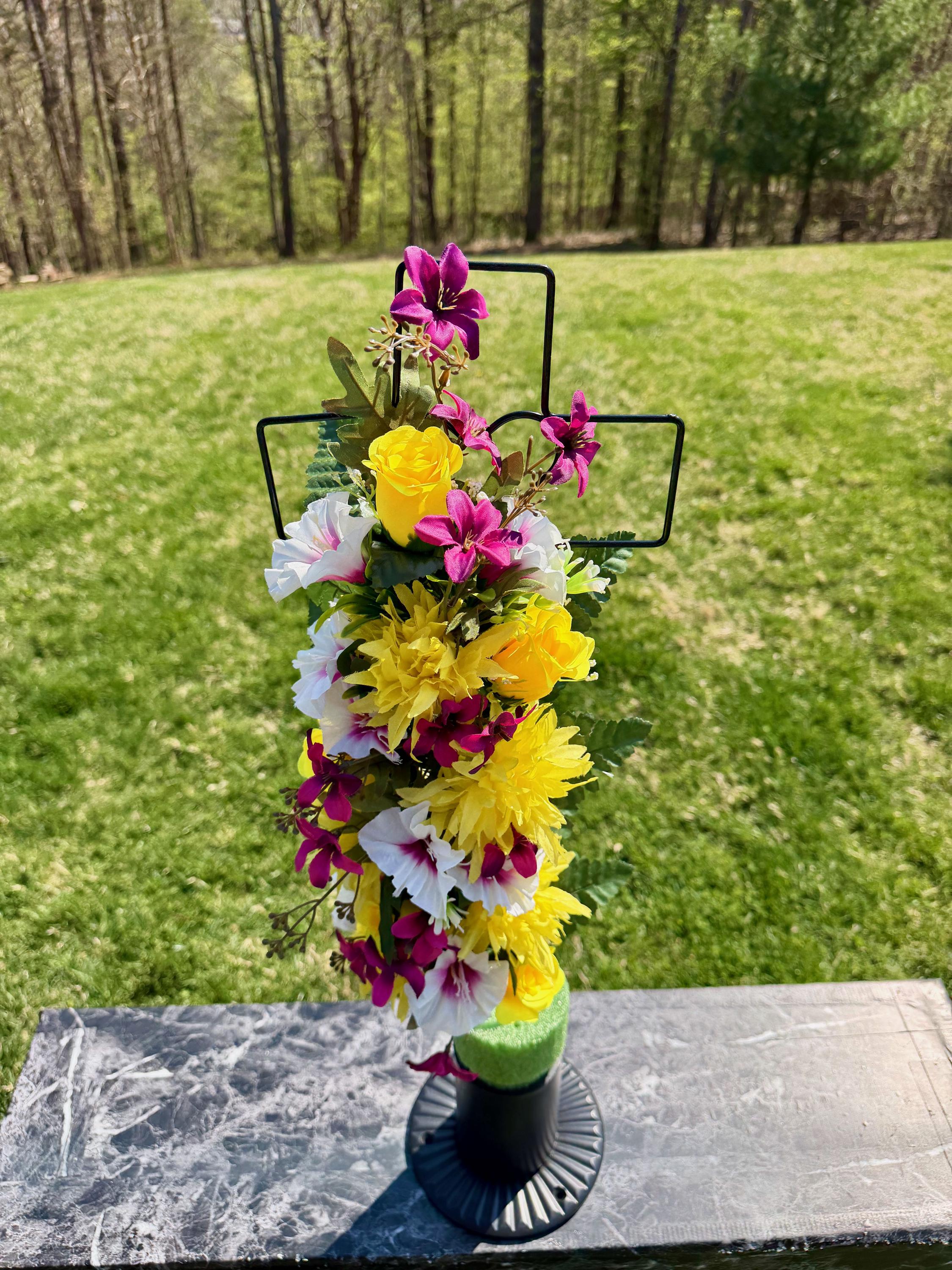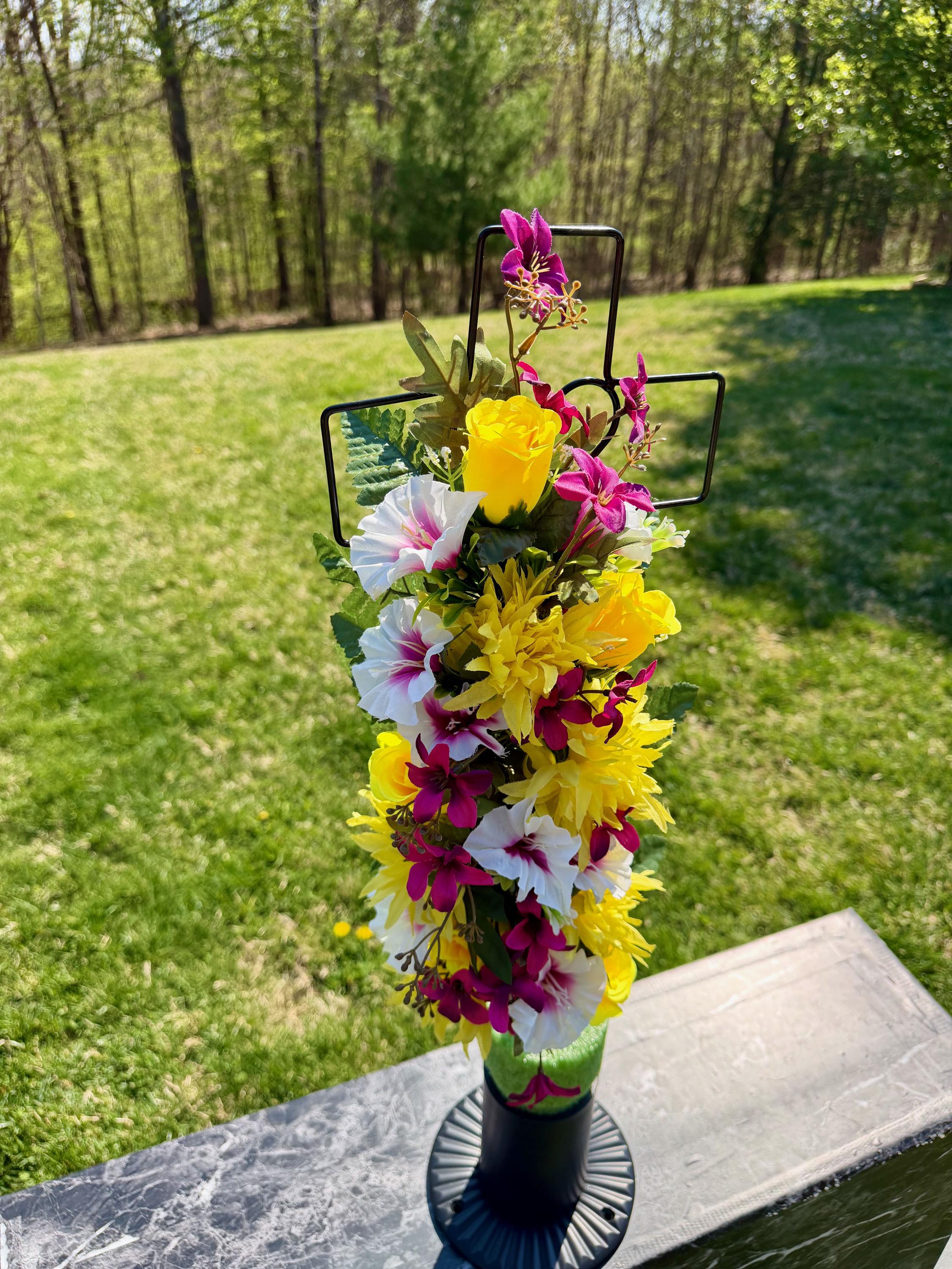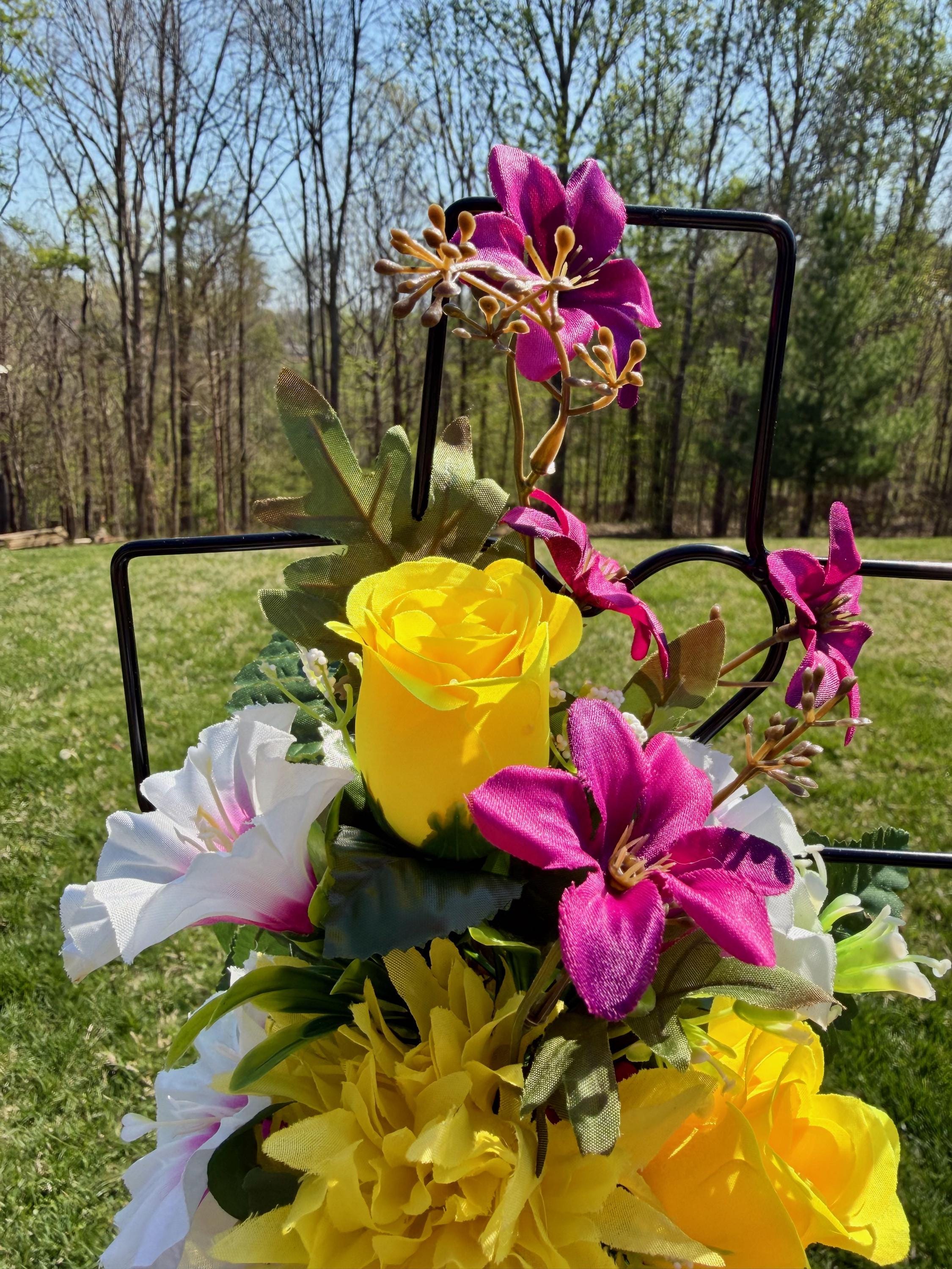 We’re a small, family-operated business consisting of myself, my husband, and my daughter. We personally manage every order and strive for excellent customer service. All our arrangements use high-quality silk flowers, though all silk blooms may fade over time. Each stem is glued into foam to withstand the elements. Designed by M&E uses only premium silks, and we put genuine care into every piece we create. Rest assured, the arrangement shown in our photos is exactly the one you’ll receive, as I design and assemble each one myself. If you’re searching for something unique or have a particular flower, color, or matching vases in mind, please contact me to discuss a custom order.