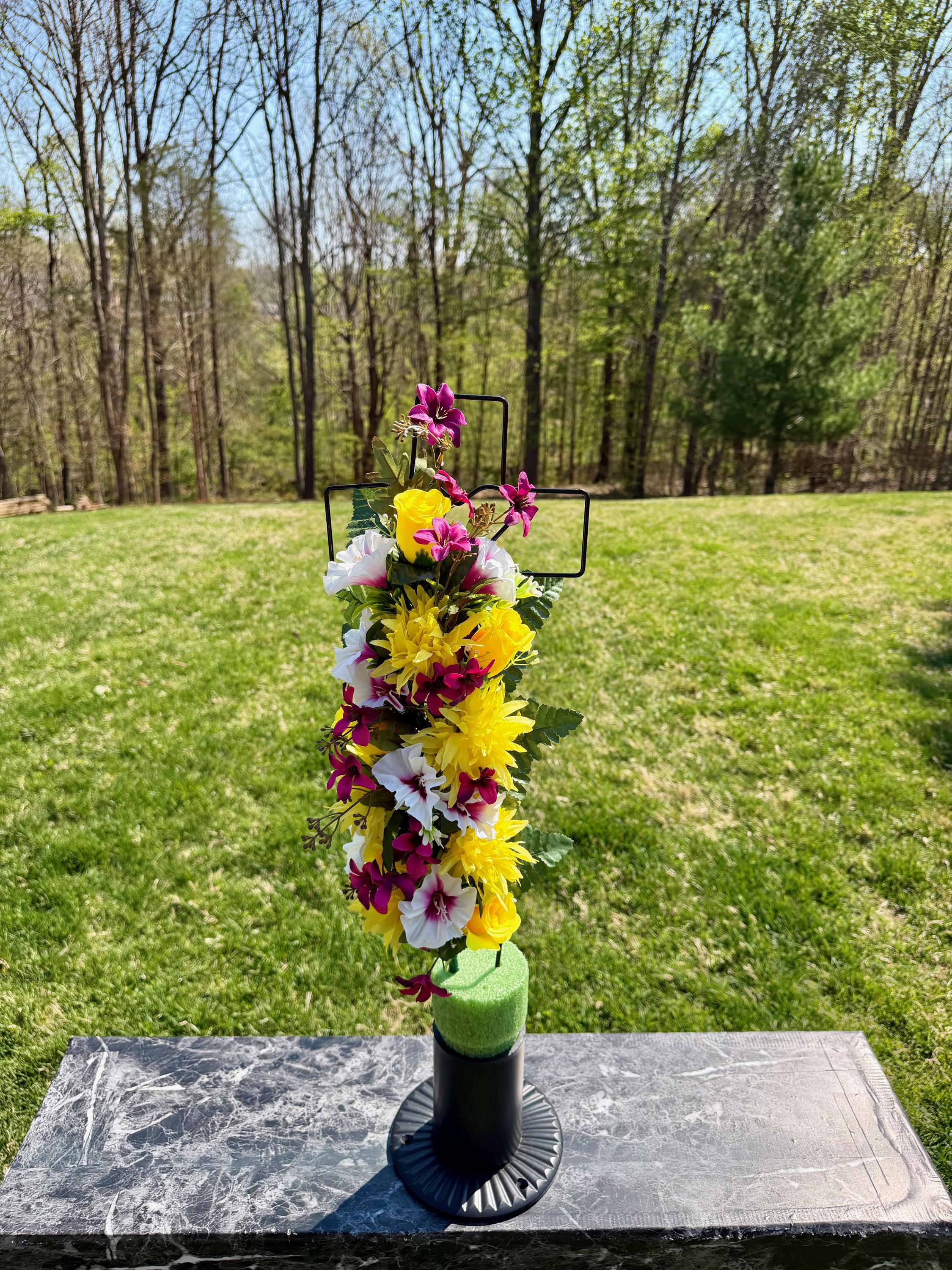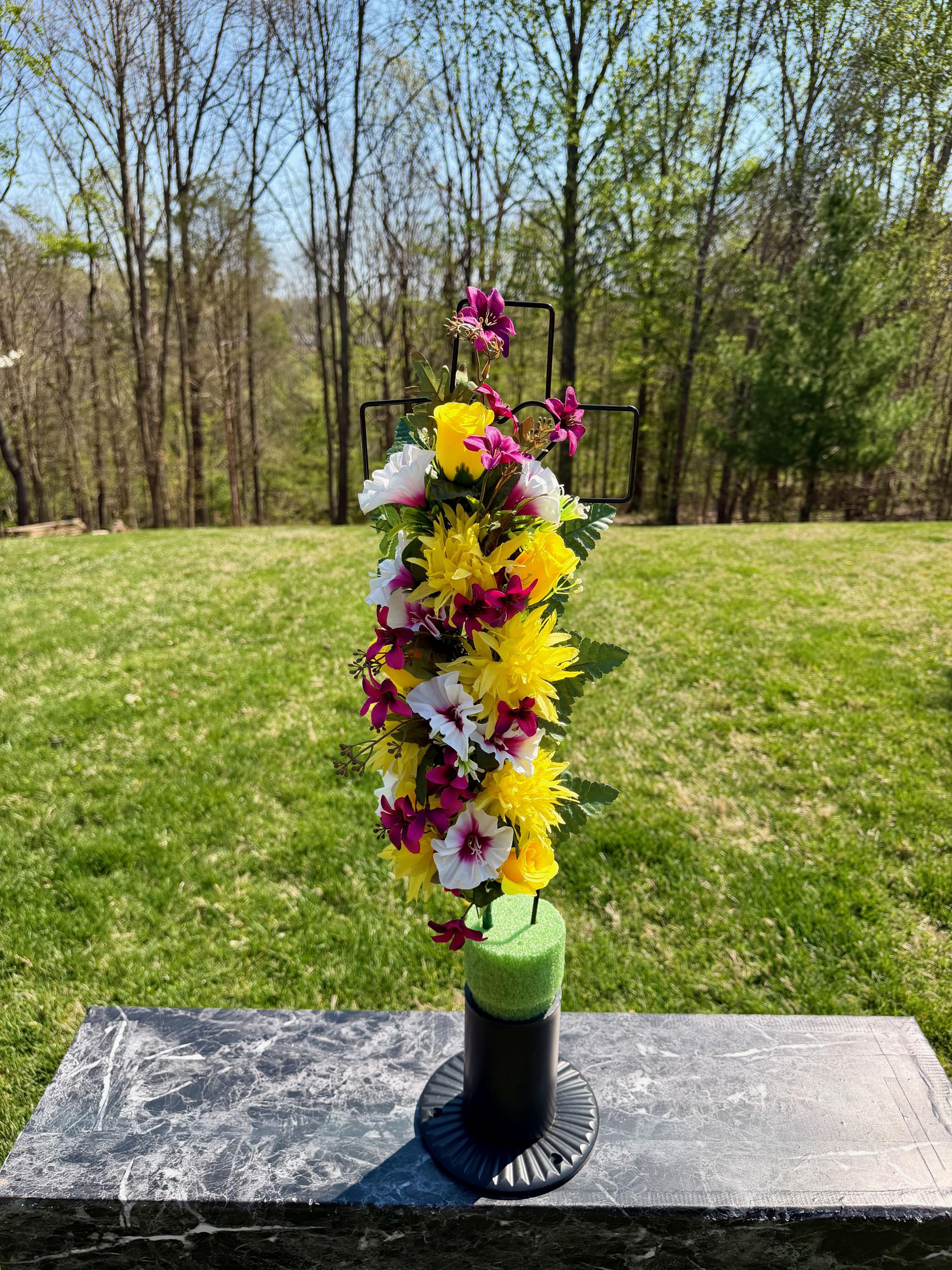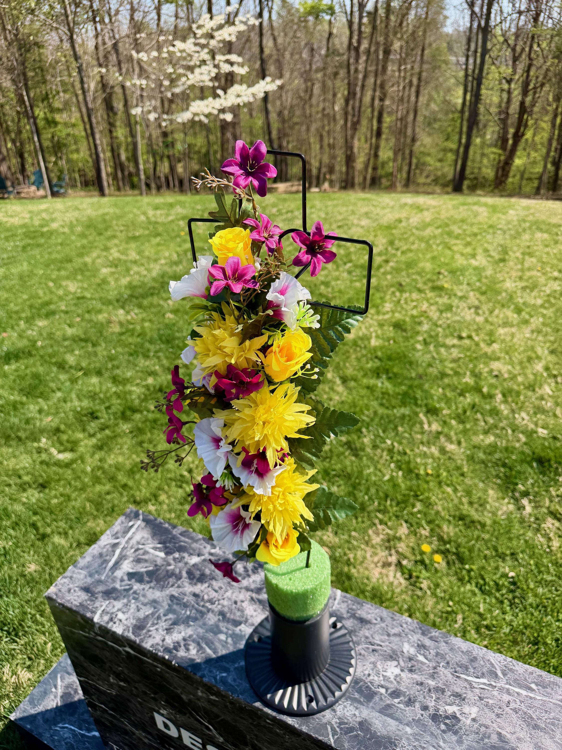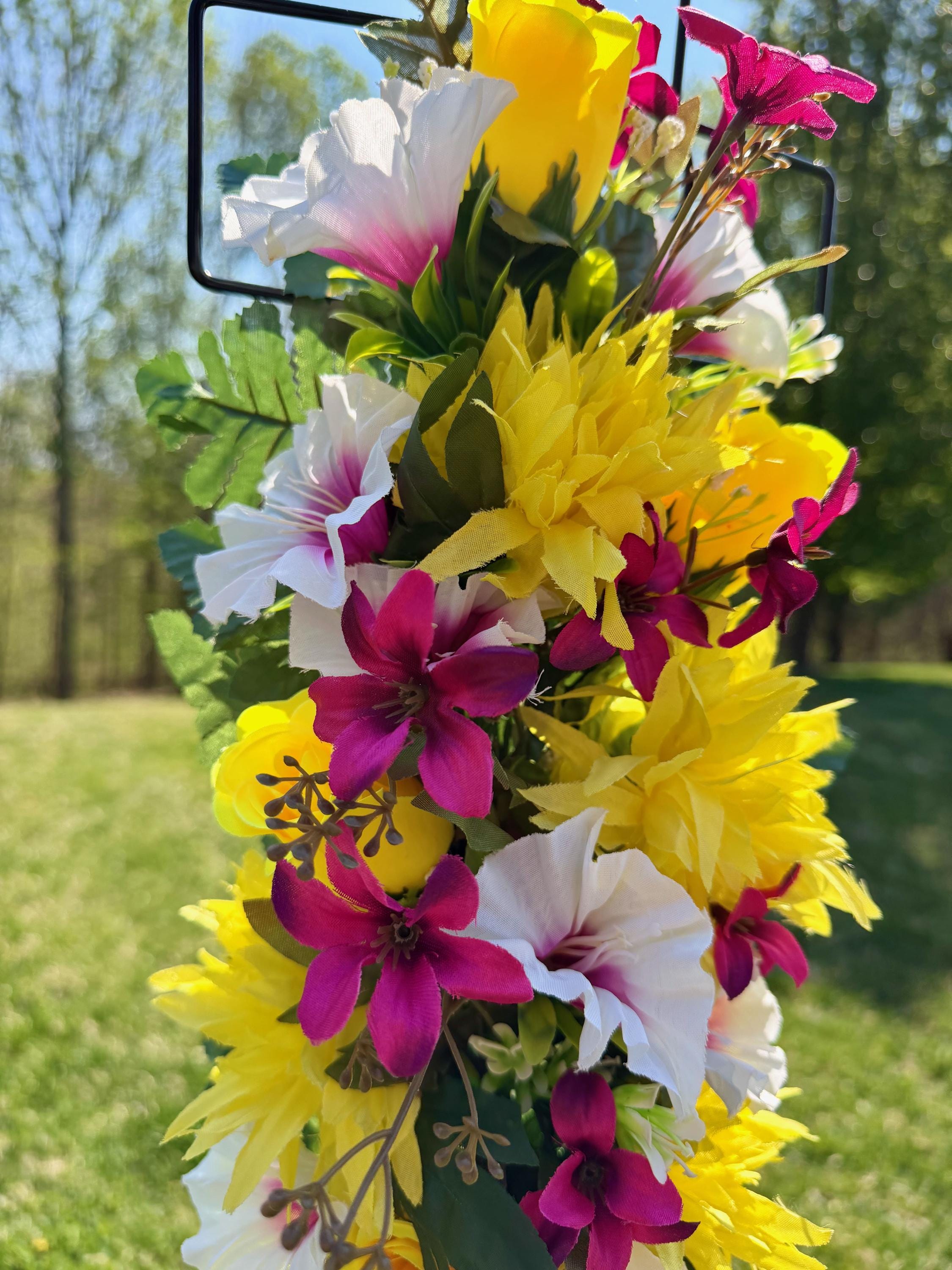 We’re a small, family-operated business consisting of myself, my husband, and my daughter. We personally manage every order and strive for excellent customer service. All our arrangements use high-quality silk flowers, though all silk blooms may fade over time. Each stem is glued into foam to withstand the elements. Designed by M&E uses only premium silks, and we put genuine care into every piece we create. Rest assured, the arrangement shown in our photos is exactly the one you’ll receive, as I design and assemble each one myself. If you’re searching for something unique or have a particular flower, color, or matching vases in mind, please contact me to discuss a custom order.