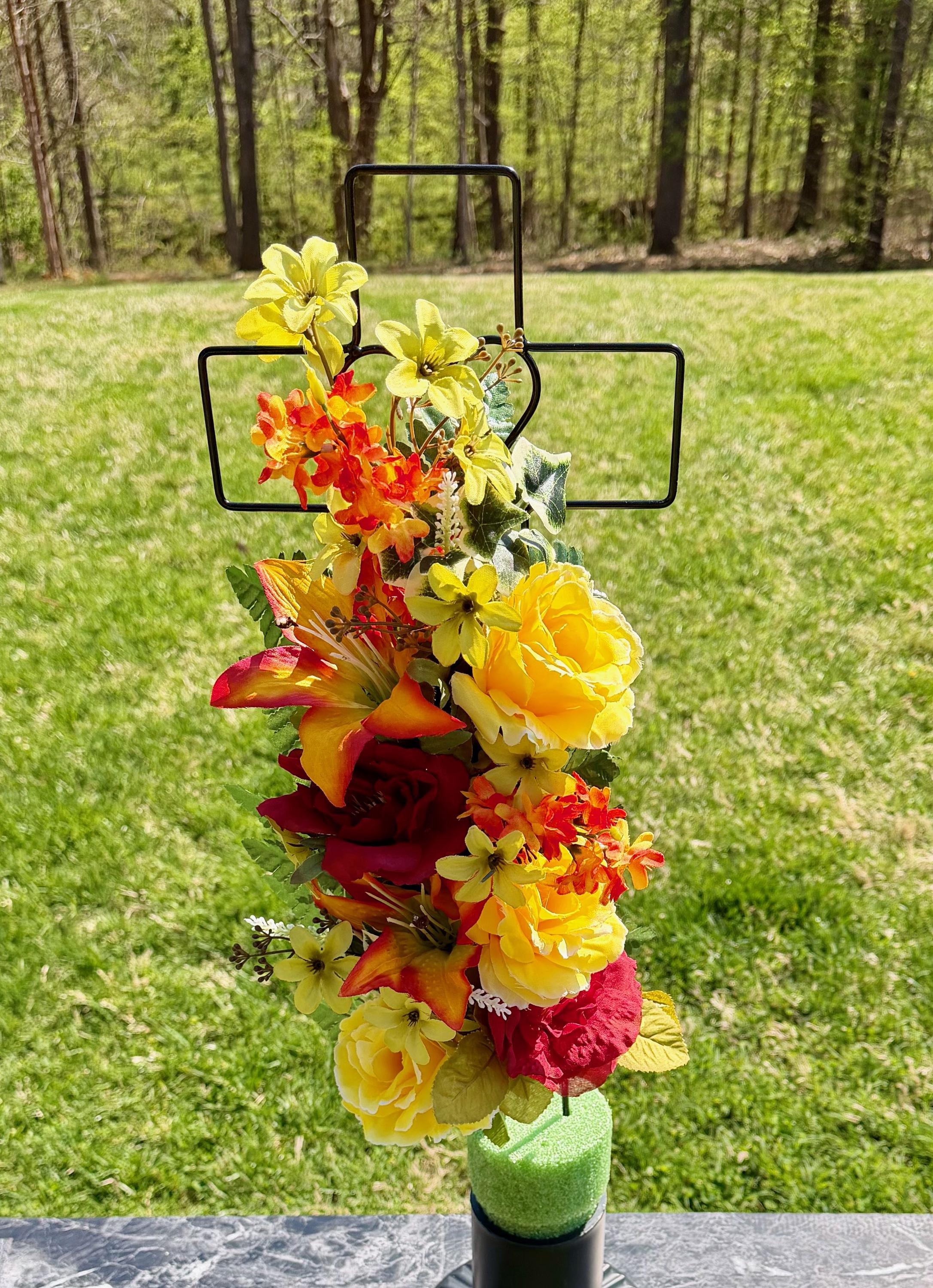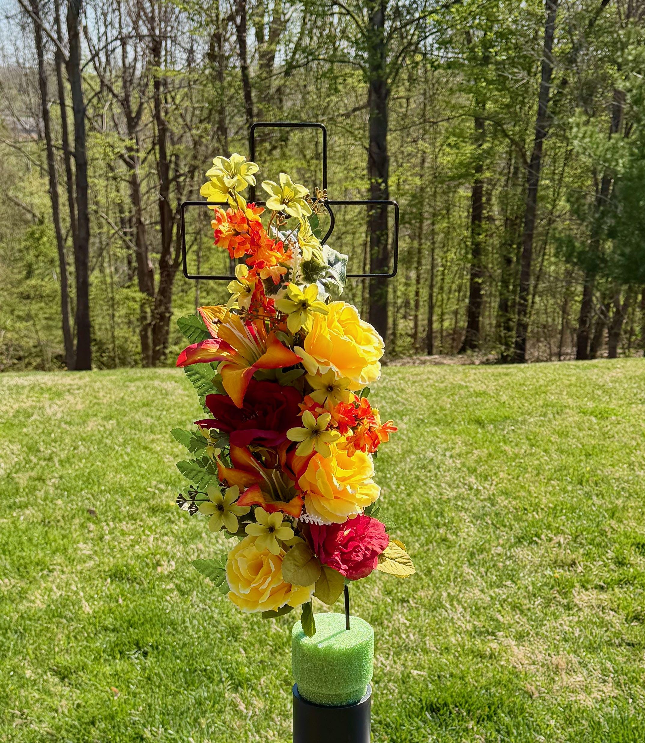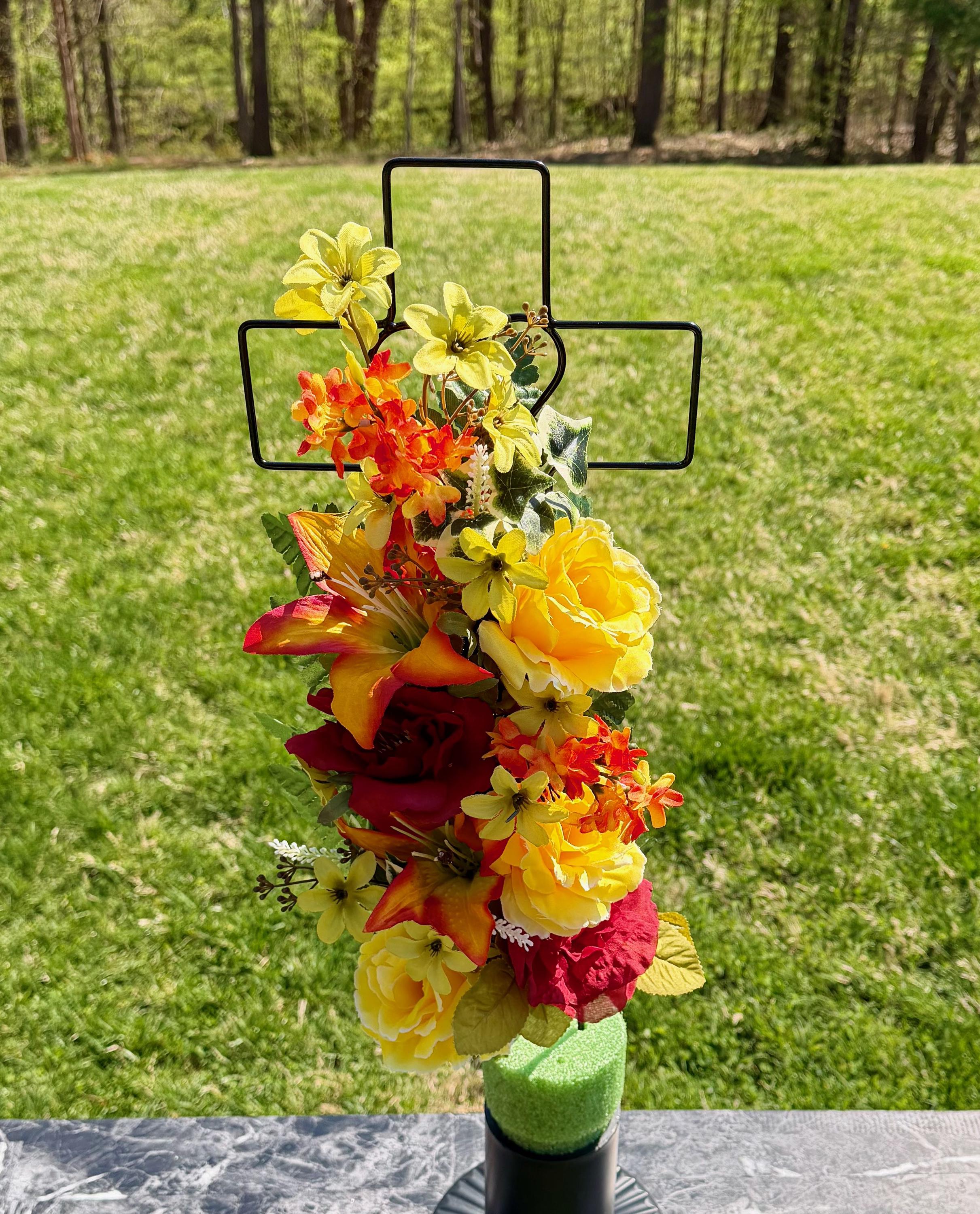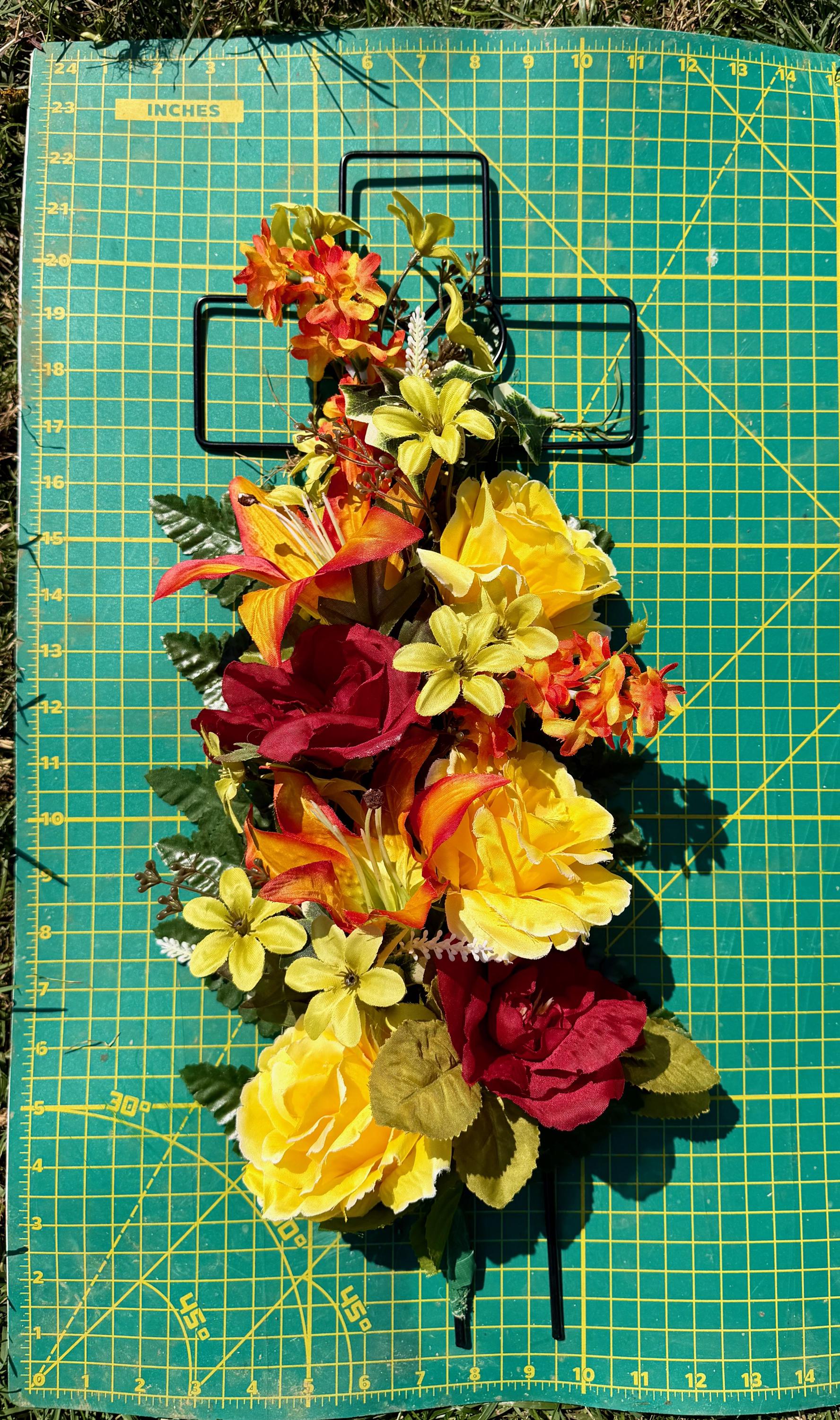 Orange and Yellow Silk Flower Cemetery Reusable Cross - Grave Decoration - Memorial Arrangement