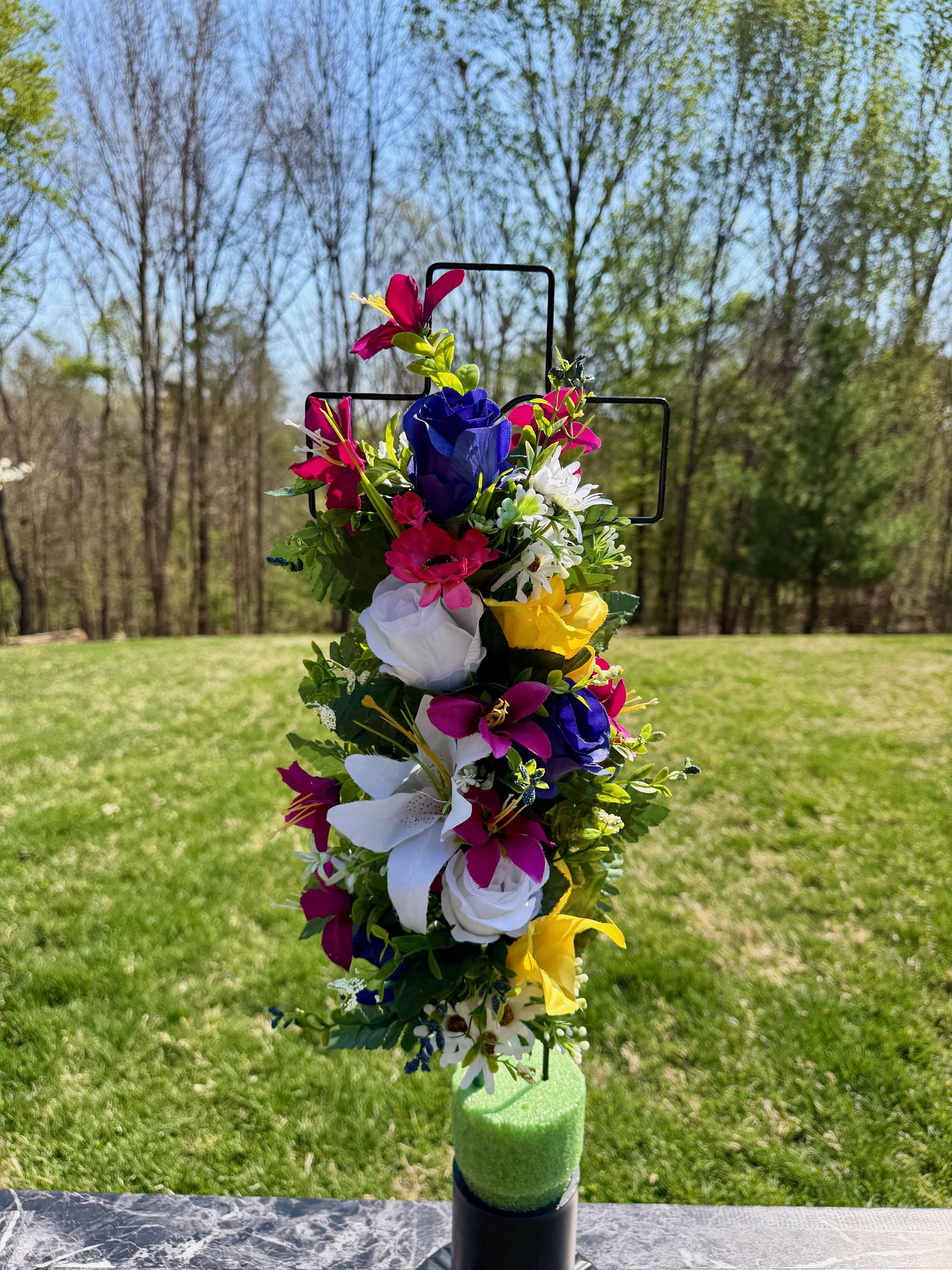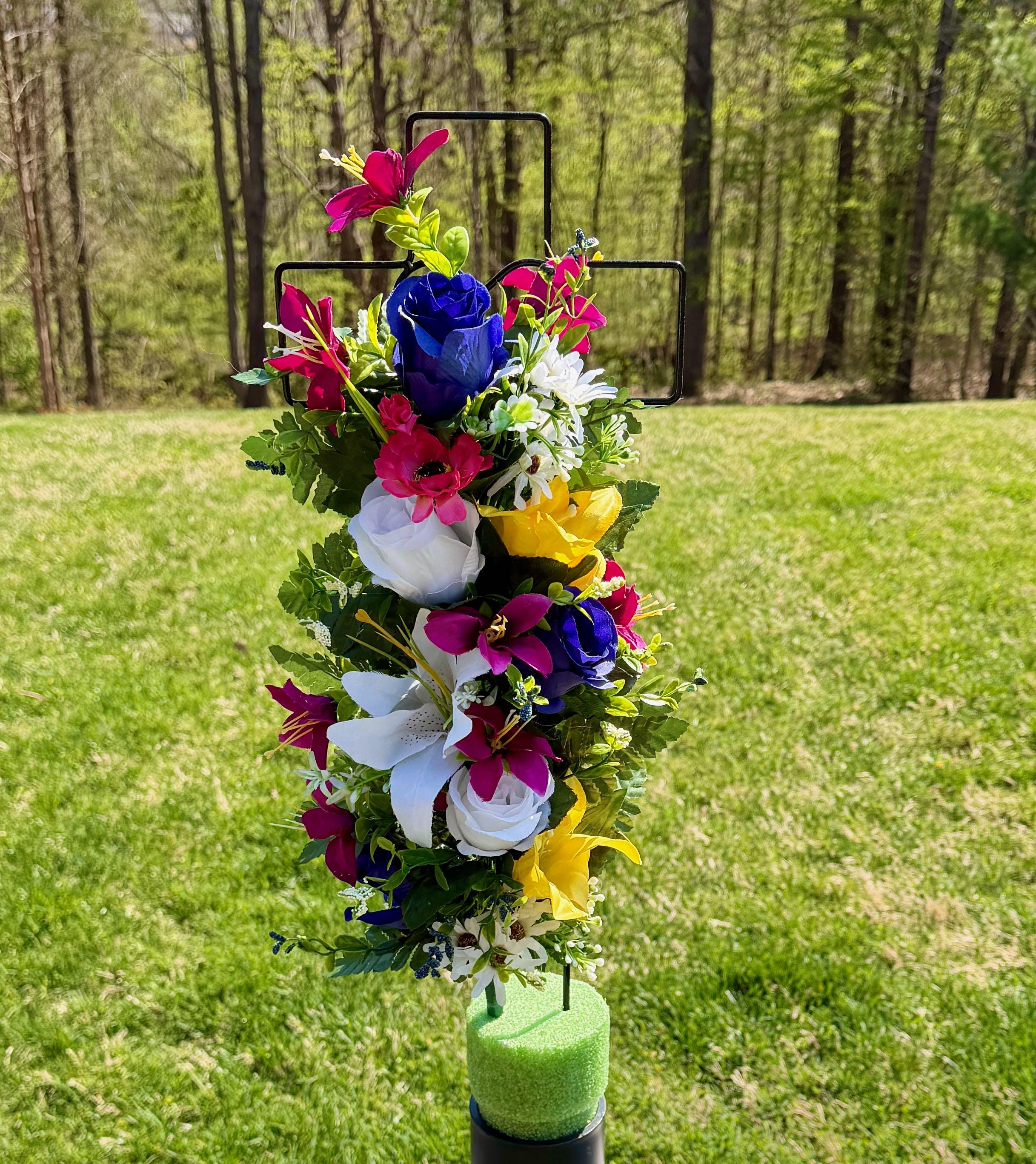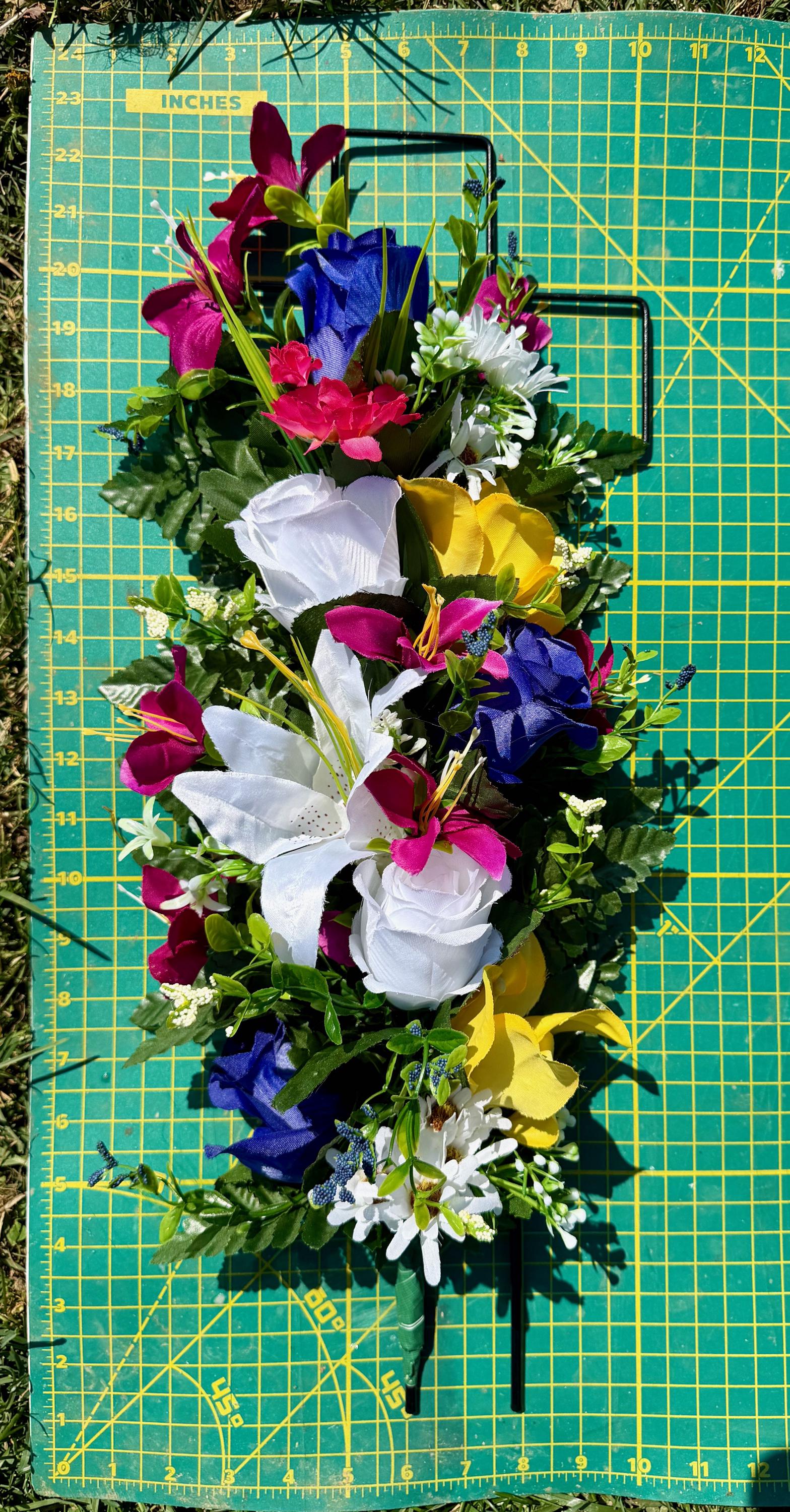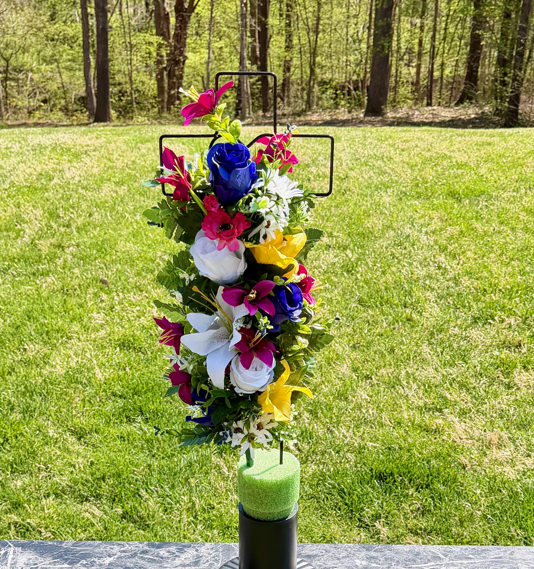 Multi-Color Silk Flower Cemetery Reusable Cross - Grave Decoration - Memorial Arrangement