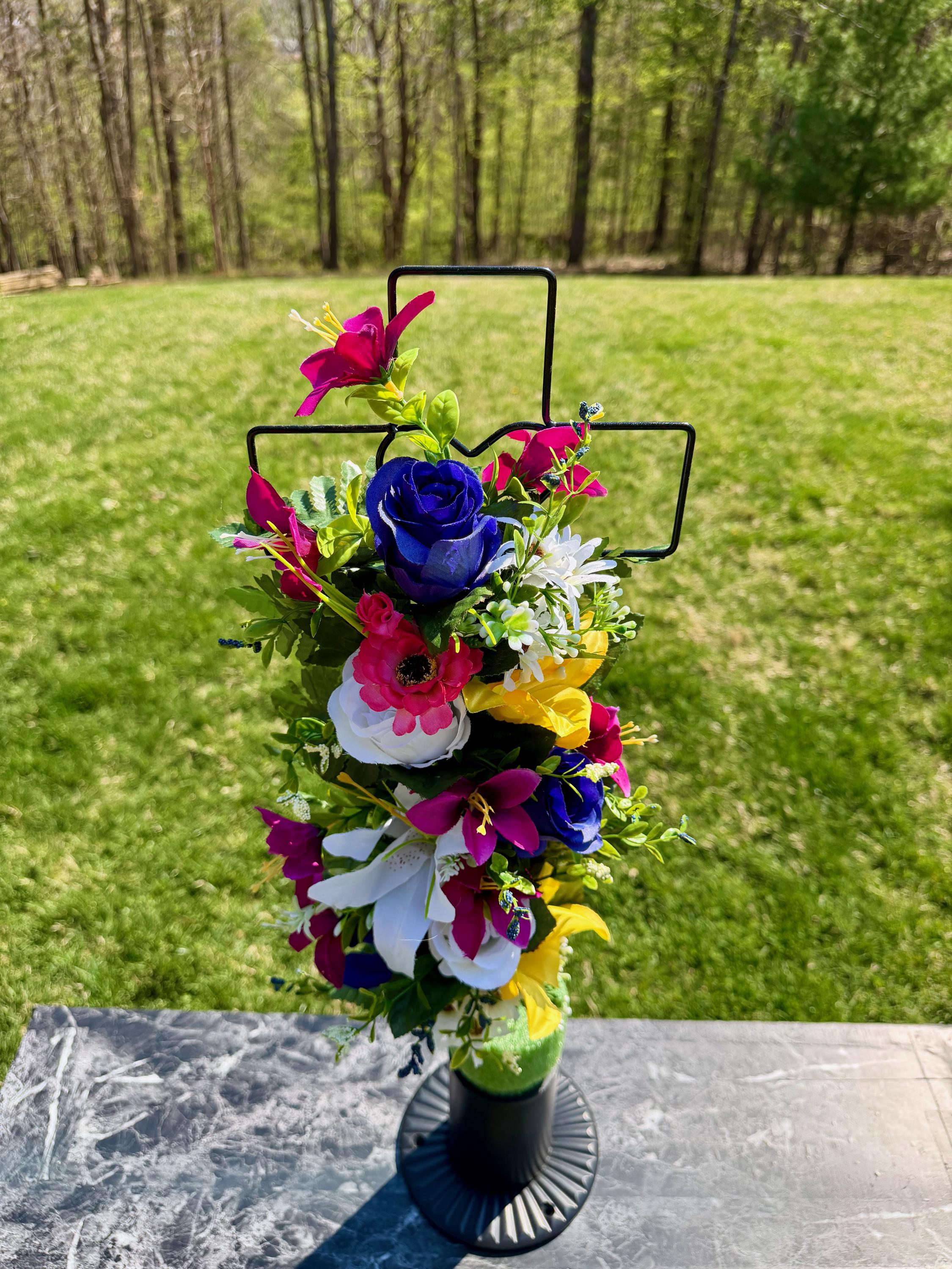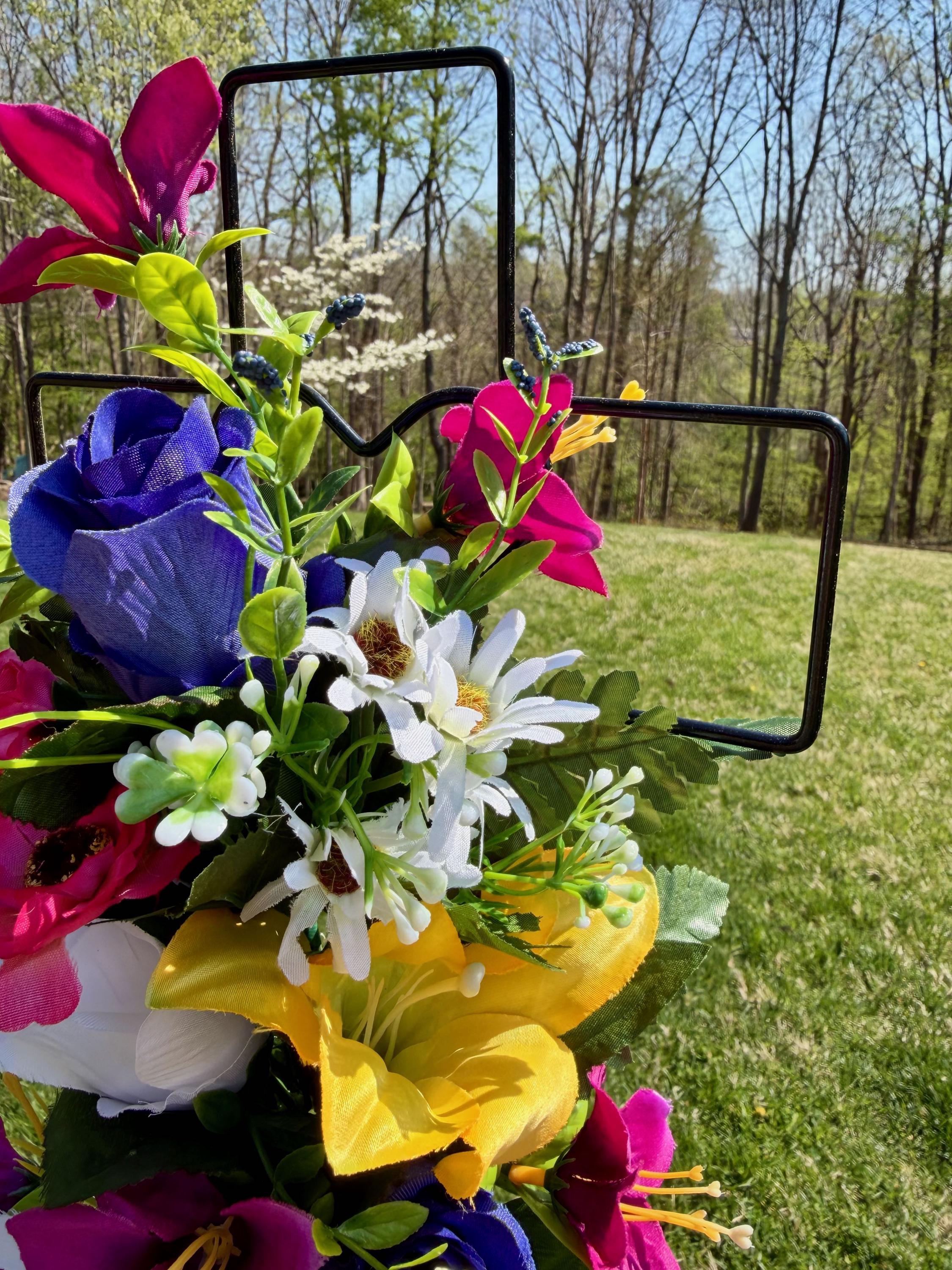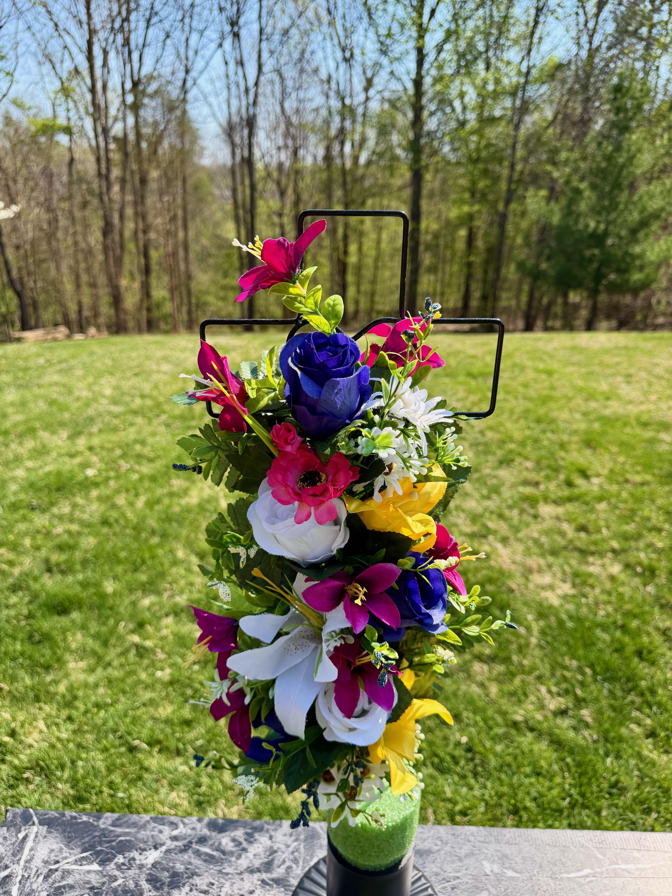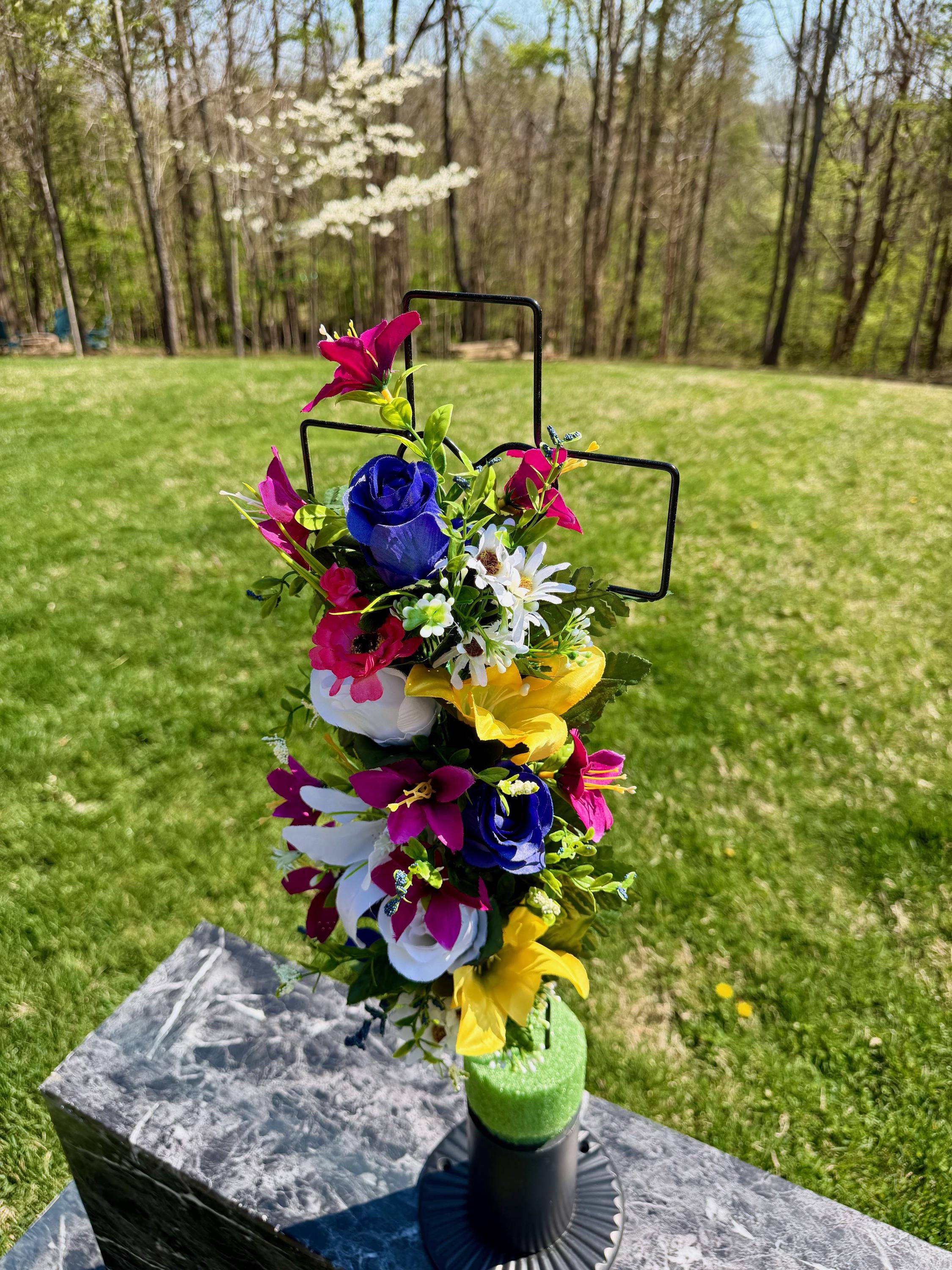 Multi-Color Silk Flower Cemetery Reusable Cross - Grave Decoration - Memorial Arrangement